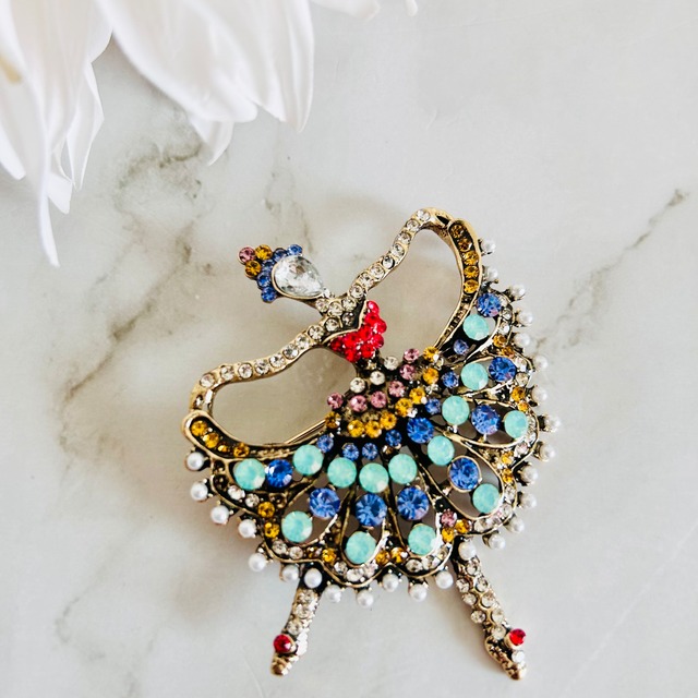ブルーやミントグリーン、ルビーのようなレッドストーンを贅沢にあしらったおしゃれ心をくすぐるモチーフが魅力的なブローチです。 踊るバレリーナの優雅なフォルムが印象的で、見る角度によって異なる煌めきを放ちます。 繊細な細工とカラーストーンの調和が、まるで小さな舞台芸術のような存在感を演出します☆ シンプルなジャケットやワンピースに添えるだけで、クラシカルな華やぎをプラス! ストールや帽子に合わせても、おしゃれな個性を引き立てるアクセントになりますよ☆ 見るたびに心がときめく、美しい舞踊を纏うようなブローチです。 ▶︎縦 約7.5cm ▶︎横 約6cm ▶︎重さ 約23g