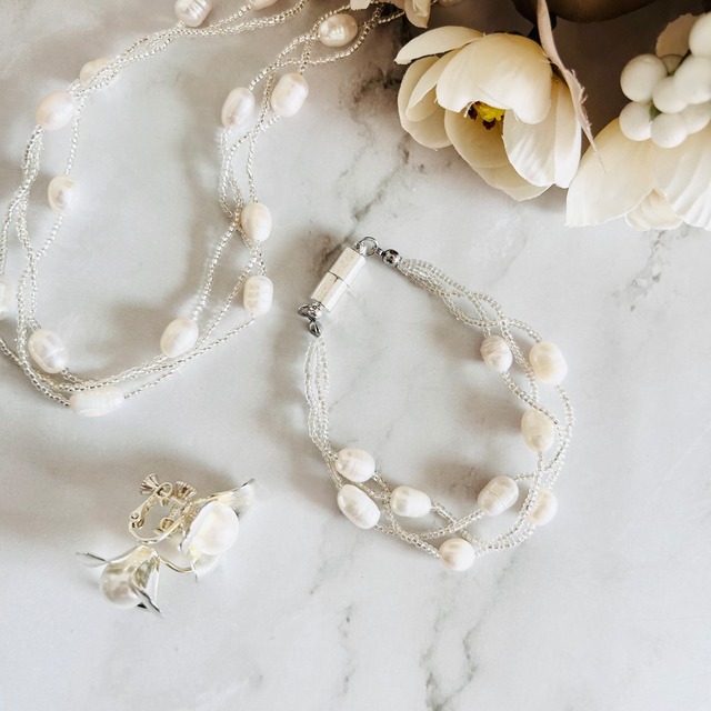天然の淡水パールと、繊細に輝くシルバービーズを組み合わせたブレスレットです。 3本のビーズラインをゆるやかにツイストさせ、お手元に上品な立体感を生み出しました。 軽やかで肌なじみが良く、マグネット式の留め具で着脱もスムーズにしていただけます。 手首にフィットする長さは、お仕事やお食事などでも邪魔にならずさまざまなシーンで楽しんでいただけます。 やわらかな白い光を放つ淡水パールが、動くたびに上品な存在感を演出☆ 細やかなビーズのきらめきが、手元に軽やかな華やぎを添えてくれます。 ニットやブラウスの袖口からのぞかせたり、ワンピースやジャケットスタイルに合わせても素敵です。 同シリーズのネックレス【56】とセットでお使いいただくと、より一層華やかなコーディネートが完成します。 清楚でありながら華やかさも併せ持つ、季節を問わず活躍するブレスレットです。 ▶︎長さ 約18cm