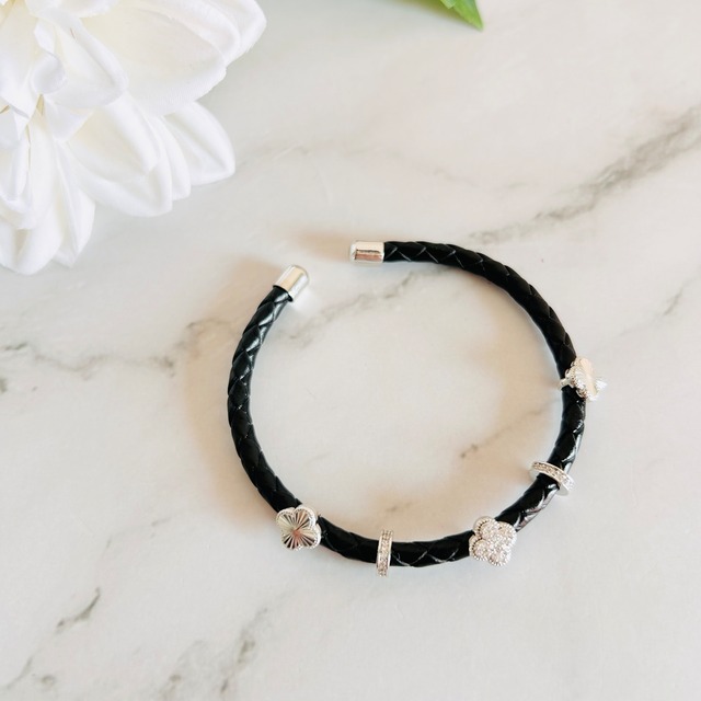 【912】ブランレーヌブレスレットのお色違いです。 しなやかなブラックレザーに、シルバーのチャームをバランスよく散りばめたバングルタイプのブレスレット。 マットな質感とキラリと光るチャームのコントラストが、さりげなくも印象に残る存在感を演出します。 手首にぴったりと沿うスリムなデザインなので、夏のカジュアルスタイルにもすっとなじみます♪ シンプルな時計やお手持ちのブレスレットと重ねづけするのもおすすめです♡ 洗練された上品な印象をひとさじ加えてくれるブレスレットです。 ▶︎内周 約15cm フリーサイズ