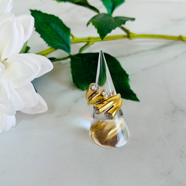 艶やかなゴールドカラーのボリューム感あるメタルに、クリアジルコニアストーンを3つあしらったモダンなデザイン。 しっかりとした厚みと美しい曲線が、指元に存在感を与えます。 シンプルでありながら、視線を惹きつける美しさ☆ きらりと光るストーンがアクセントとなり、指先に華やぎをプラスします。 1本でも十分な主役感があり、シックな装いに合わせて大人のモードスタイルに! ブレスレットやバングルとのレイヤードもおすすめです。 何気ない仕草までも、凛と美しく映してくれる一本です。 14〜15号前後 (多少のサイズ調整可能) ▶︎ 縦 約2.6cm
