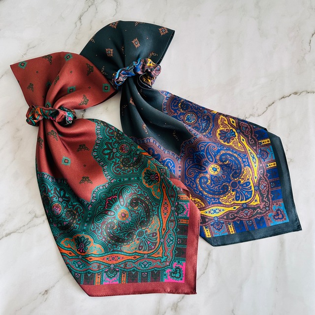 艶やかな光沢をまとったシルクが、しなやかに首元を包み込む——。 クラシカルなペイズリーを現代的な感性で描いた、気品あふれるシュシュがセットになったスカーフです。 ▶︎ 大きさ 20cm×100cm ▶︎ 素材 シルク100% ▶︎ 中国製 素材には、上質なシルク100%を贅沢に使用。 角度によって繊細に表情を変える艶めきが、まるで光をまとうような美しさを演出します。 バイアス仕立ての長方形デザインは、首に沿うように柔らかくフィットし、結ぶだけで自然なドレープを生み出す絶妙なシルエット。 シャツやニットの襟元にさっと忍ばせれば、気負いのないエレガンスを。 軽くひと巻きするだけでも、洗練された印象へと導きます。 カラーは、深みのあるバーガンディ×グリーンと、知的で華やかなネイビー×ロイヤルブルー。 どちらも装いに奥行きをもたらす、大人のためのシックな配色です。 クラシックとモダンが溶け合うその佇まいは、日常のスタイルに“物語”を添えてくれるよう。 しなやかな艶と、計算された美しいフォルムが装いに上質なエッセンスを加えてくれます。 ベラジェンテが提案する新しいシルクスタイルを、ぜひお楽しみください。