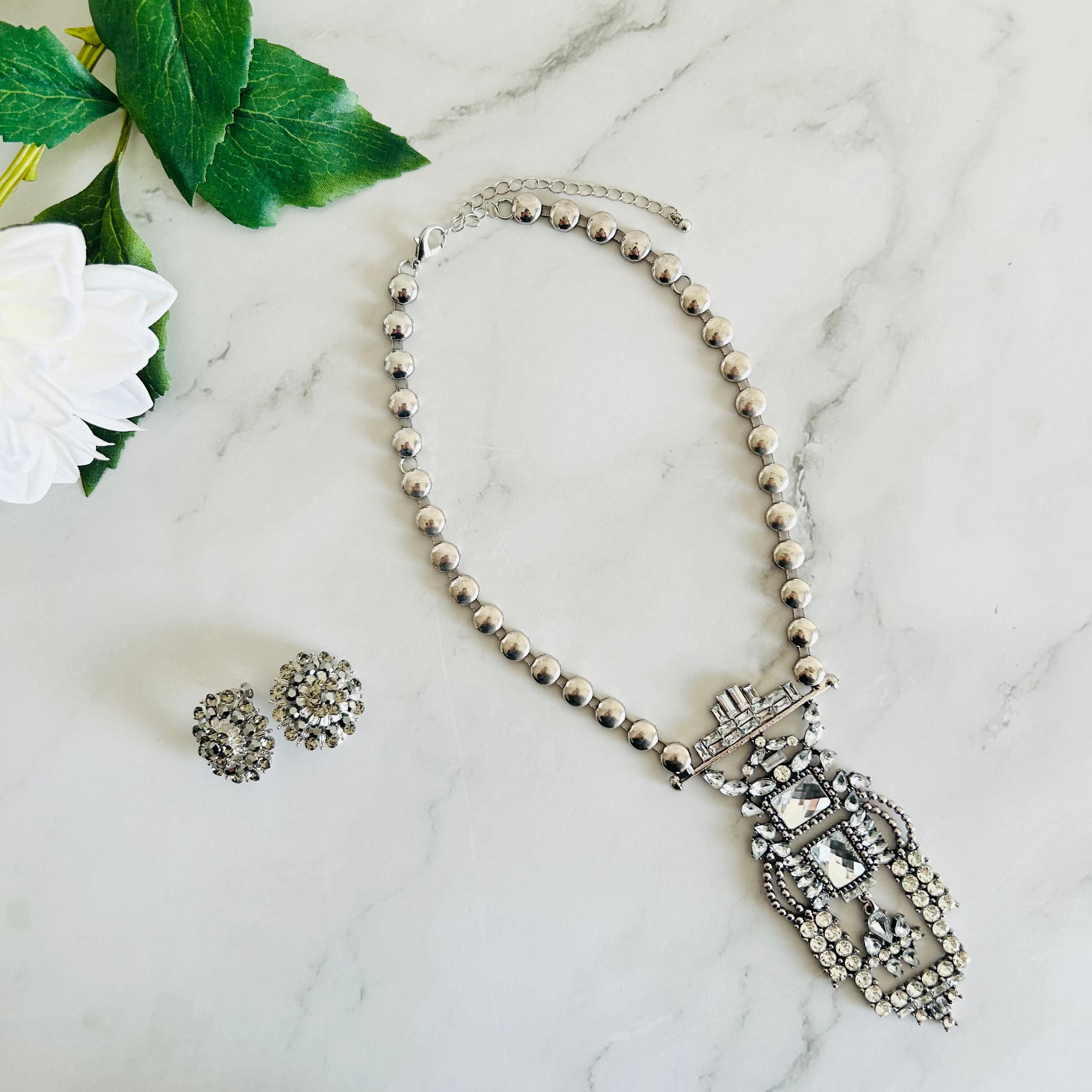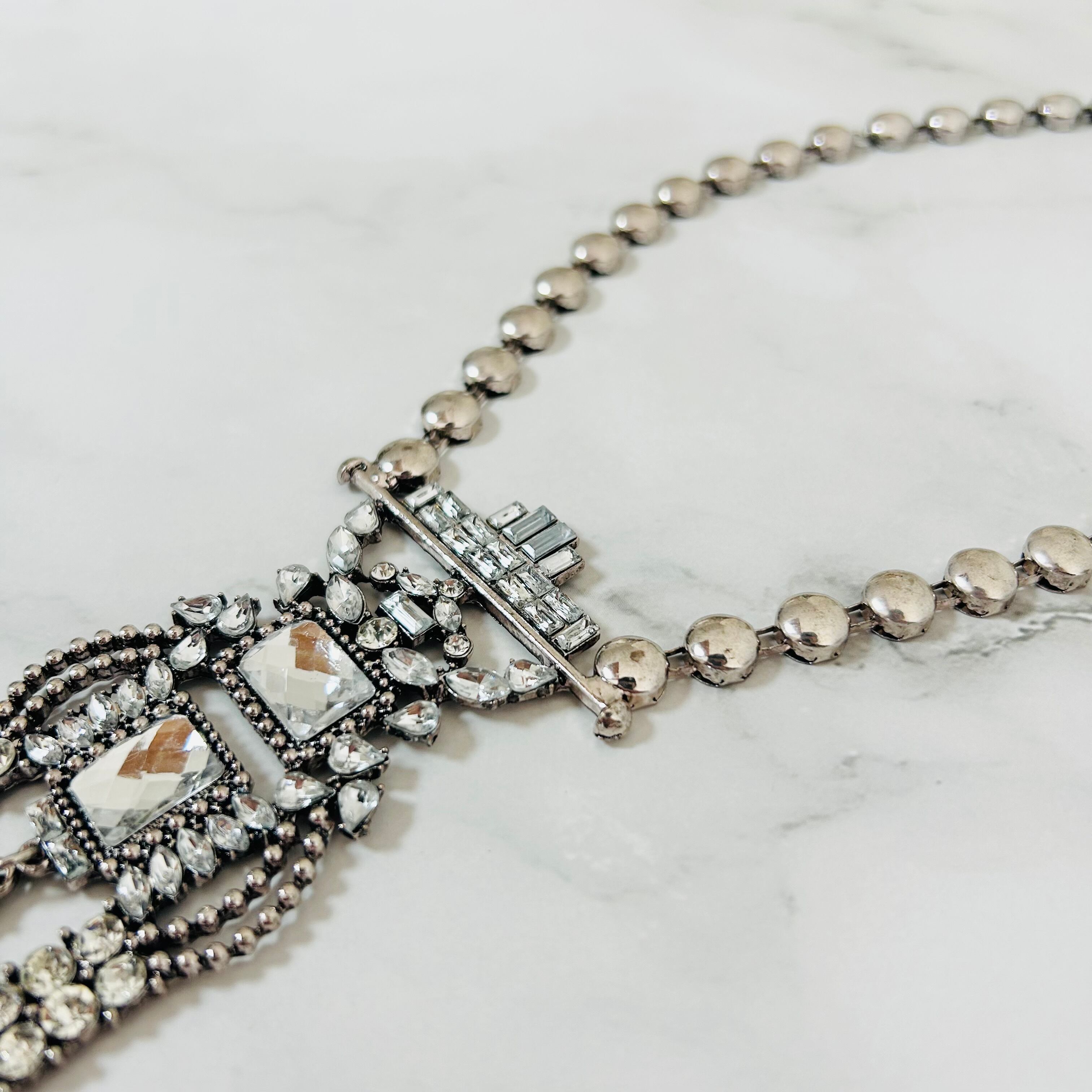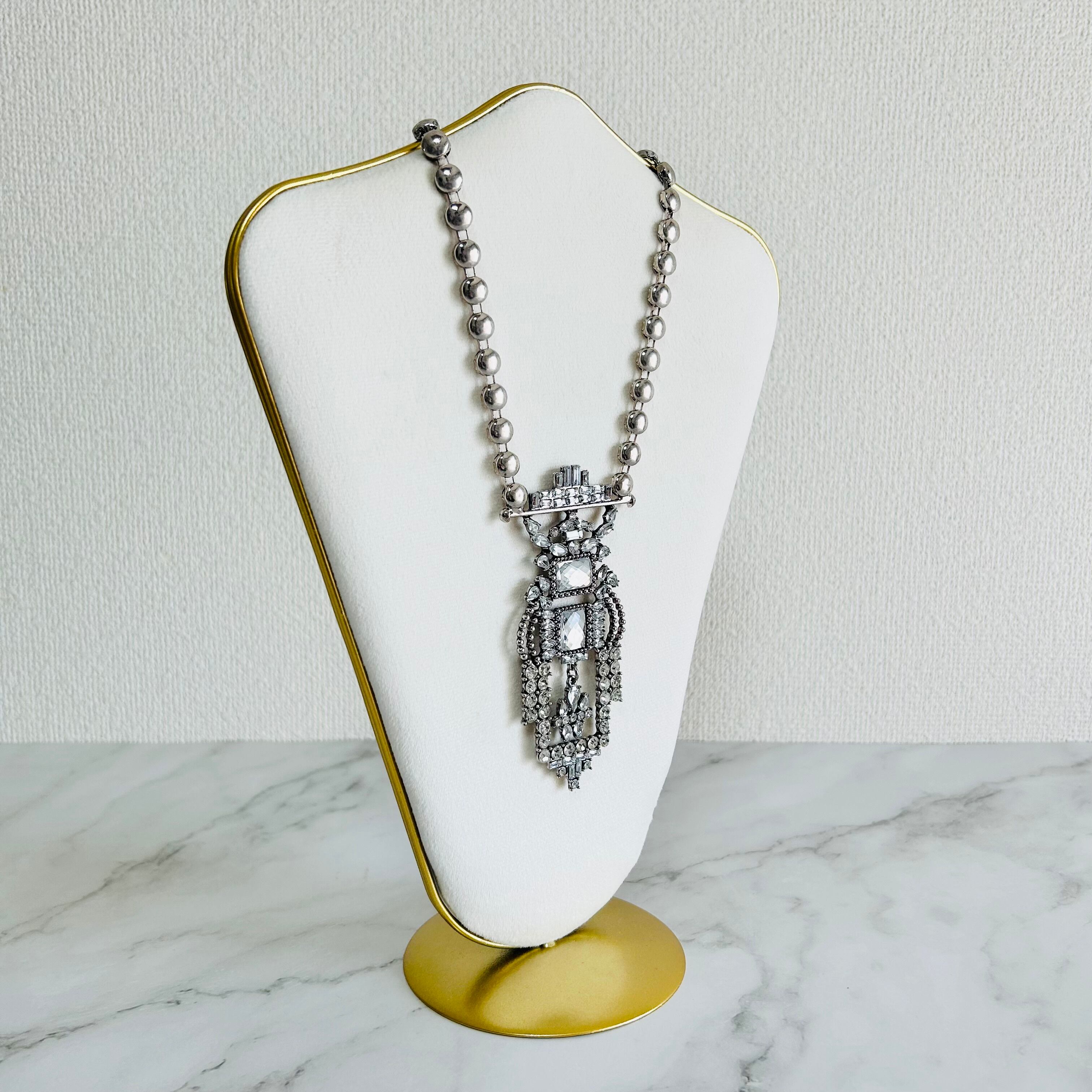 シルバーのメタルパーツに様々な形のクリスタルビジューをふんだんにあしらいアンティーク調に仕上げた大ぶりなデザインです。