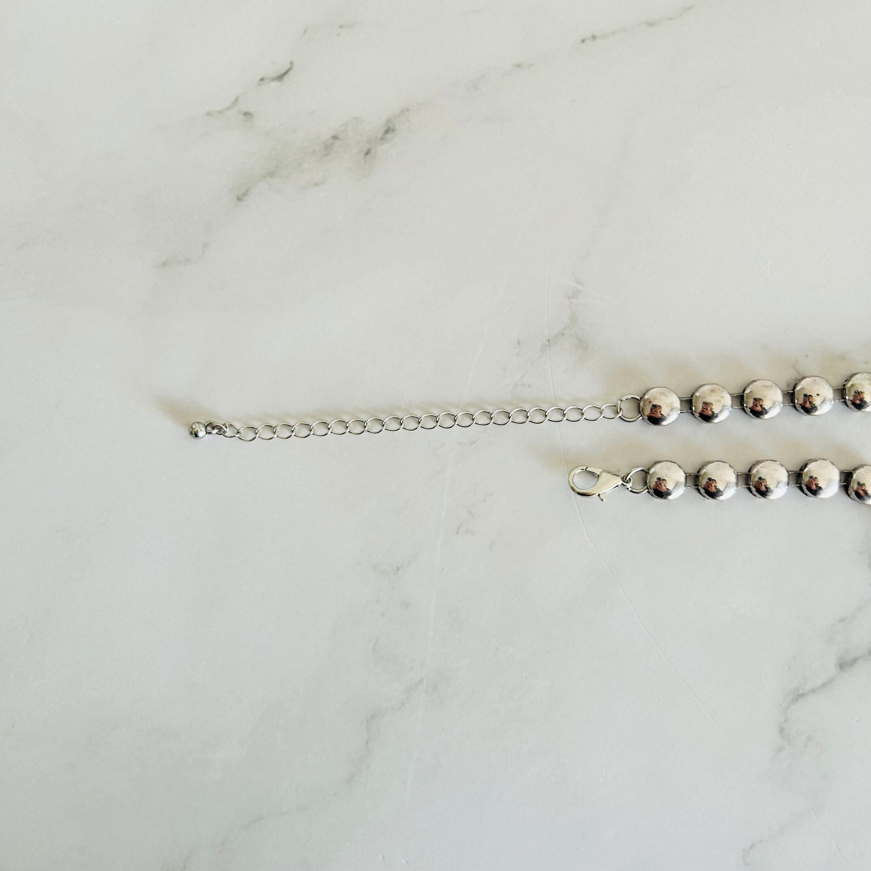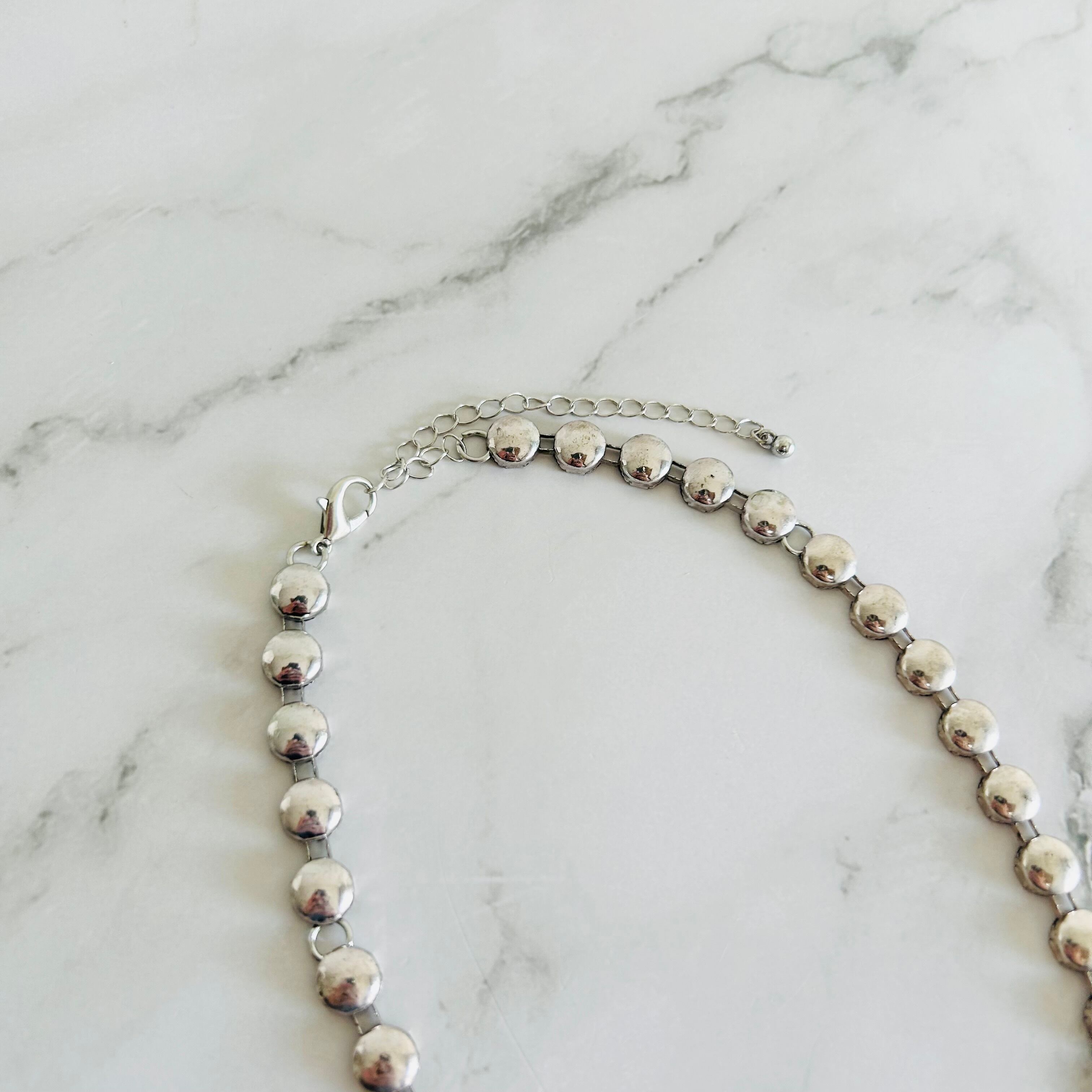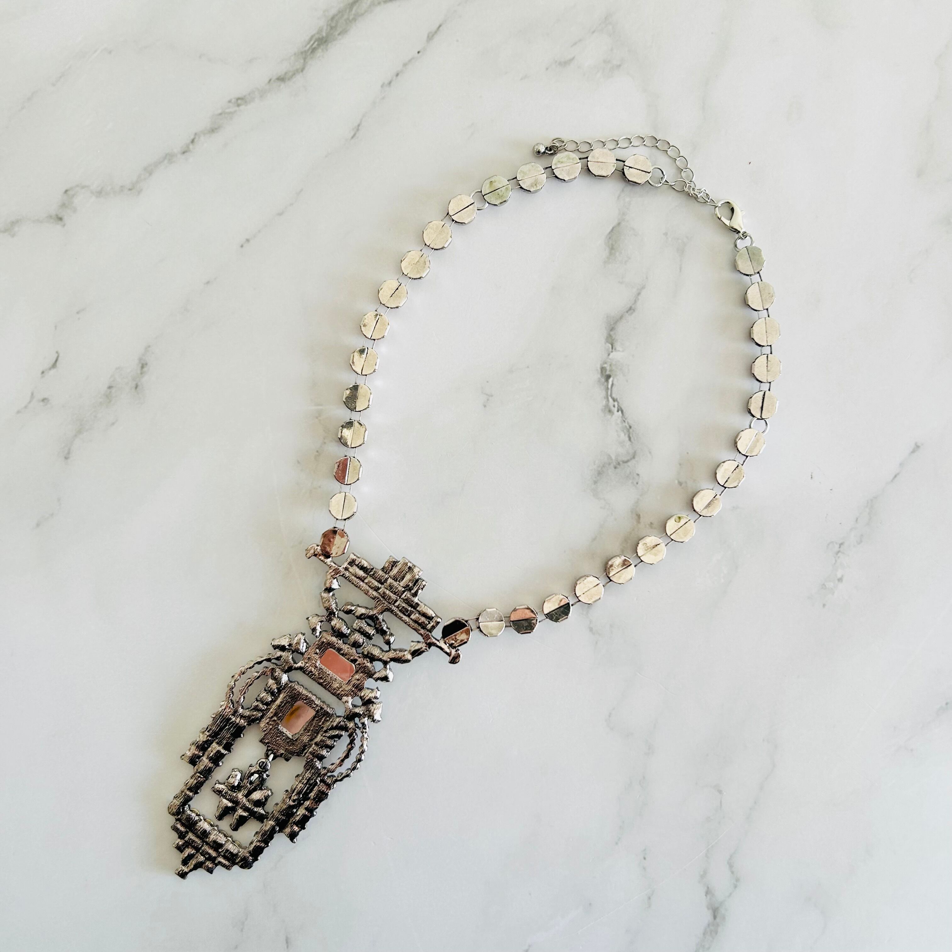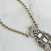 シルバーのメタルパーツに様々な形のクリスタルビジューをふんだんにあしらいアンティーク調に仕上げた大ぶりなデザインです。