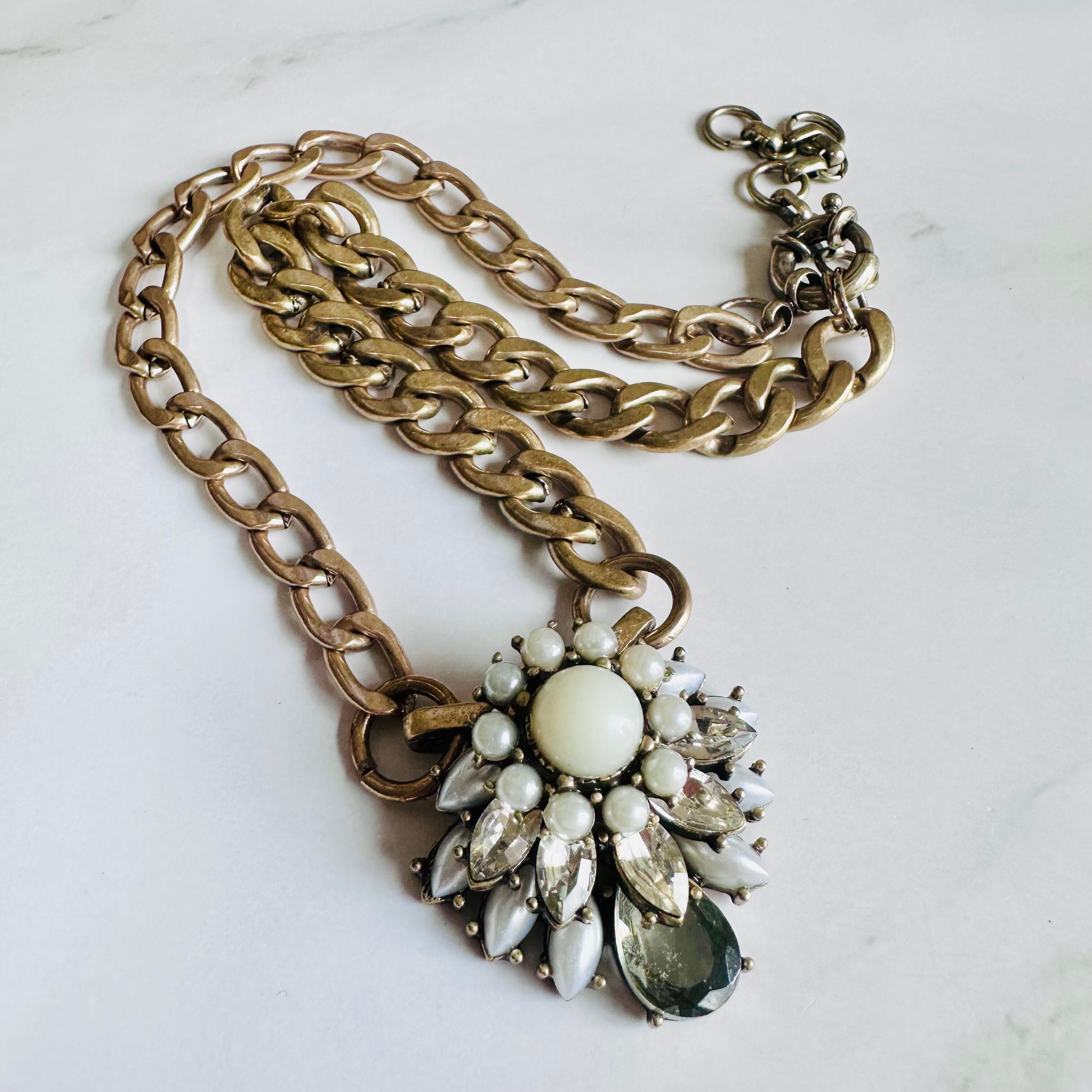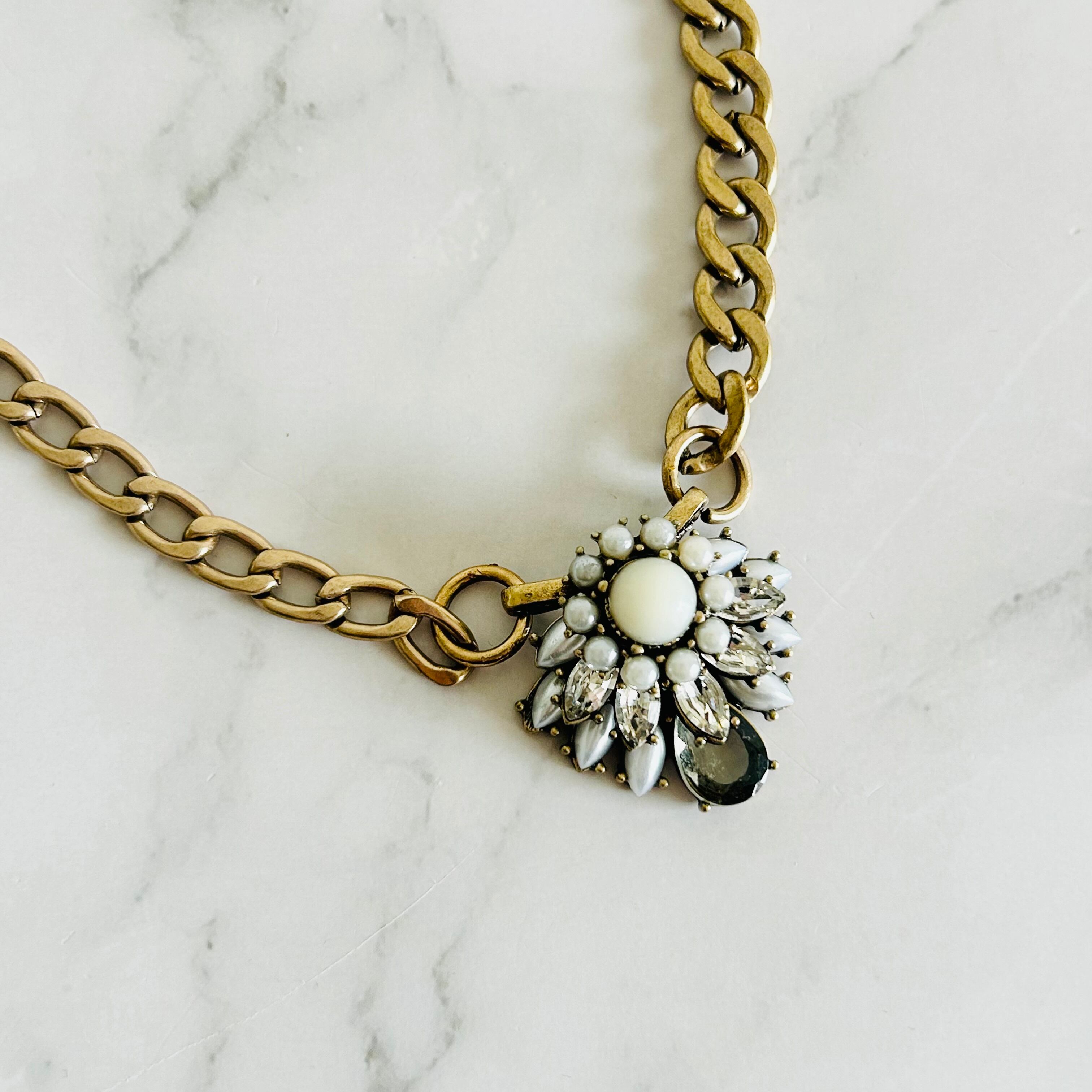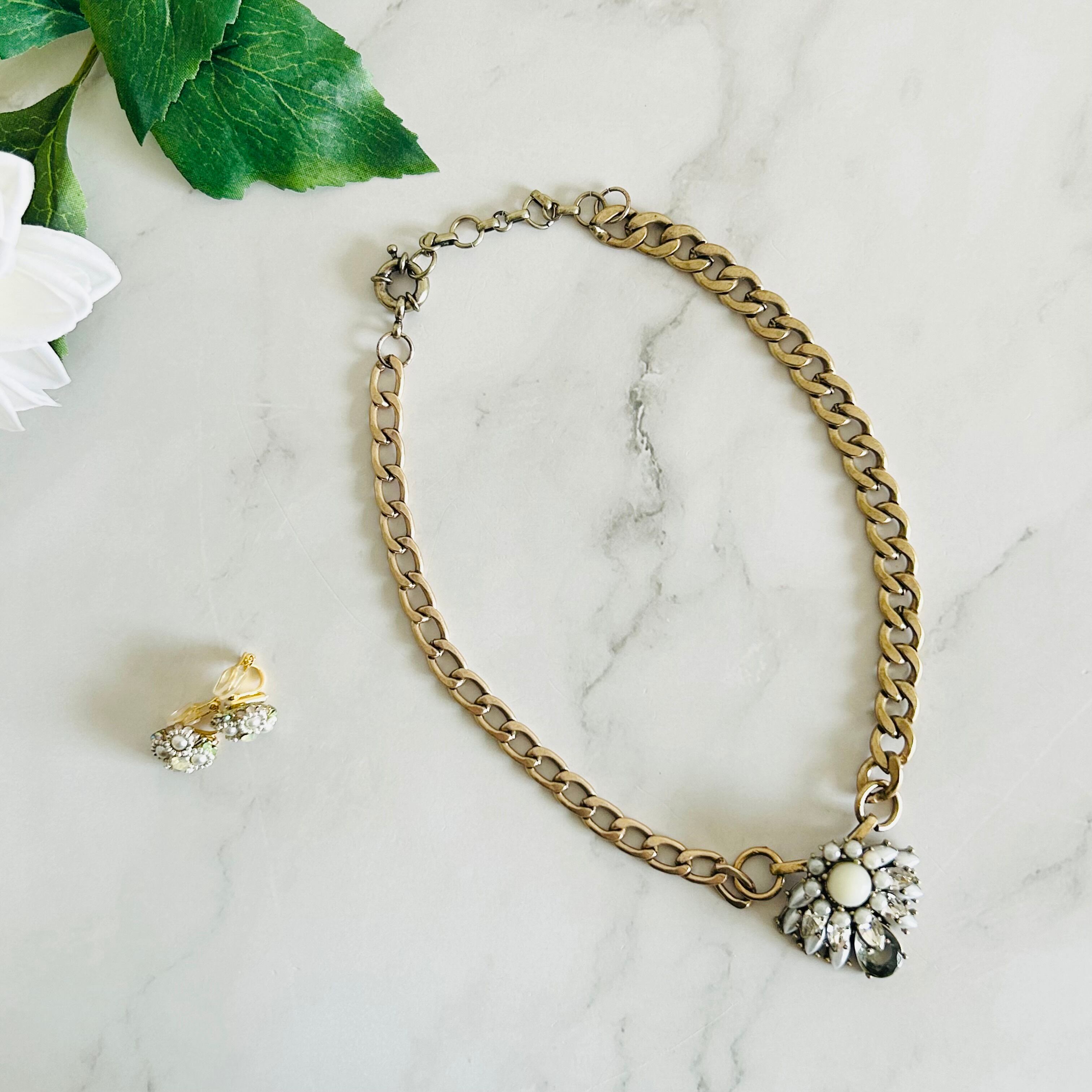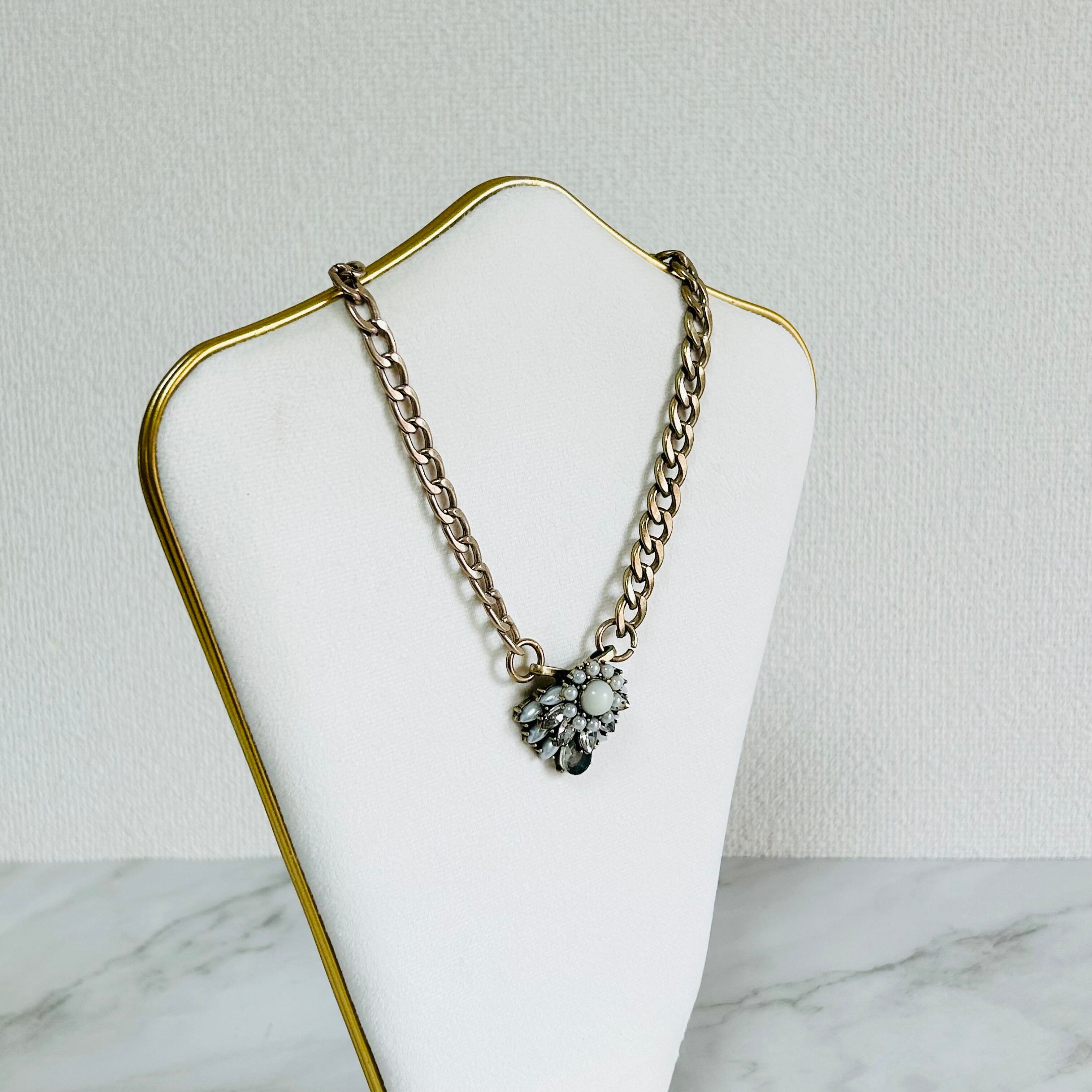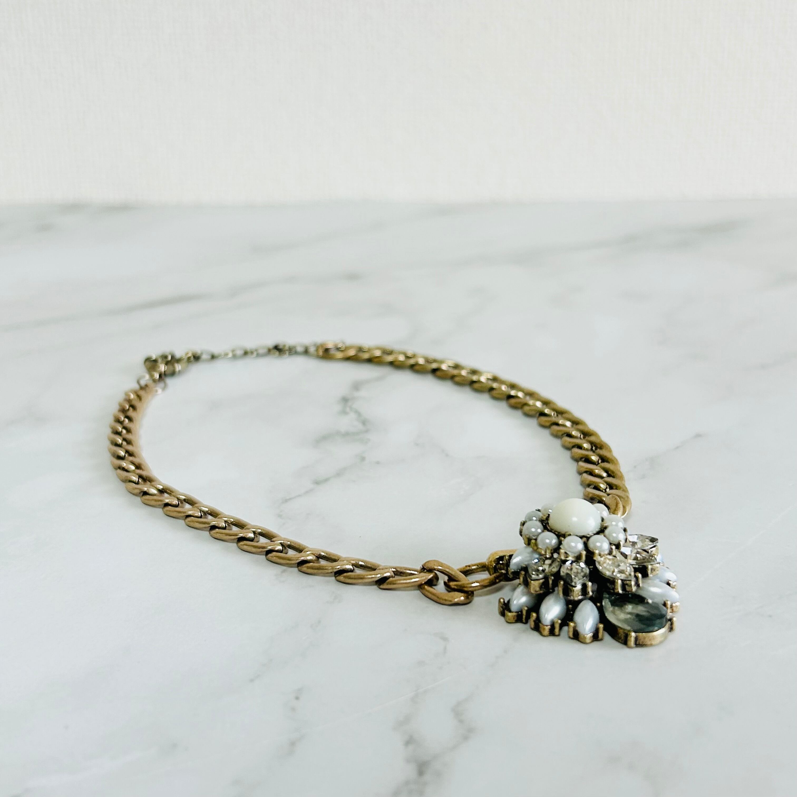 マットな質感のチャンキーチェーンにパールやクリスタルビジューで作られたモチーフを取り付けたアンティーク調のデザインです。
