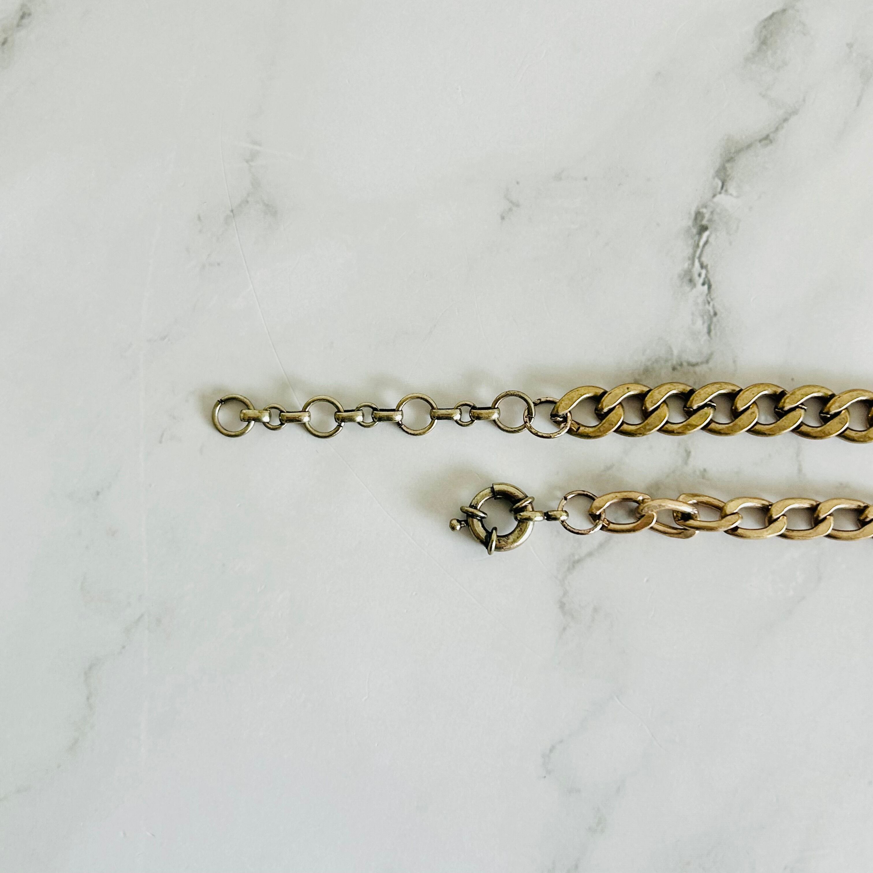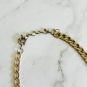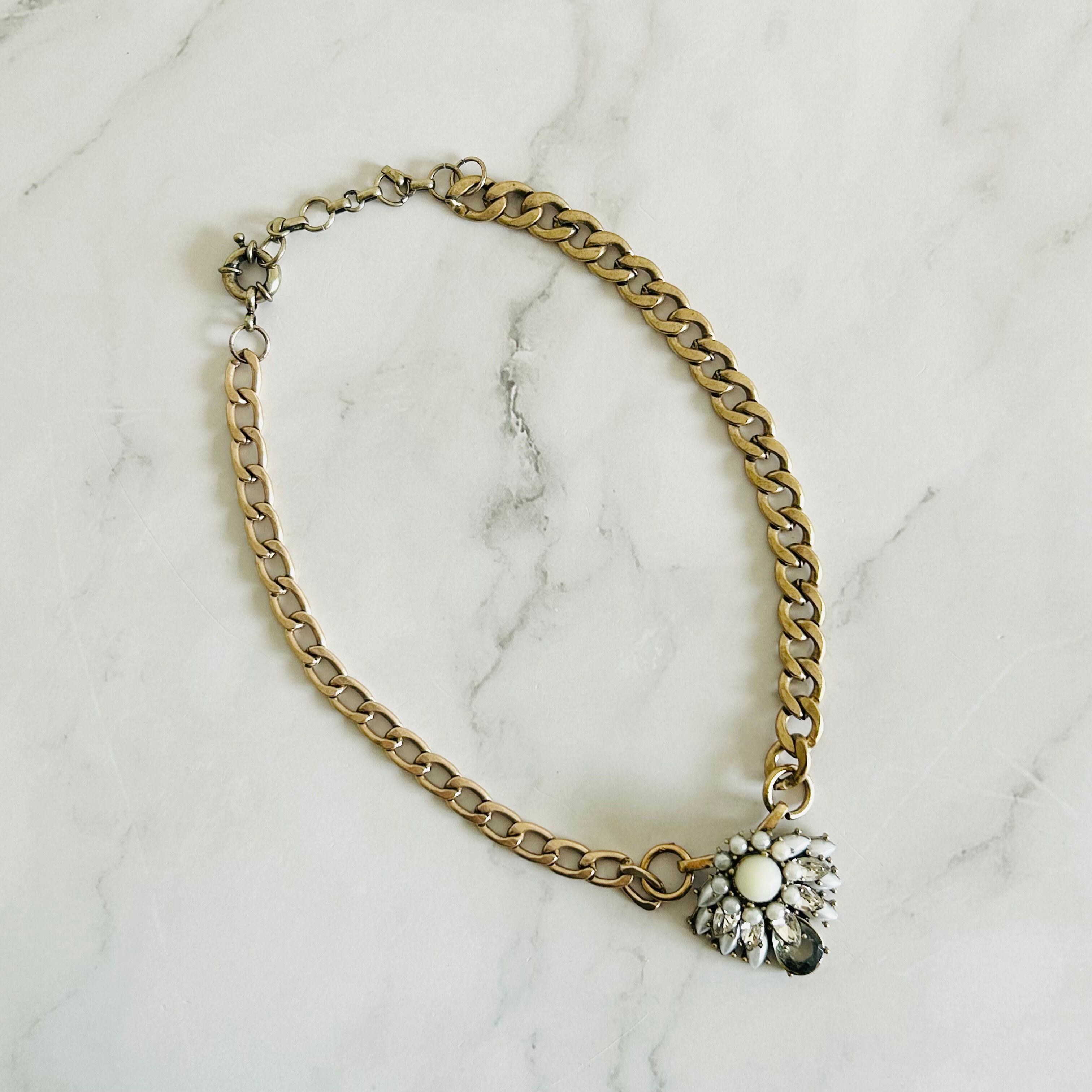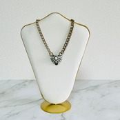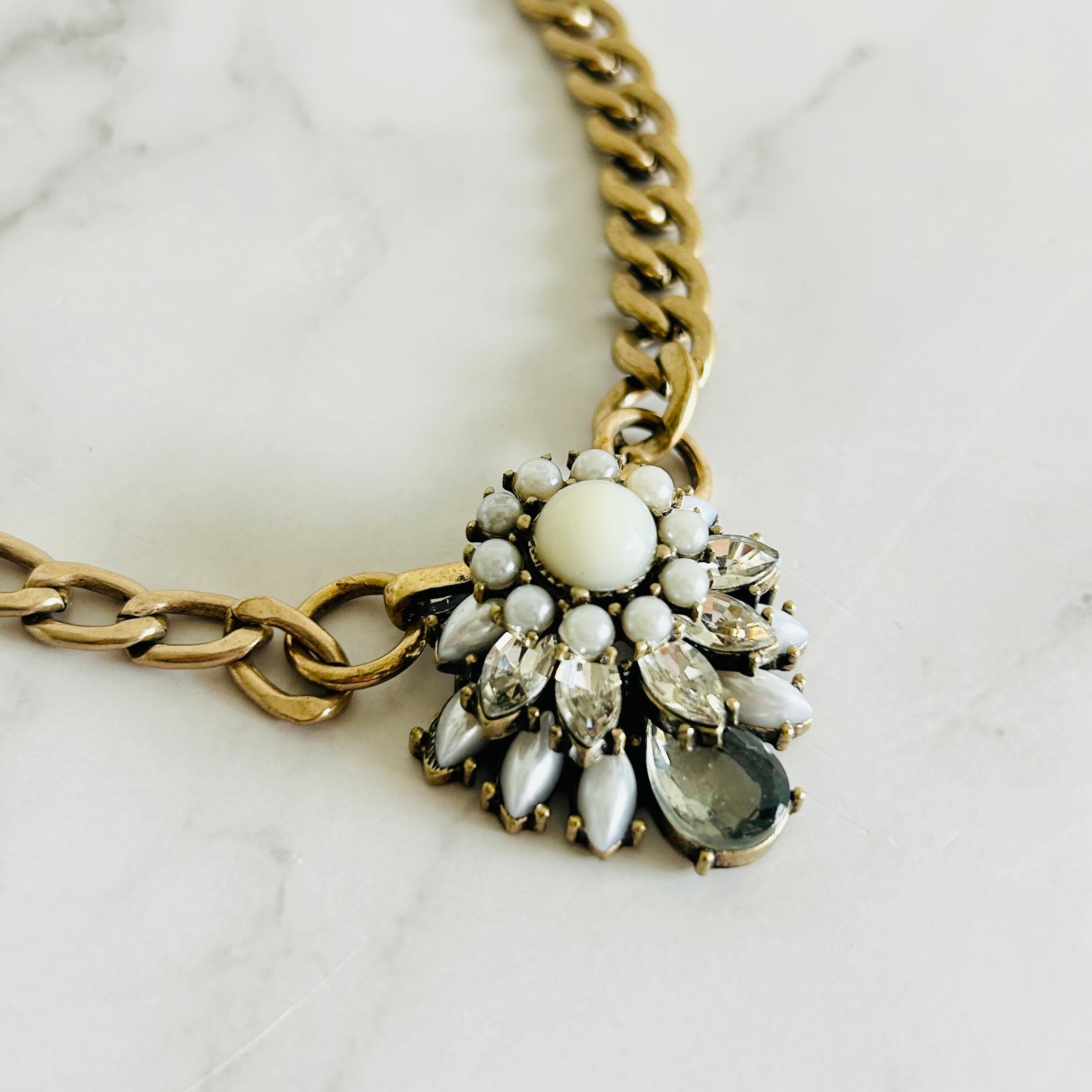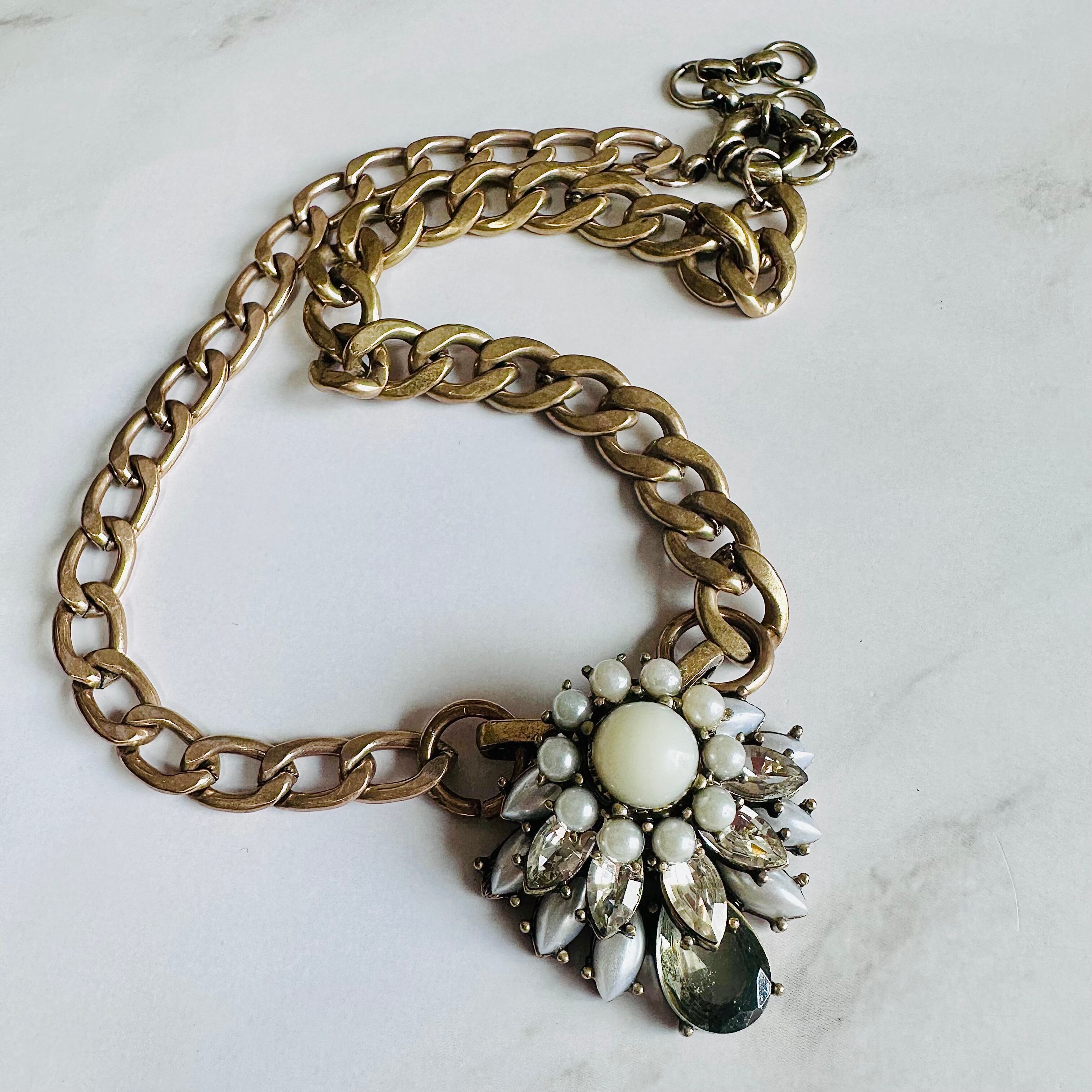 マットな質感のチャンキーチェーンにパールやクリスタルビジューで作られたモチーフを取り付けたアンティーク調のデザインです。