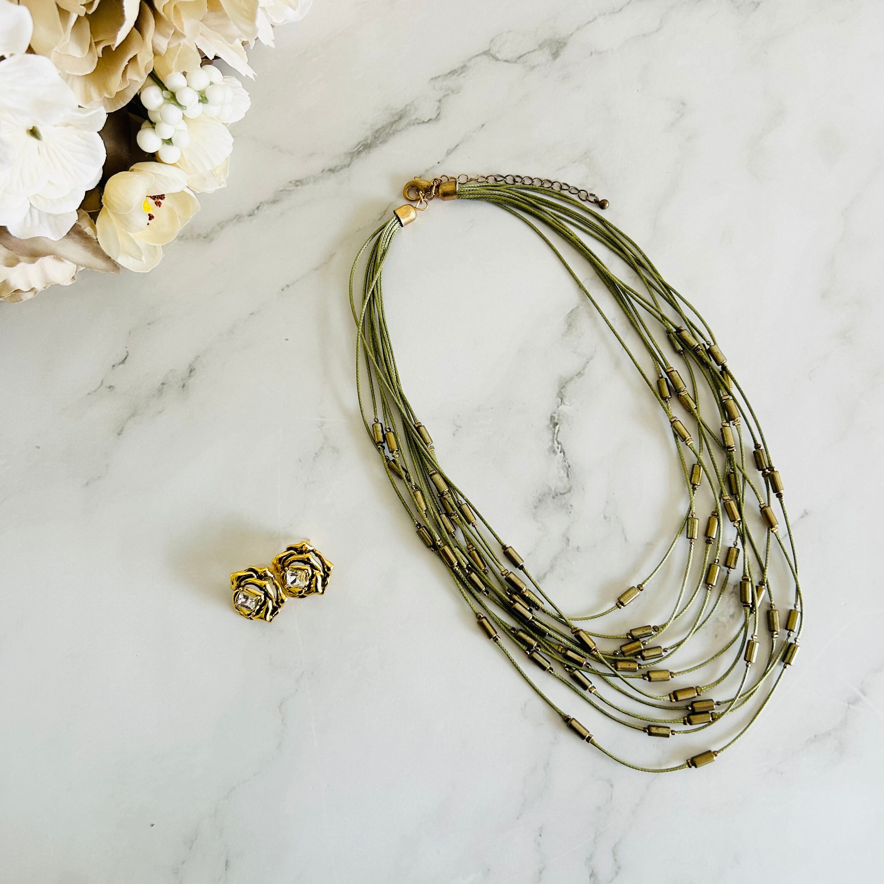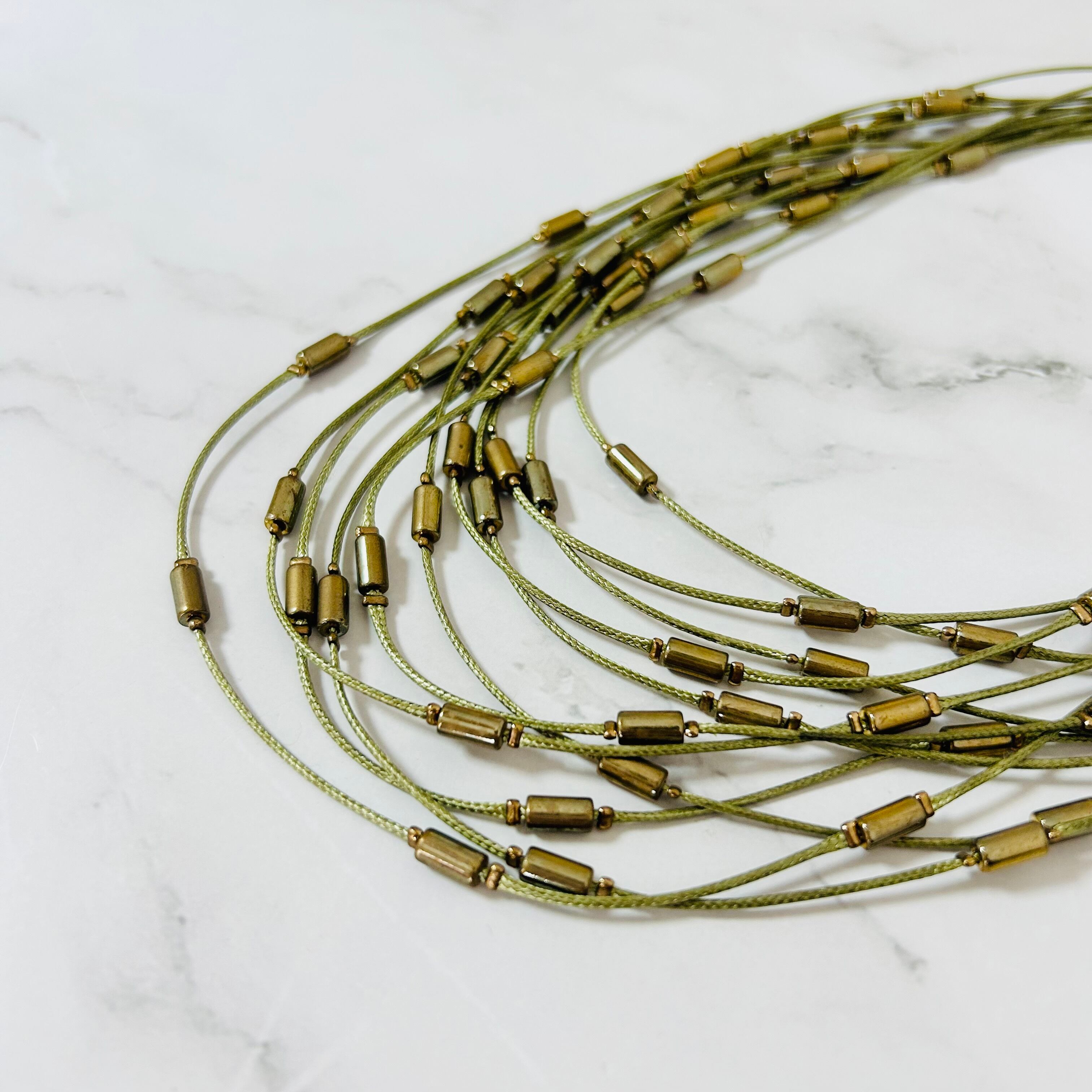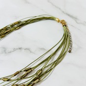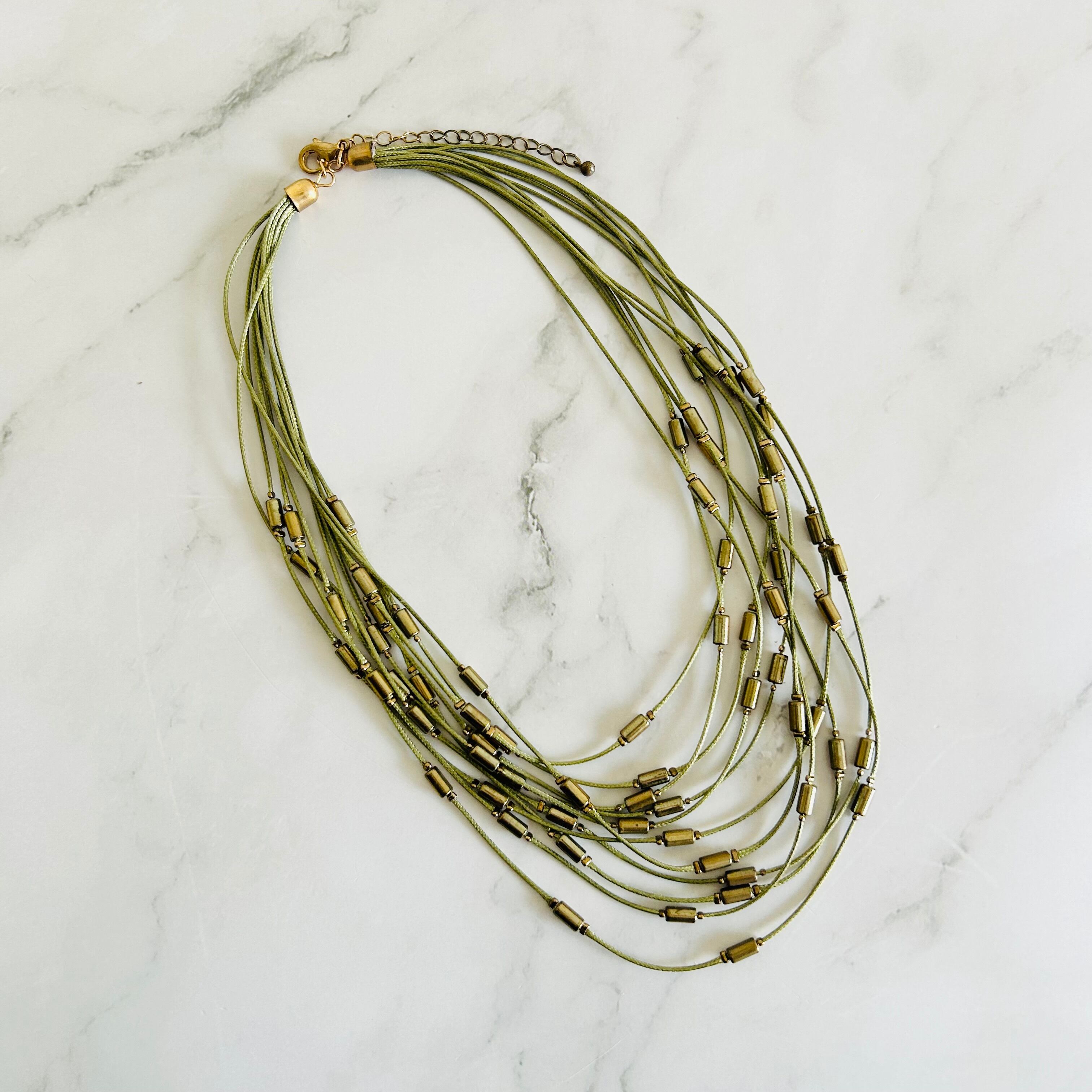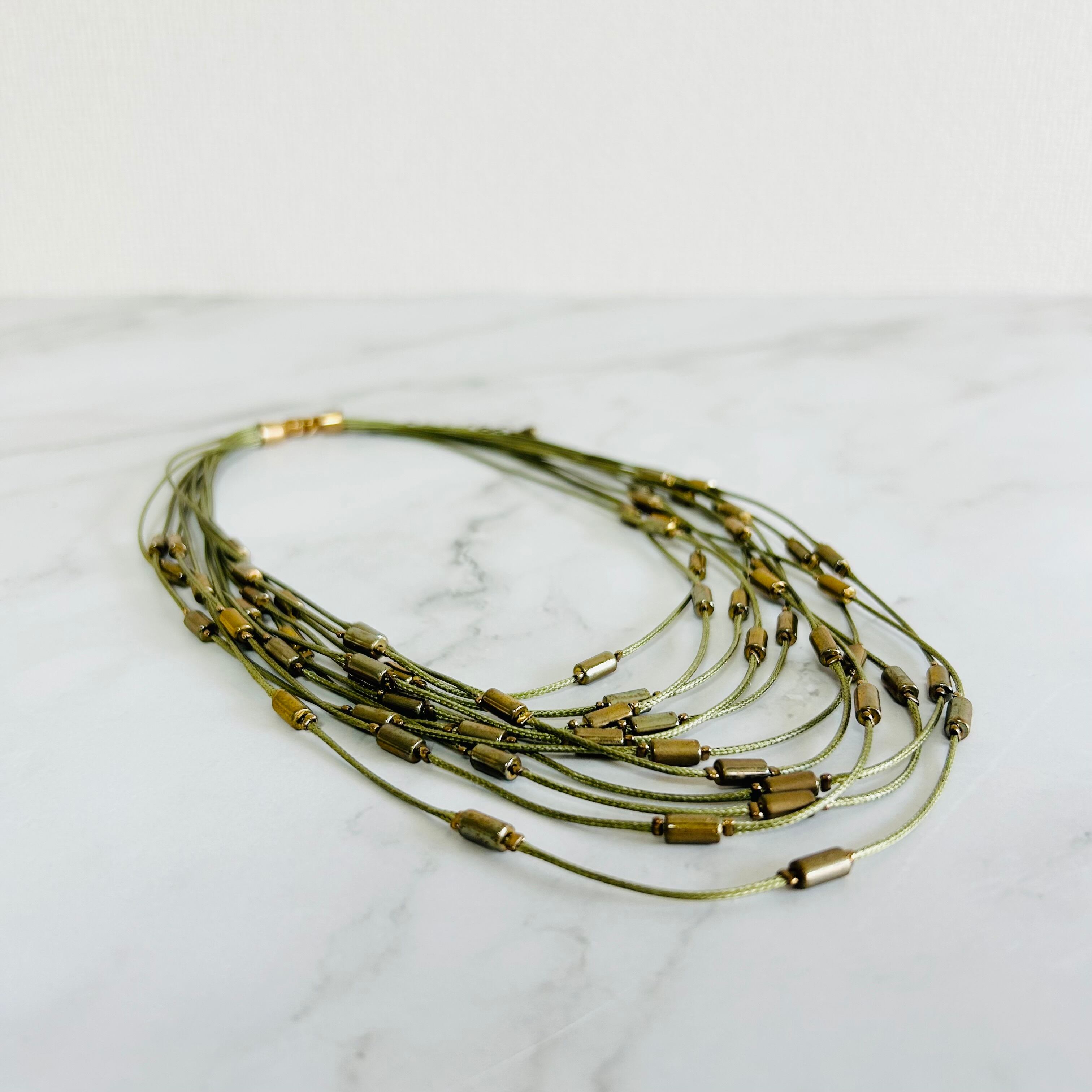 オリーブカラーのコードにヴィンテージ感のあるゴールドパーツをプラスし、何重にも束ねたデザインです。