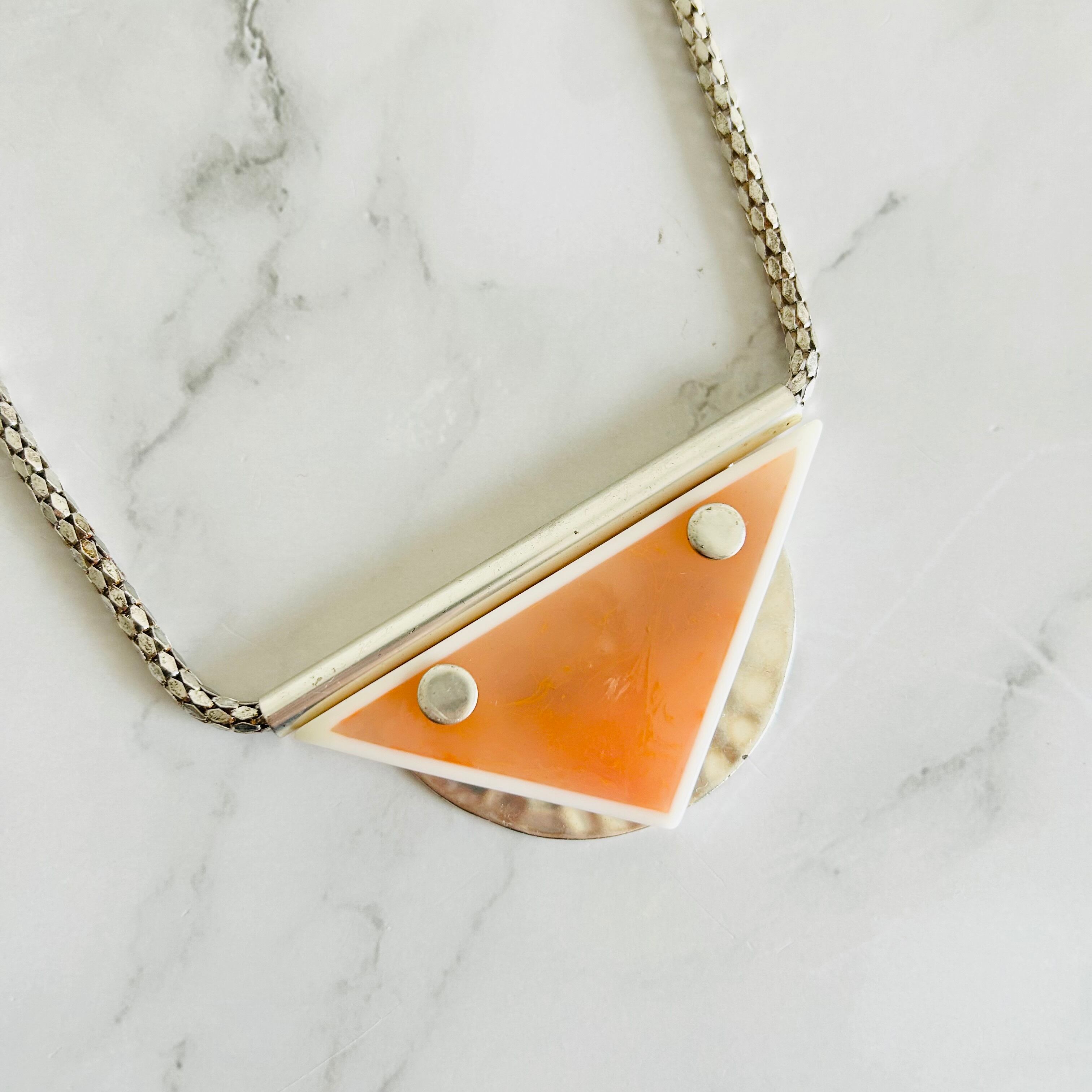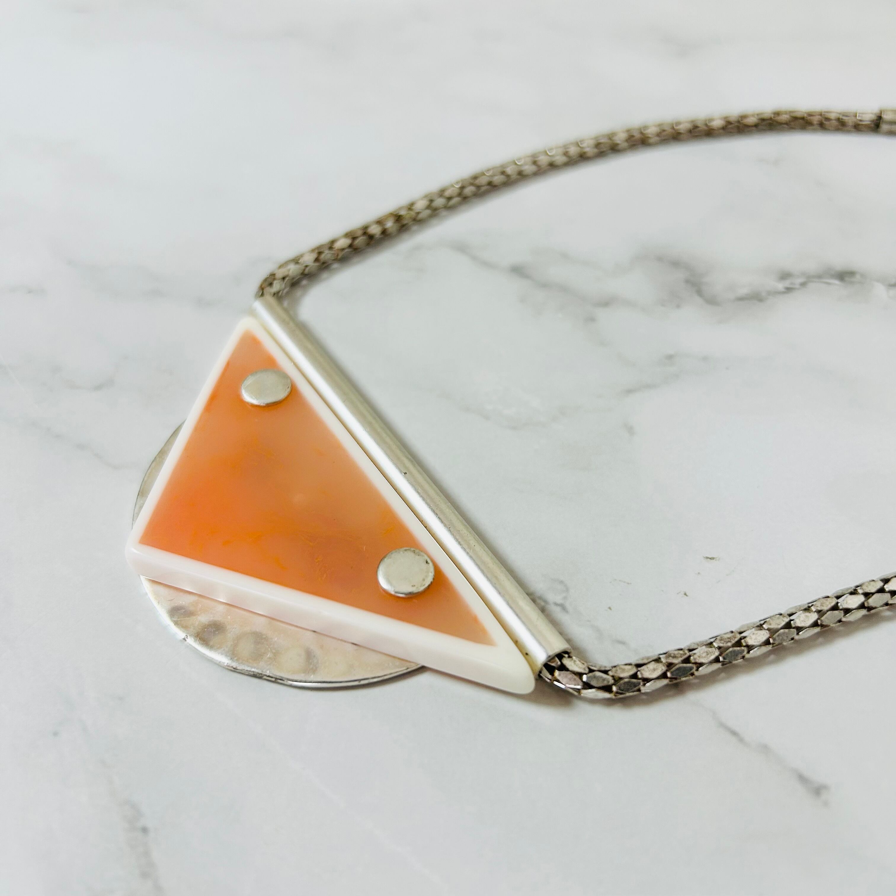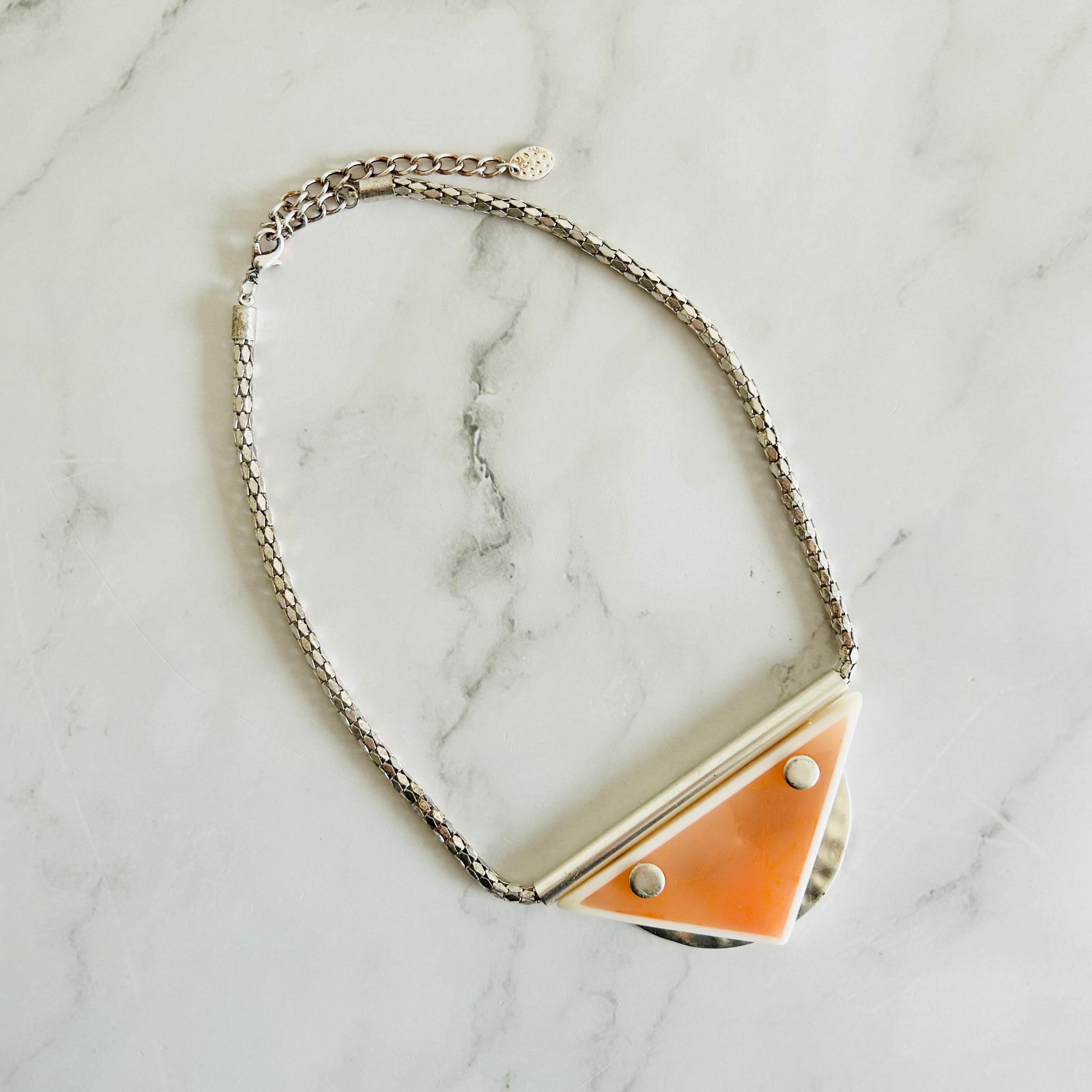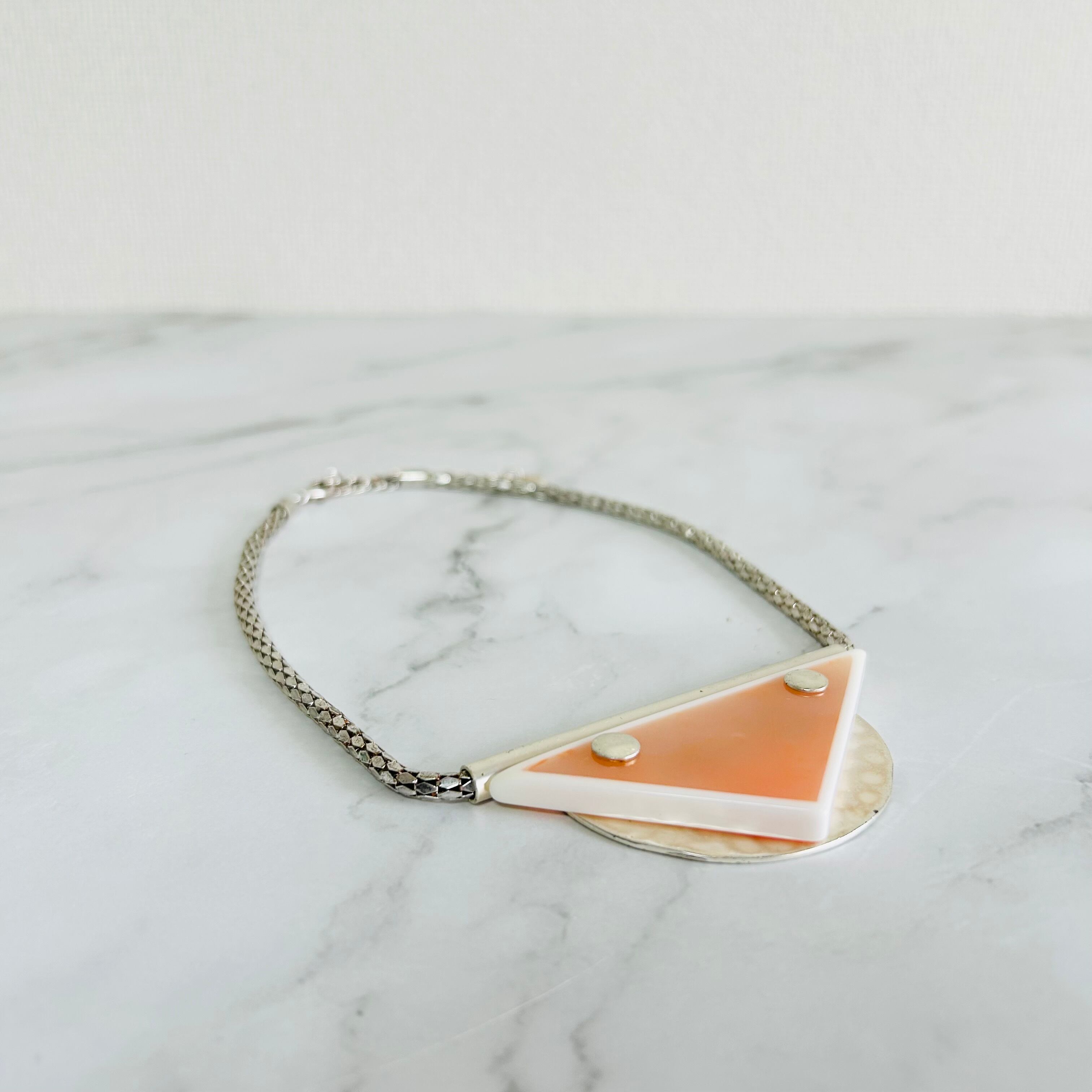 半透明のトライアングルモチーフをメインに立体的なマットな質感のシルバーチェーンを組み合わせたデザインです。