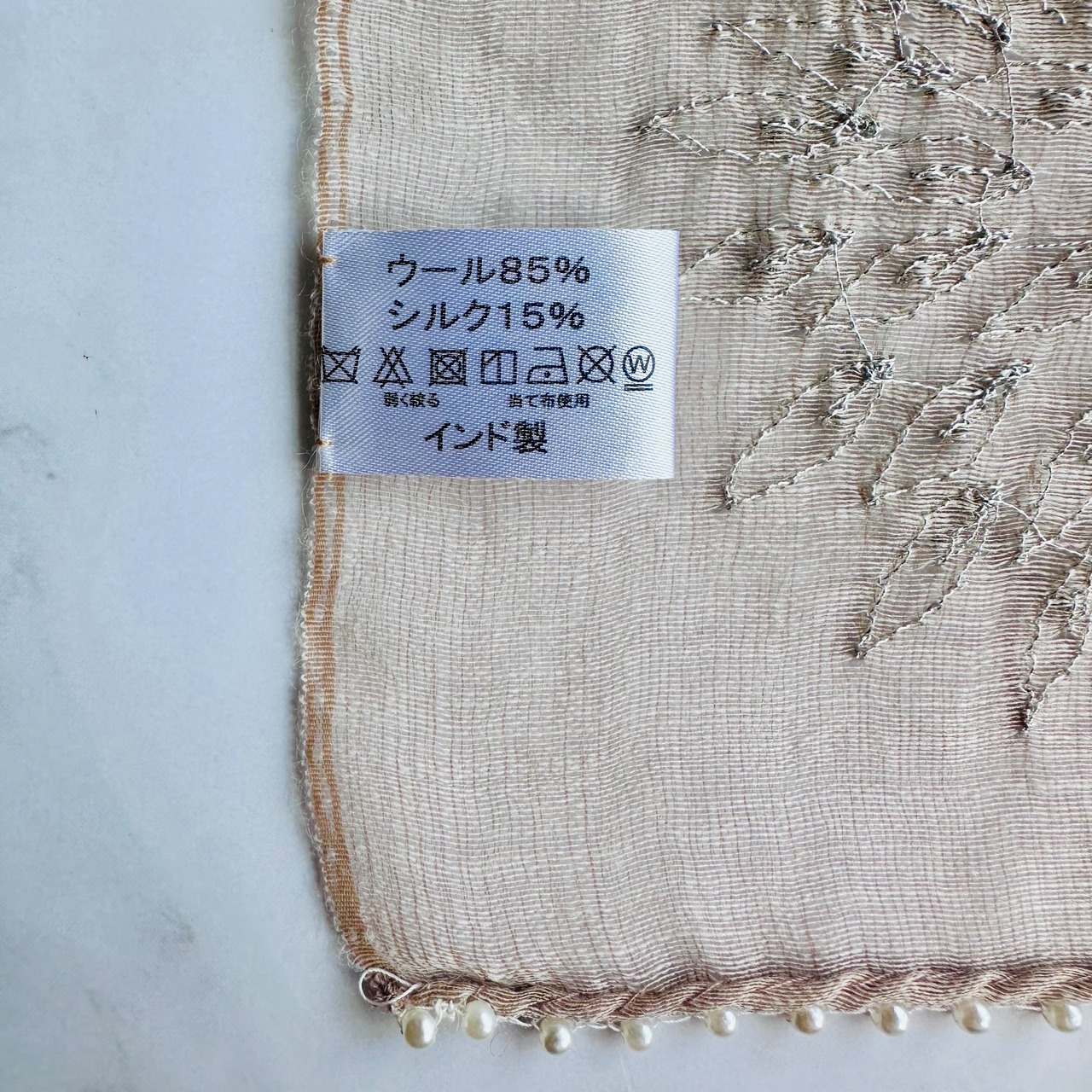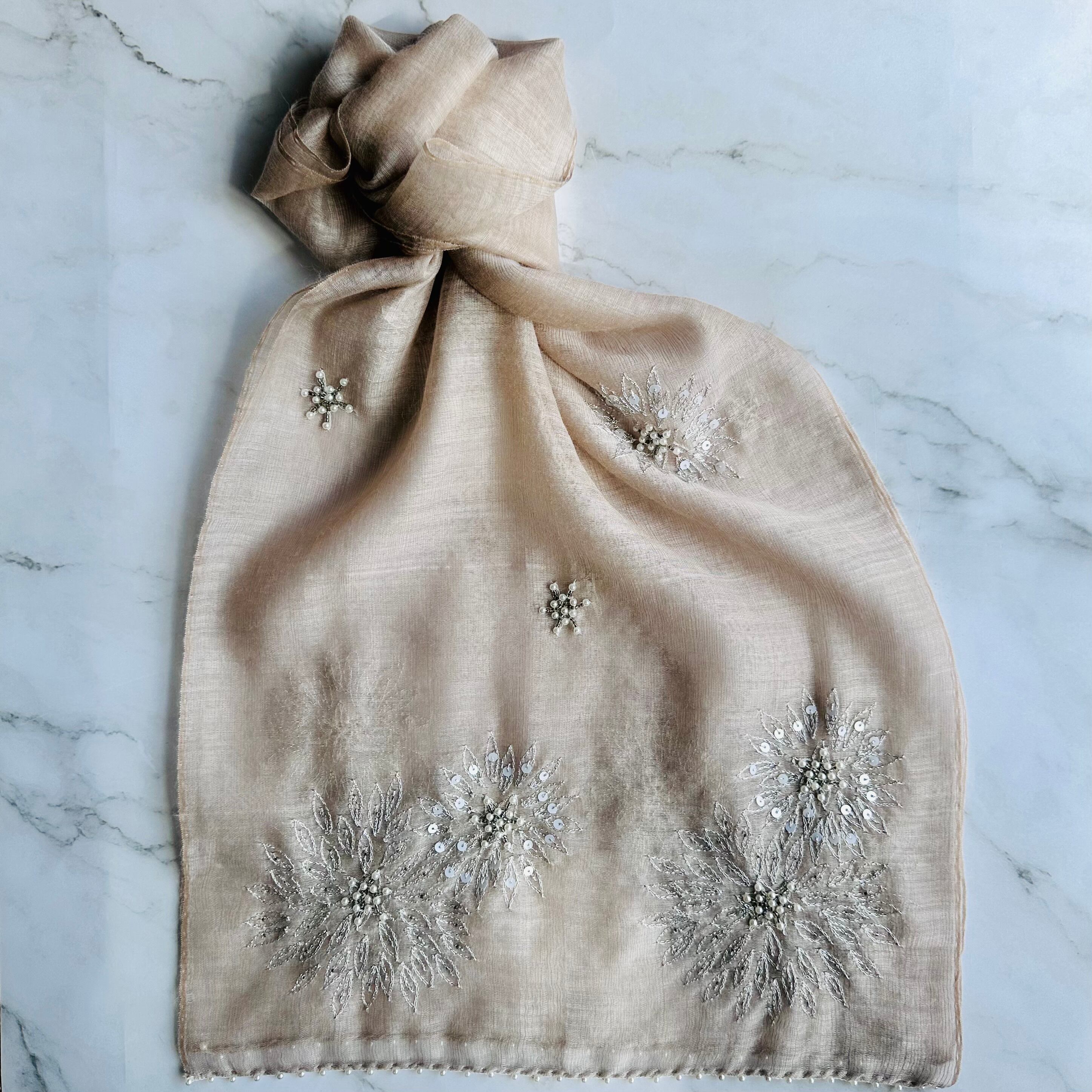 繊細な刺繍とシルクの光沢が織りなす、エレガントなストールです。