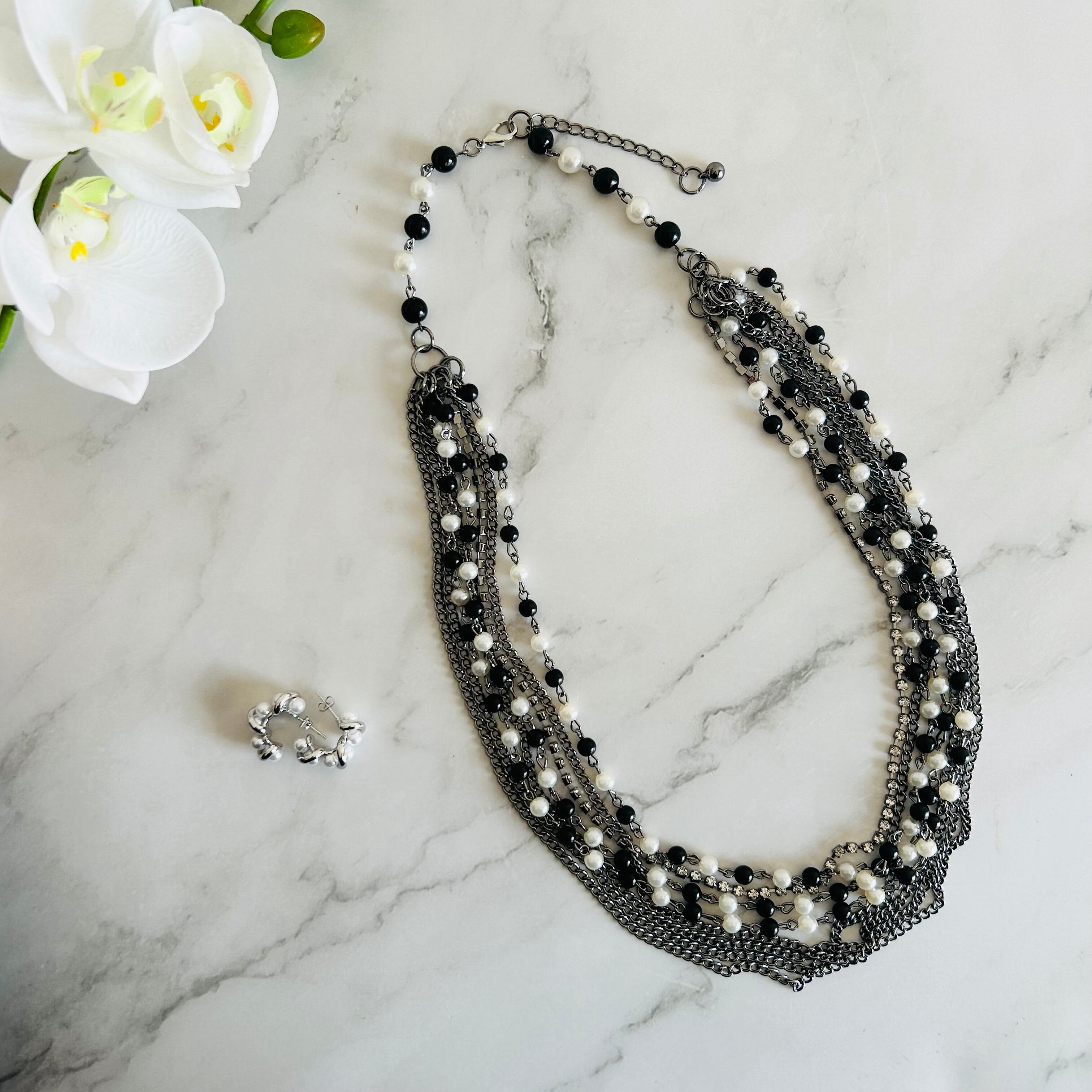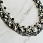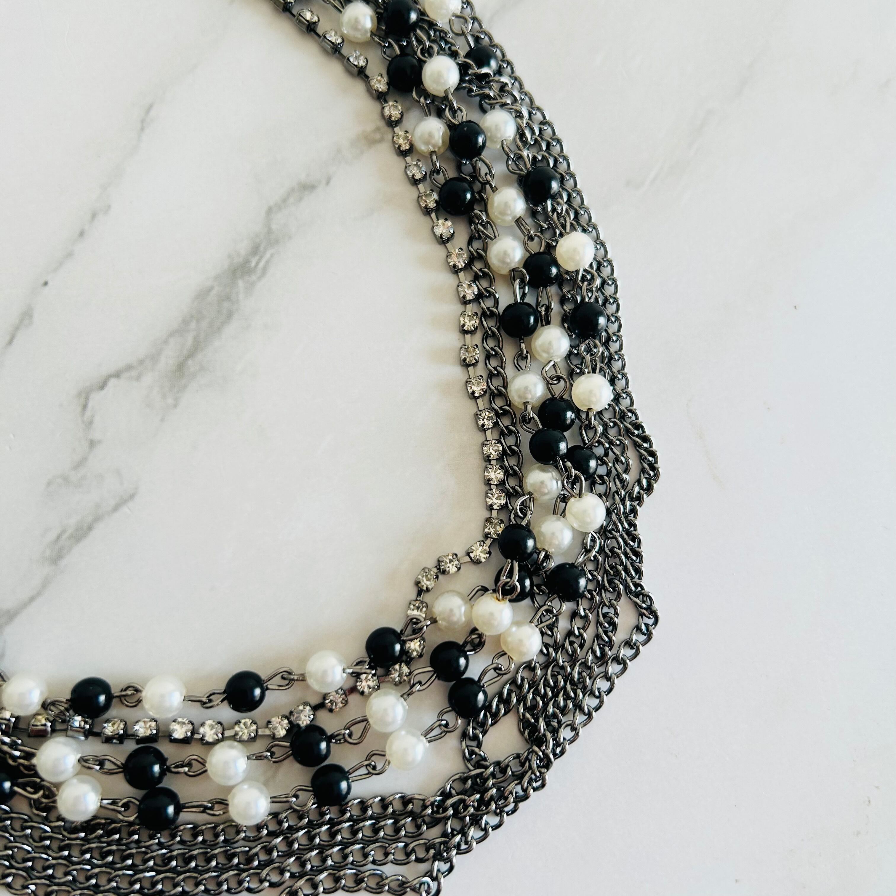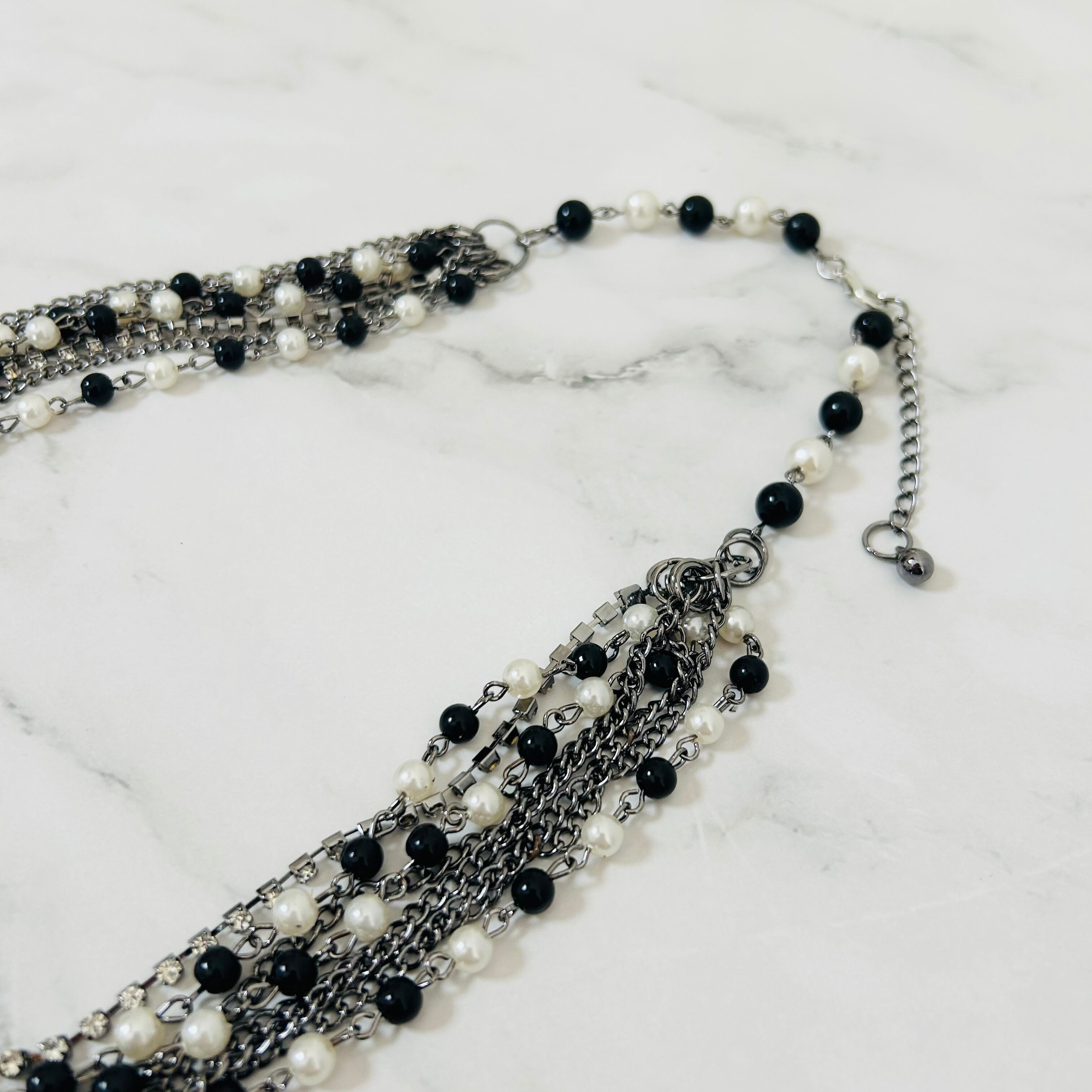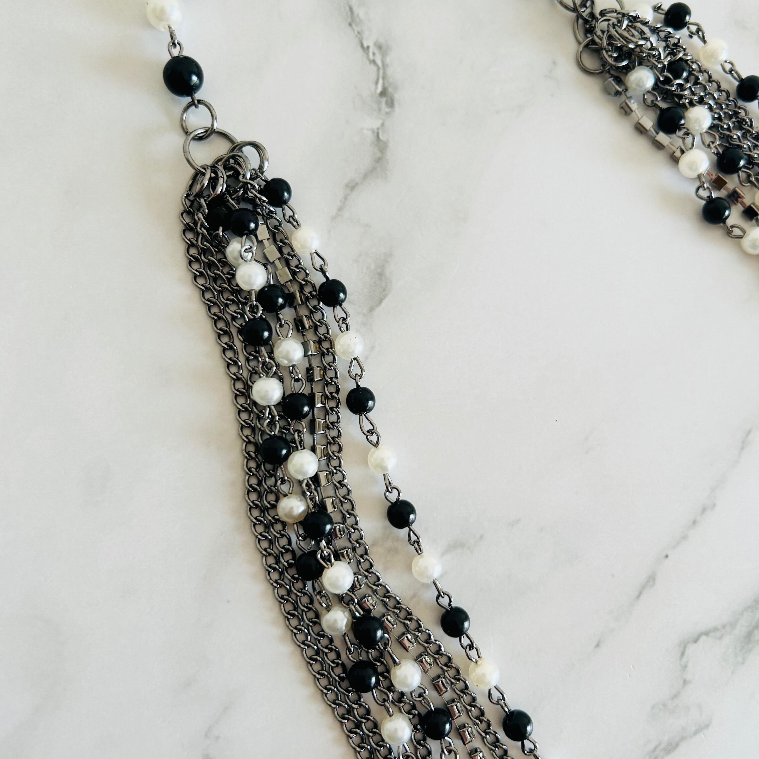 小ぶりなパールとブラックやビジューチェーンなどさまざなチェーンを連ねたデザインです。