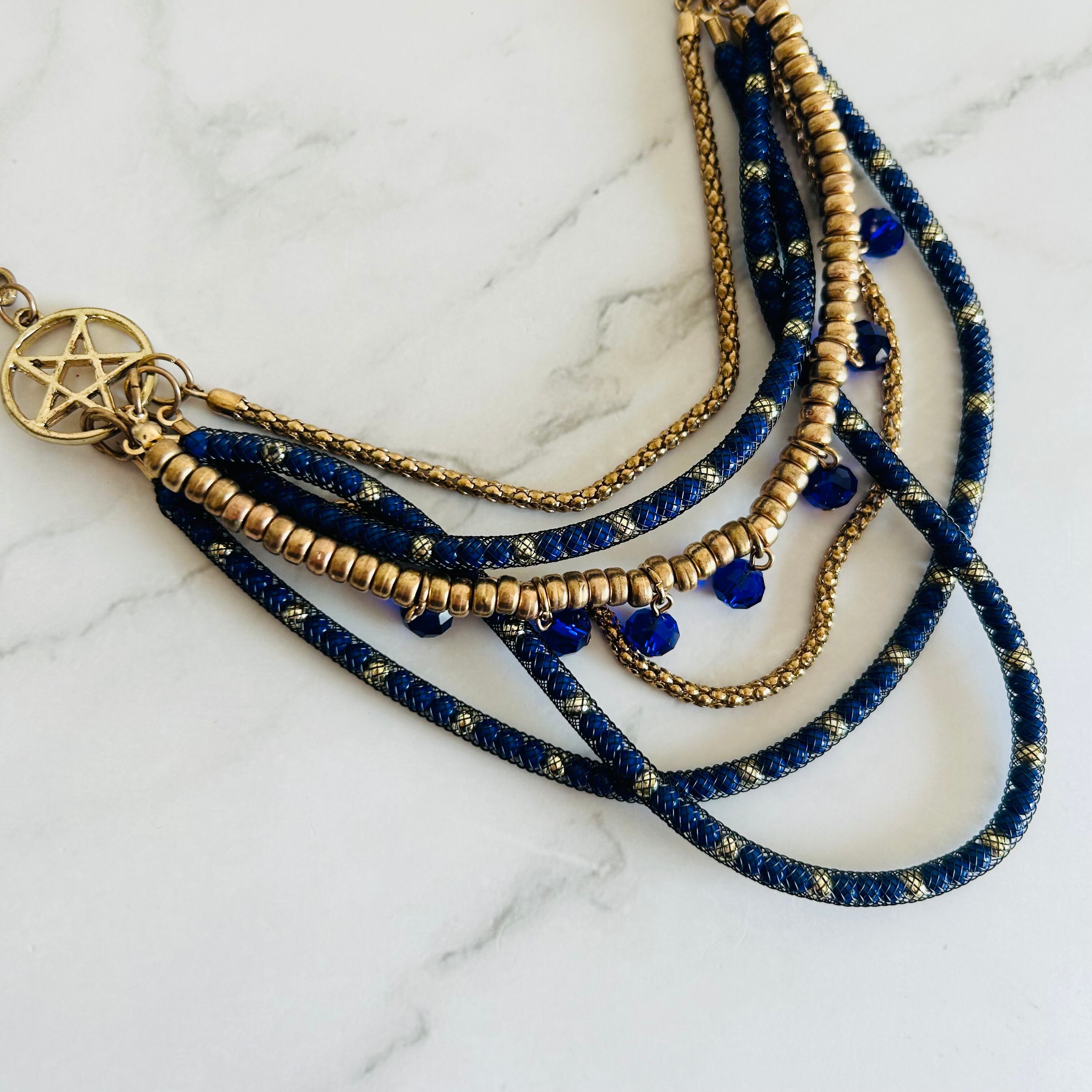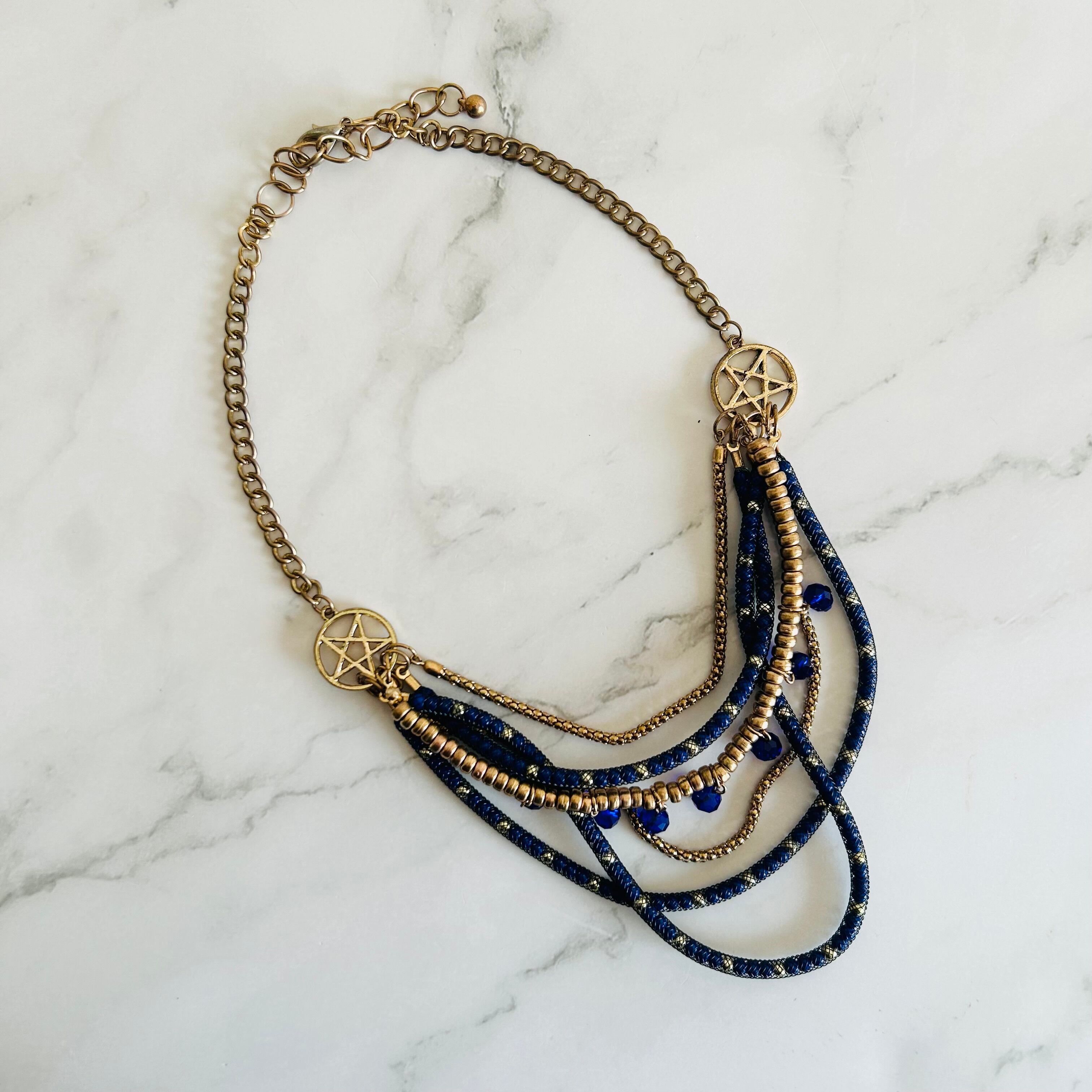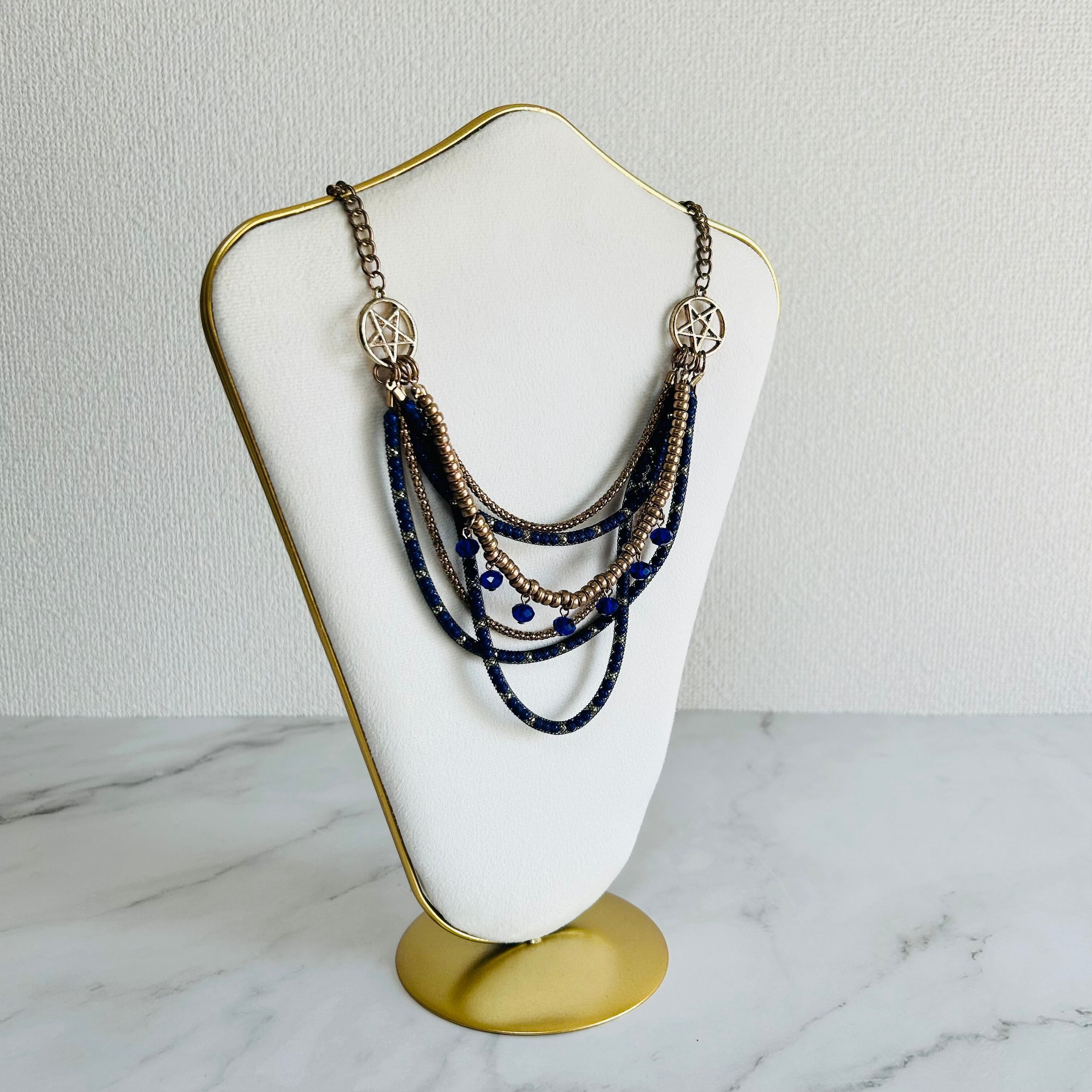 透け感のある網目状のチューブにラピスブルーとゴールドカラーのビーズを通し、さまざまなチェーンと組み合わせたデザインです。