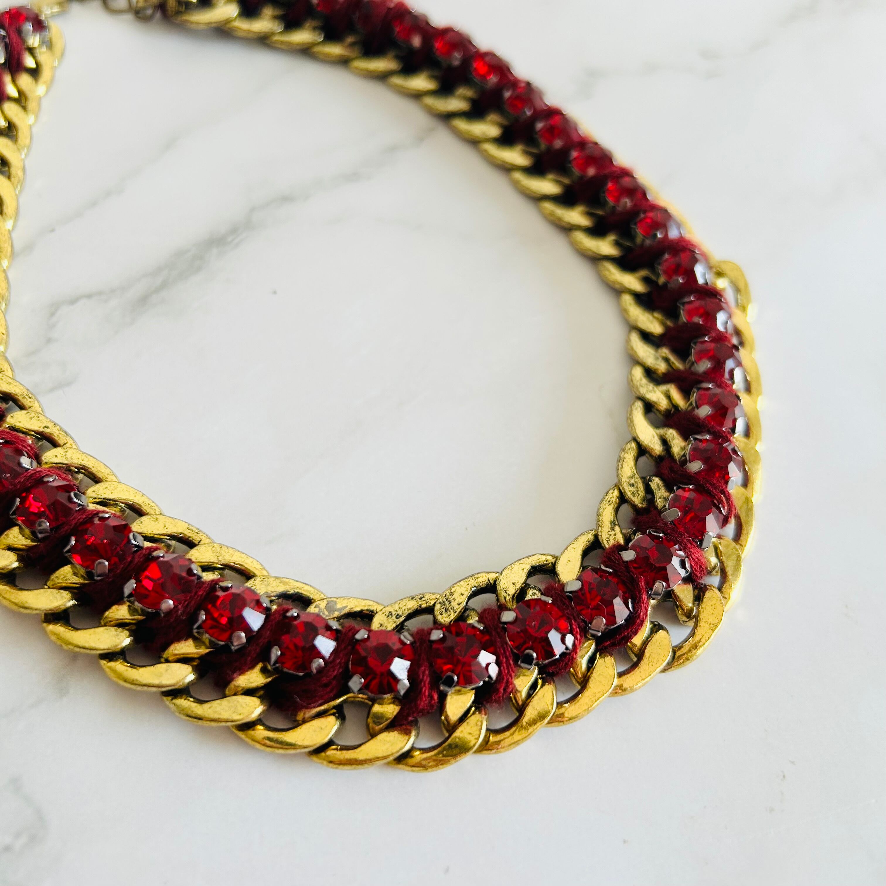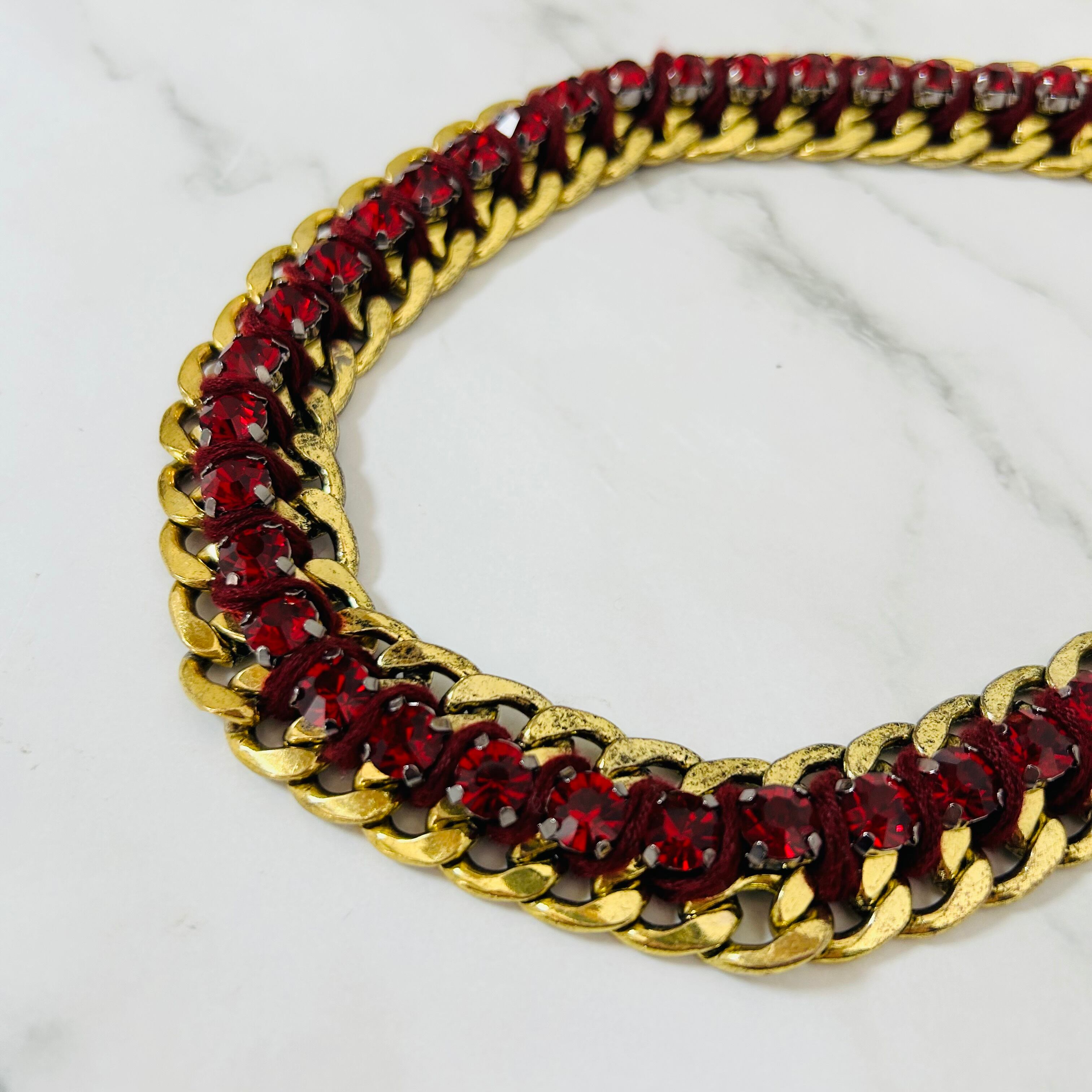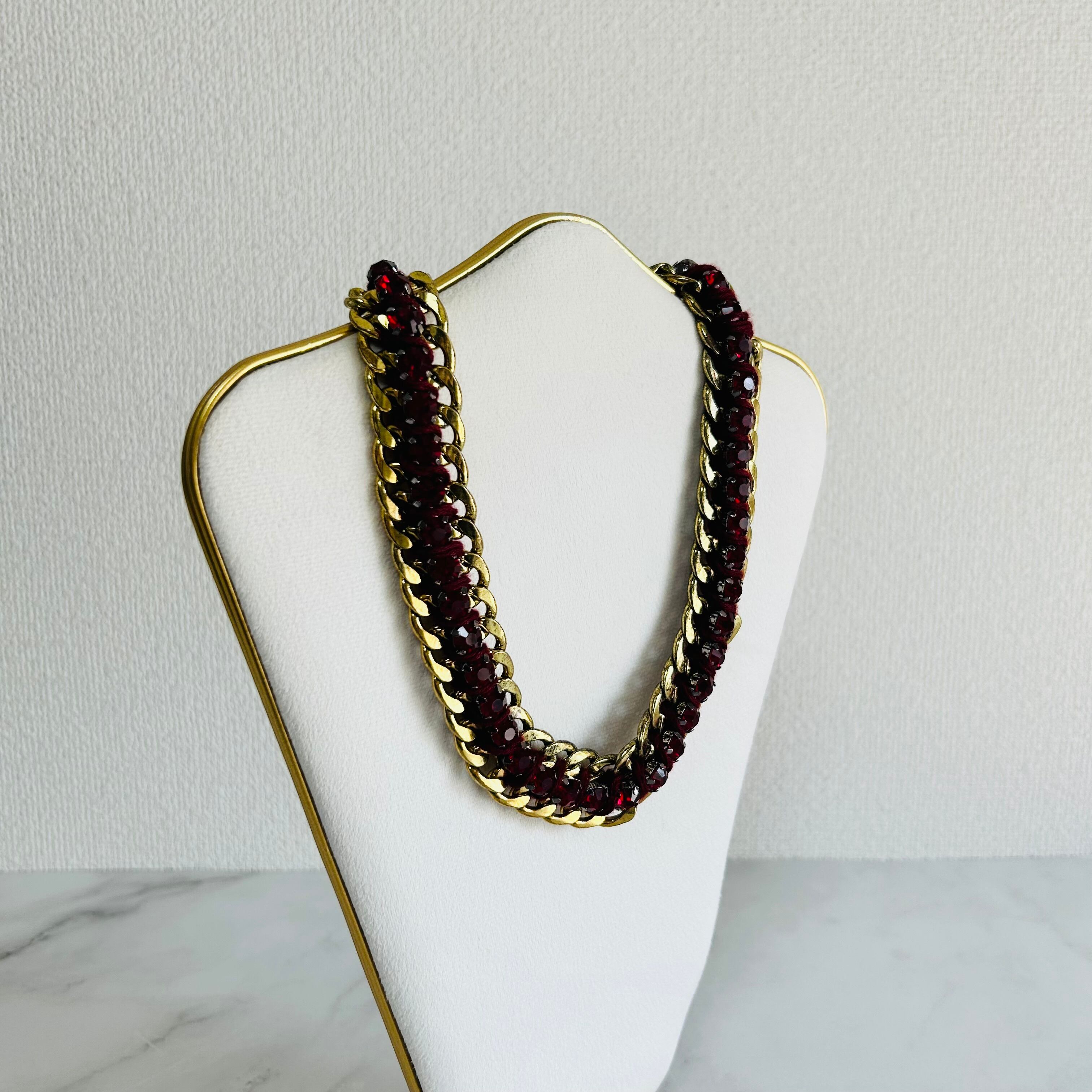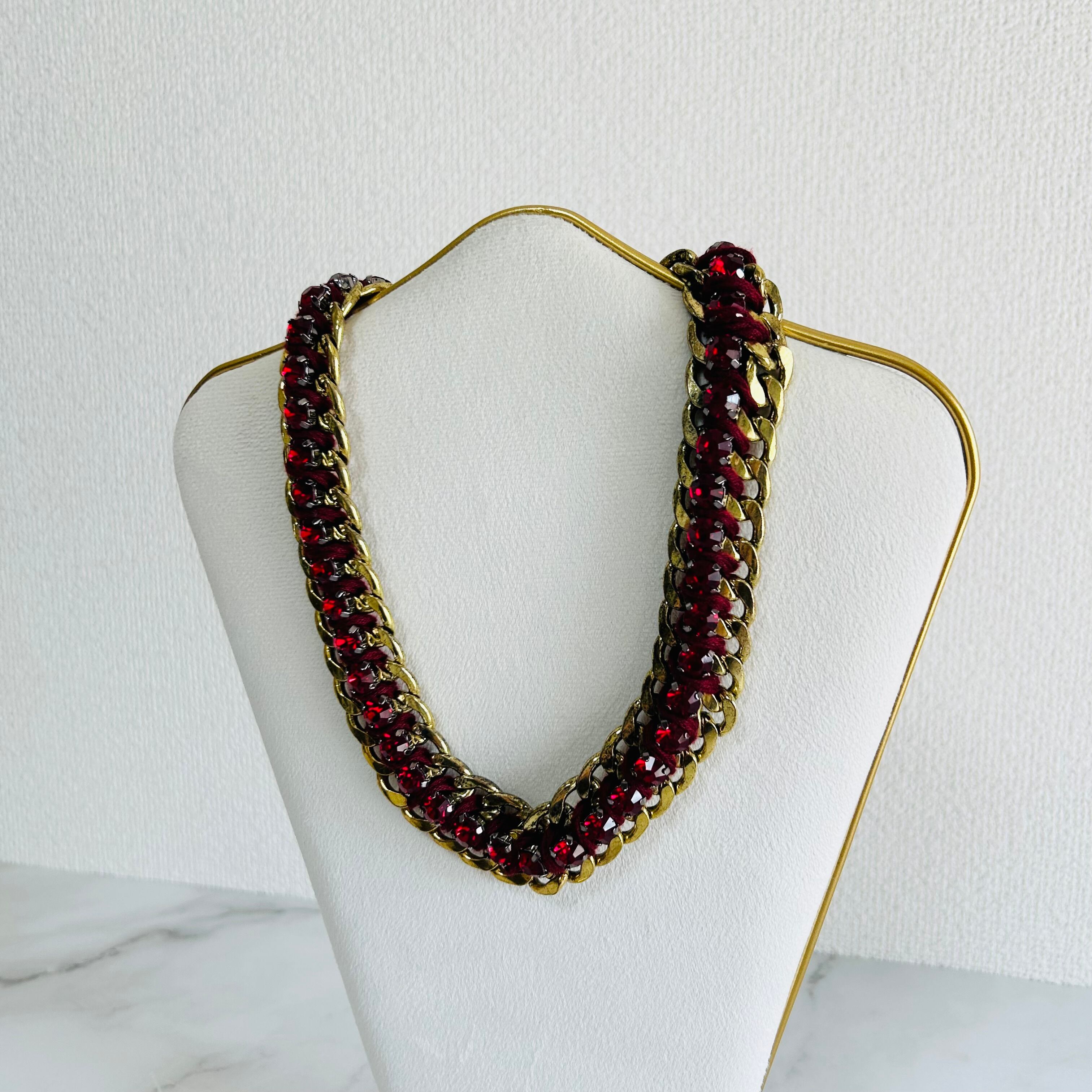 重厚感のある2本のチャンキーチェーンをワインレッドのコードで編み込み、華やかなレッドビジューを散りばめた気品漂うヴィンテージライクなデザインです。