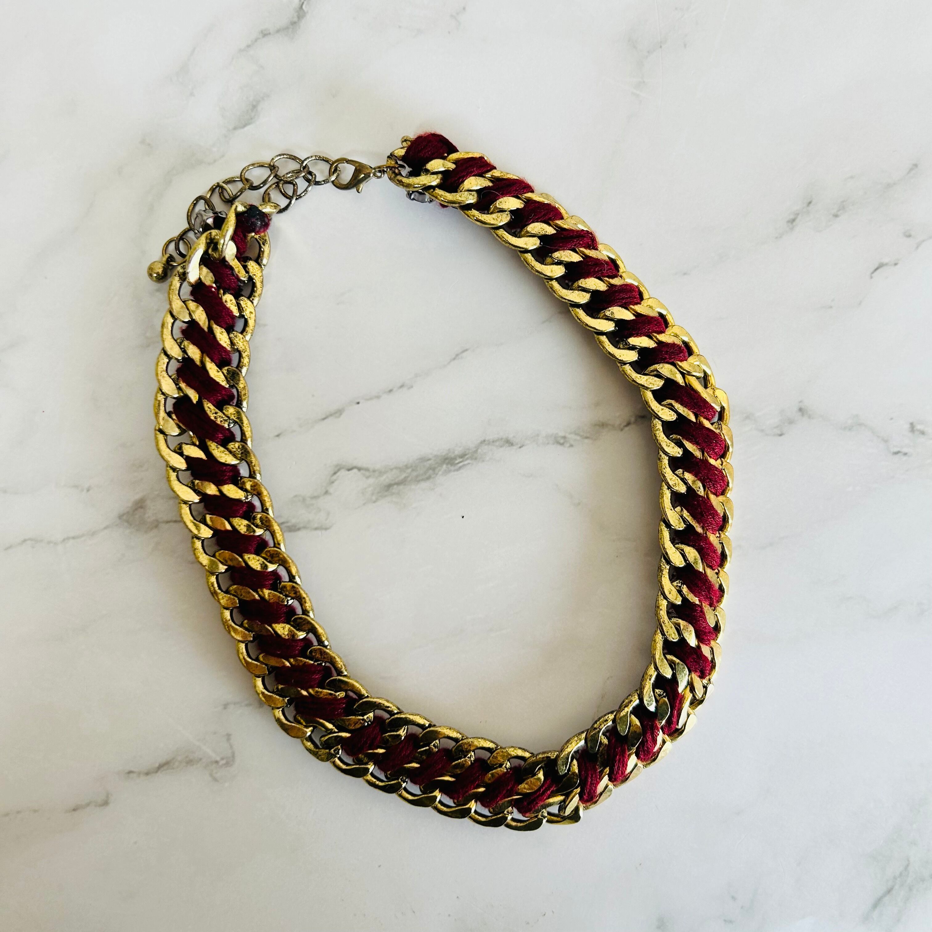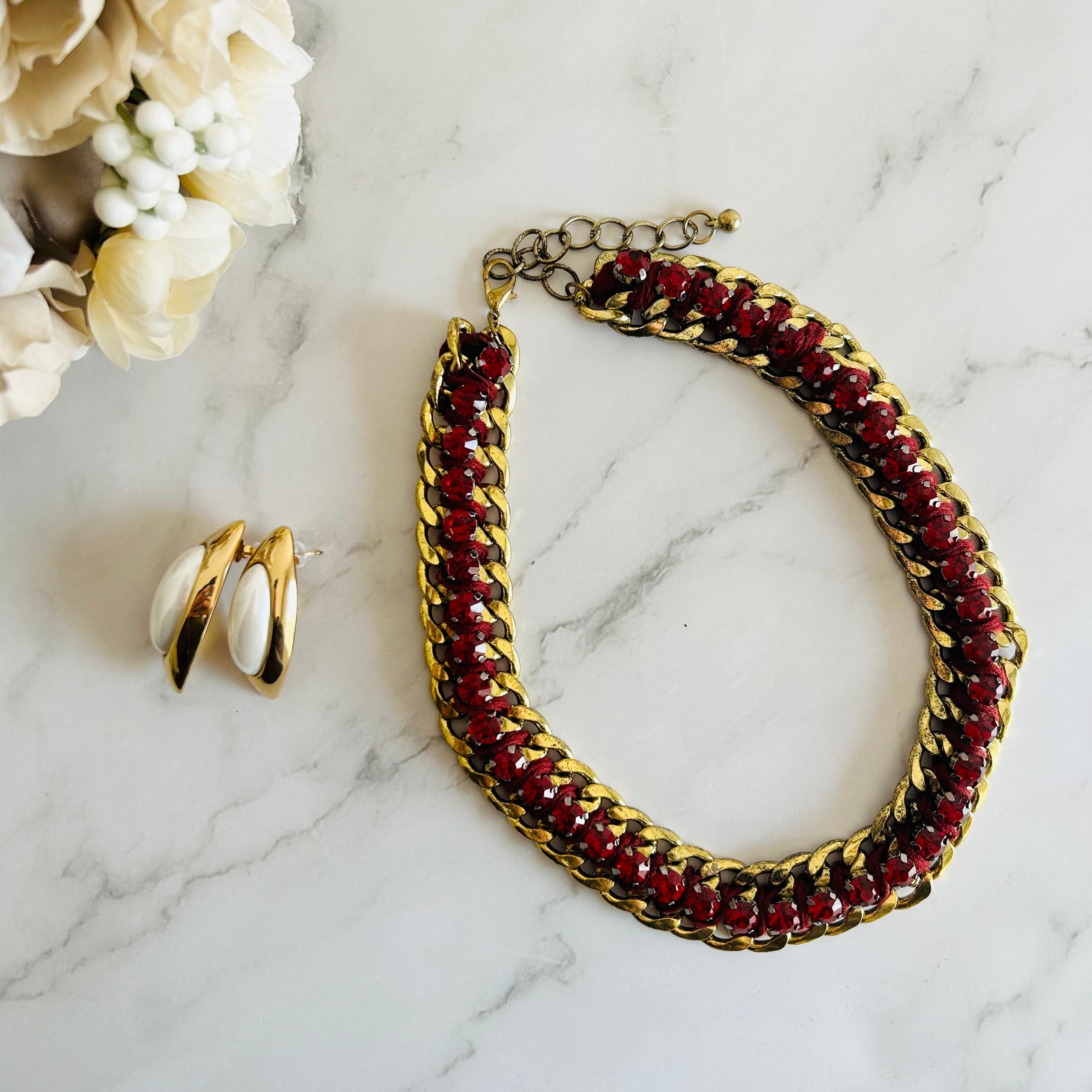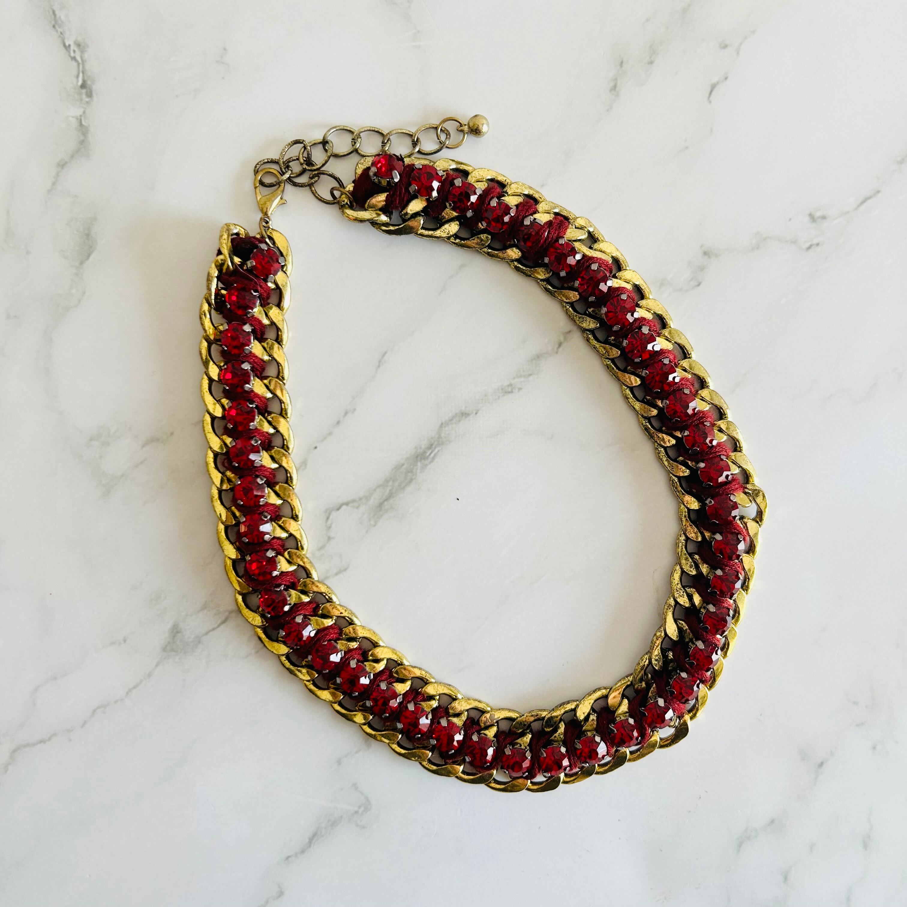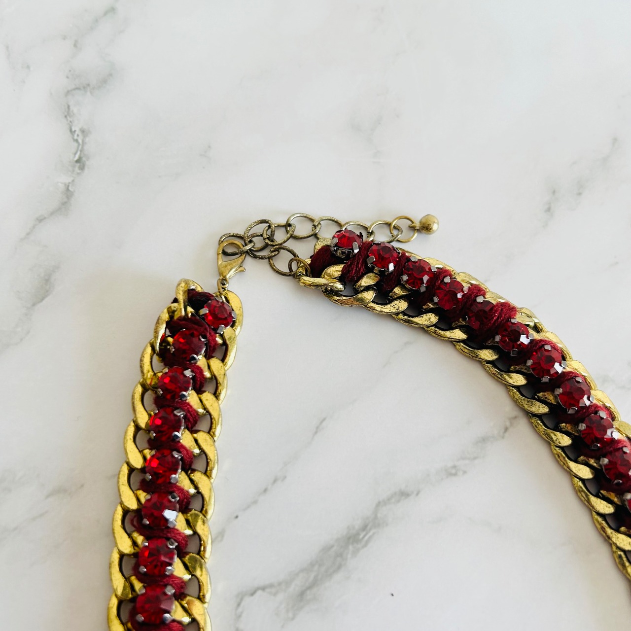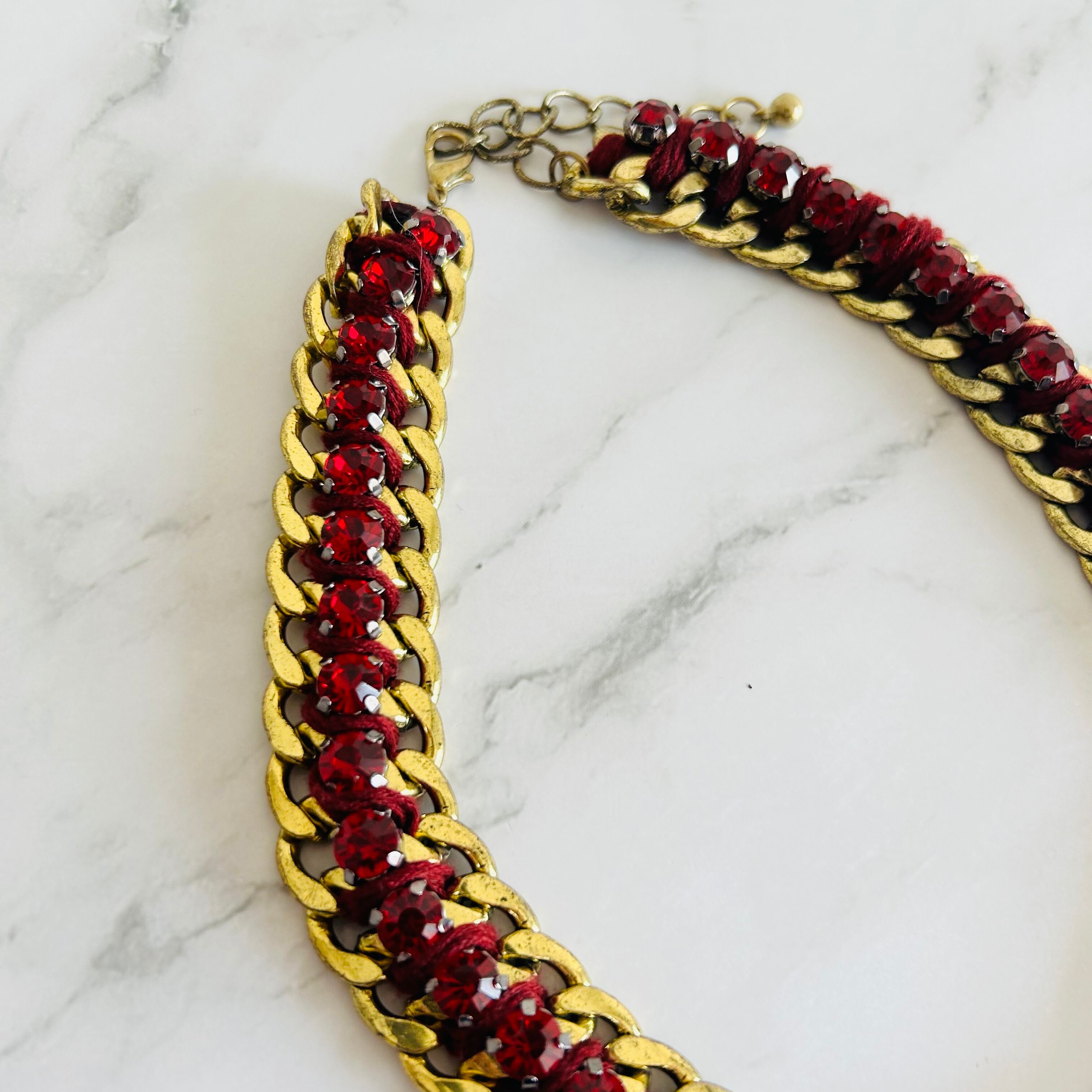 重厚感のある2本のチャンキーチェーンをワインレッドのコードで編み込み、華やかなレッドビジューを散りばめた気品漂うヴィンテージライクなデザインです。