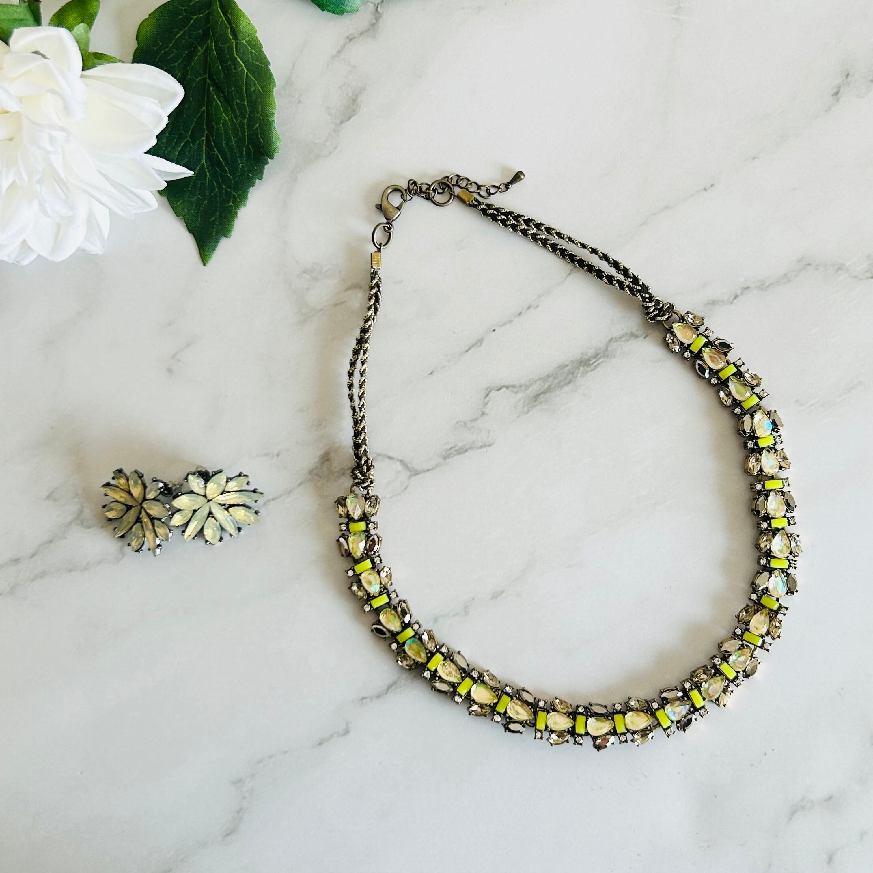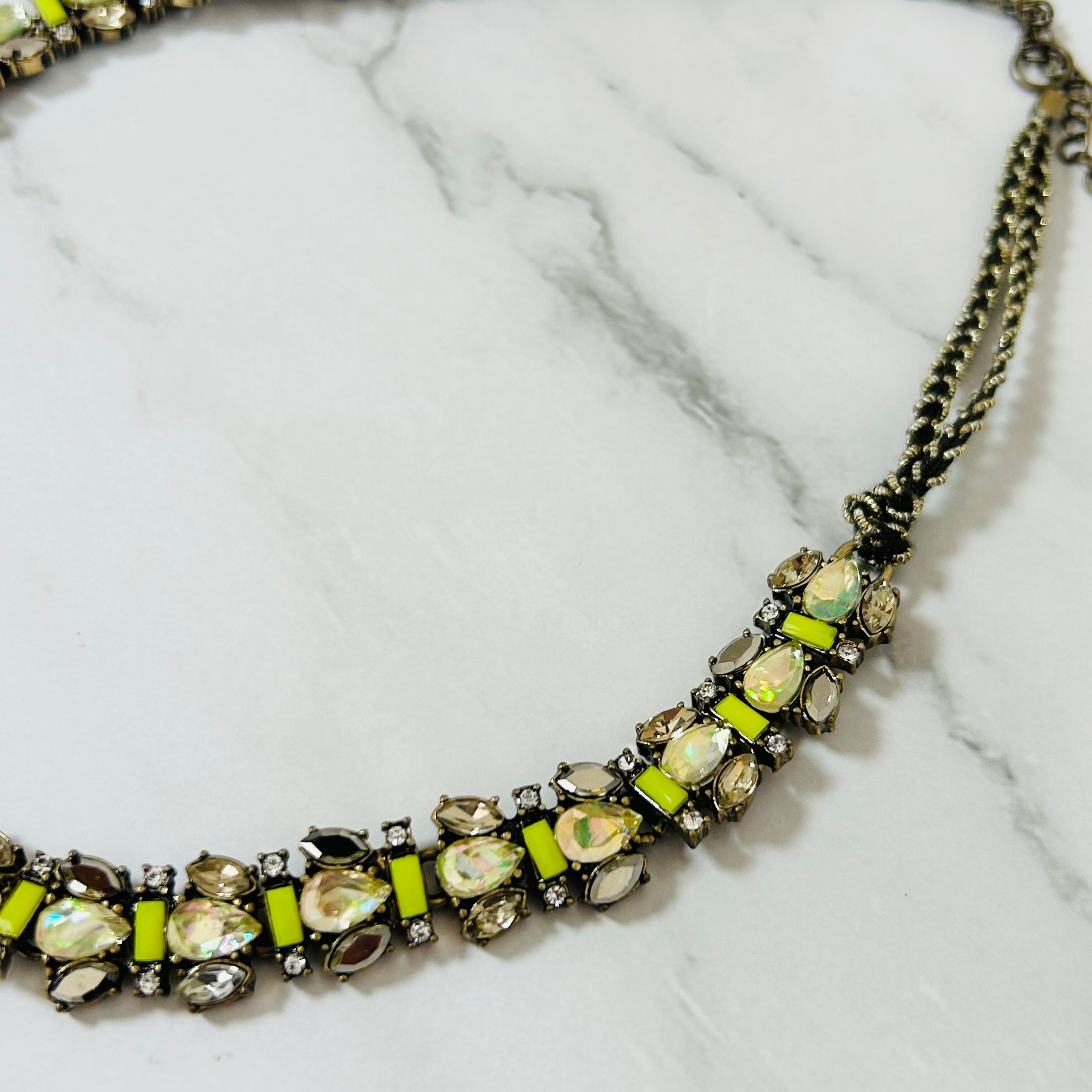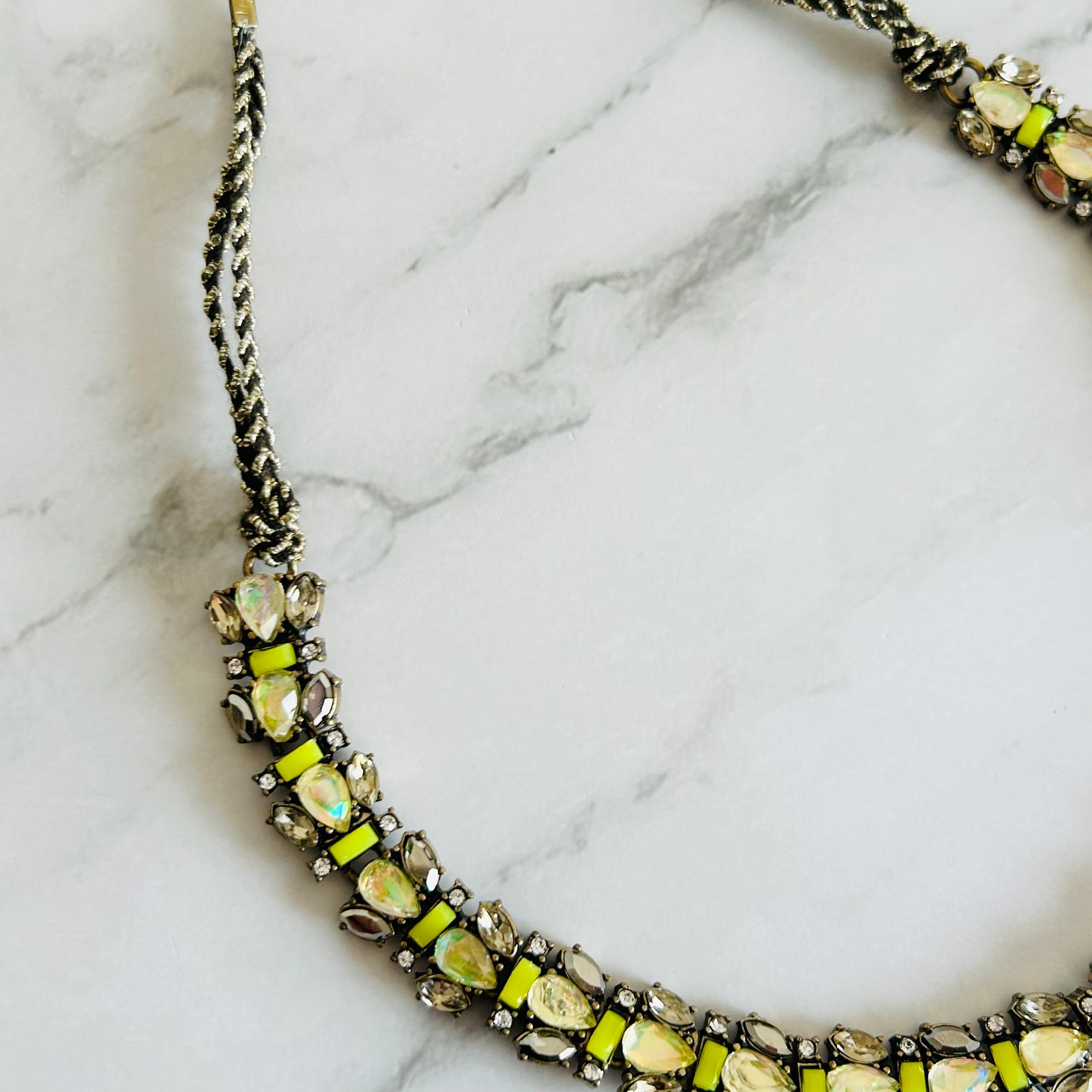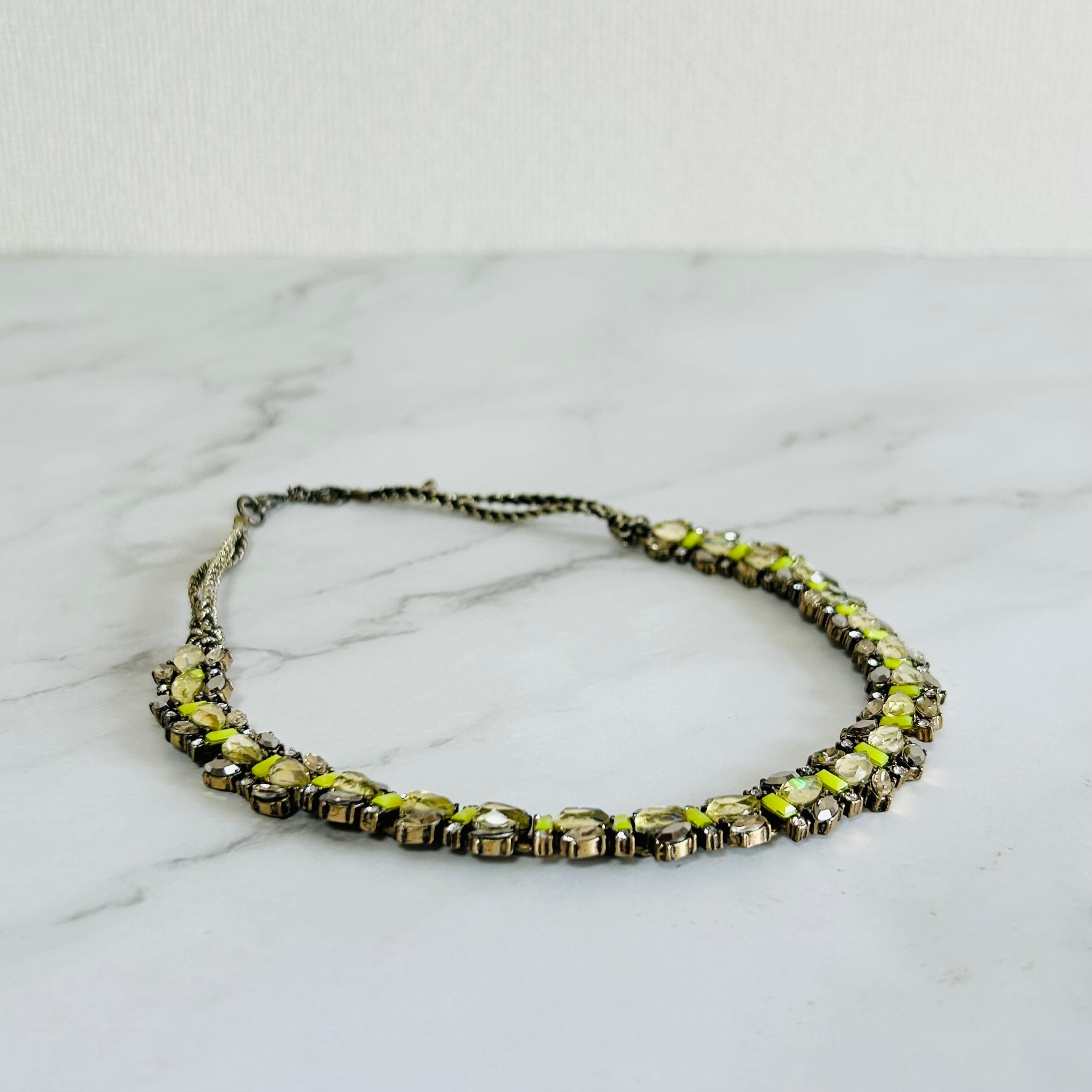 上品なイエロー系のビジューをふんだんに使用し、ラメ入りのコードと組み合わせた華やかなネックレス。