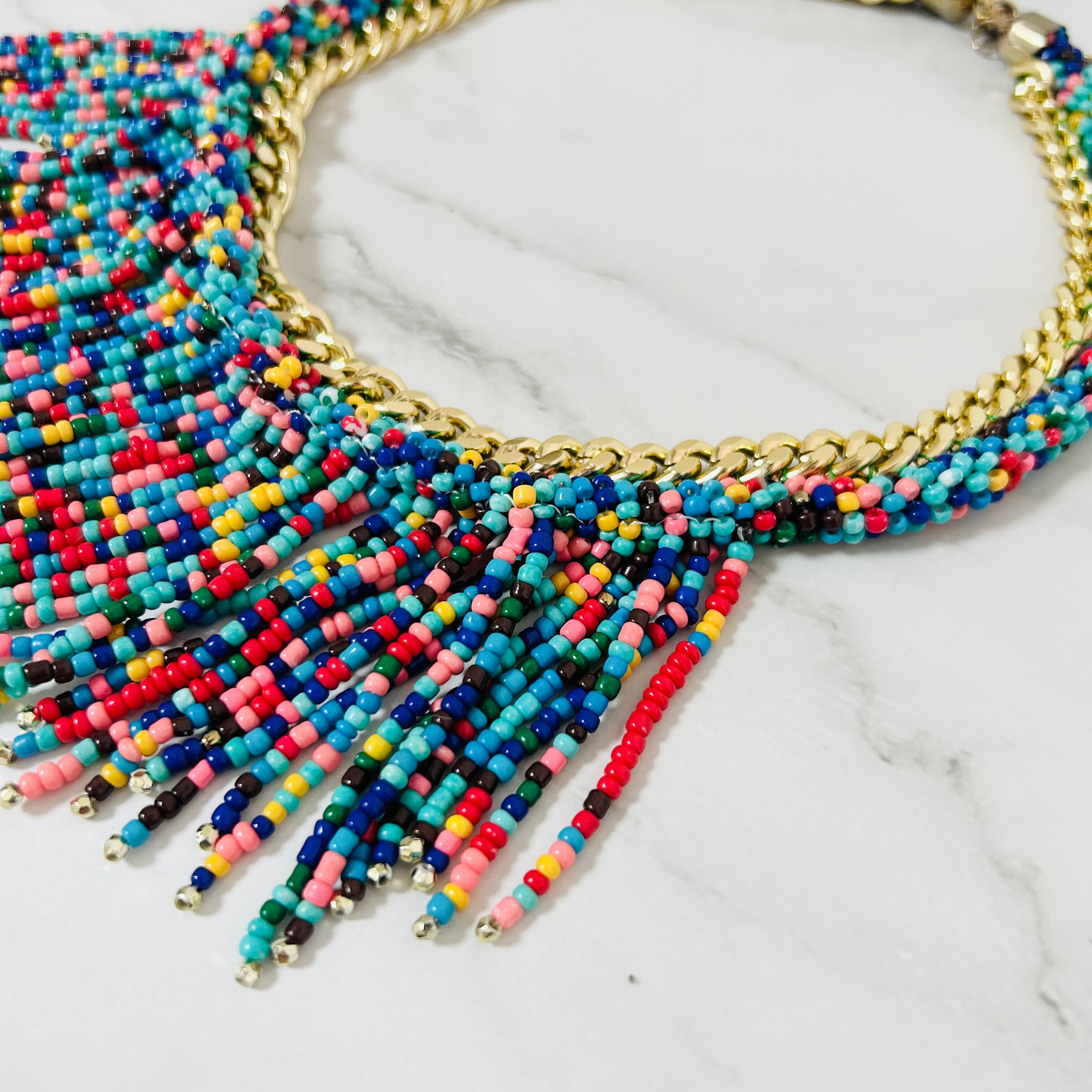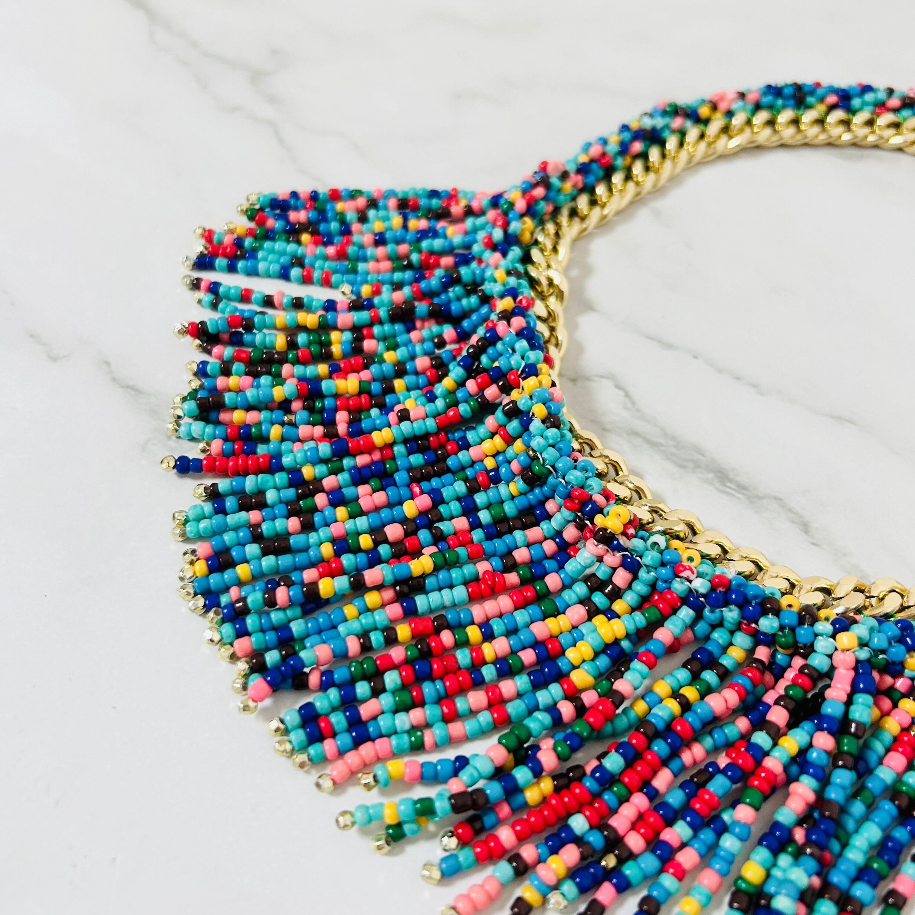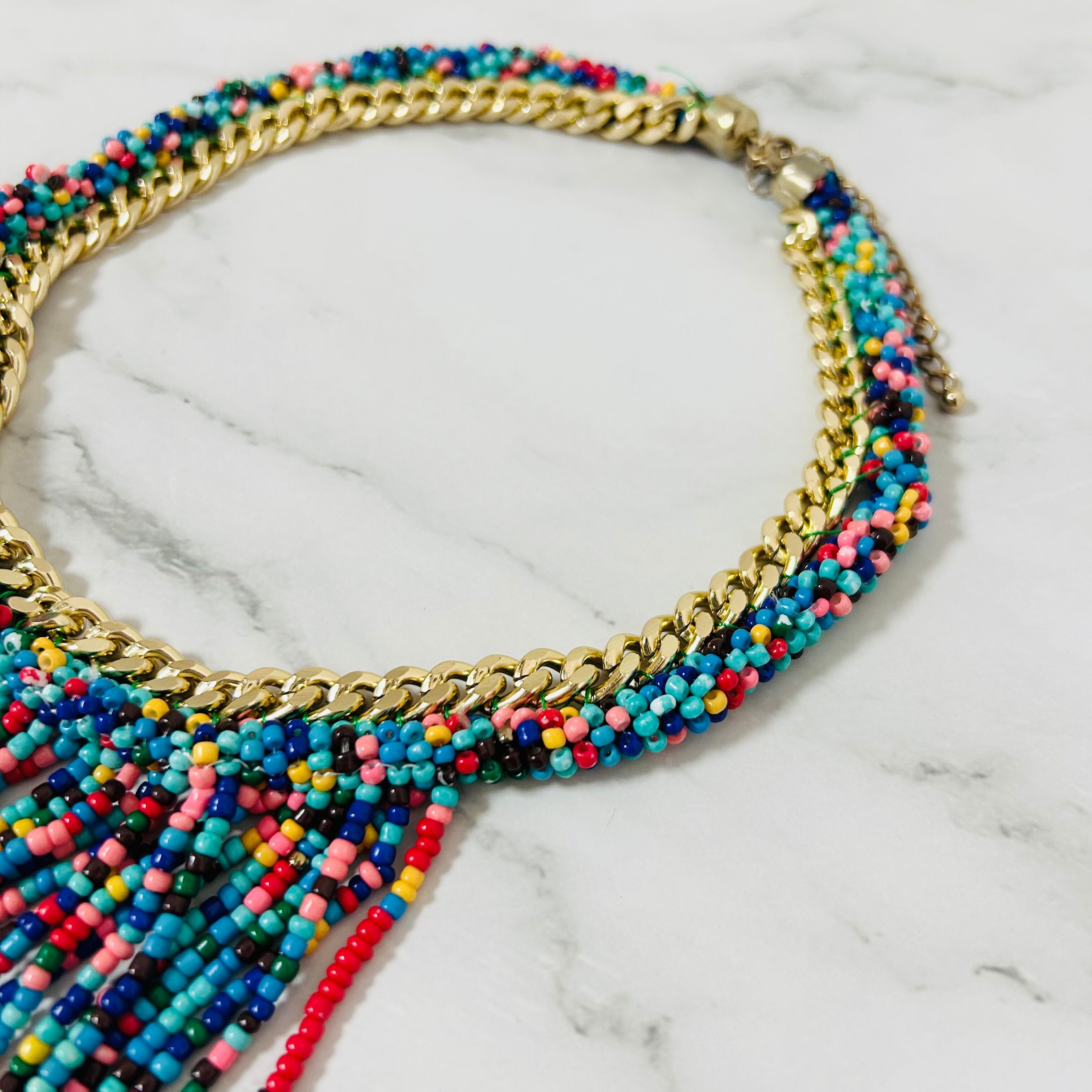 ブルー系を中心にカラフルなビーズで地チャンキーチェーンにデコレートしたフリンジ状の華やかなデザインです。