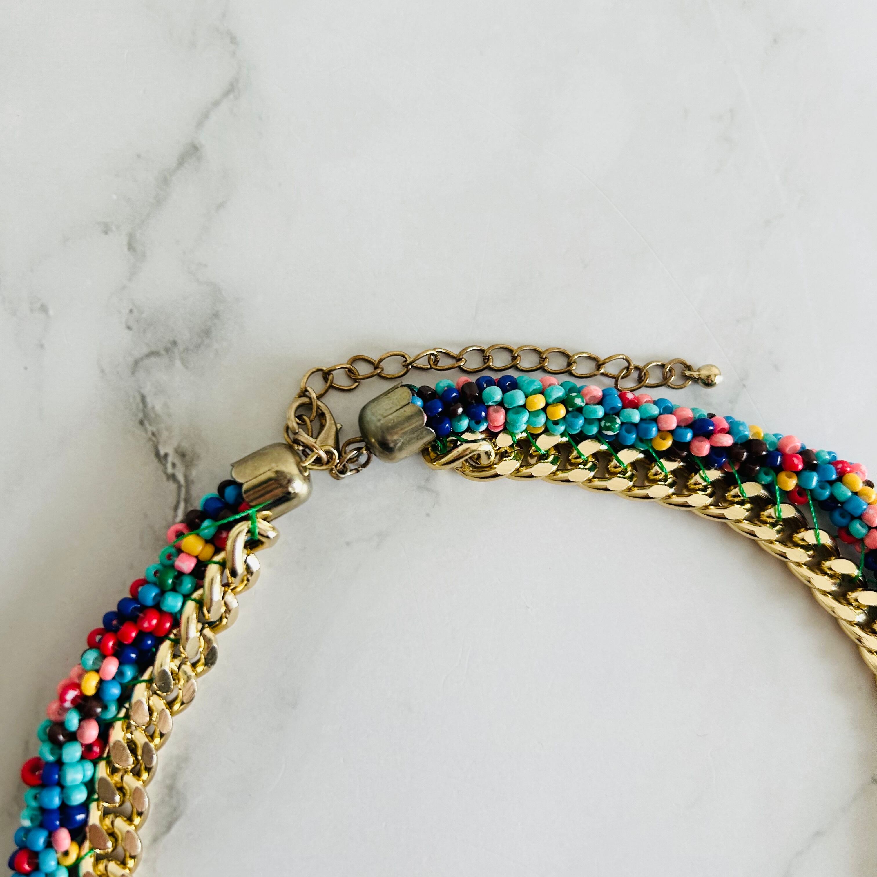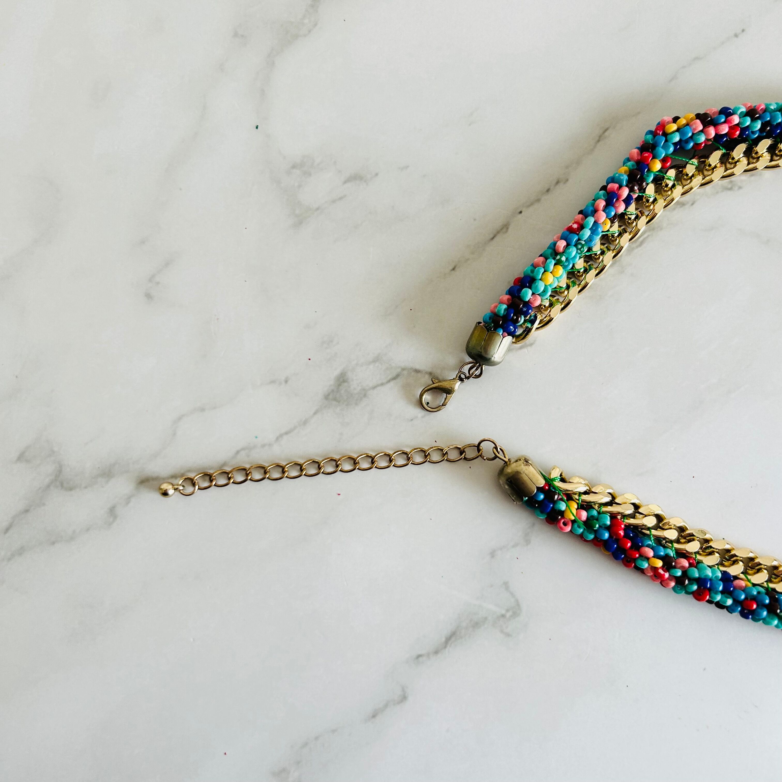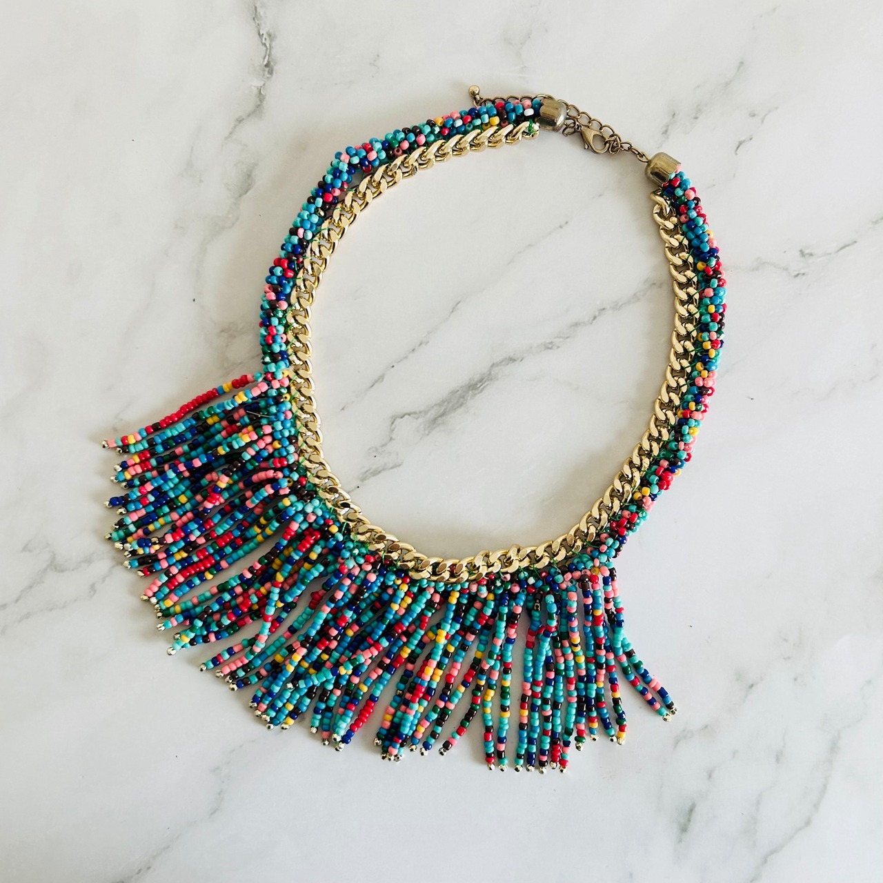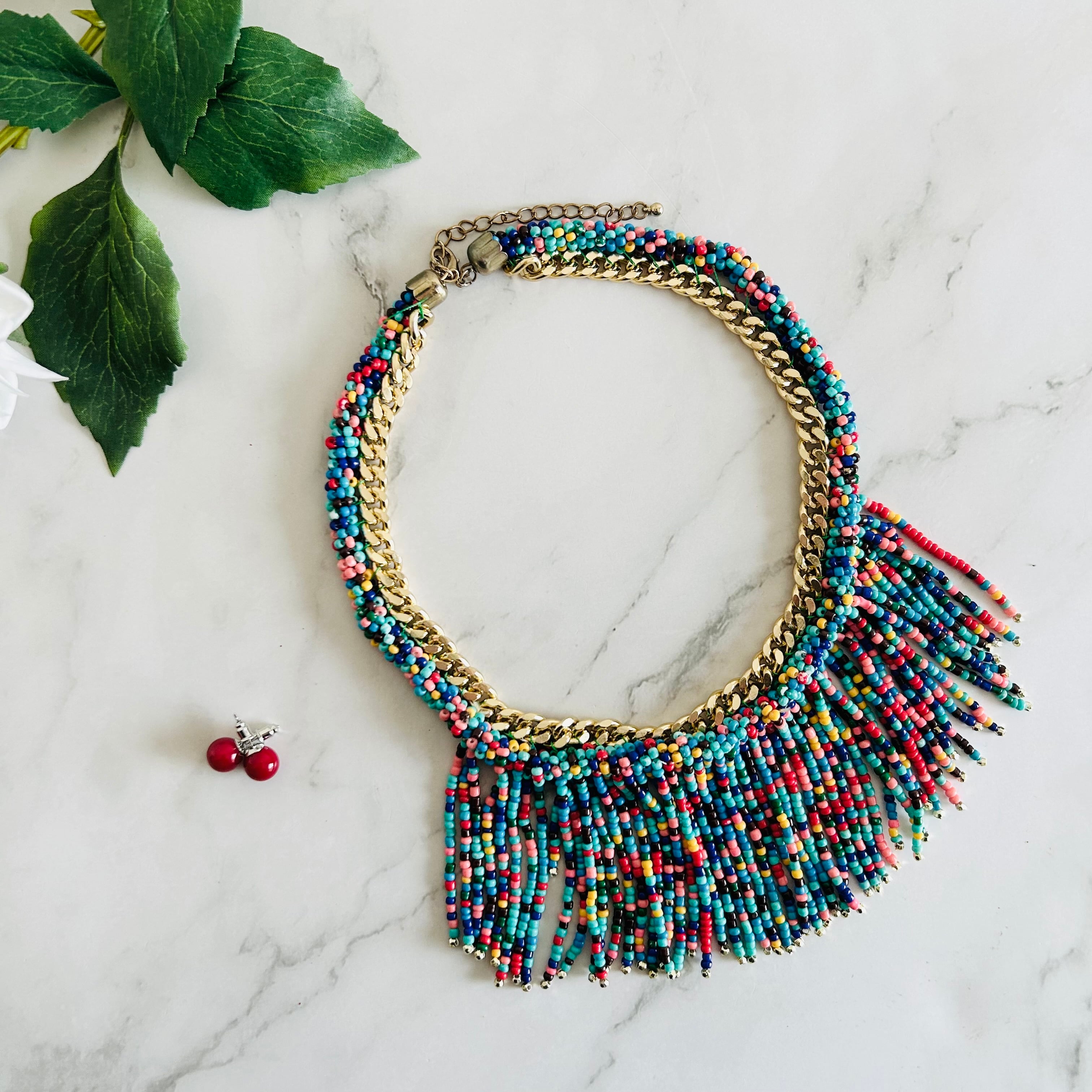 ブルー系を中心にカラフルなビーズで地チャンキーチェーンにデコレートしたフリンジ状の華やかなデザインです。