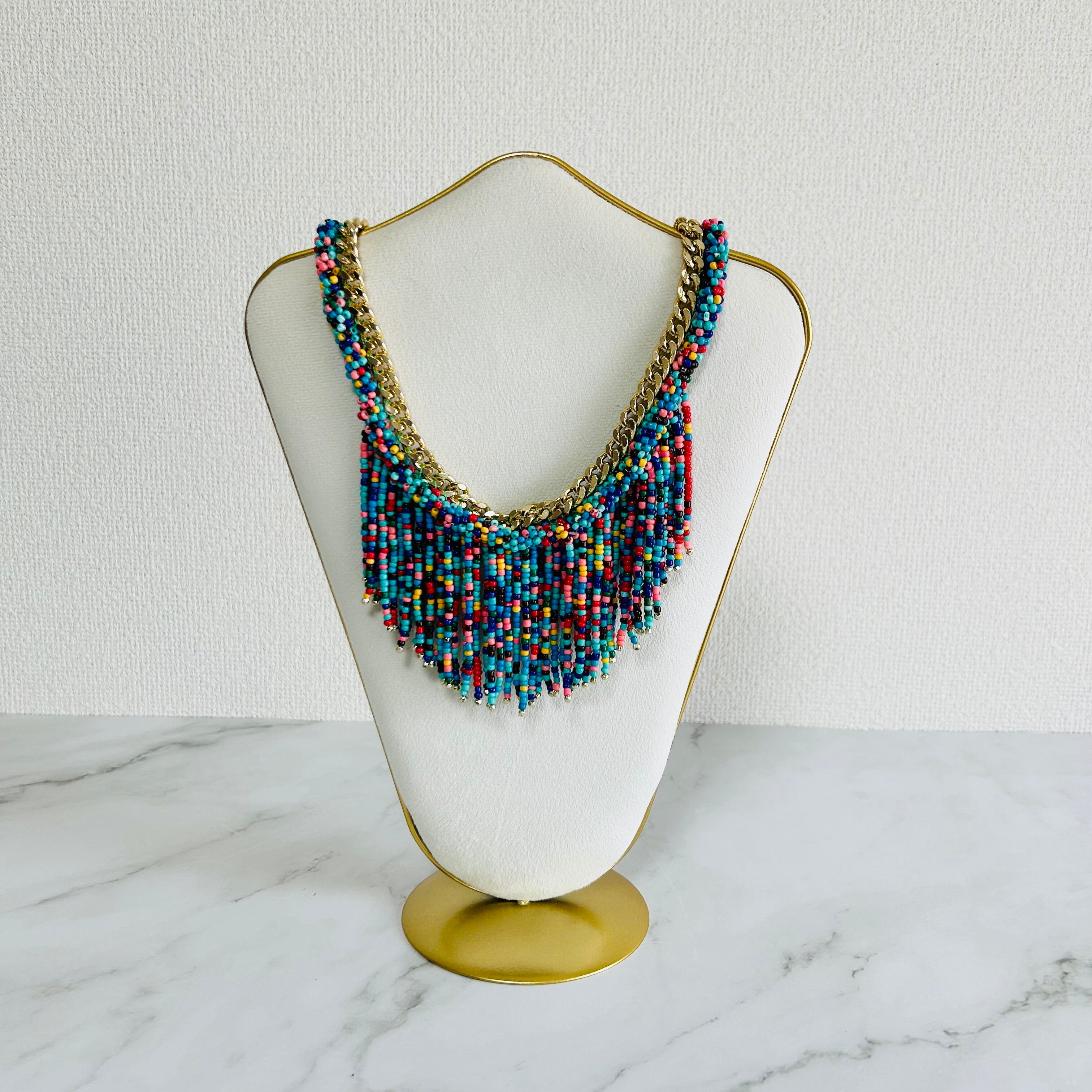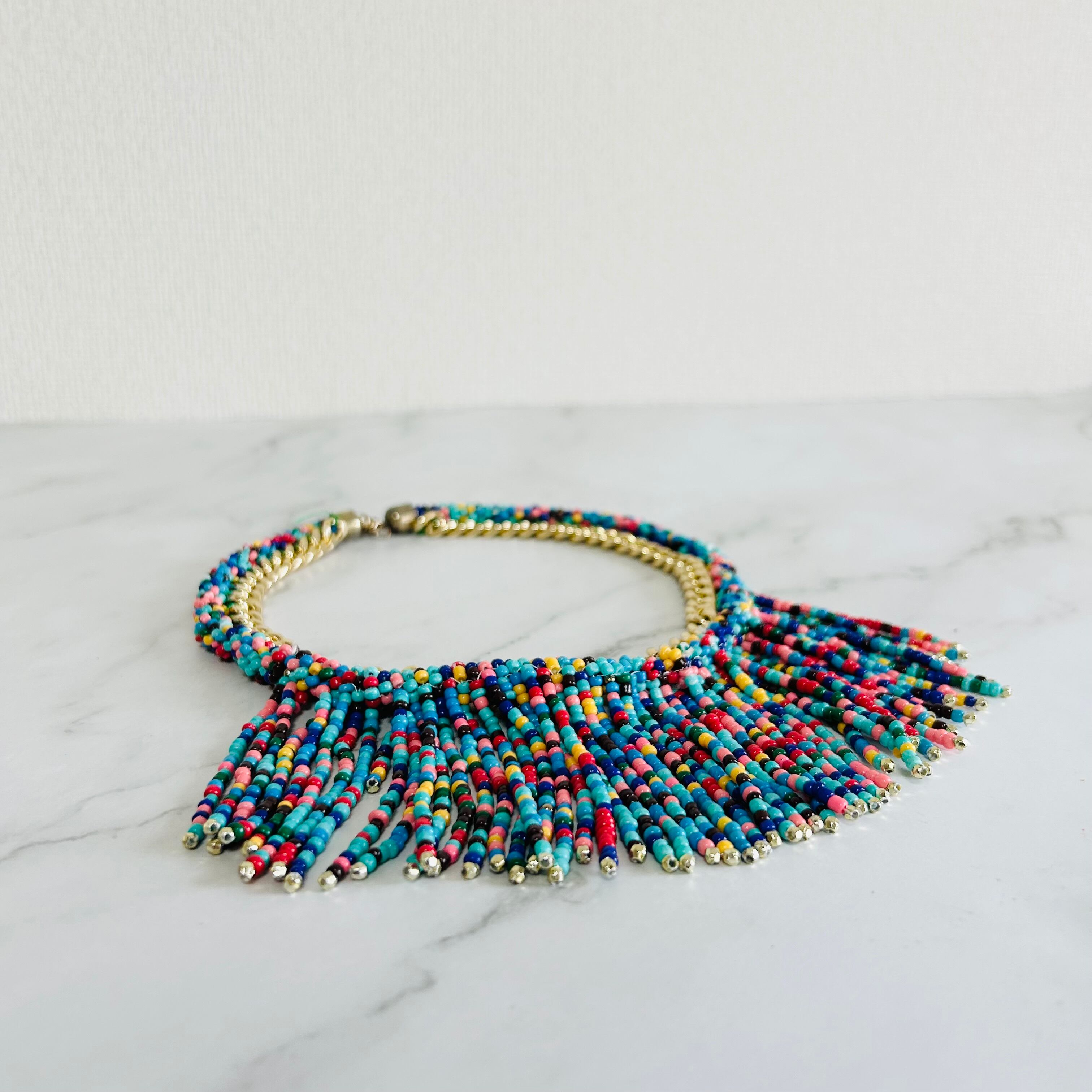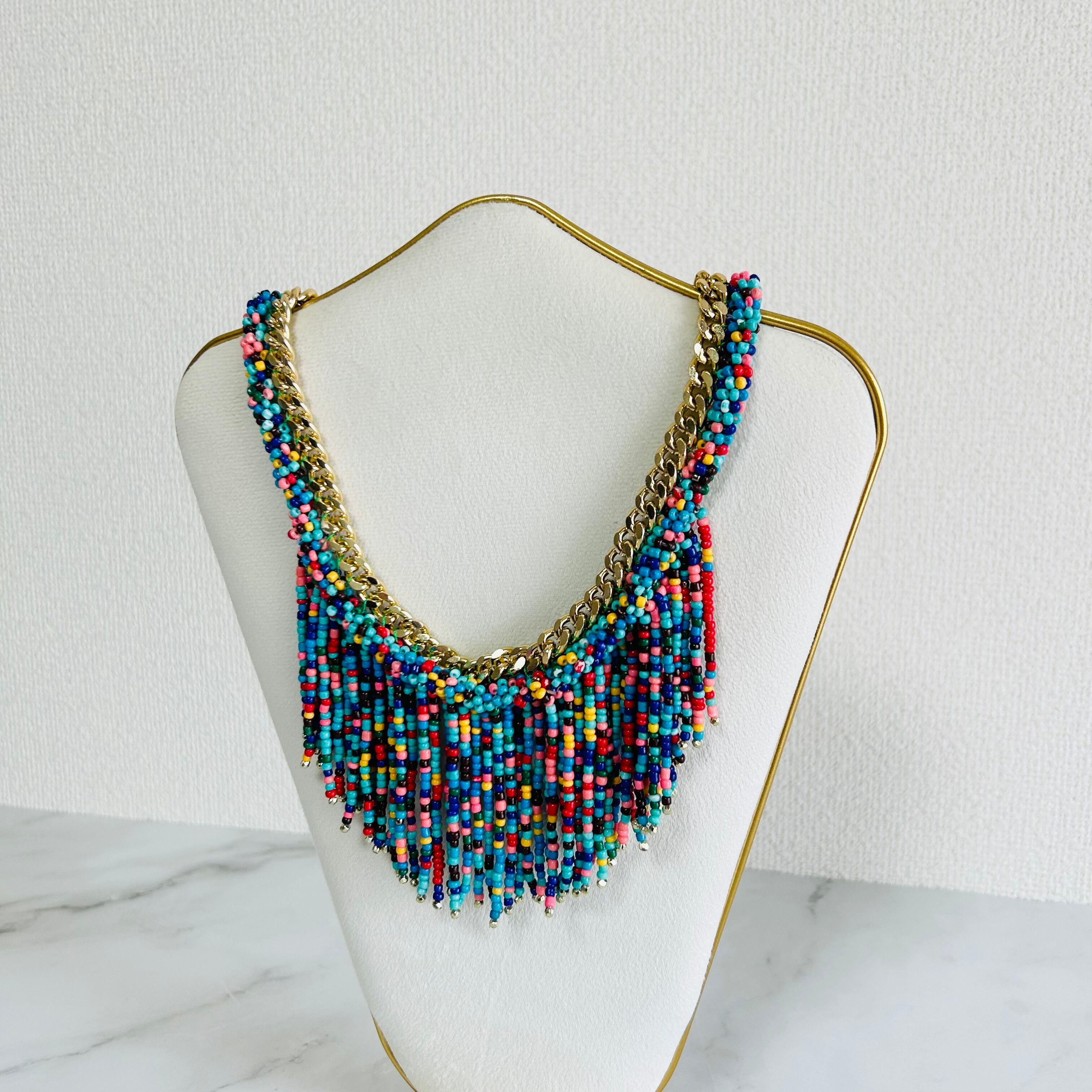爽やかなブルーを基調に、カラフルなビーズが揺れるフリンジデザインが印象的なネックレスで☆