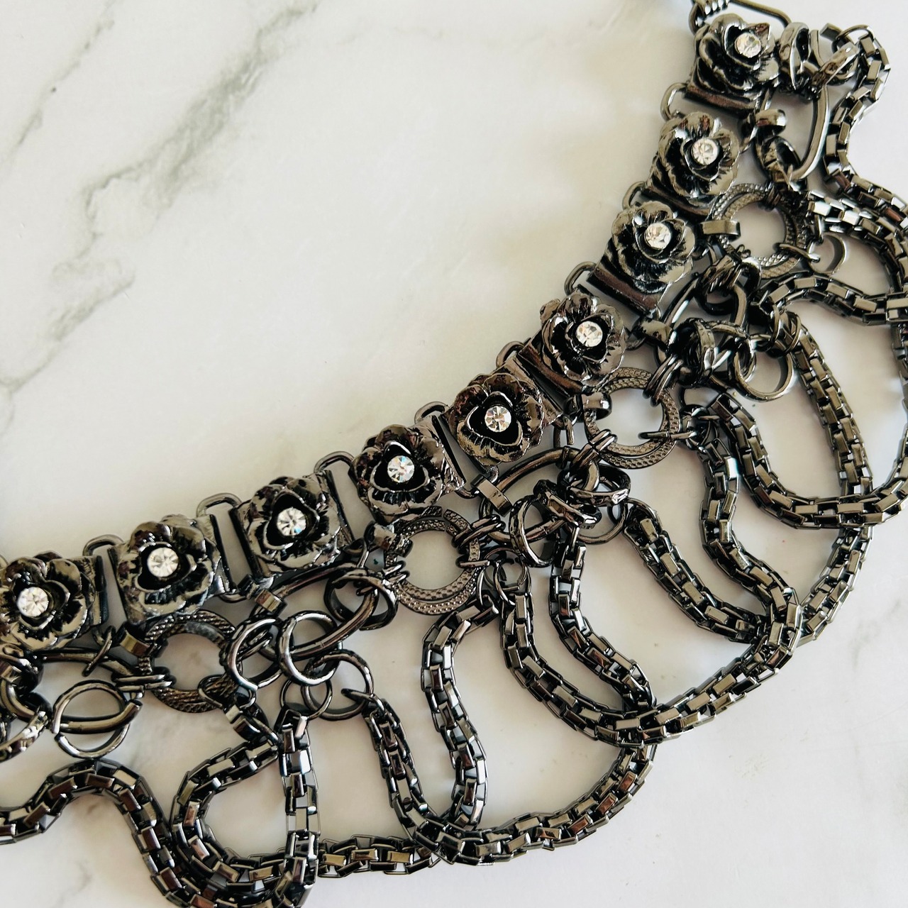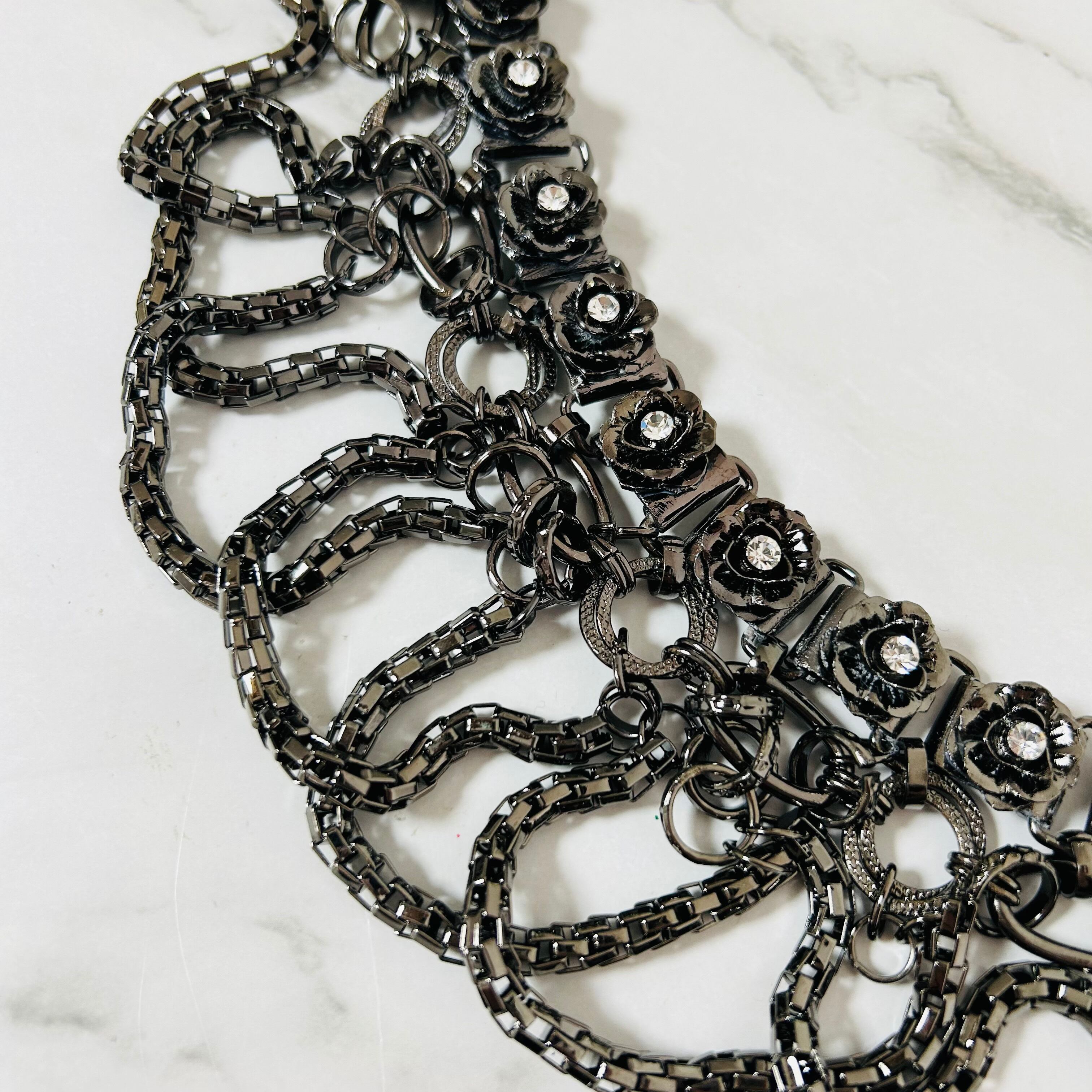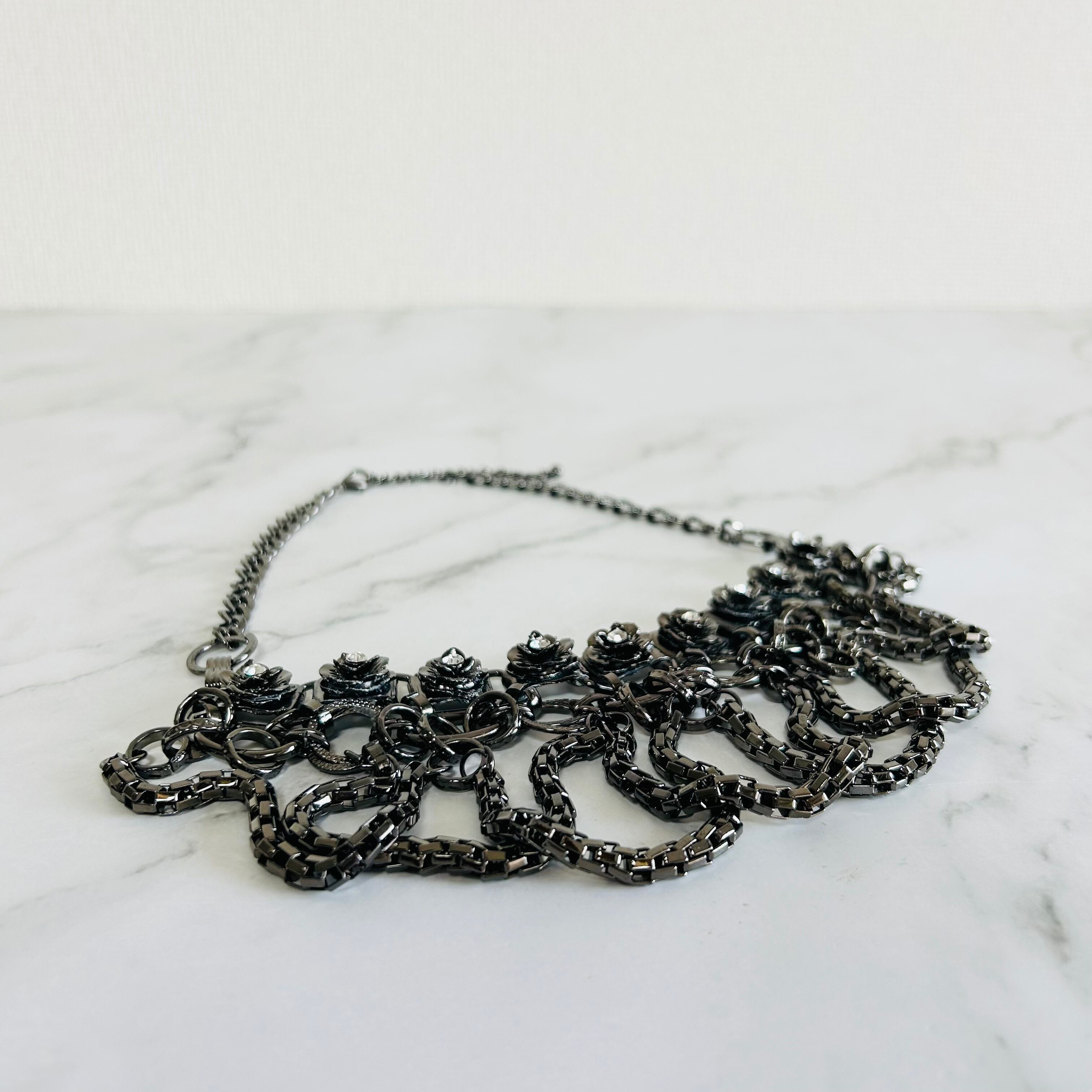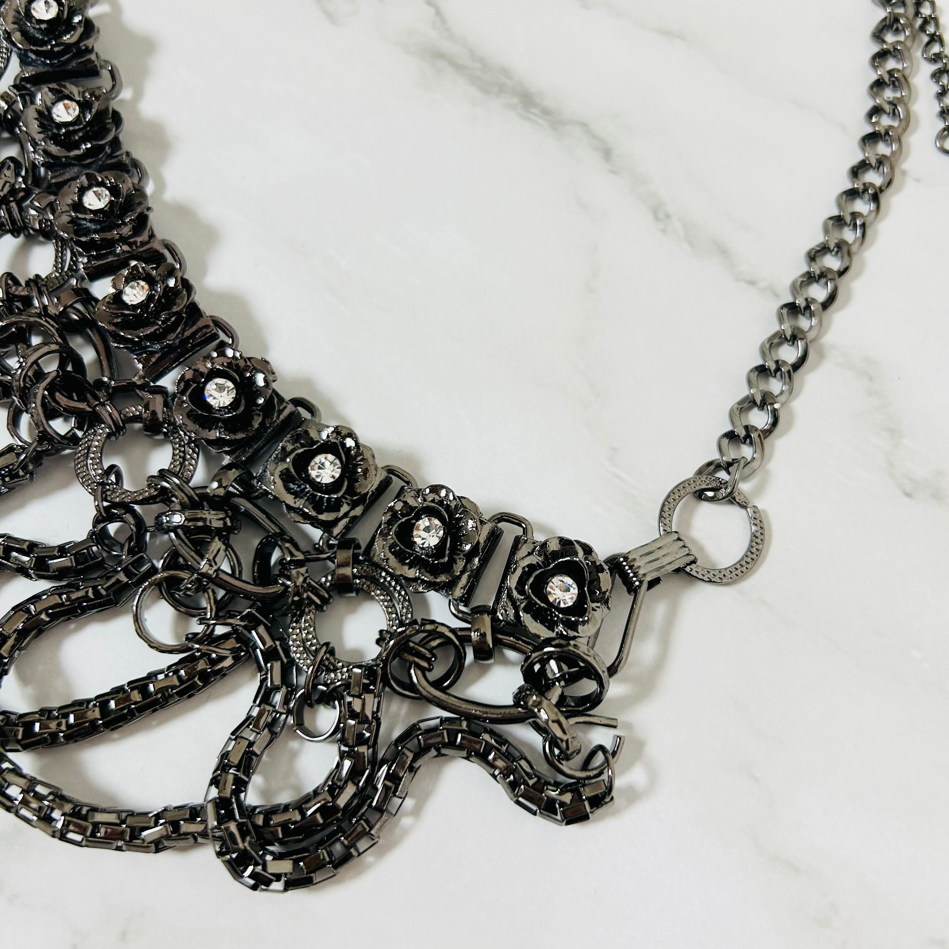 重厚感のあるブラックメタルチェーンに、繊細なフラワーモチーフとクリスタルを組み合わせたユニークなデザイン。
