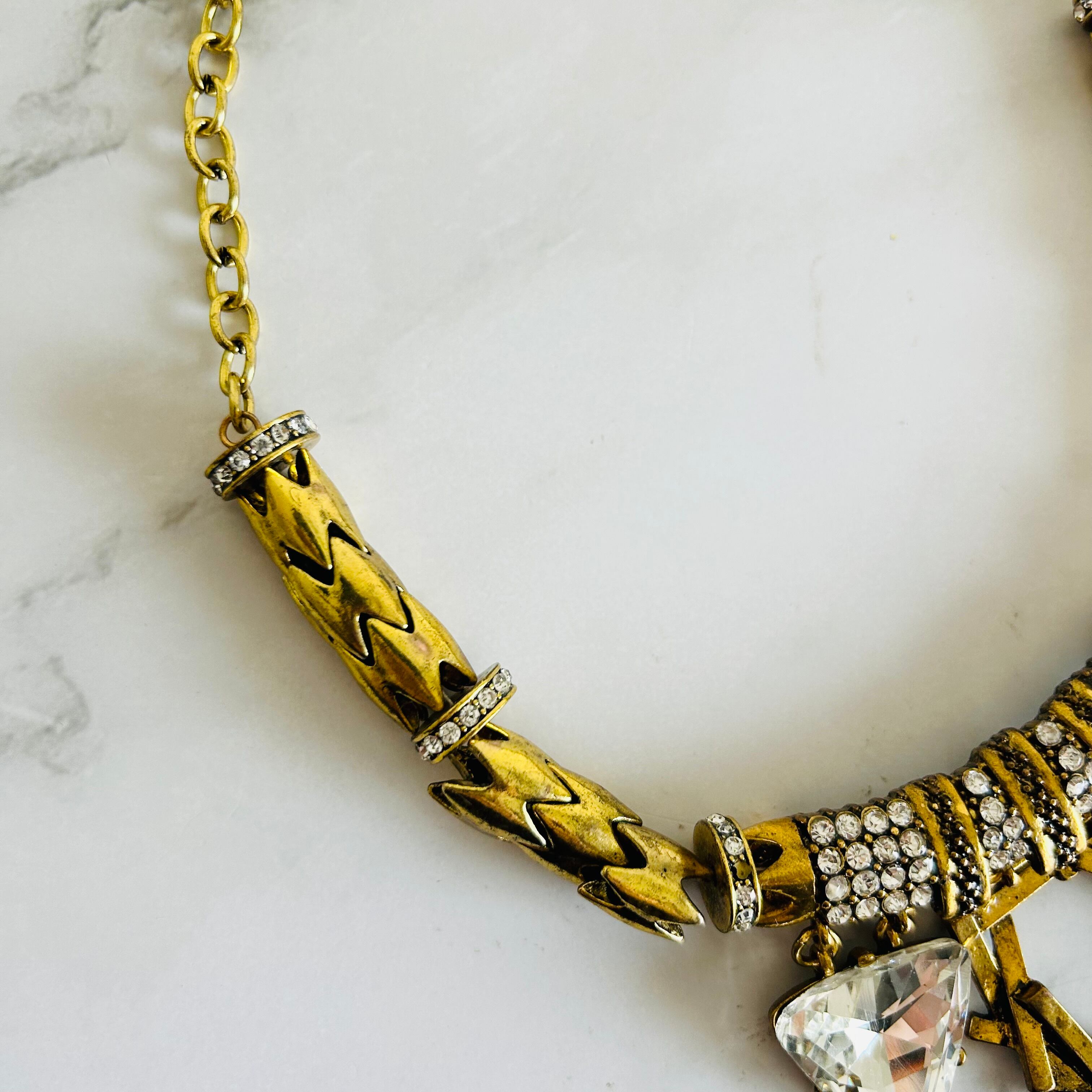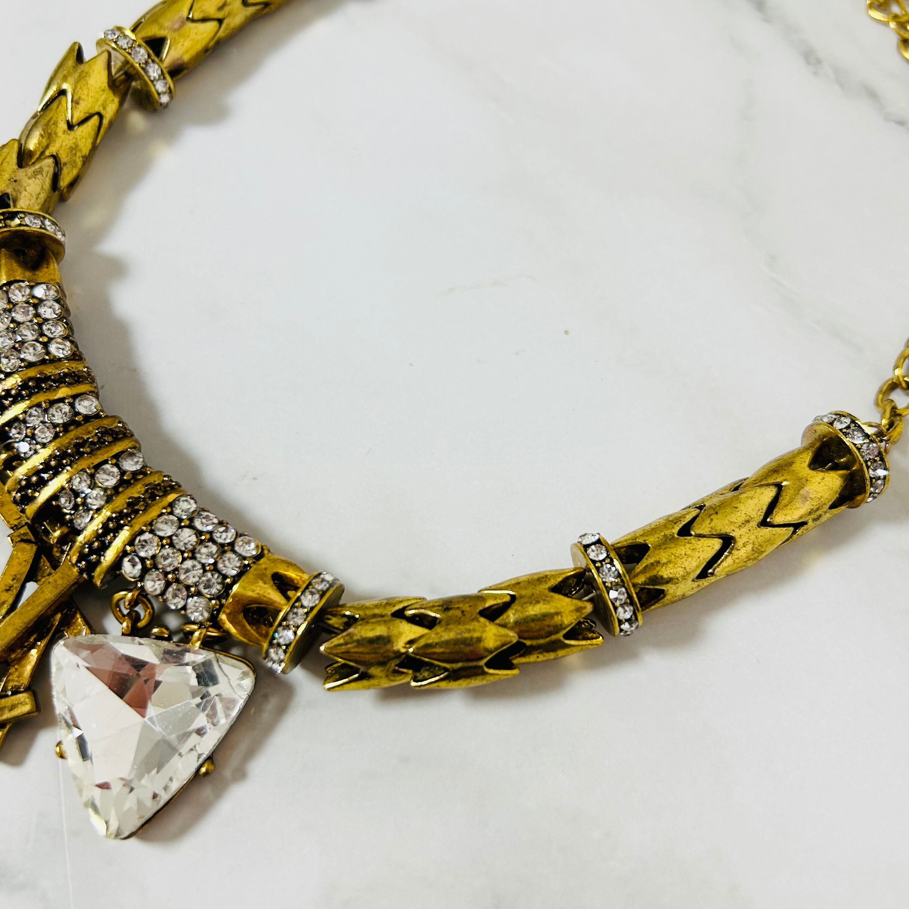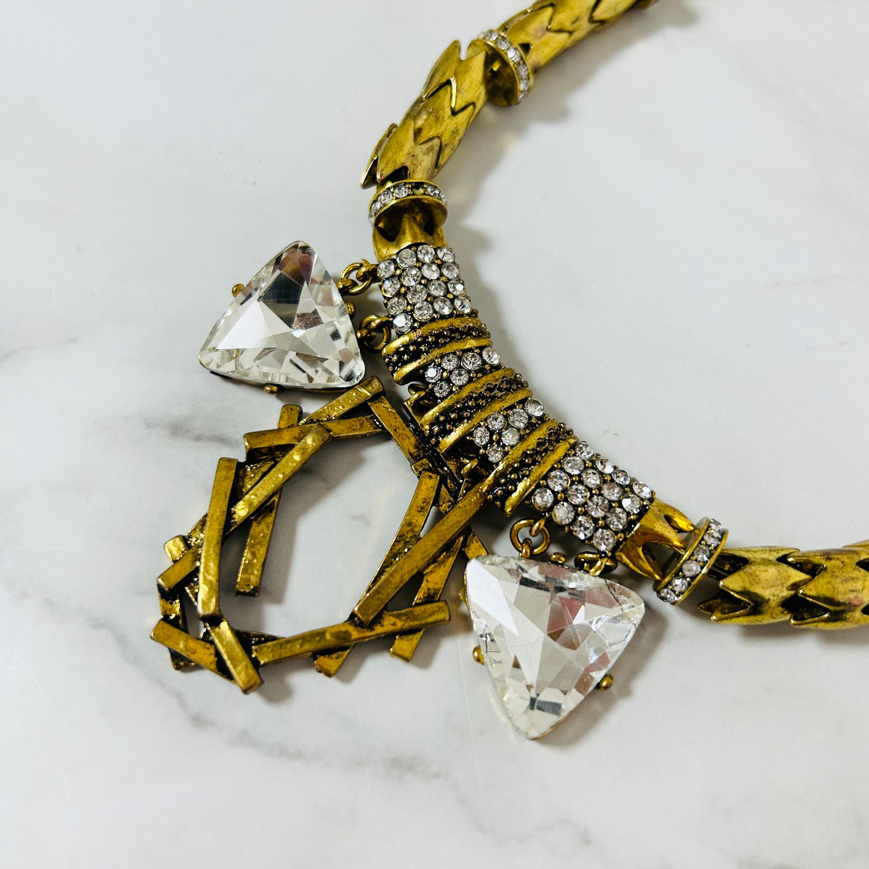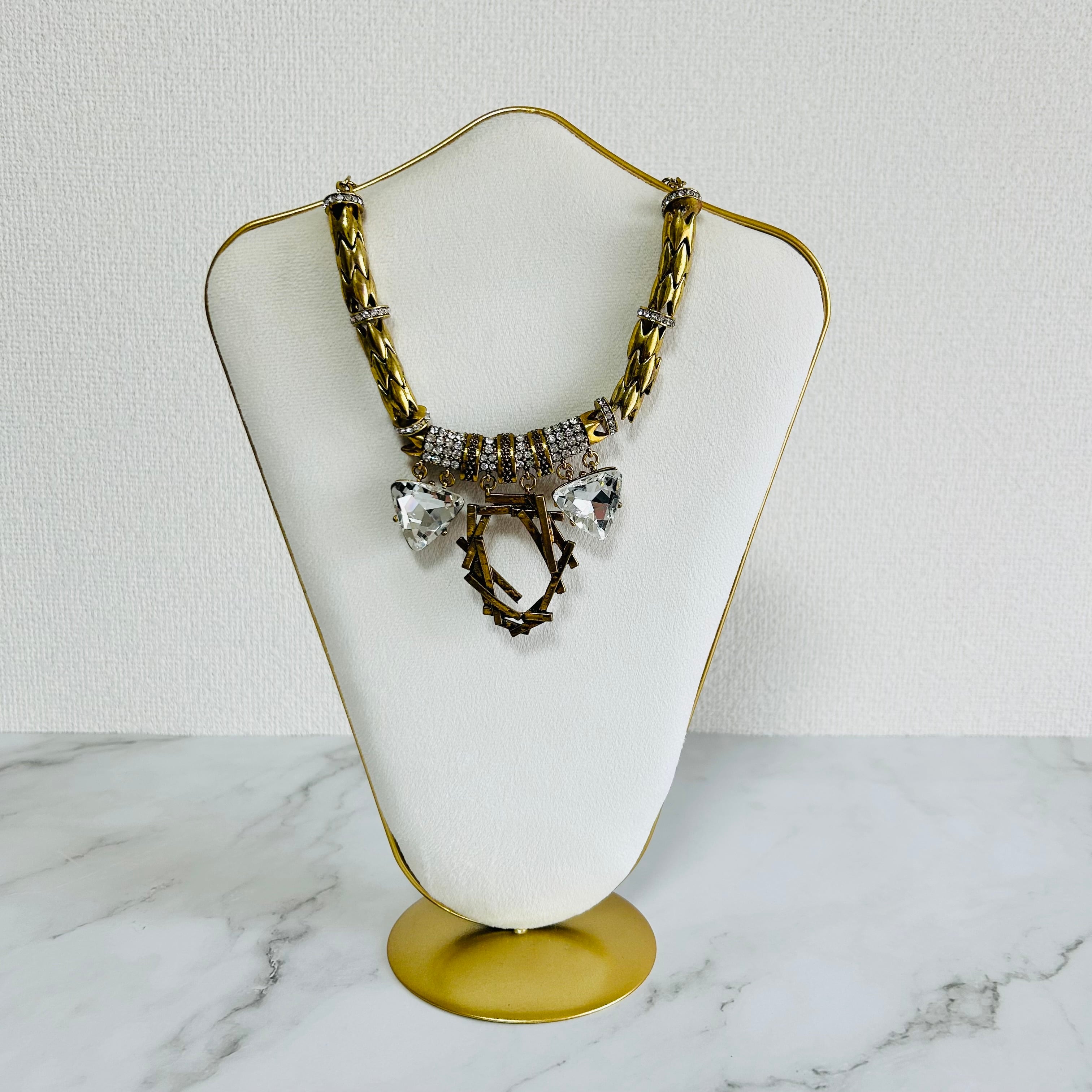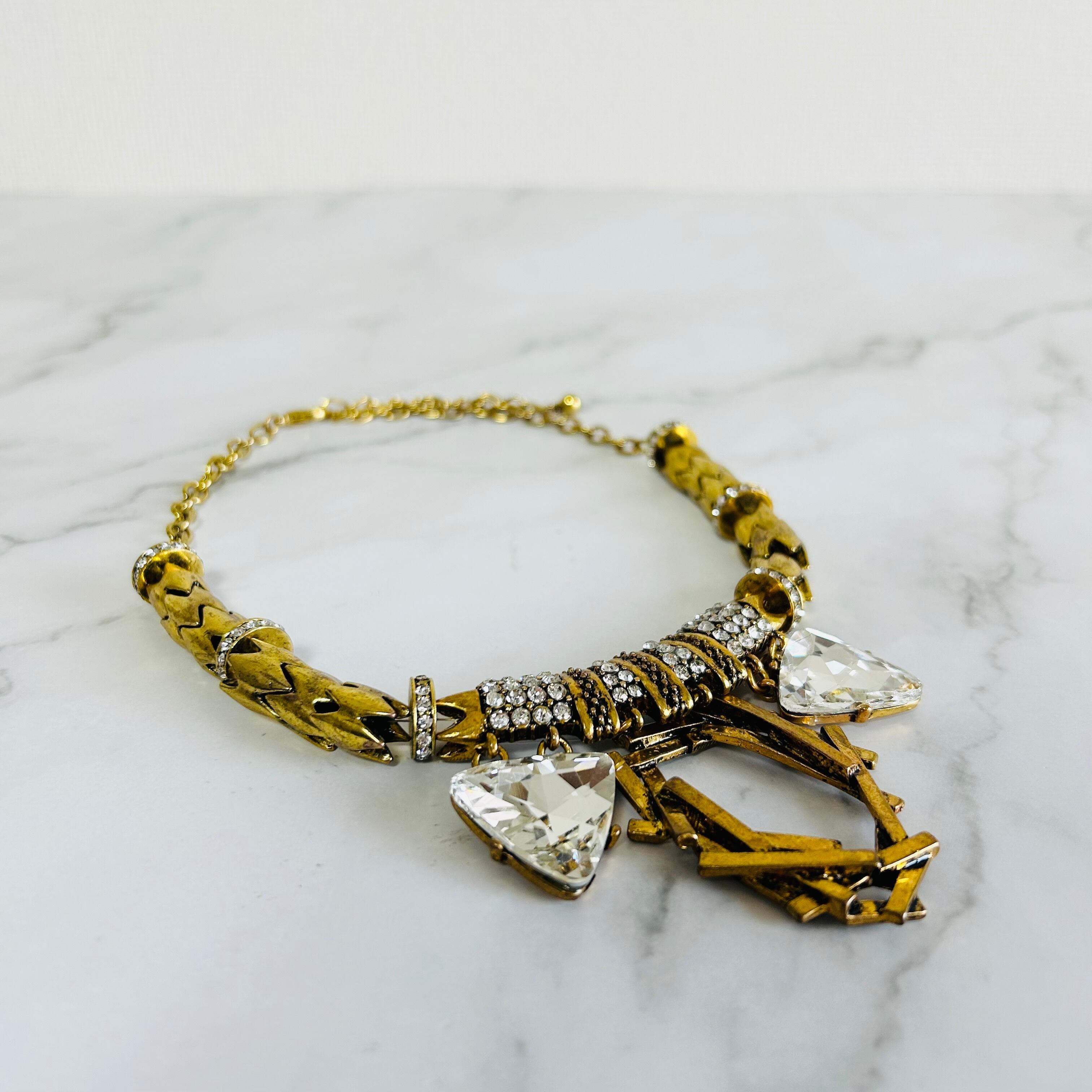 立体的なゴールドチェーンにクリスタルビジューとラインストーンを大胆にあしらったオリジナリティ溢れるデザインです。