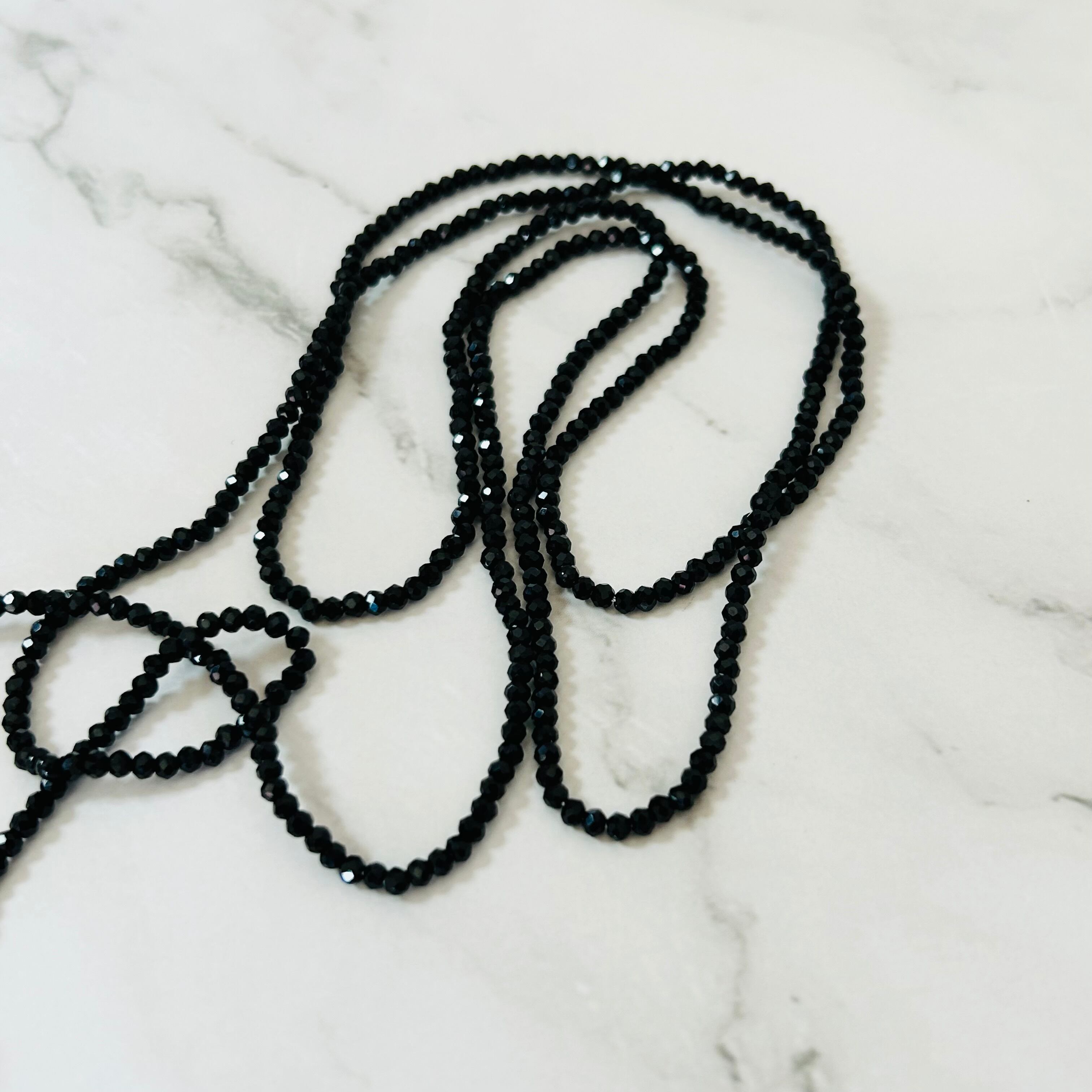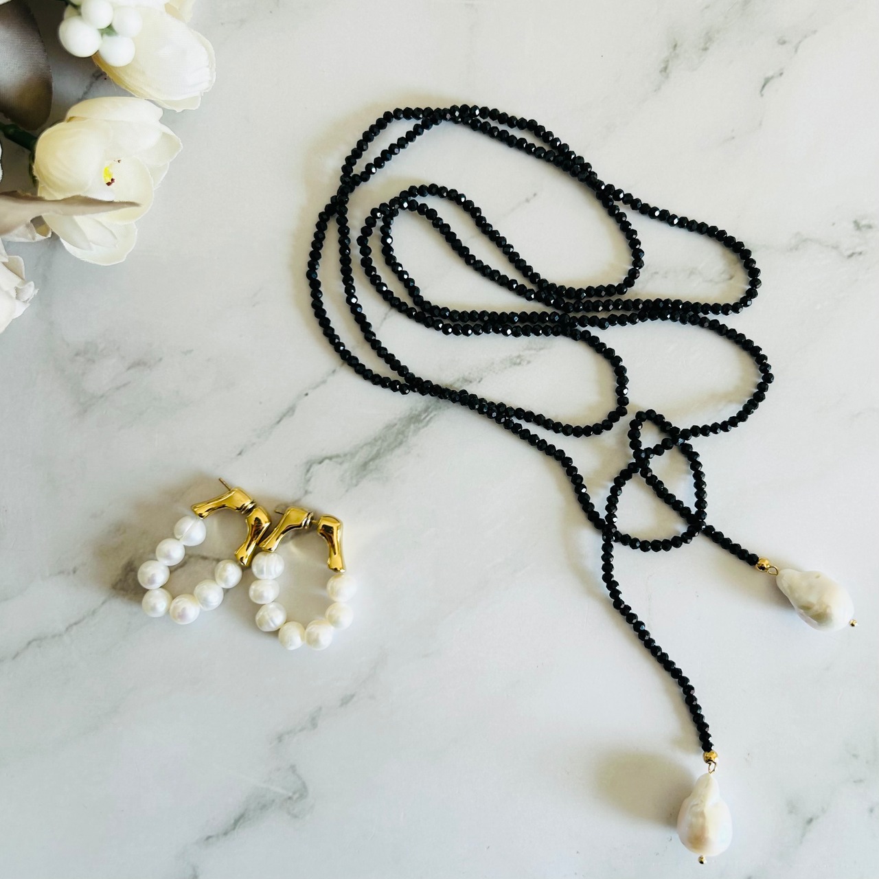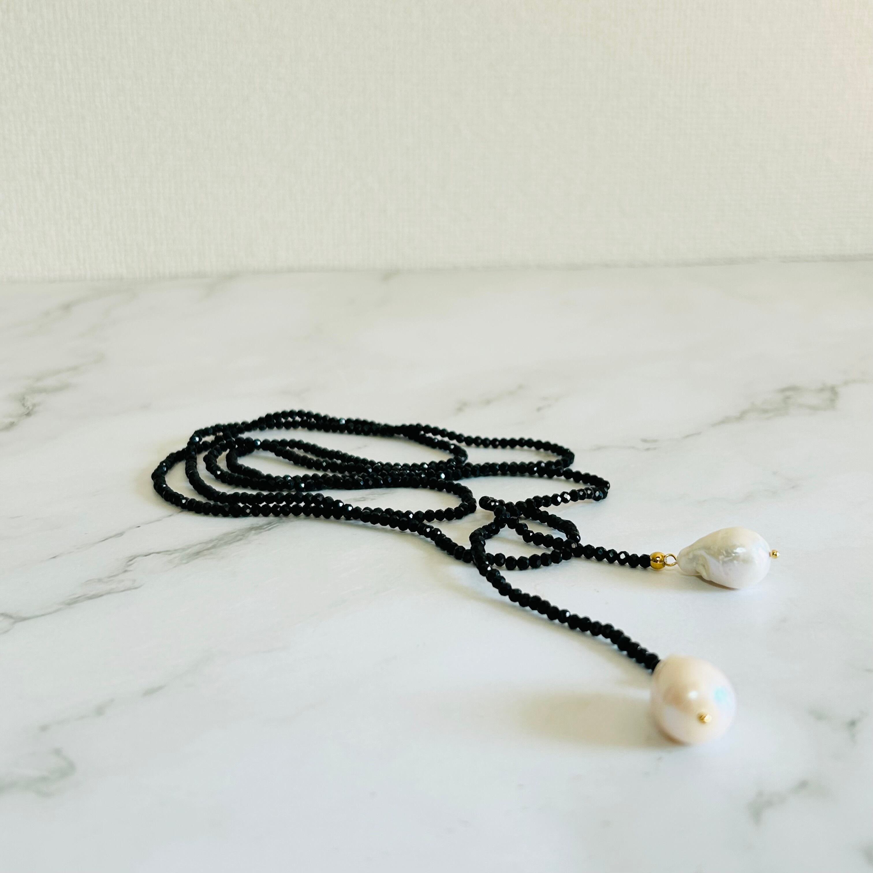 ブラックのクリスタルビーズと天然淡水パールを使用したラリエットタイプのデザインです。