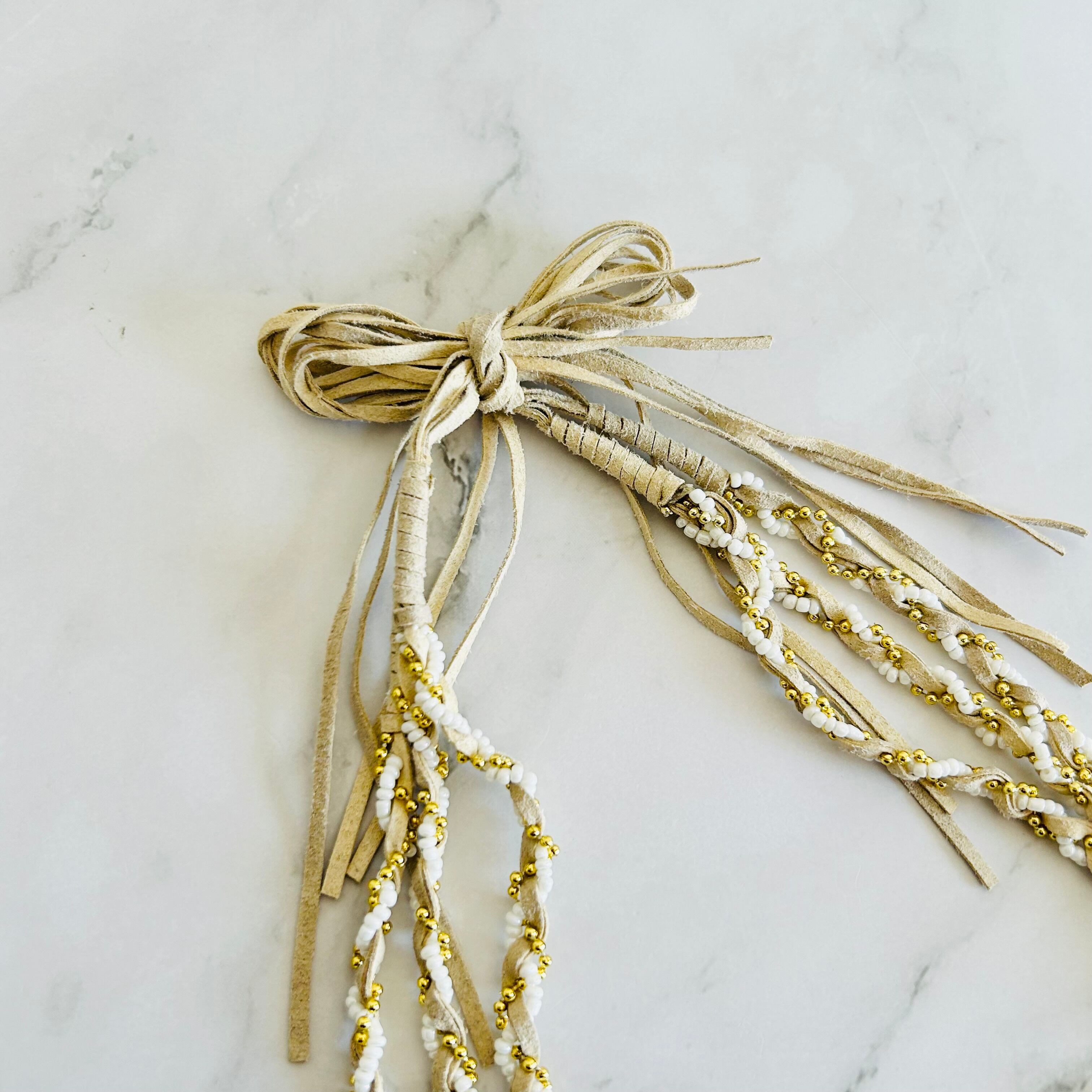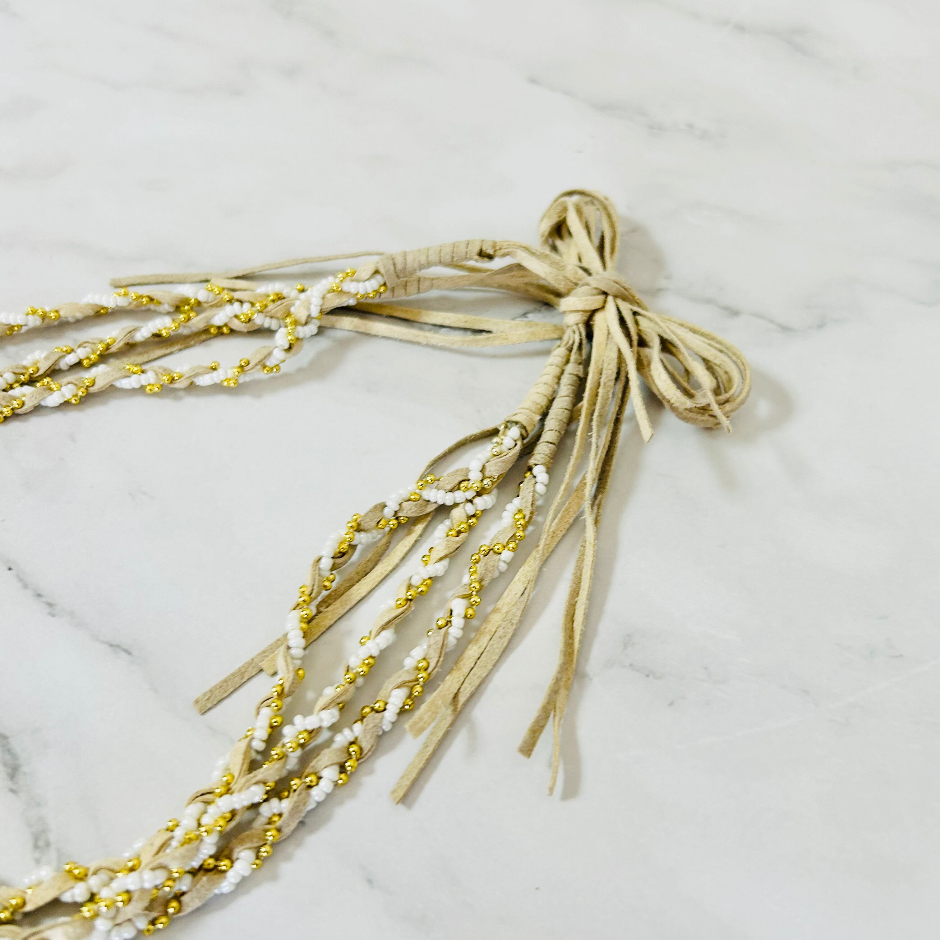 エナメル加工の大ぶりモチーフにビーズコードとレザーの紐を編み上げ組み合わせたデザインです。
