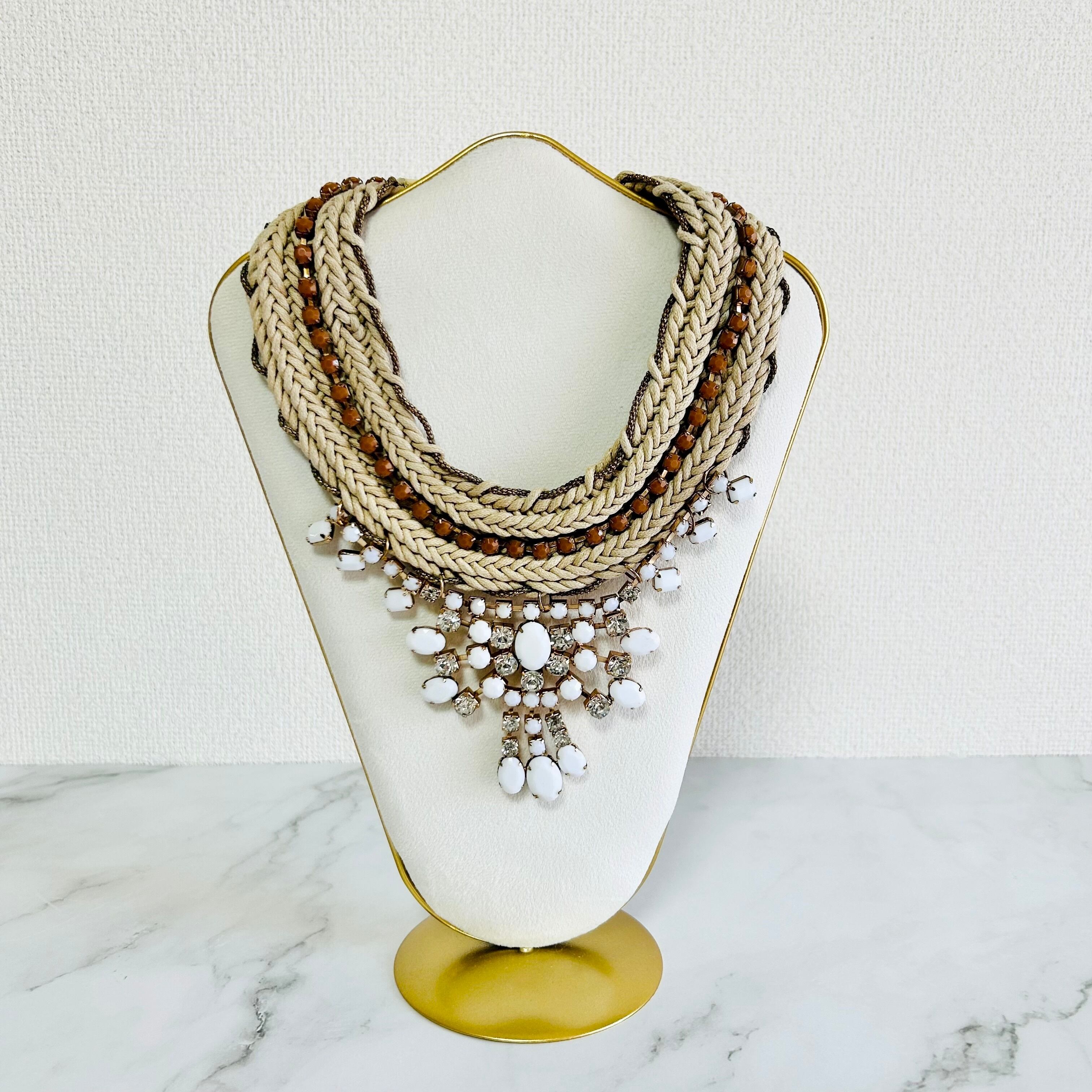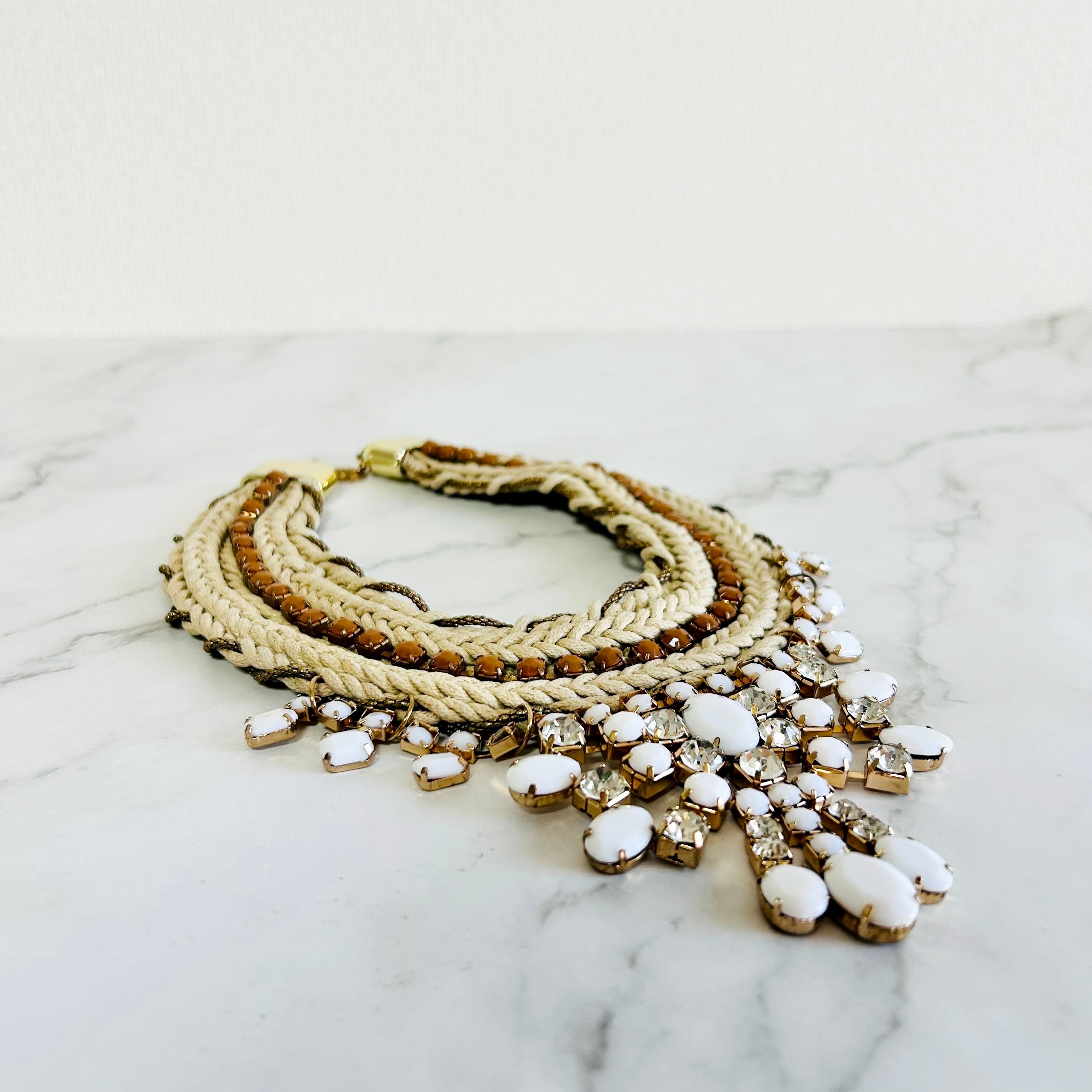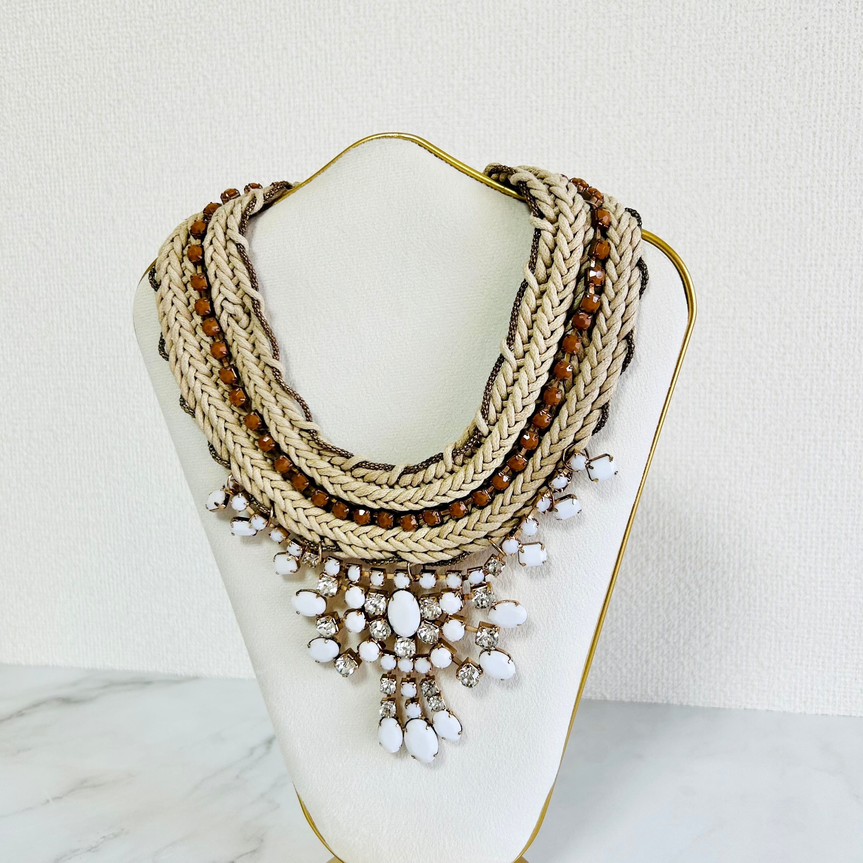 ナチュラルなベージュのコードに、ホワイトオパールのストーンとラインストーンが華やかに配置されたネックレスです。