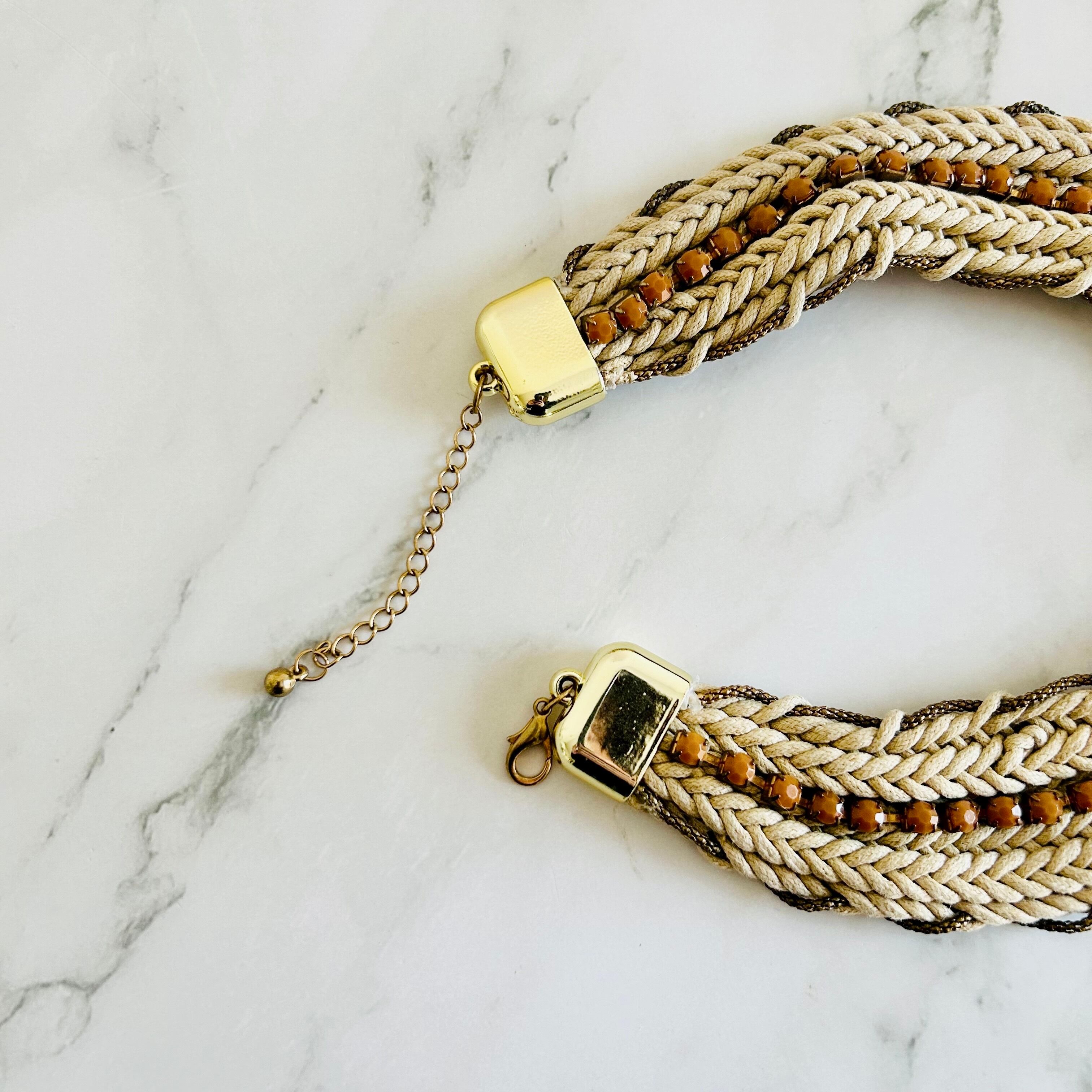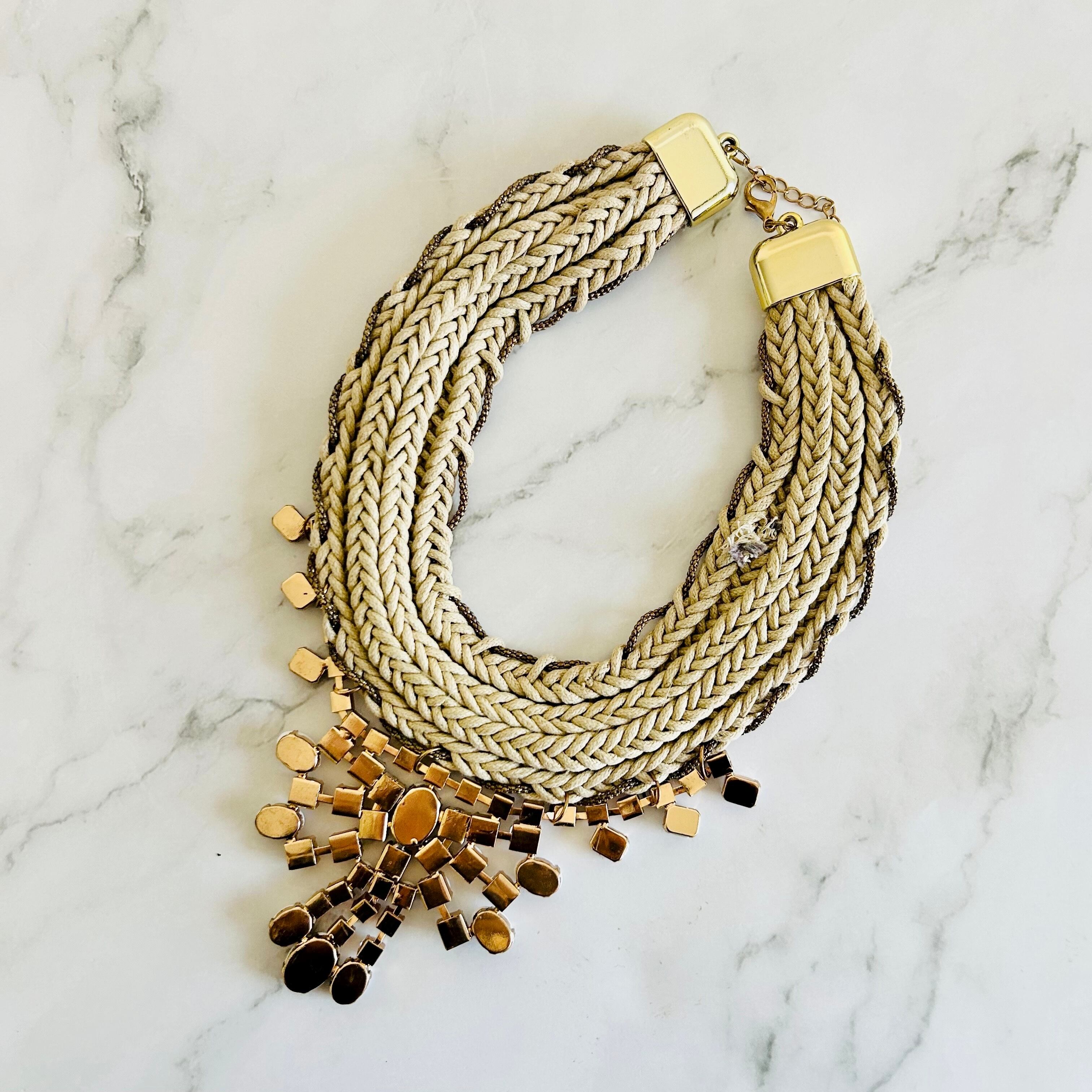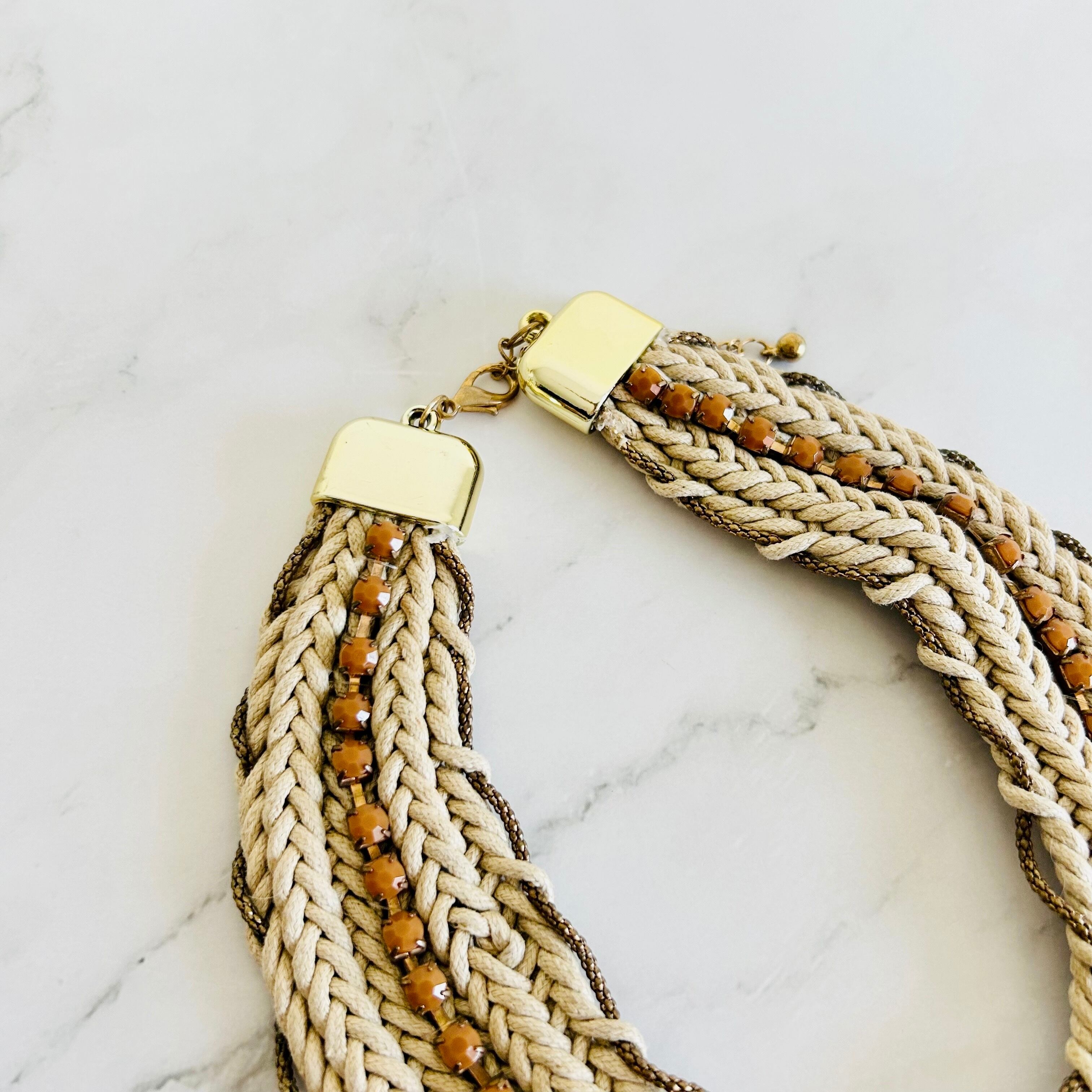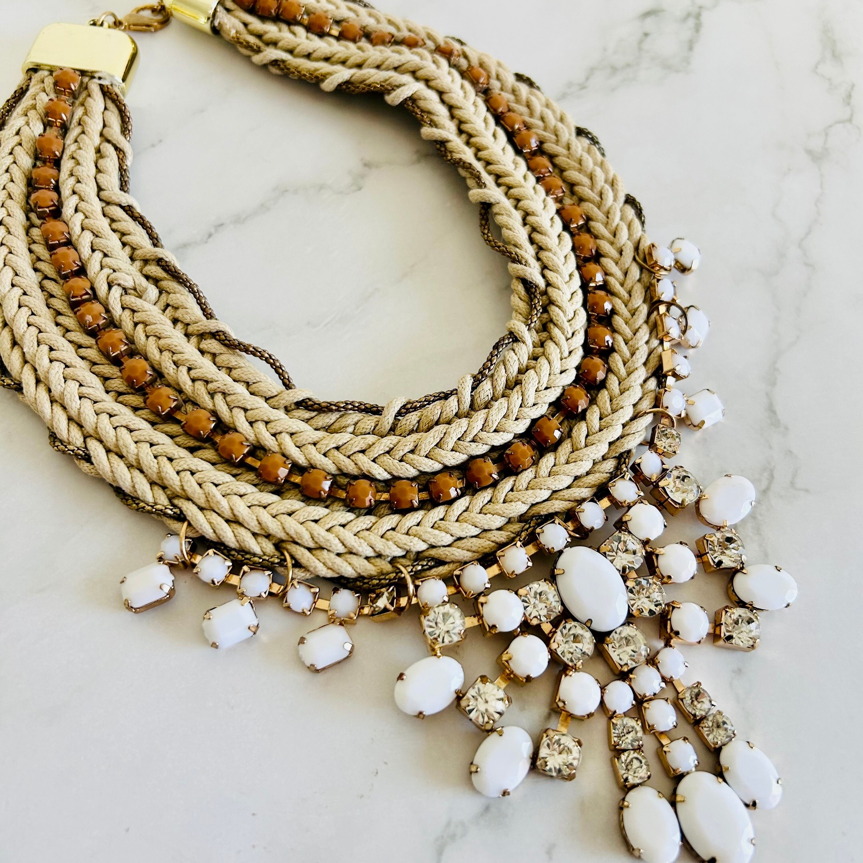 ナチュラルなベージュのコードに、ホワイトオパールのストーンとラインストーンが華やかに配置されたネックレスです。
