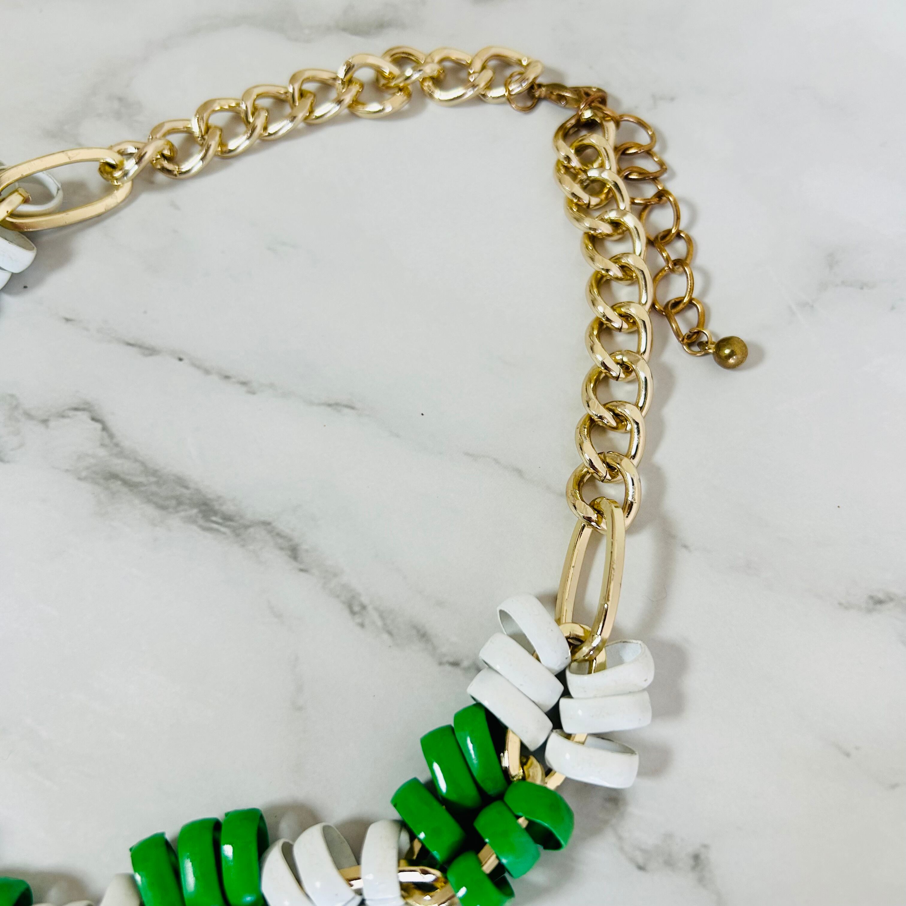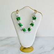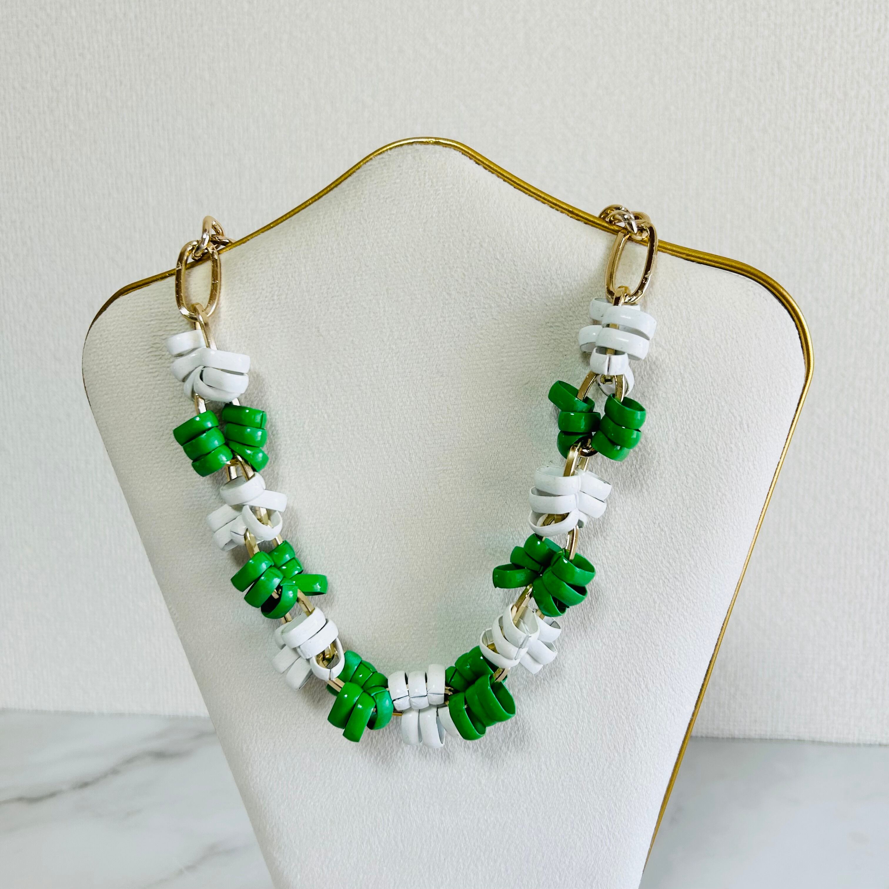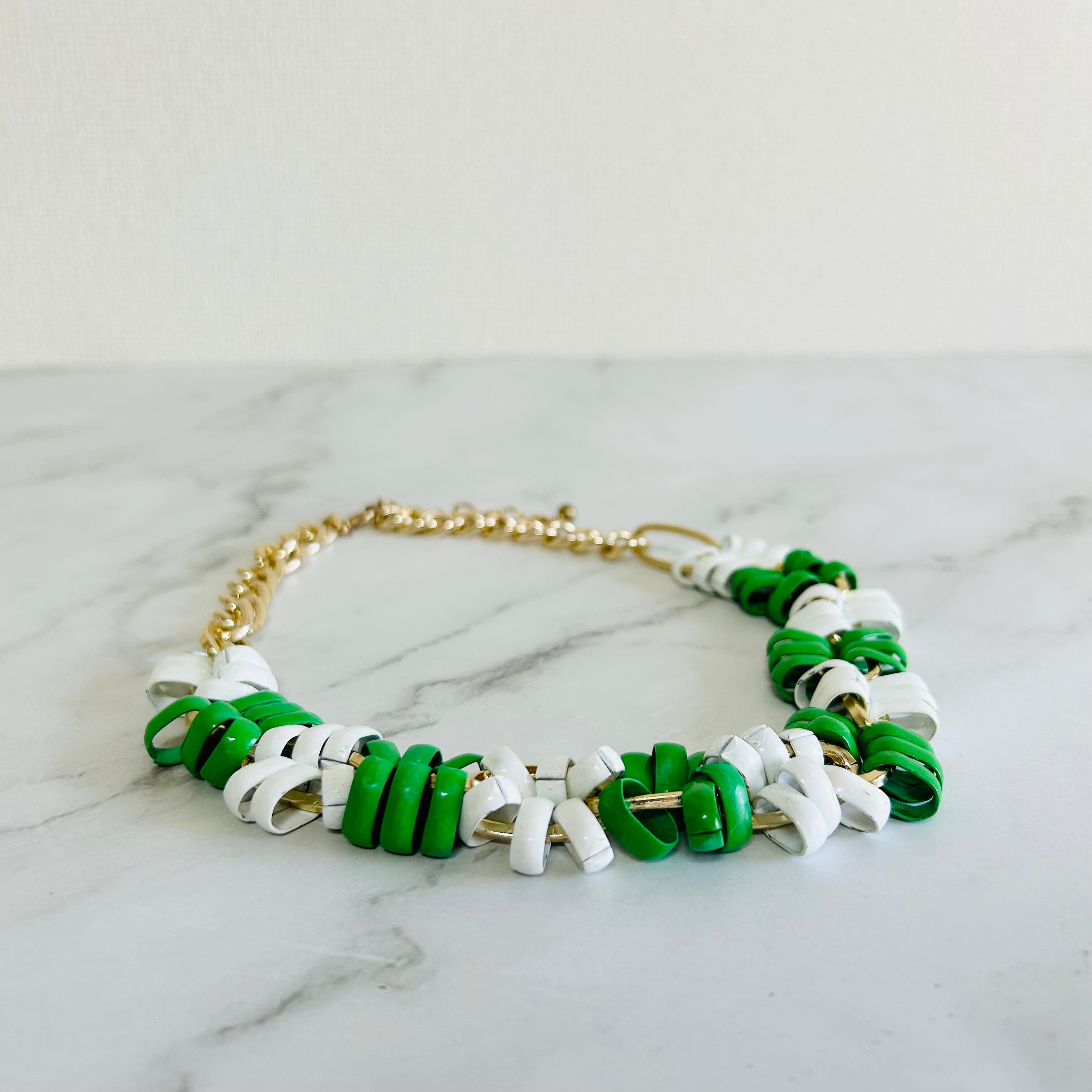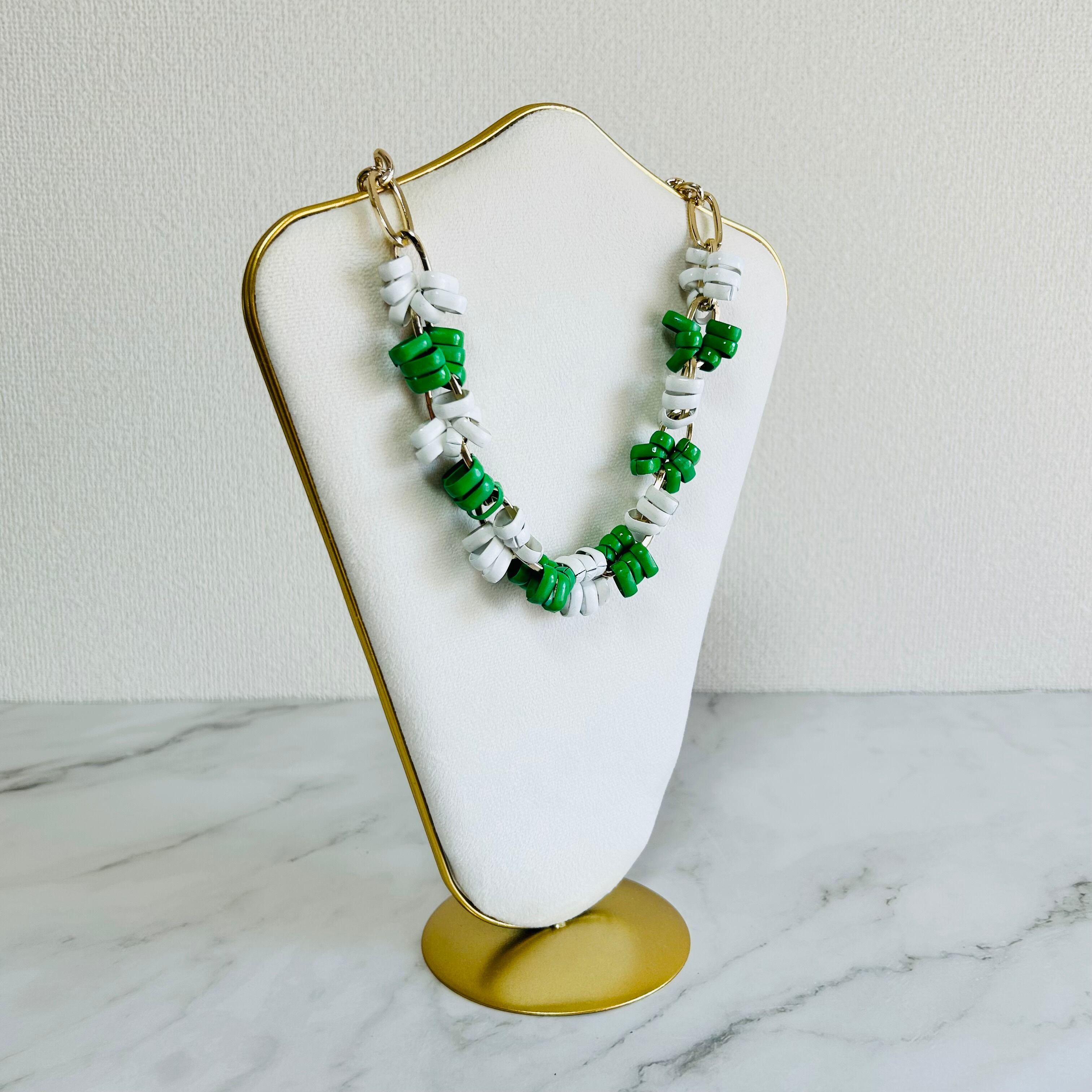 爽やかなグリーンとホワイトのメタルパーツをふんだんに使い、ボリューム感と爽やかさを両立させたアート感あふれるデザインです。