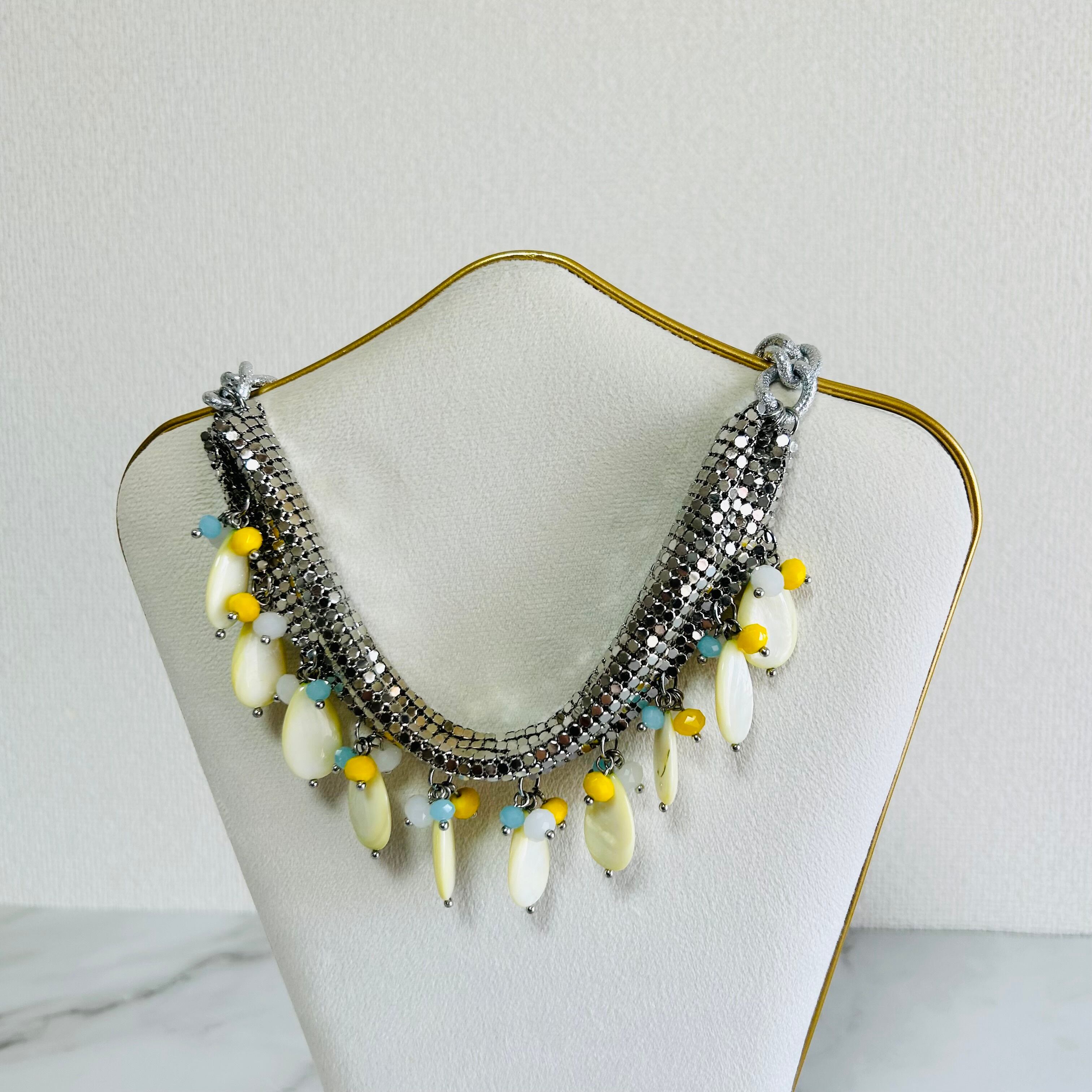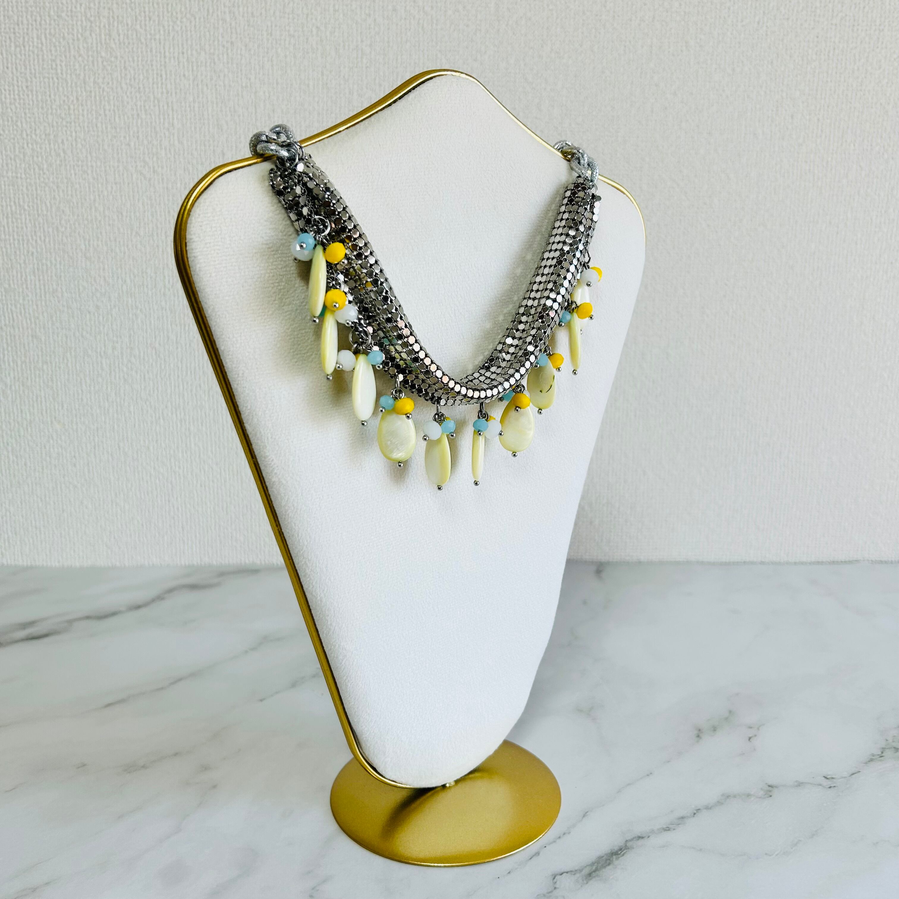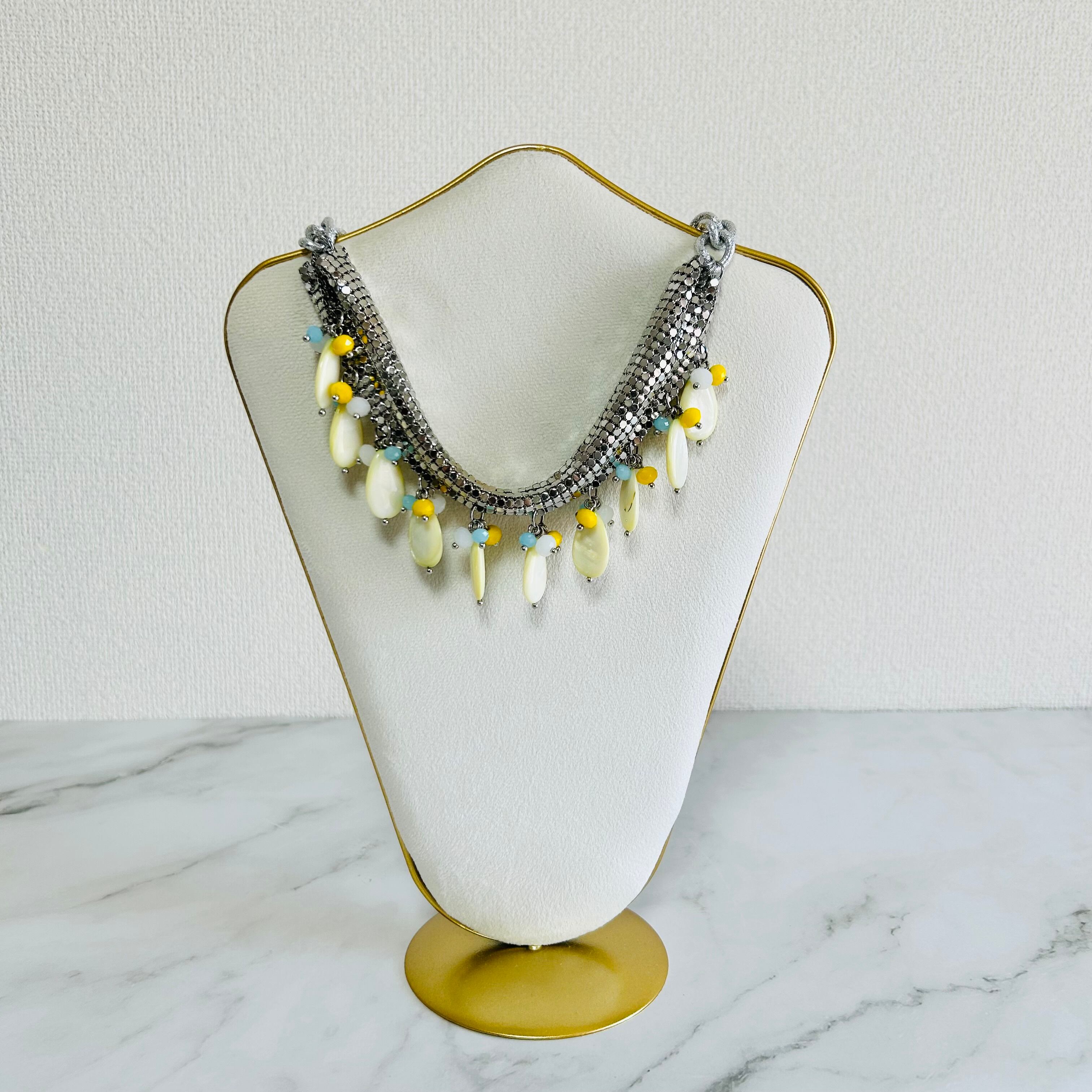 メタリックなシルバーの輝きと、イエローシェルの優しさのバランスが絶妙で、大人の遊び心を感じさせる、個性的で魅力のあるネックレスです☆