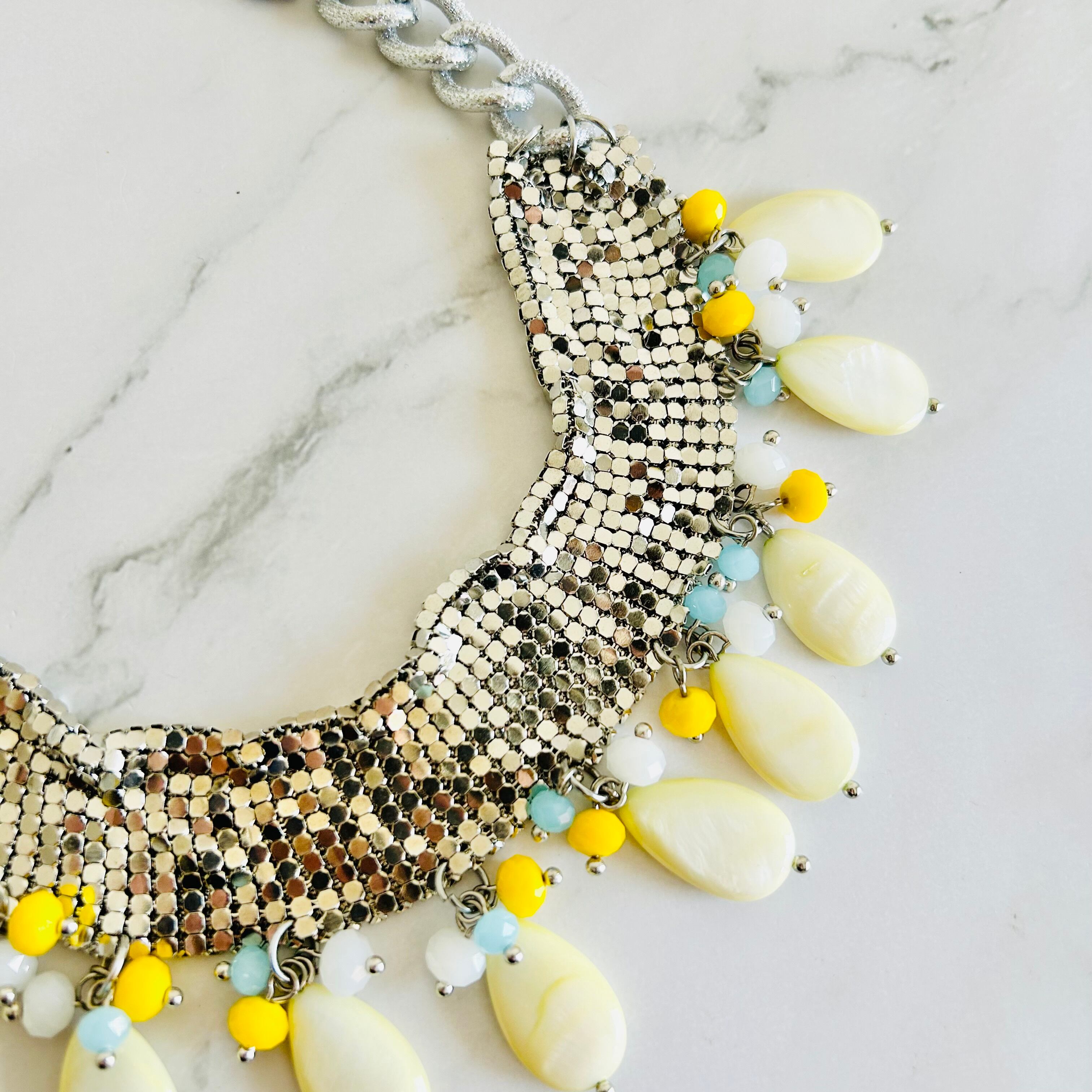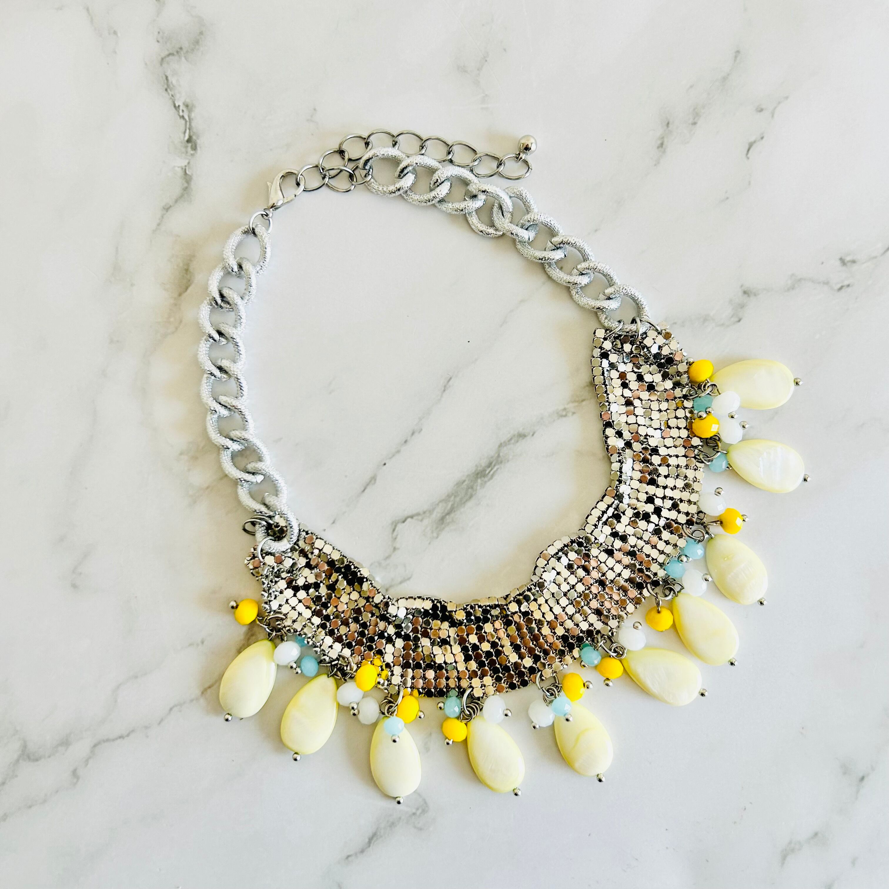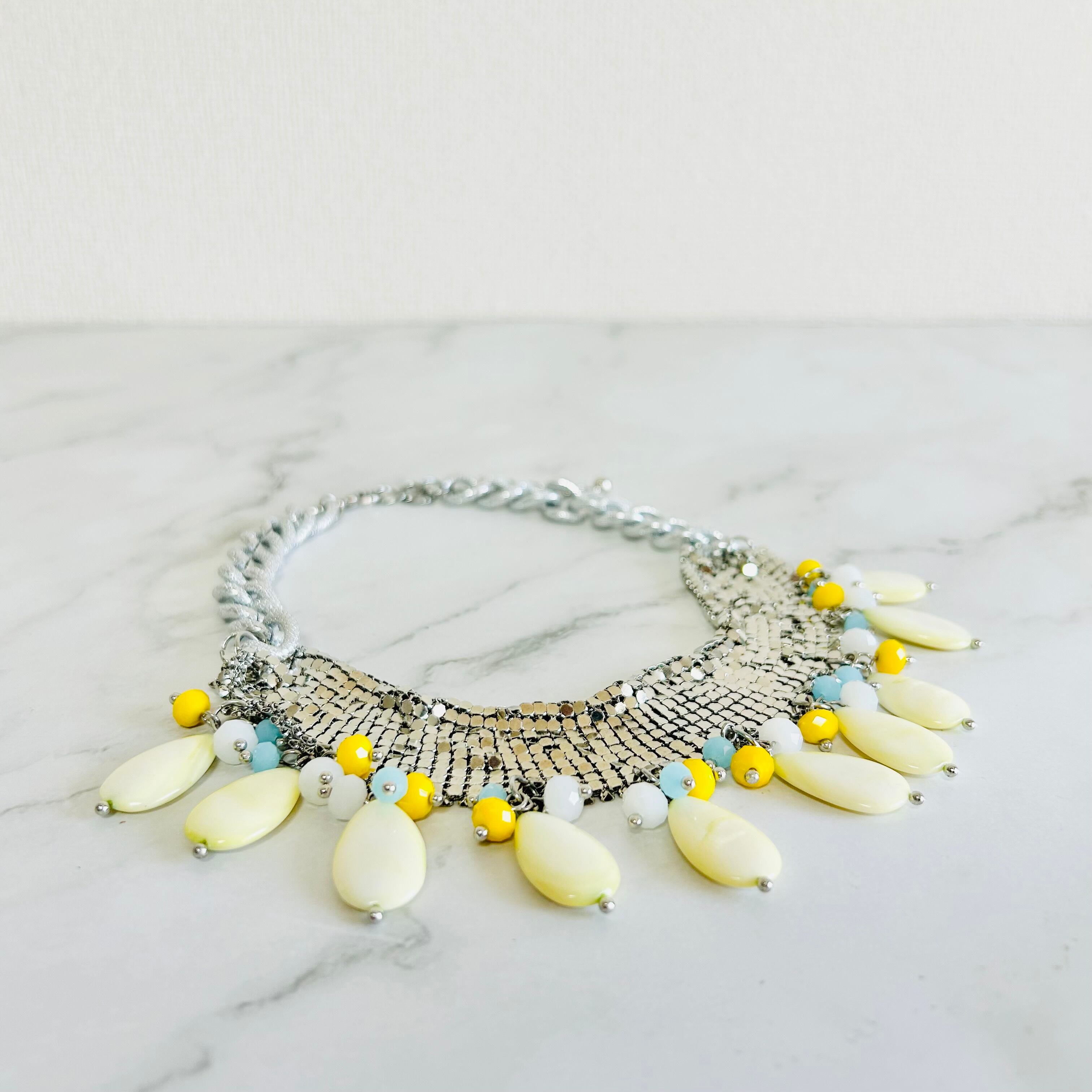 メタリックにきらめくシルバーチェーンに、やさしいイエローのシェルとカラフルなビーズを組み合わせた、他にはないユニークなデザインです。