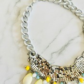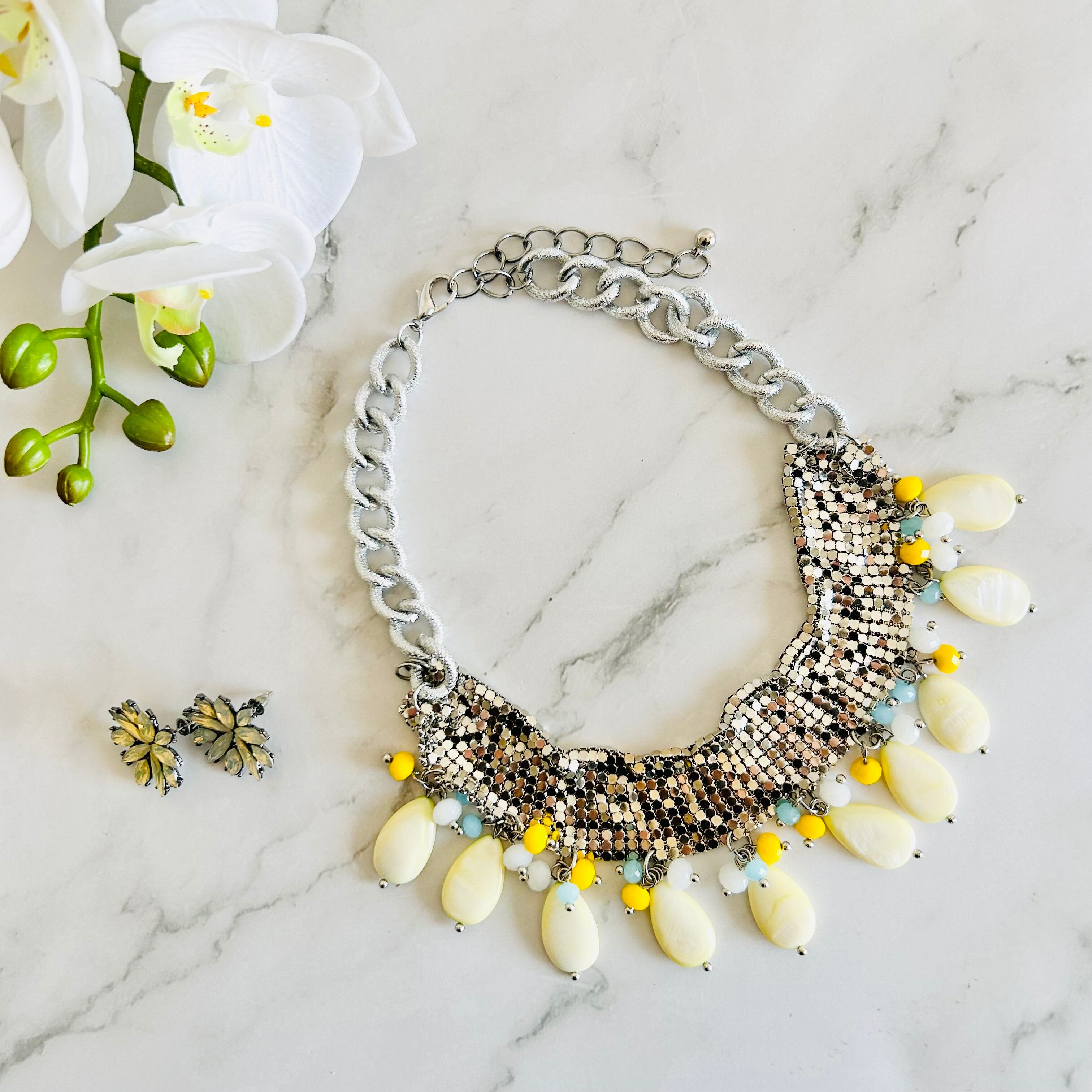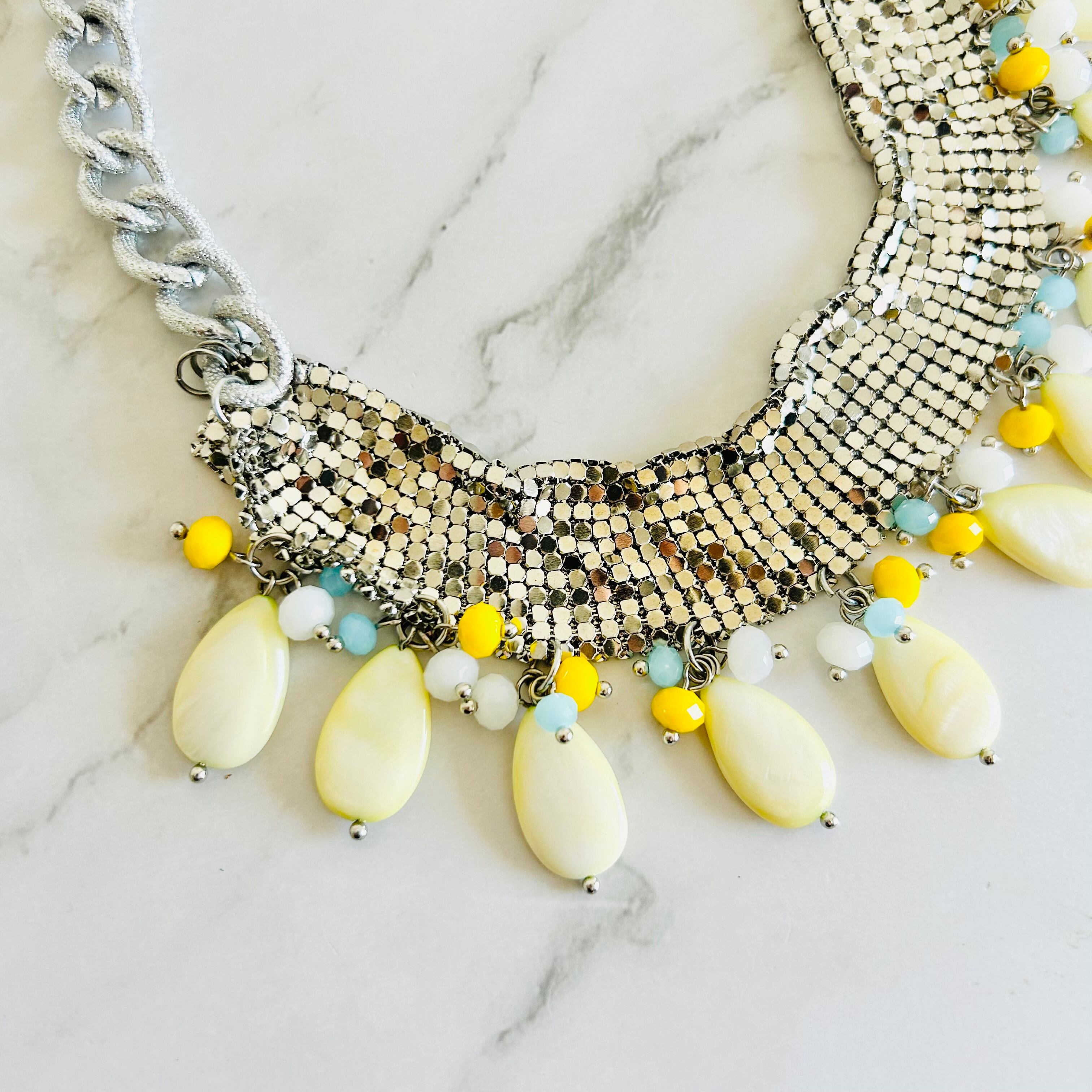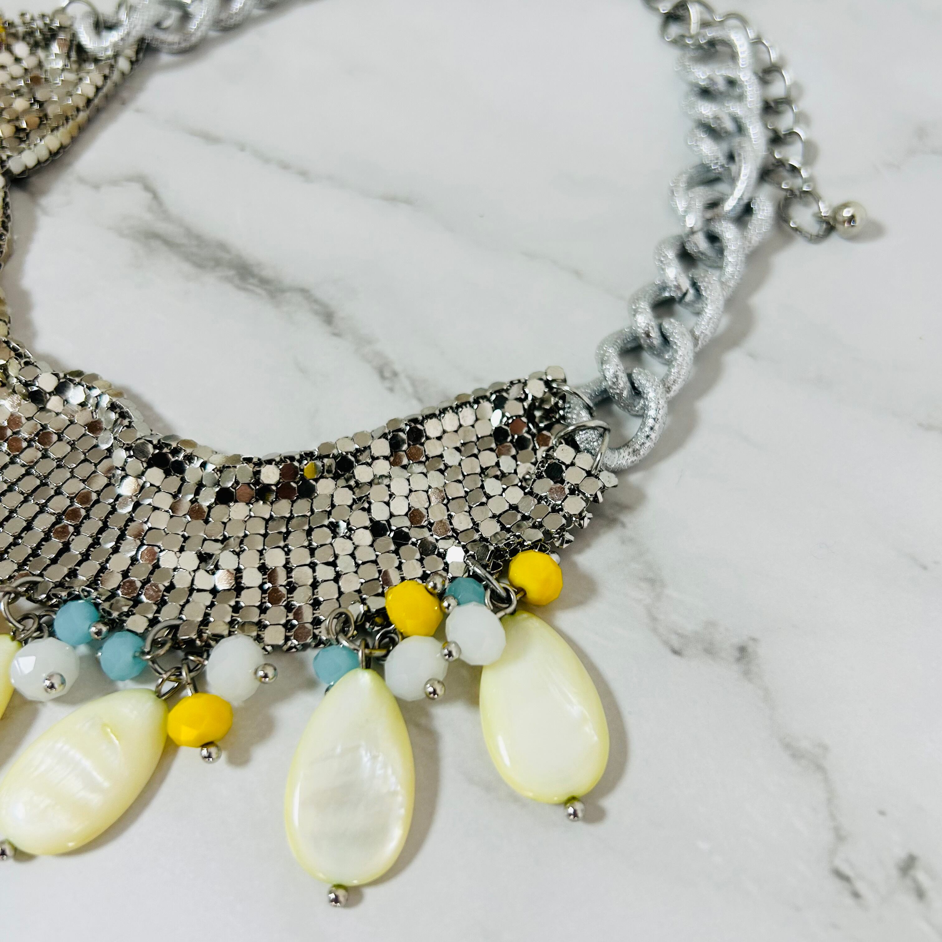 メタリックにきらめくシルバーチェーンに、やさしいイエローのシェルとカラフルなビーズを組み合わせた、他にはないユニークなデザインです。