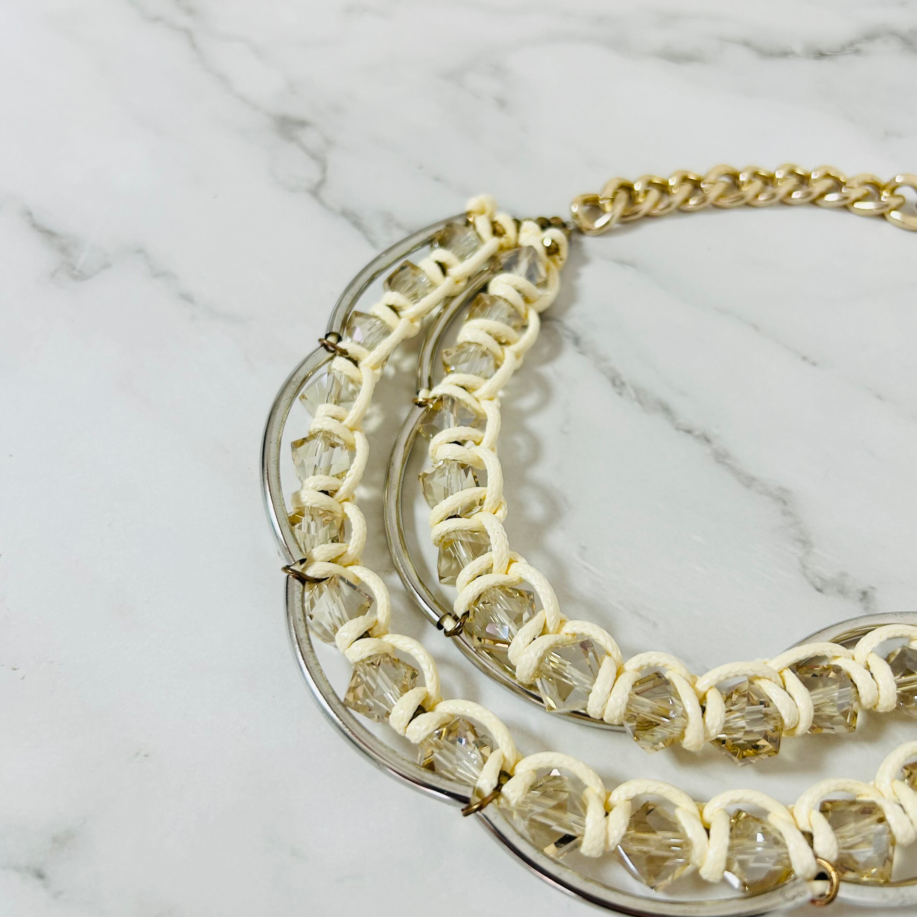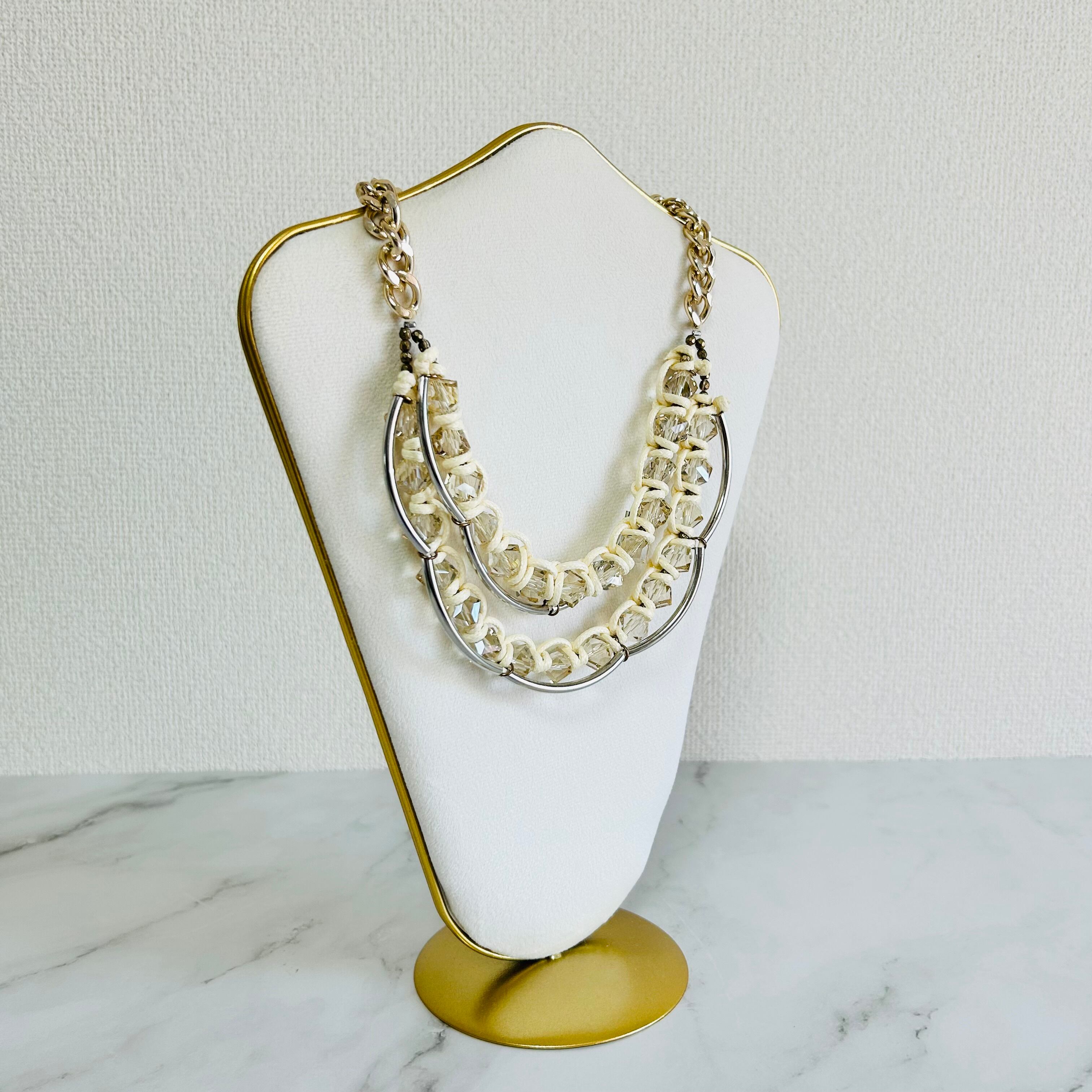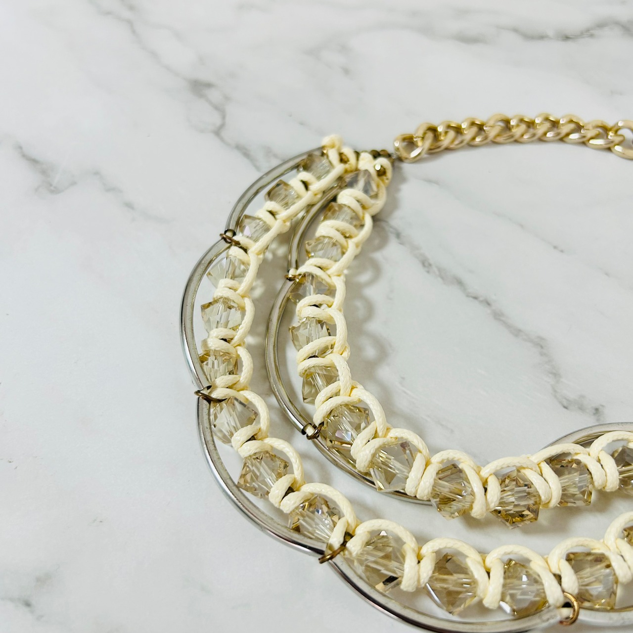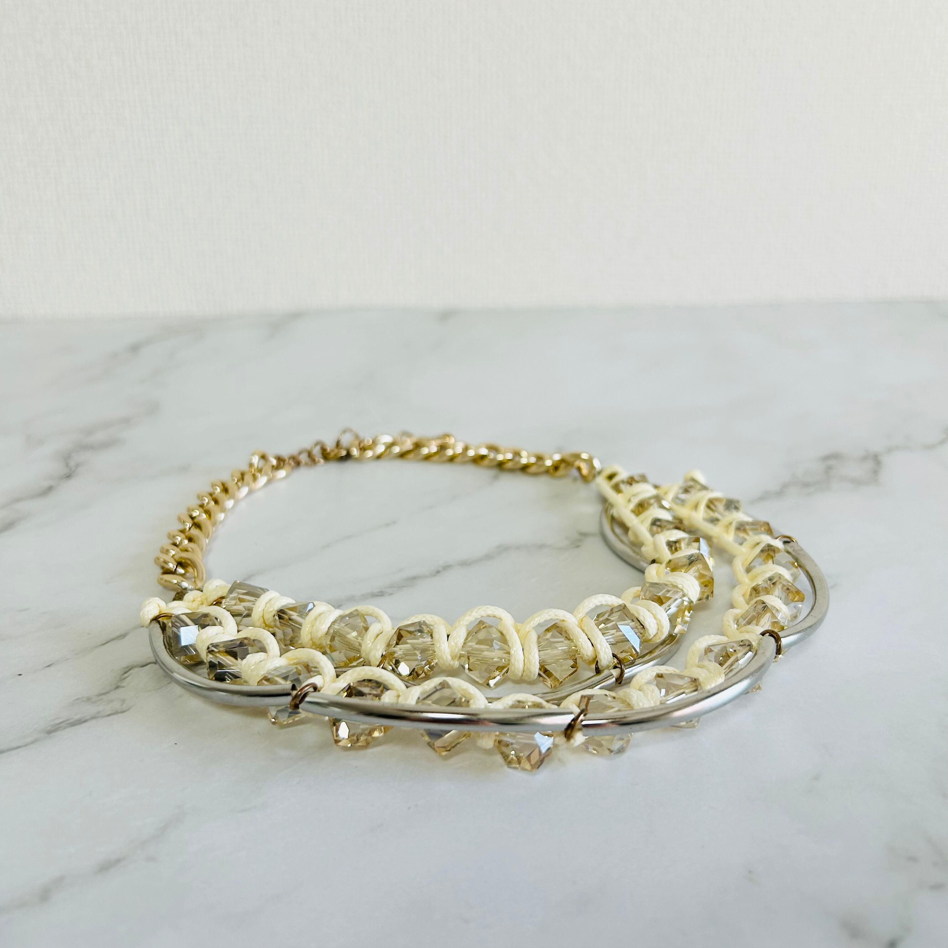 やや色味のあるキューブ型のクリスタルビーズとアイボリーコードを丁寧に編み込んだ、透明感あふれるデザインです。