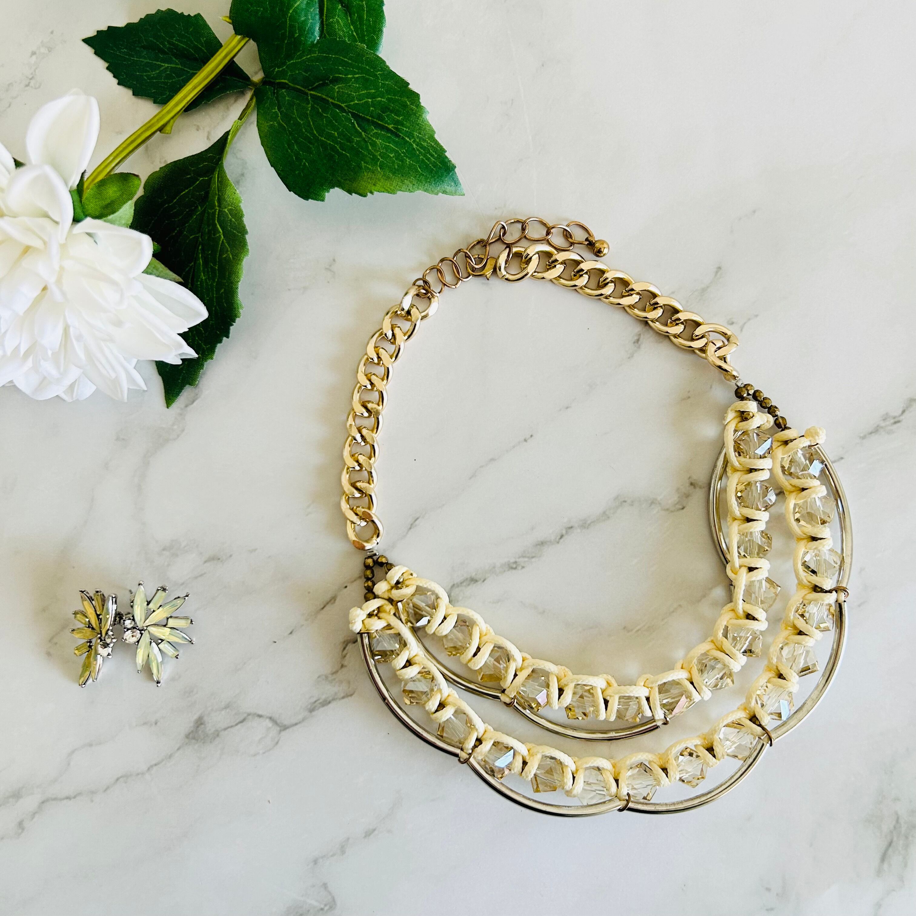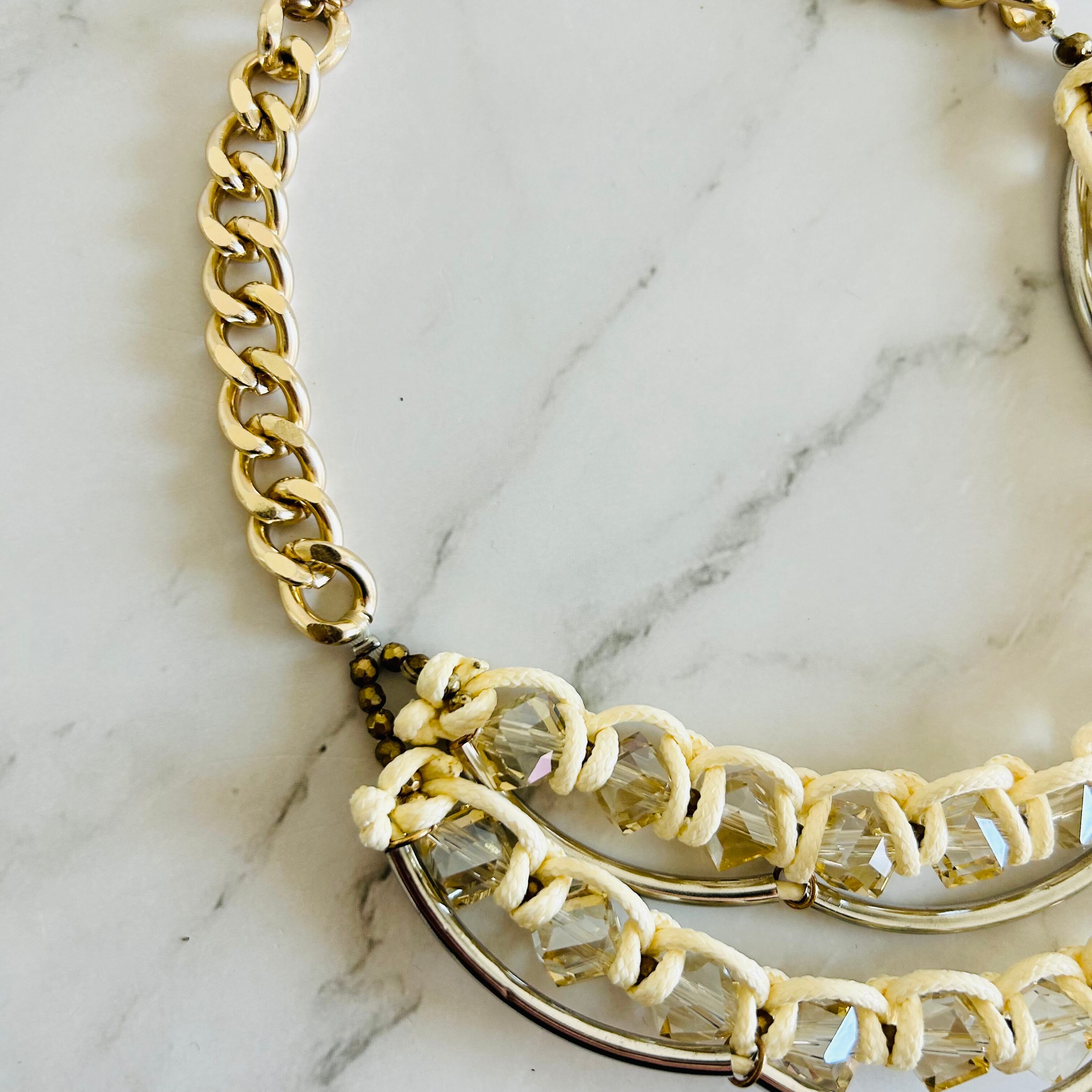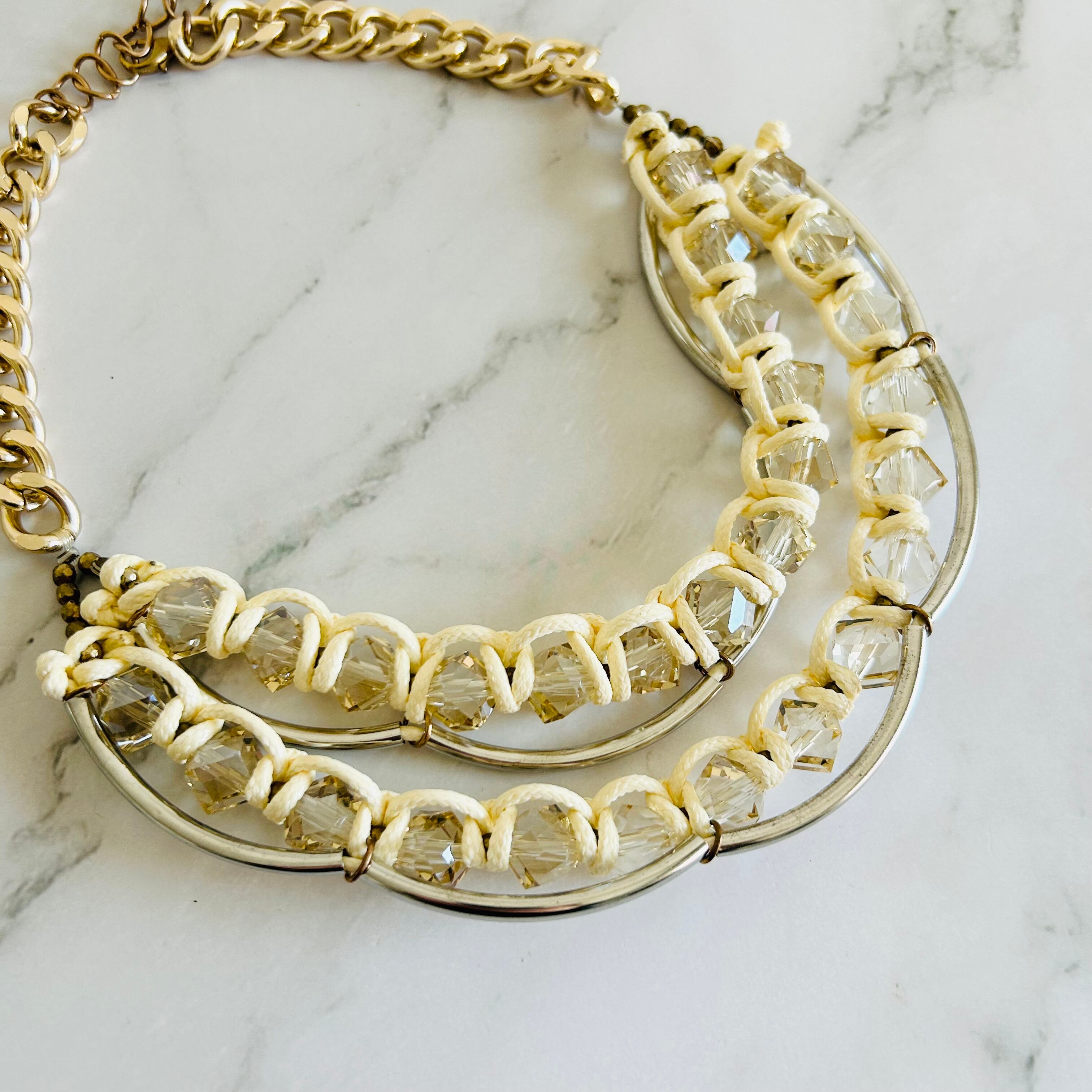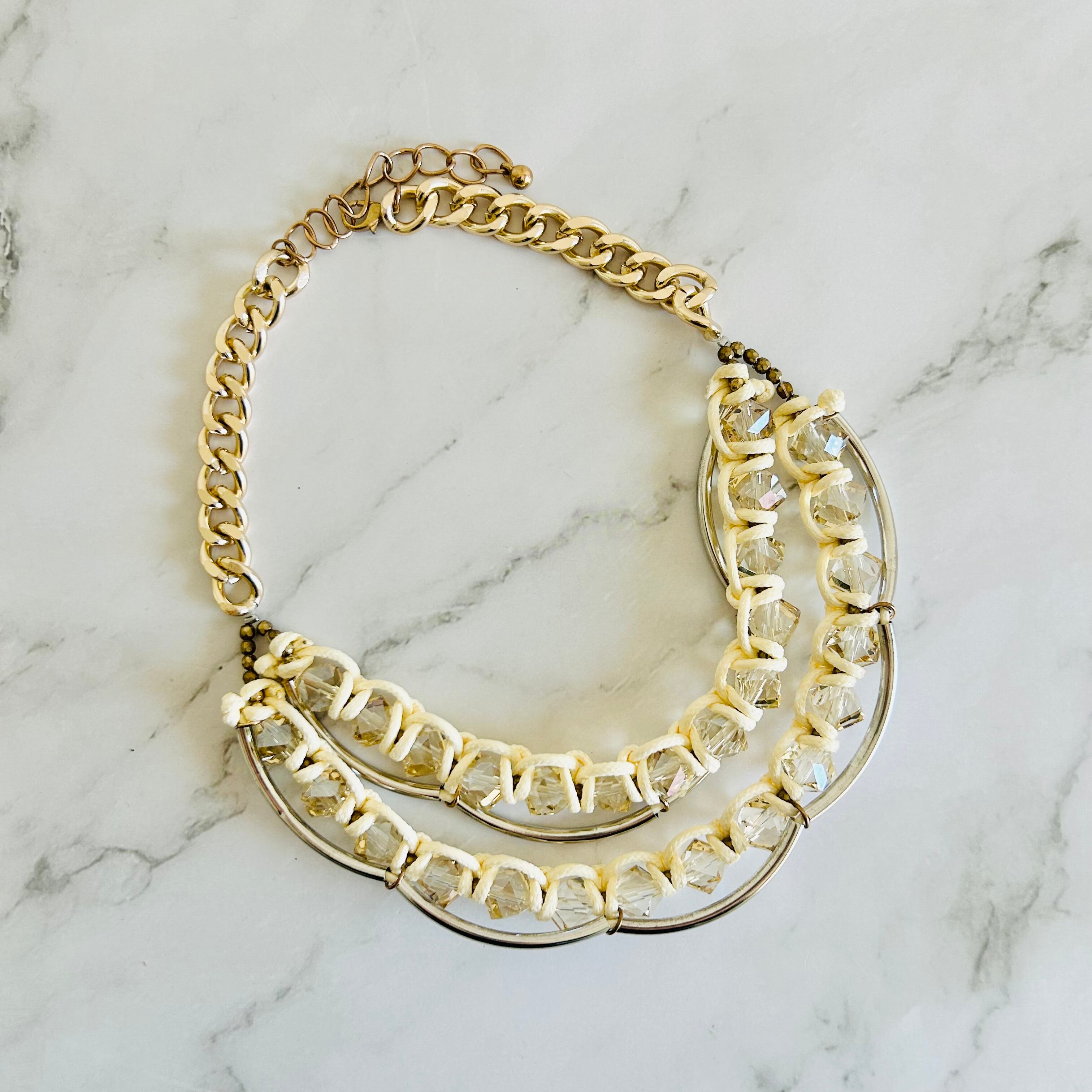 やや色味のあるキューブ型のクリスタルビーズとアイボリーコードを丁寧に編み込んだ、透明感あふれるデザインです。