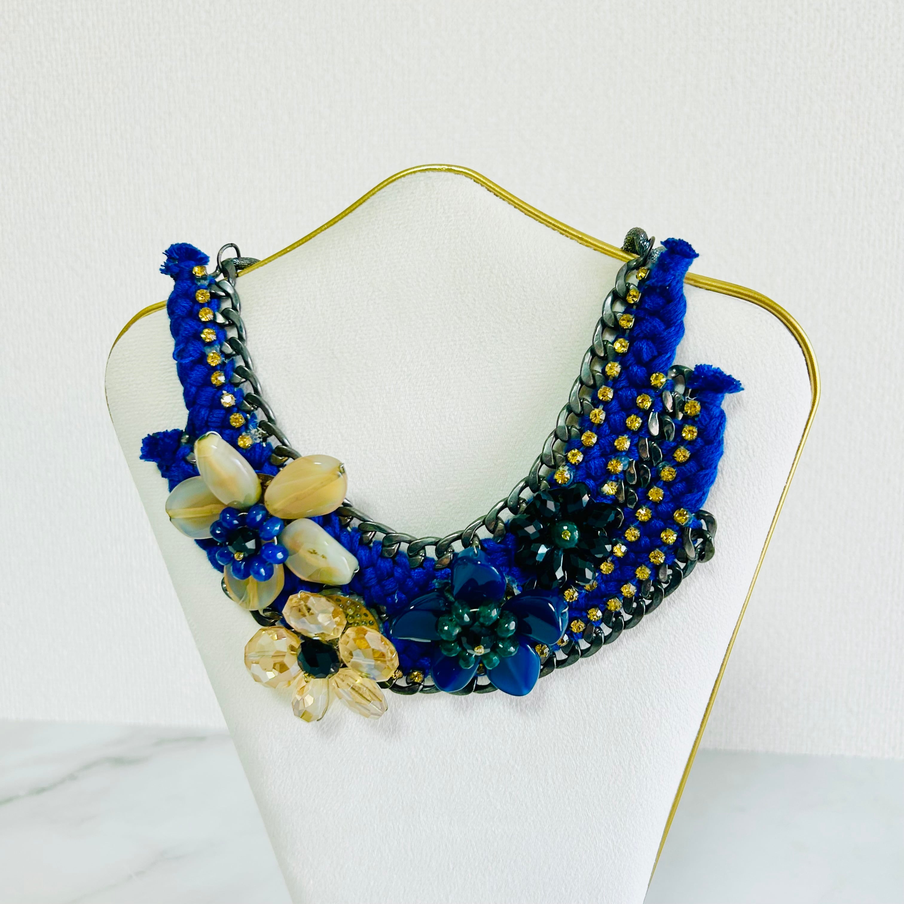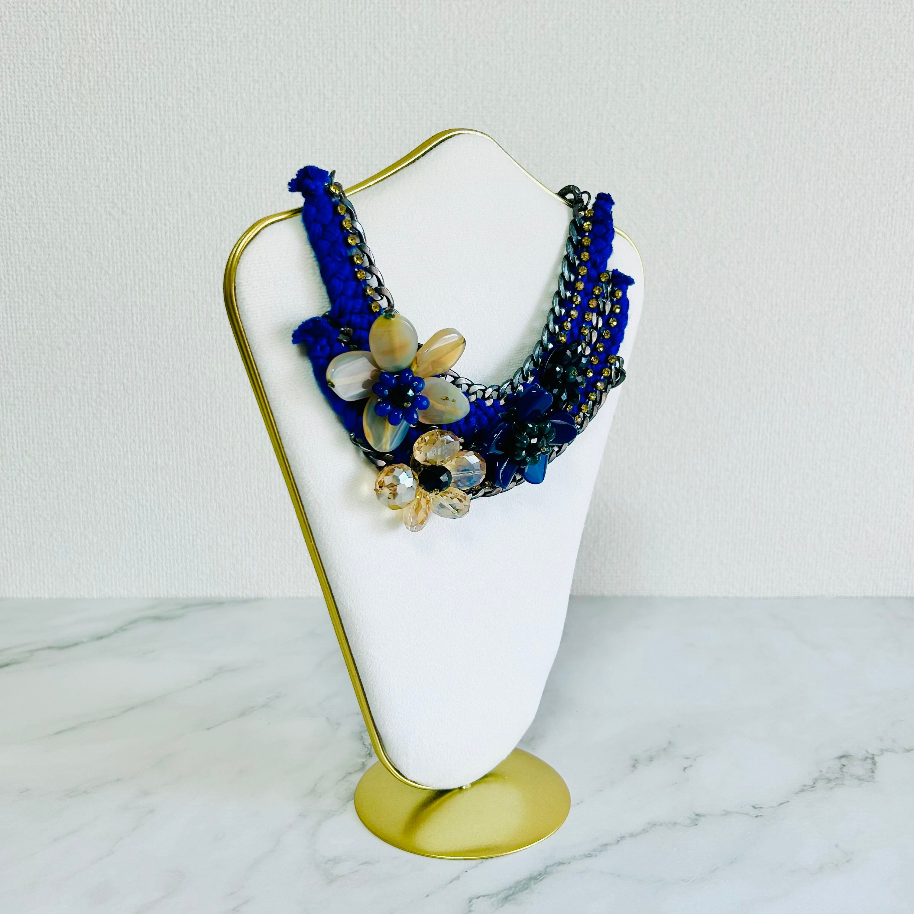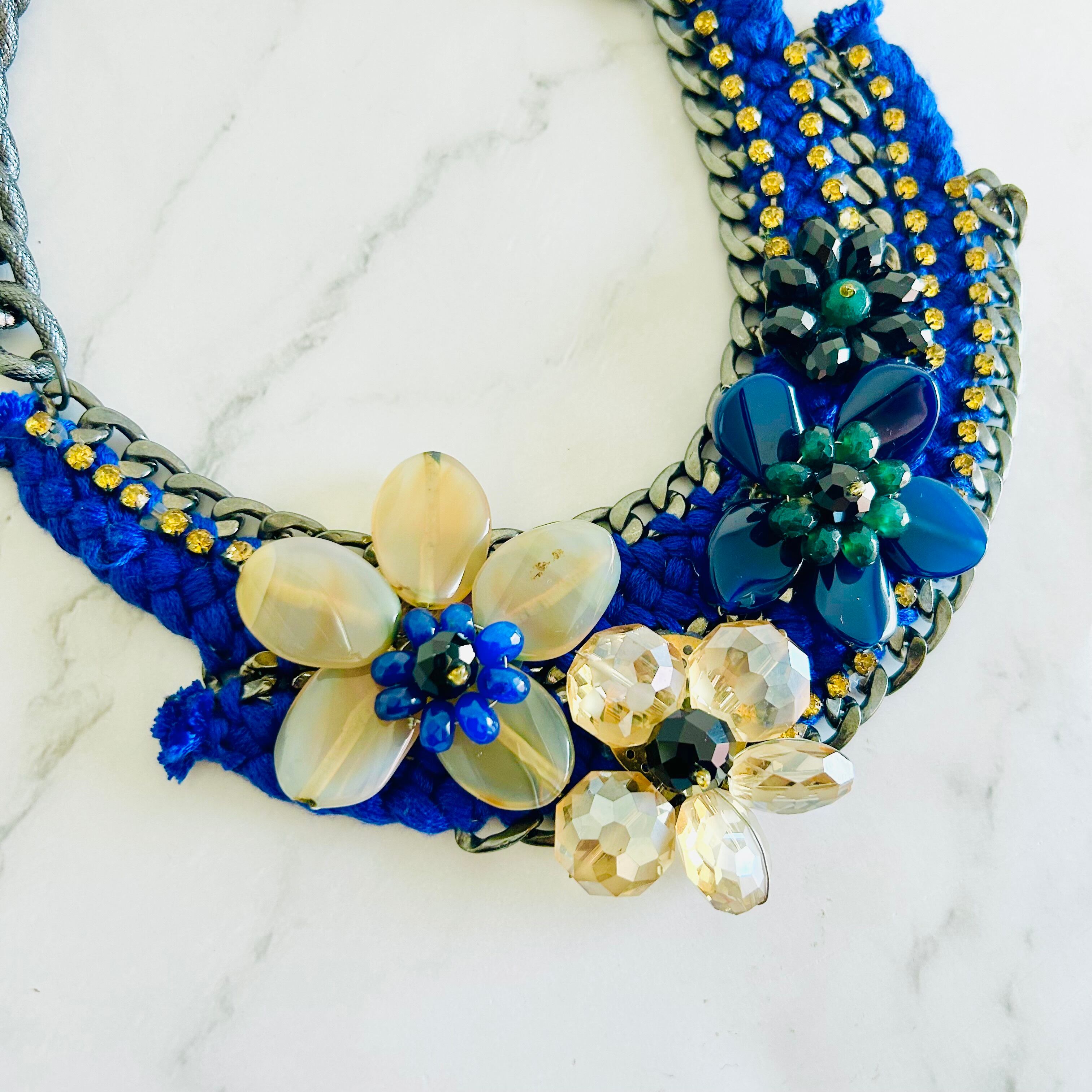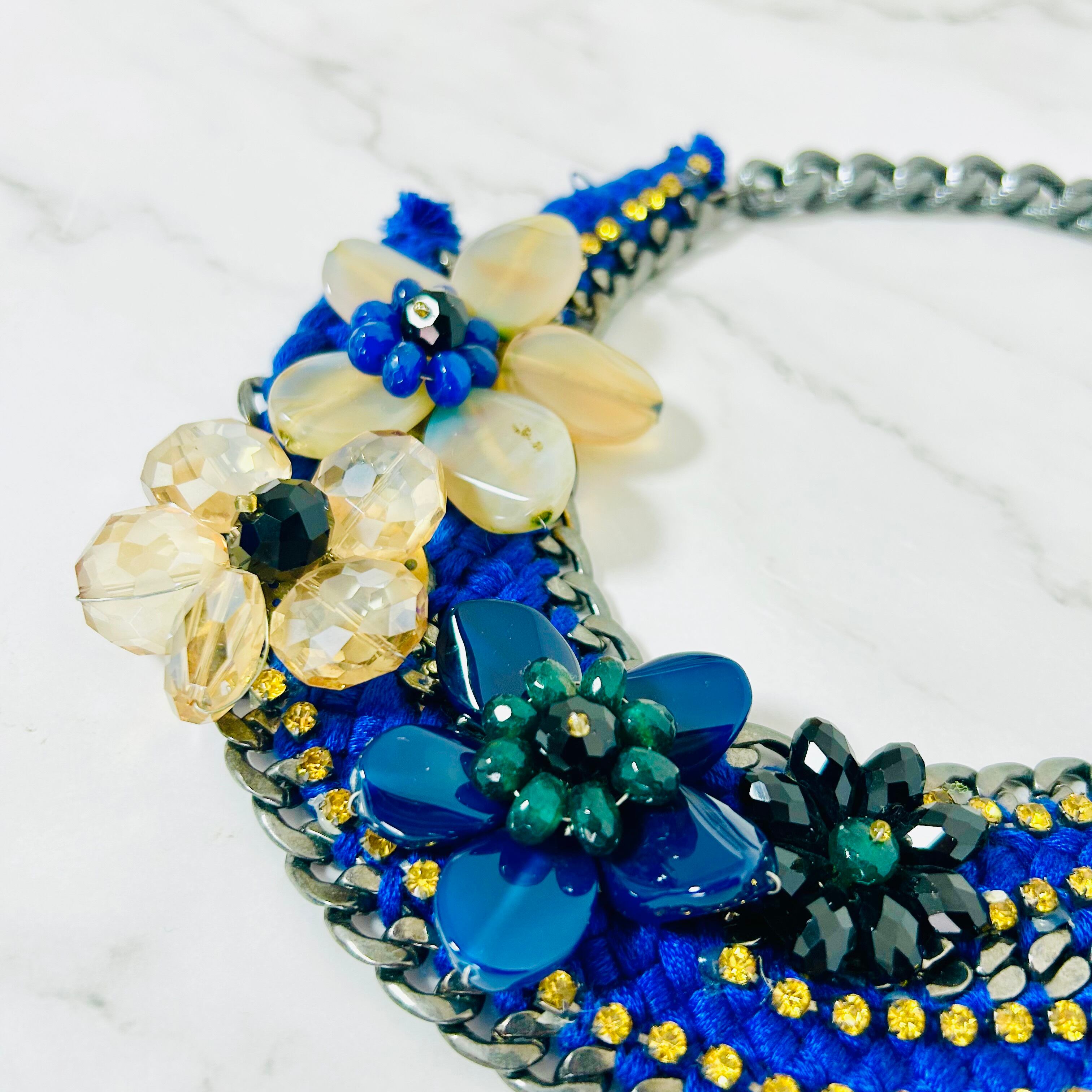 天然石やクリスタルパーツを使用したフラワーモチーフを、編み込まれたブルーのコードで繋ぎ、チャンキーチェーンにあしらった、手の凝ったデザインです。