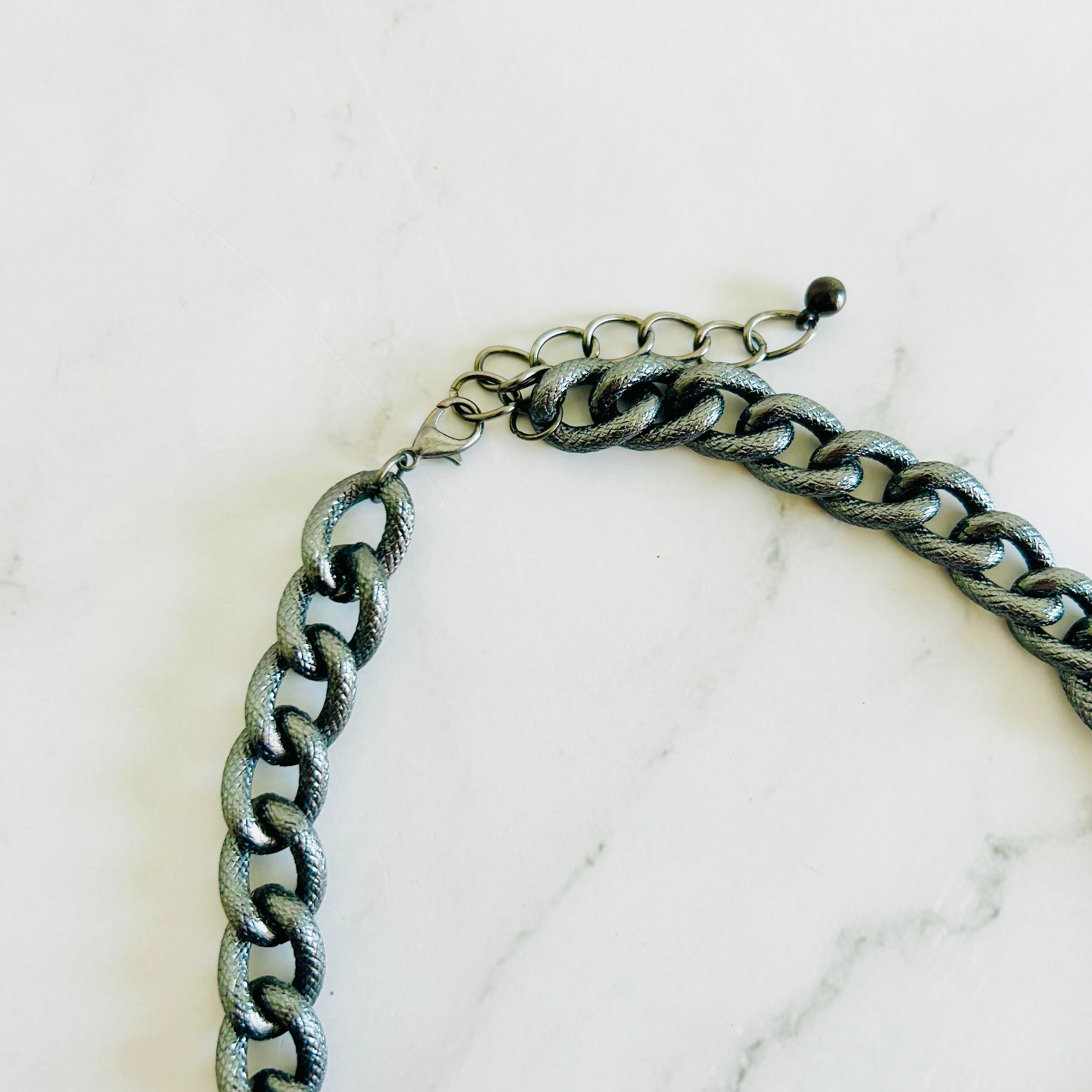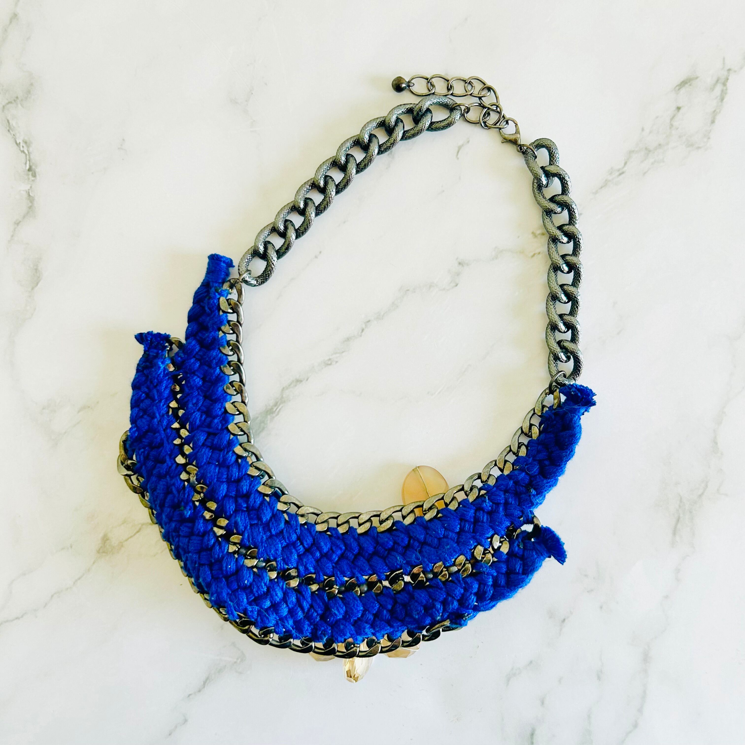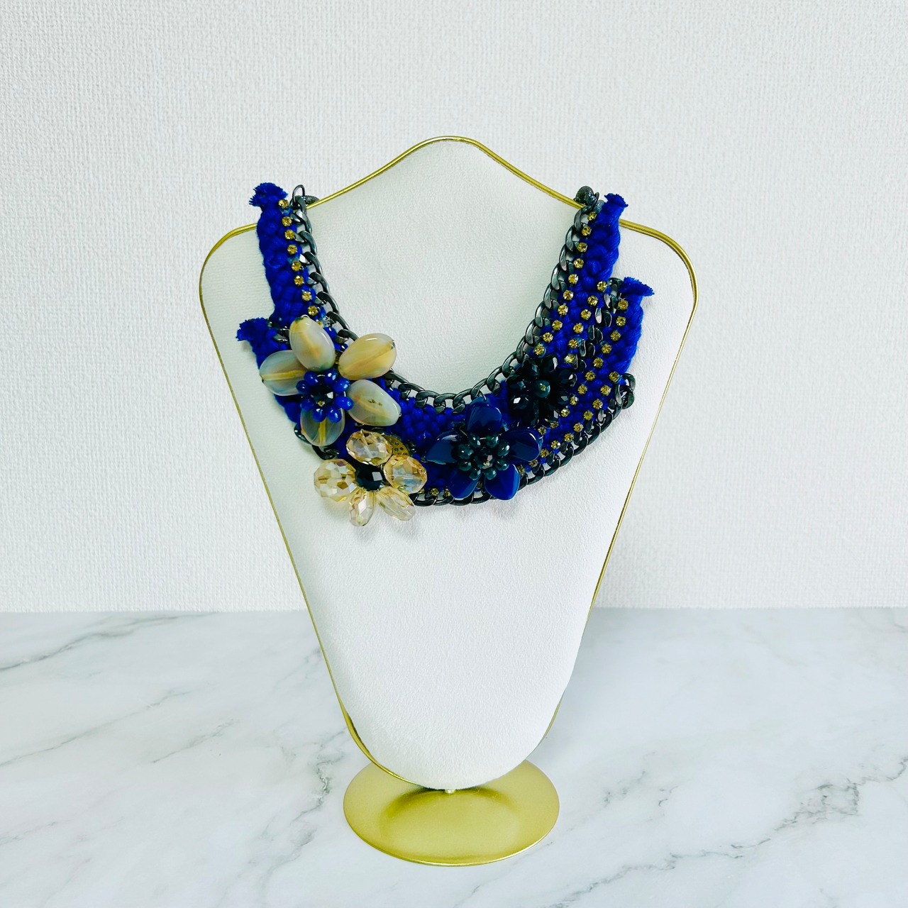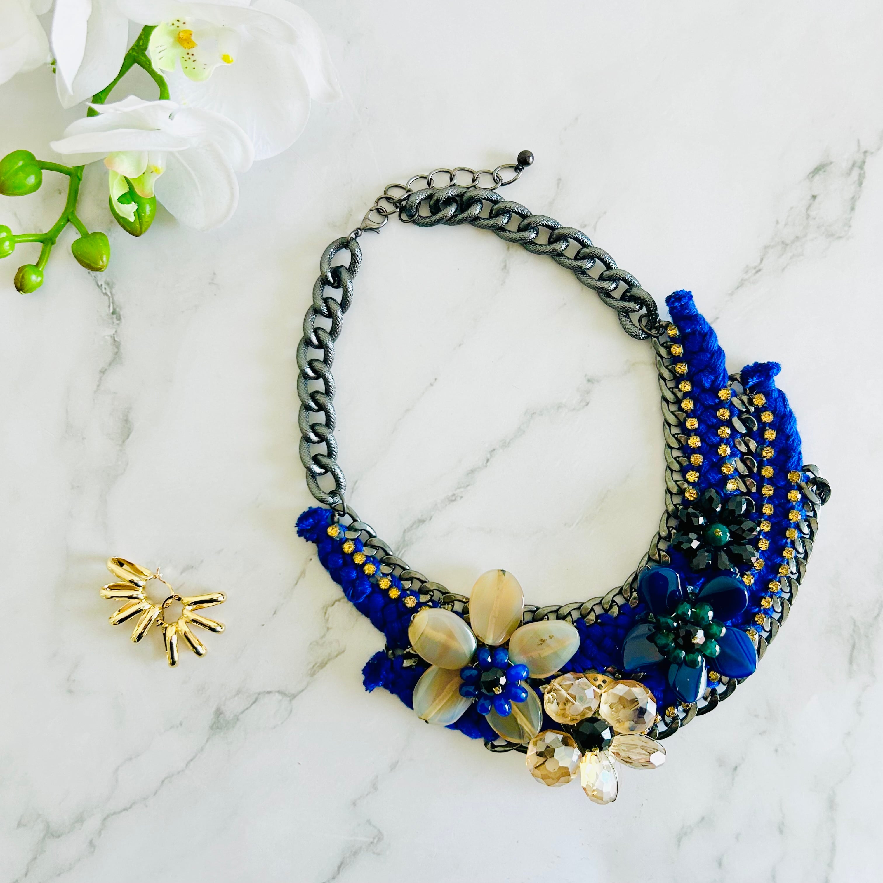 天然石やクリスタルパーツを使用したフラワーモチーフを、編み込まれたブルーのコードで繋ぎ、チャンキーチェーンにあしらった、手の凝ったデザインです。