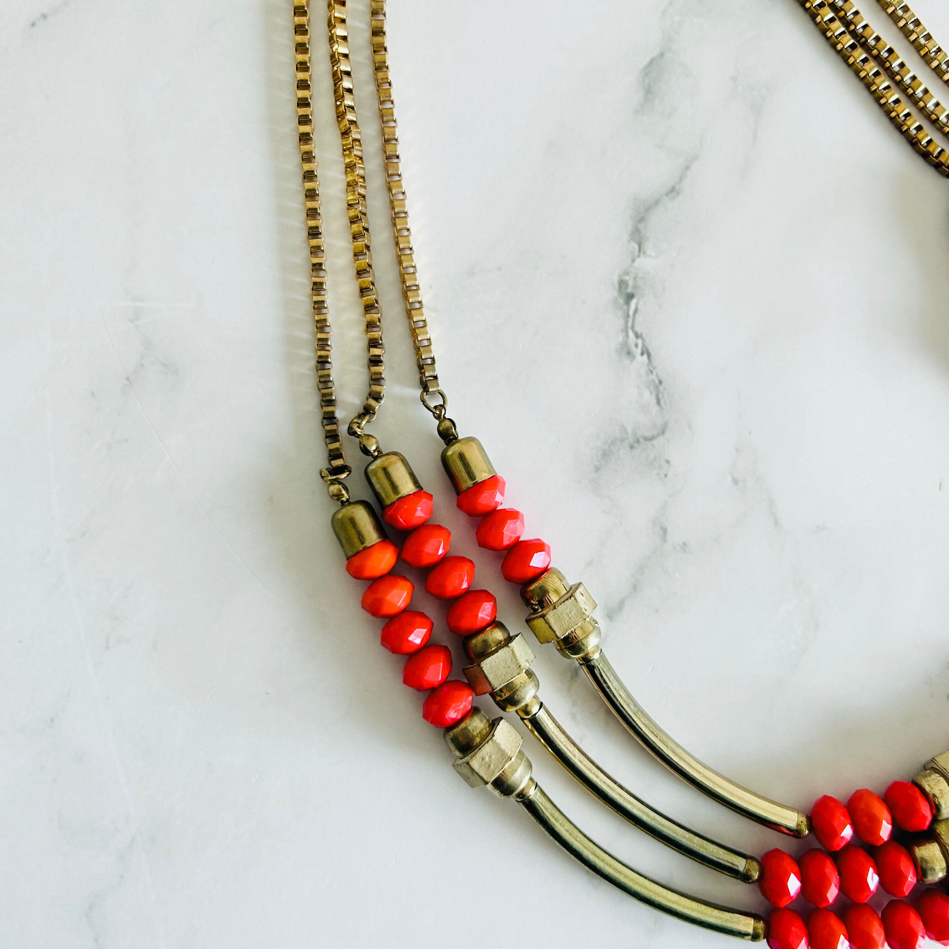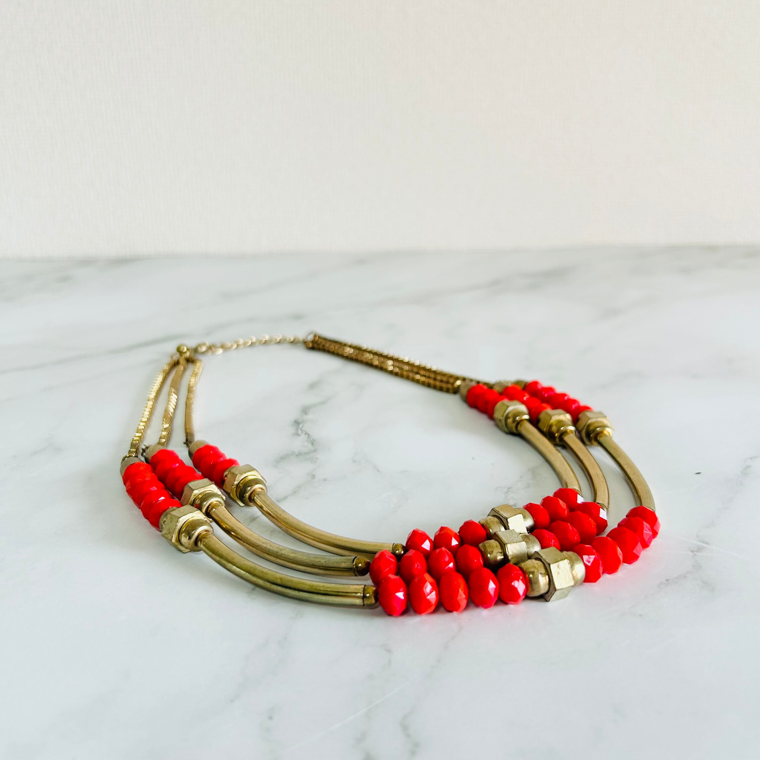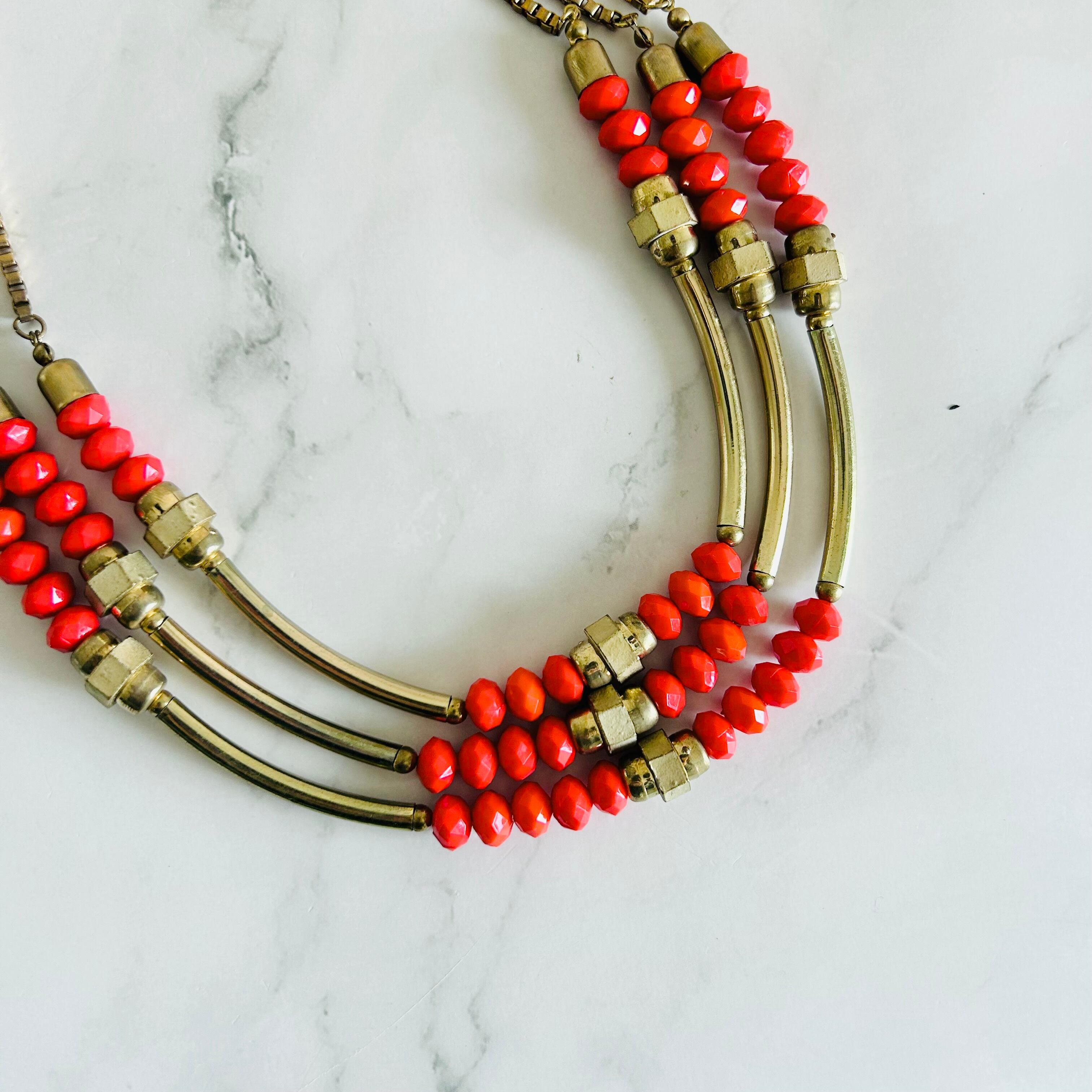 鮮やかなオレンジビーズとアンティークゴールドの組み合わせがとても印象的で、エネルギーを感じさせつつも上品にまとまったデザインが魅力のネックレスです。