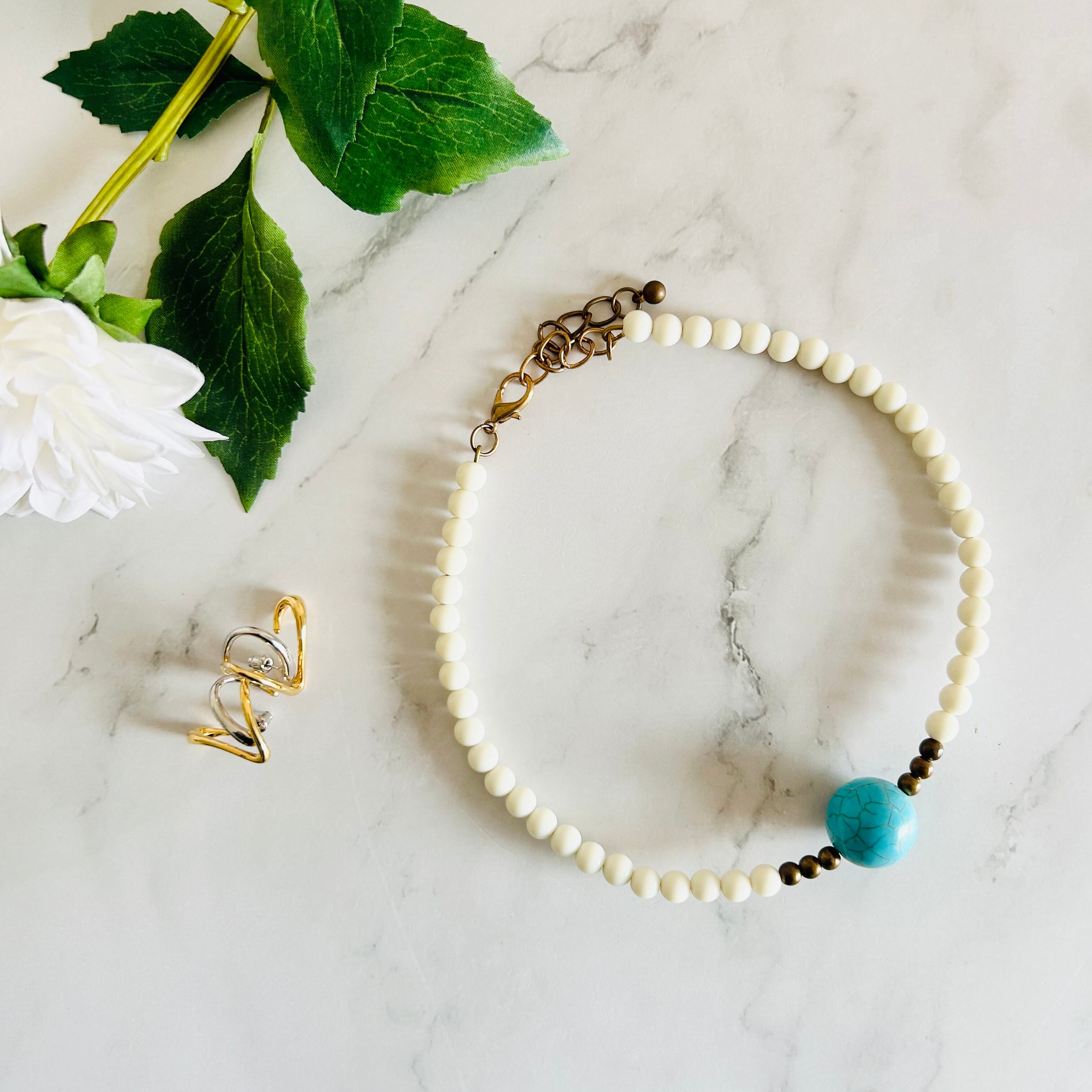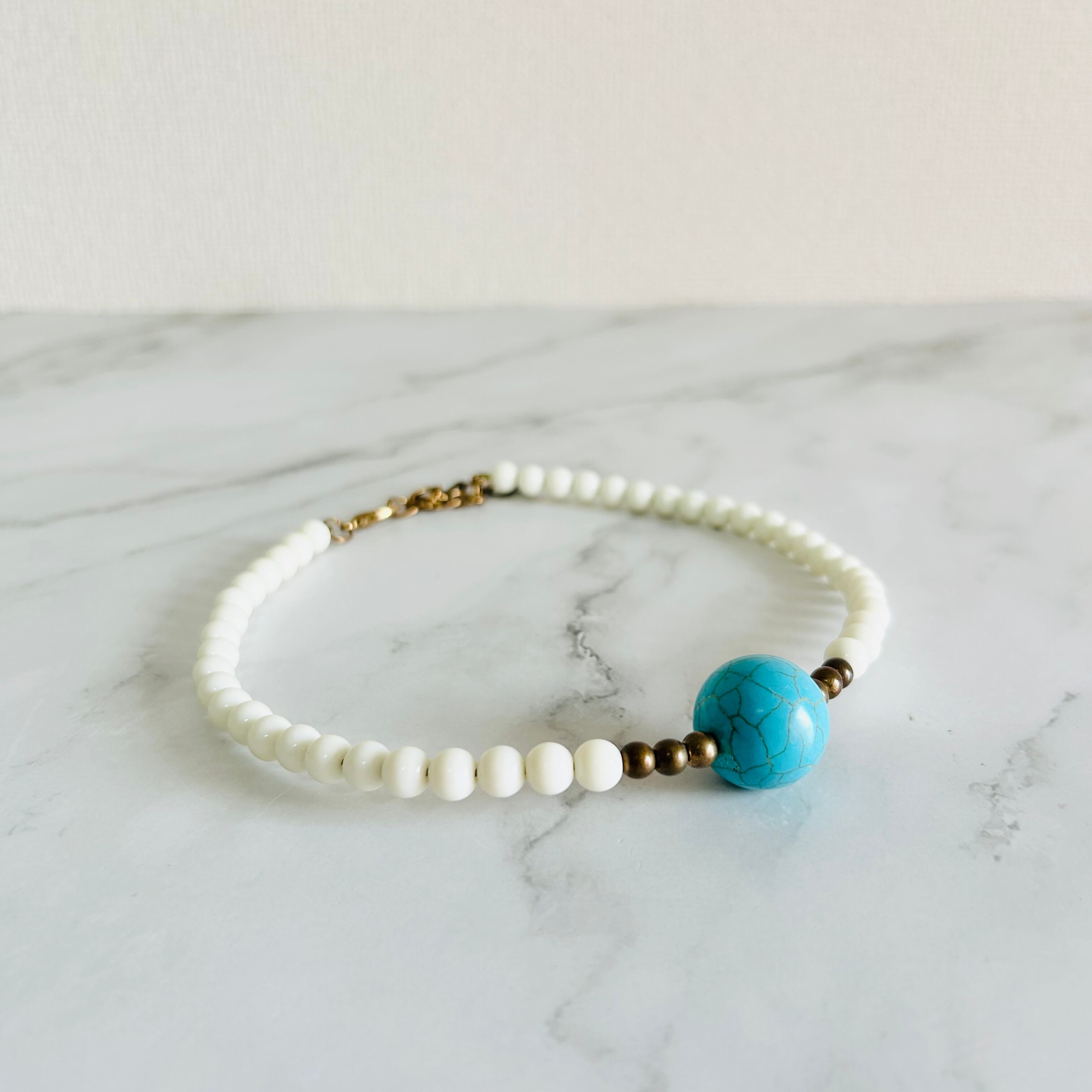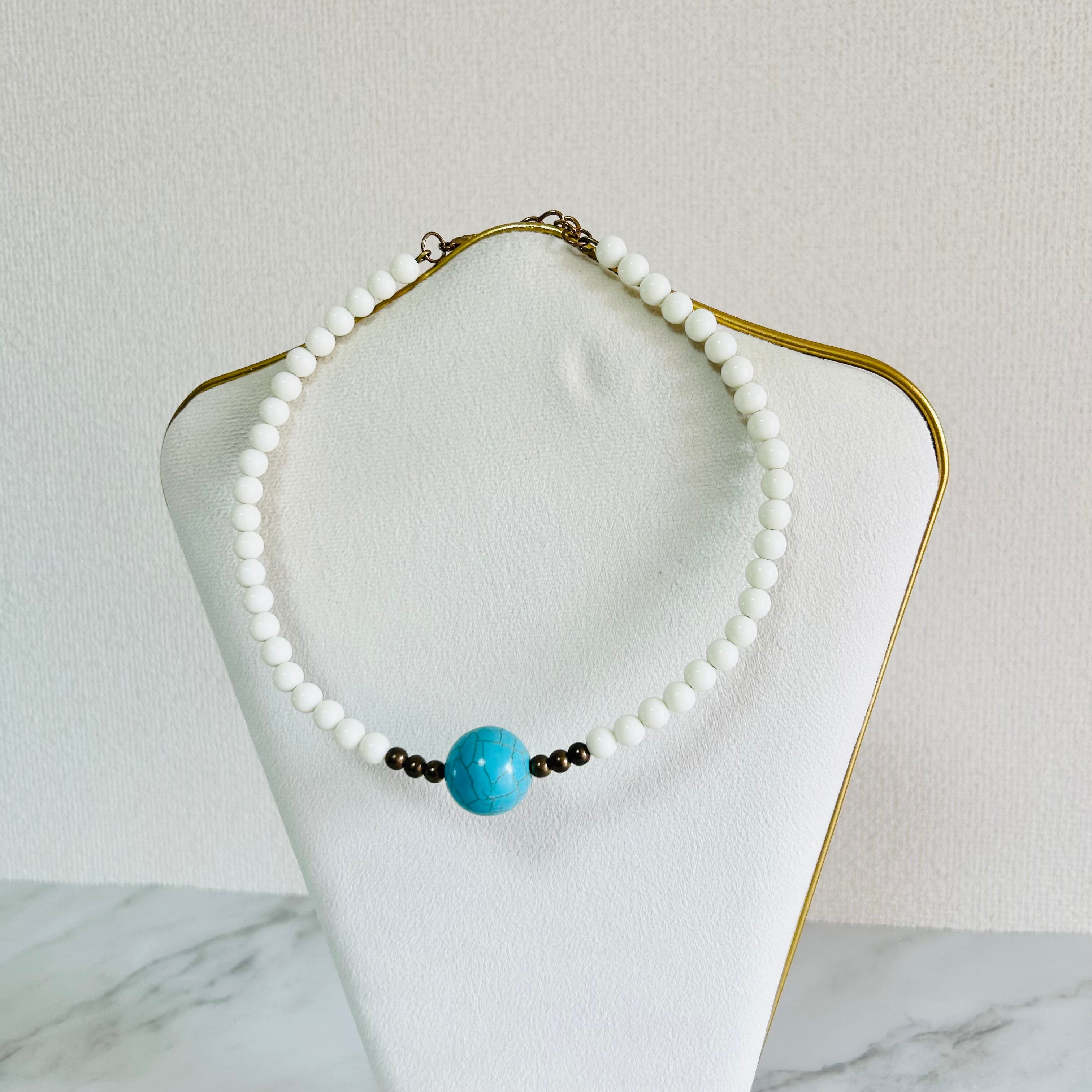 清涼感のあるホワイトビーズに、鮮やかなターコイズブルーがアクセントになった、シンプルなのに印象的で、夏の装いにもぴったりなチョーカーネックレスです。