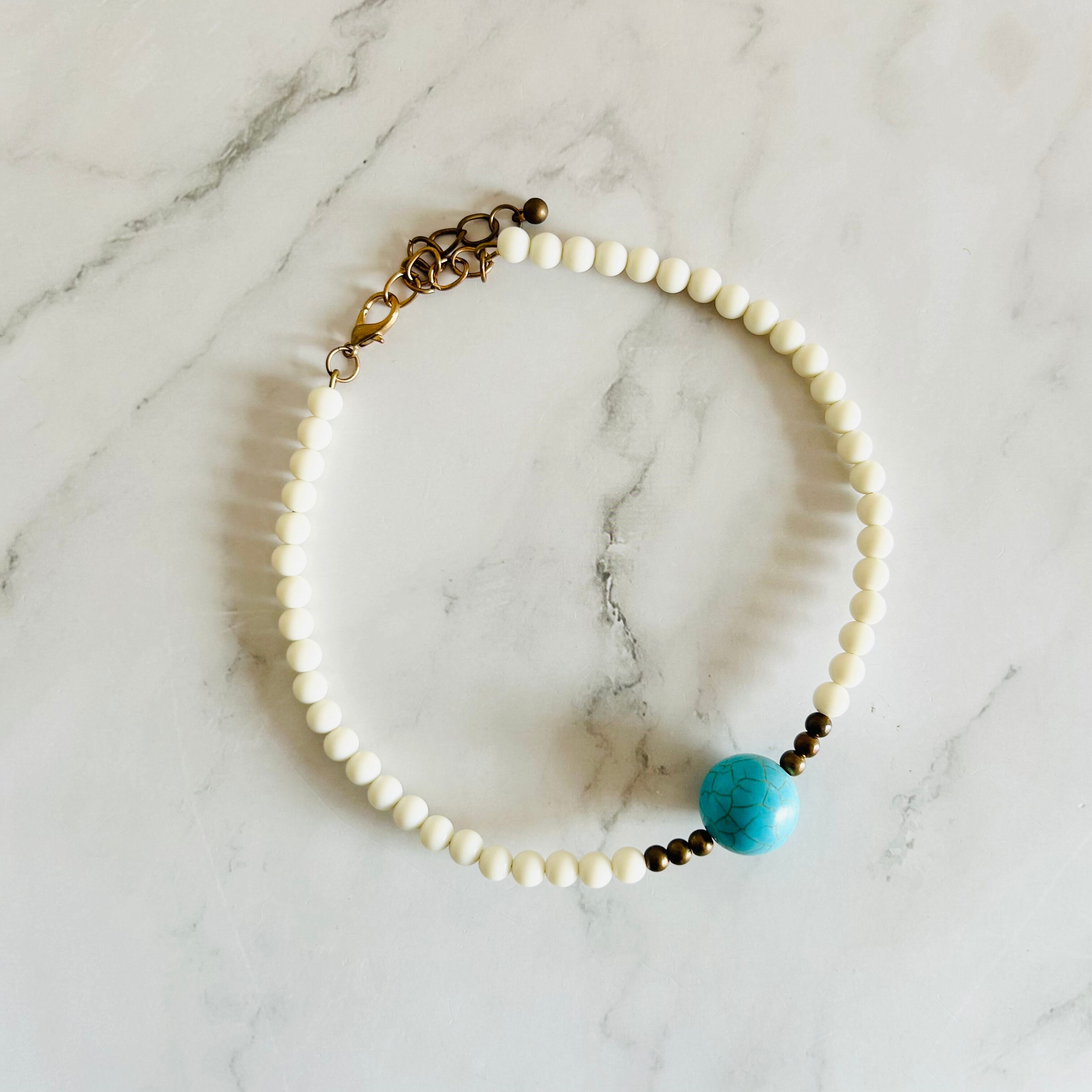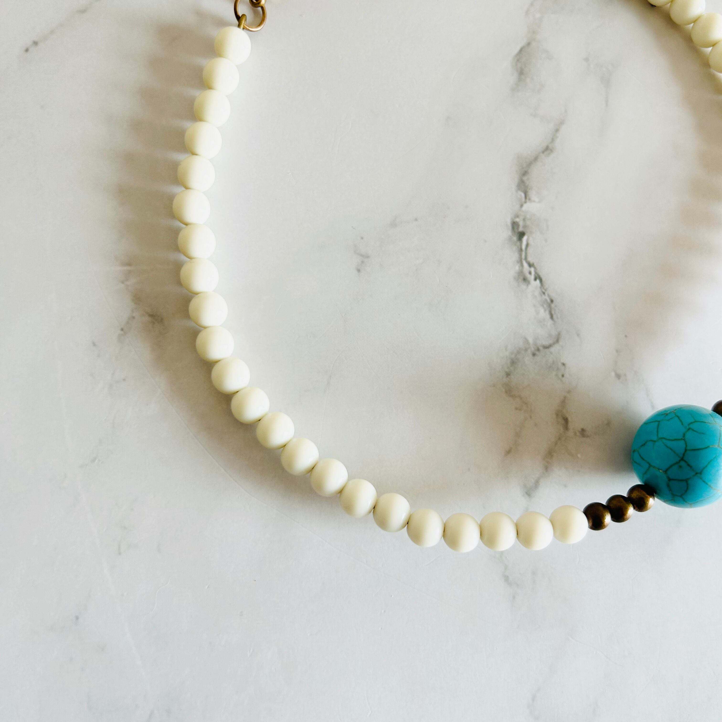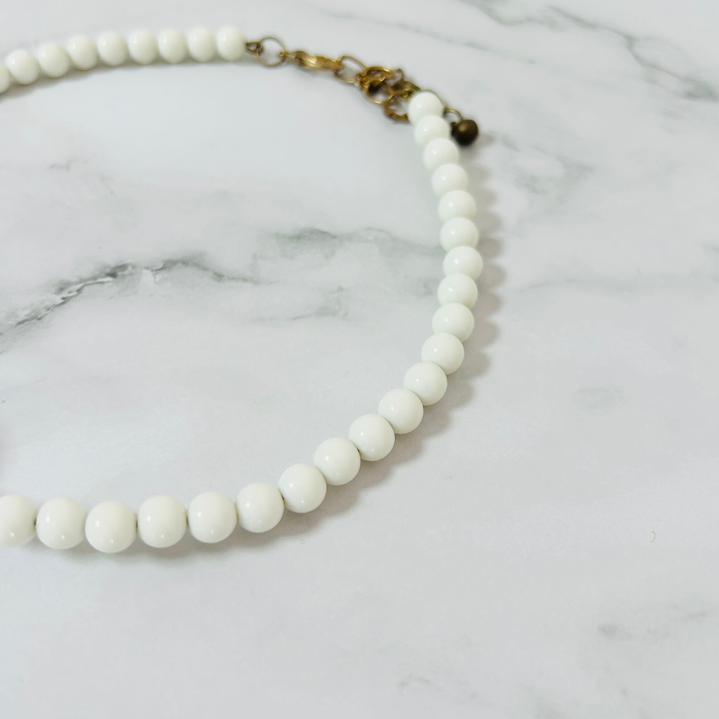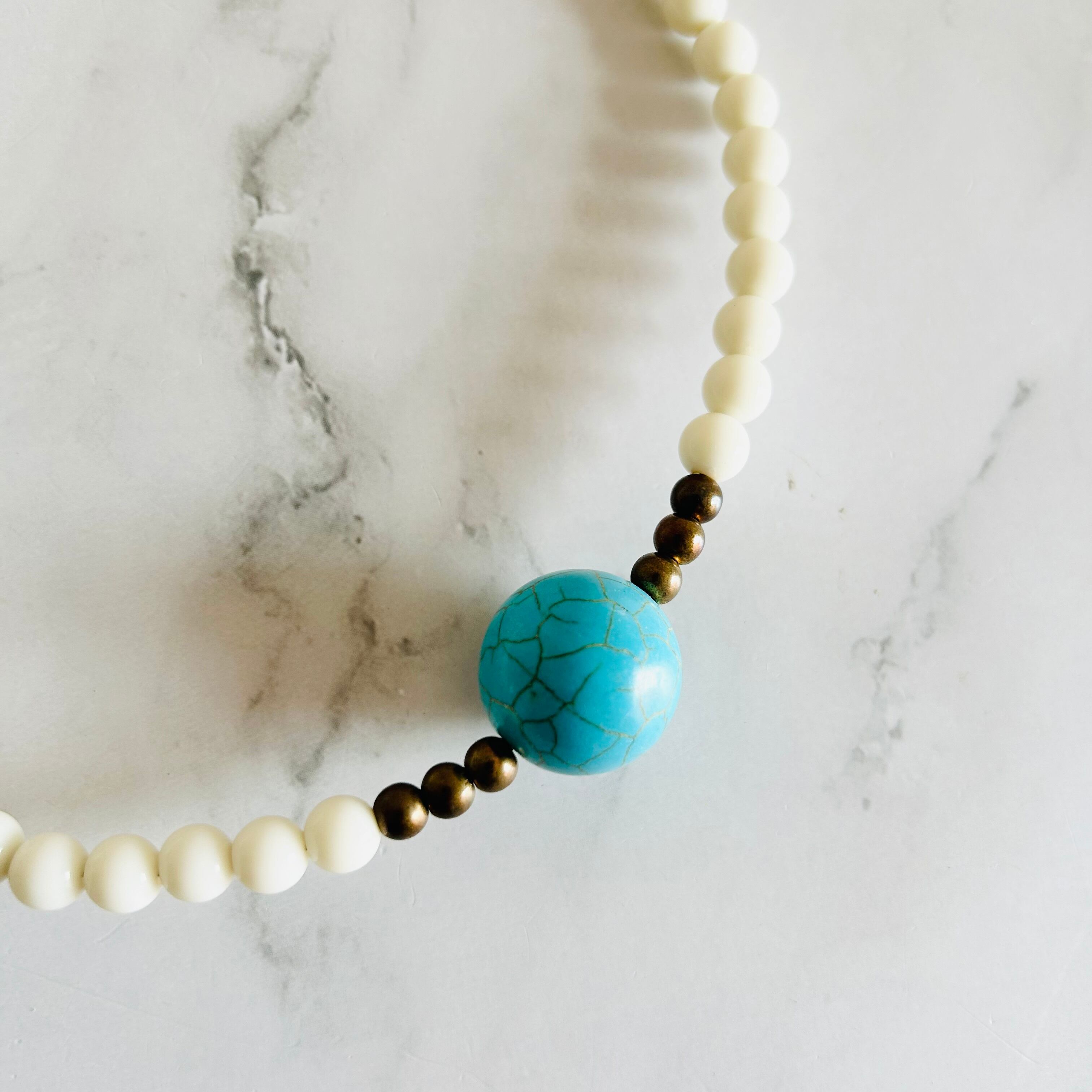 清涼感のあるホワイトビーズに、鮮やかなターコイズブルーがアクセントになった、シンプルなのに印象的で、夏の装いにもぴったりなチョーカーネックレスです。
