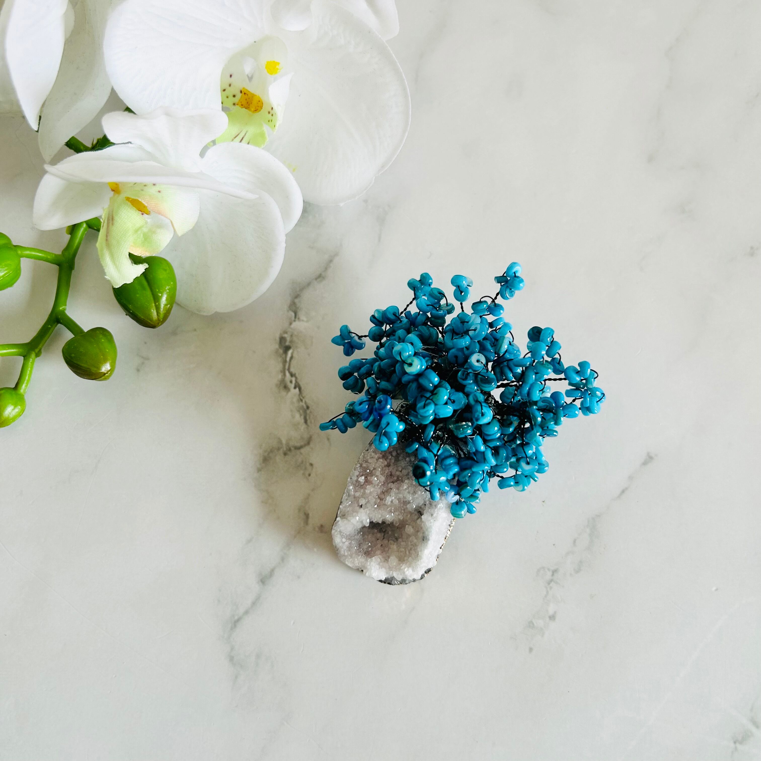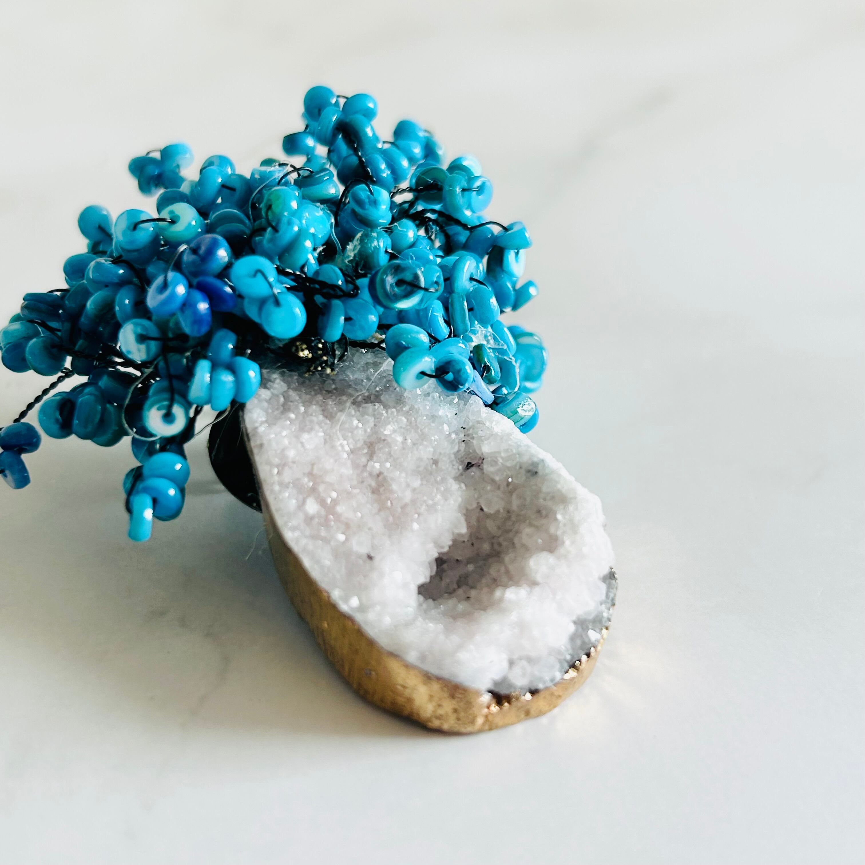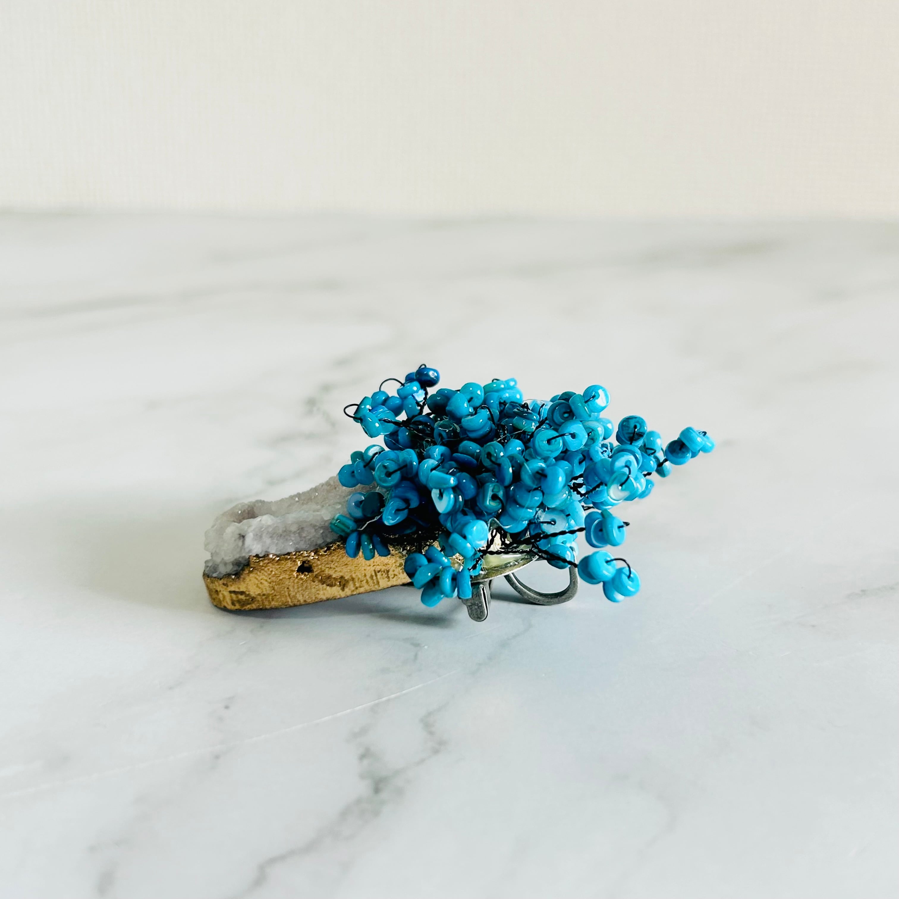 天然石の結晶がまるで小さな鉱山のように美しく、ターコイズブルーのシェルビーズがふんわりと花咲くように広がる、アート性の高いブローチです。