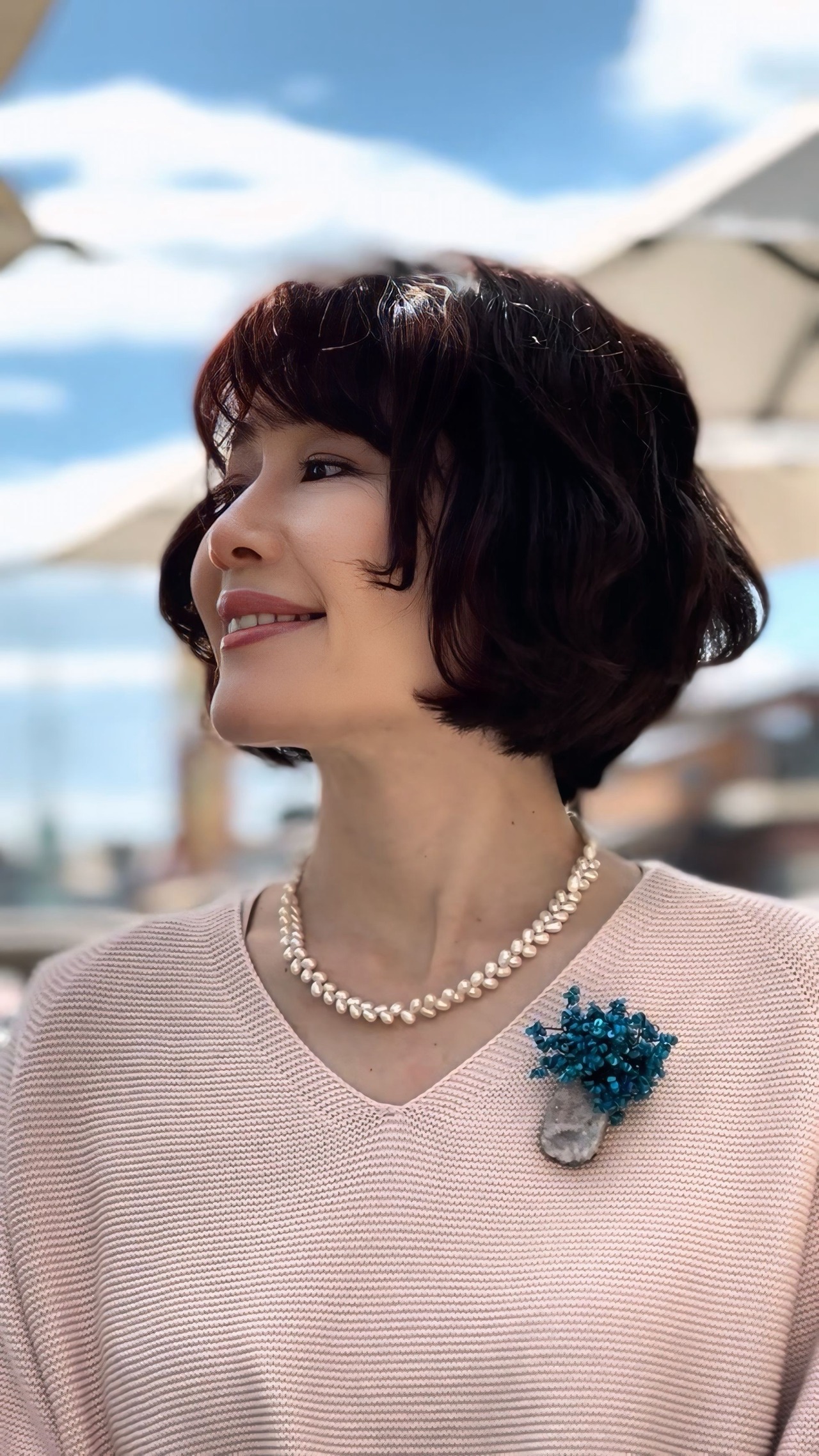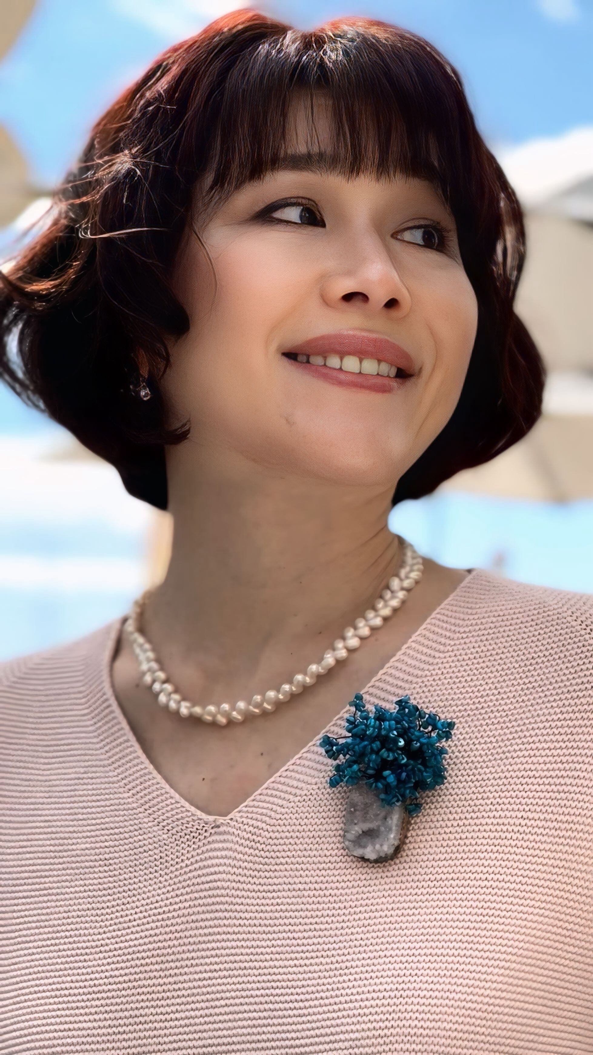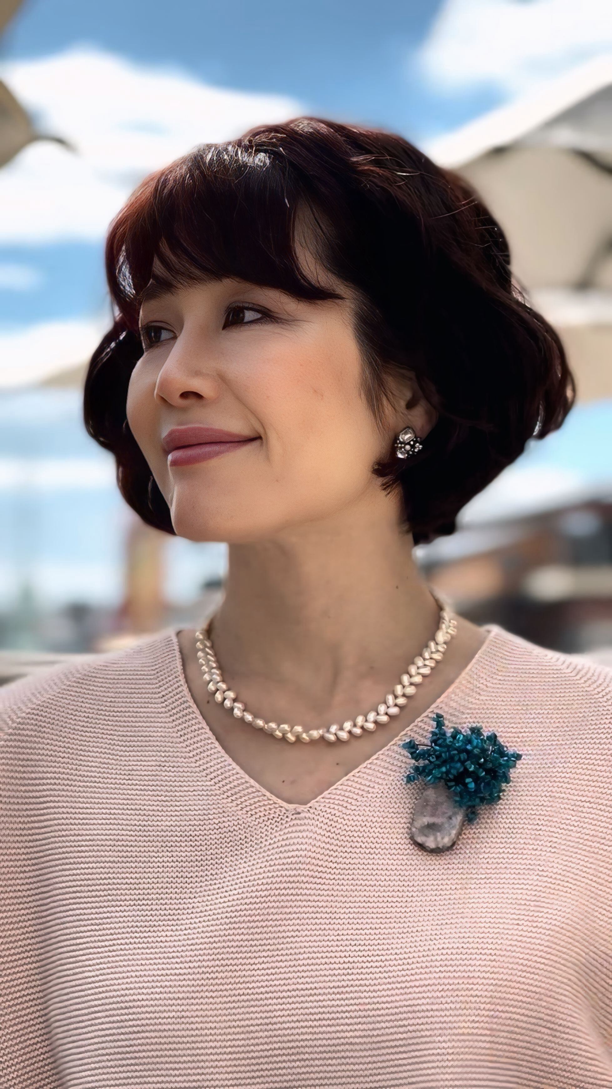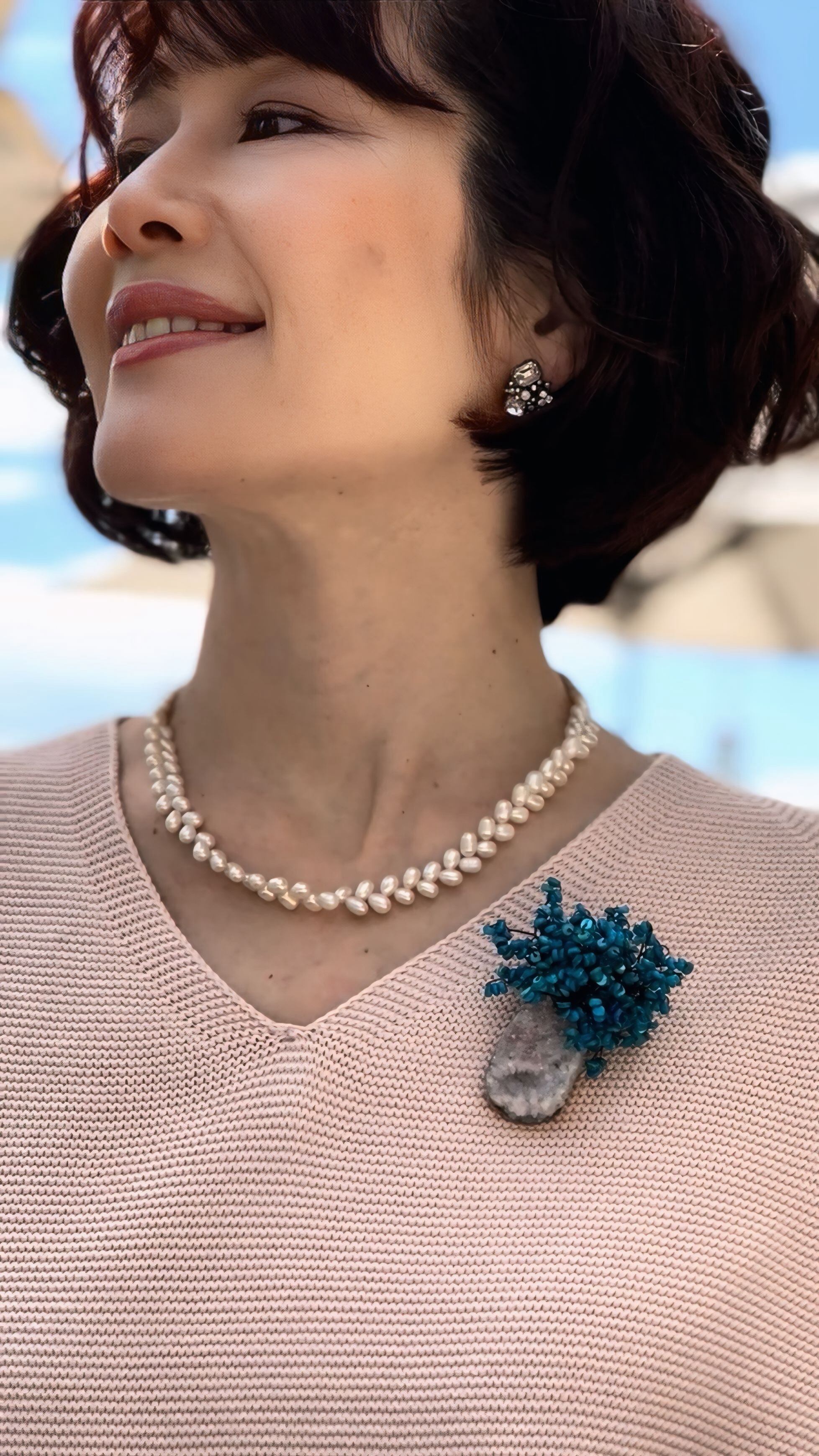 天然石の持つ神秘的な輝きと、ターコイズカラーのシェルビーズが繊細に絡み合う、唯一無二のブローチ☆