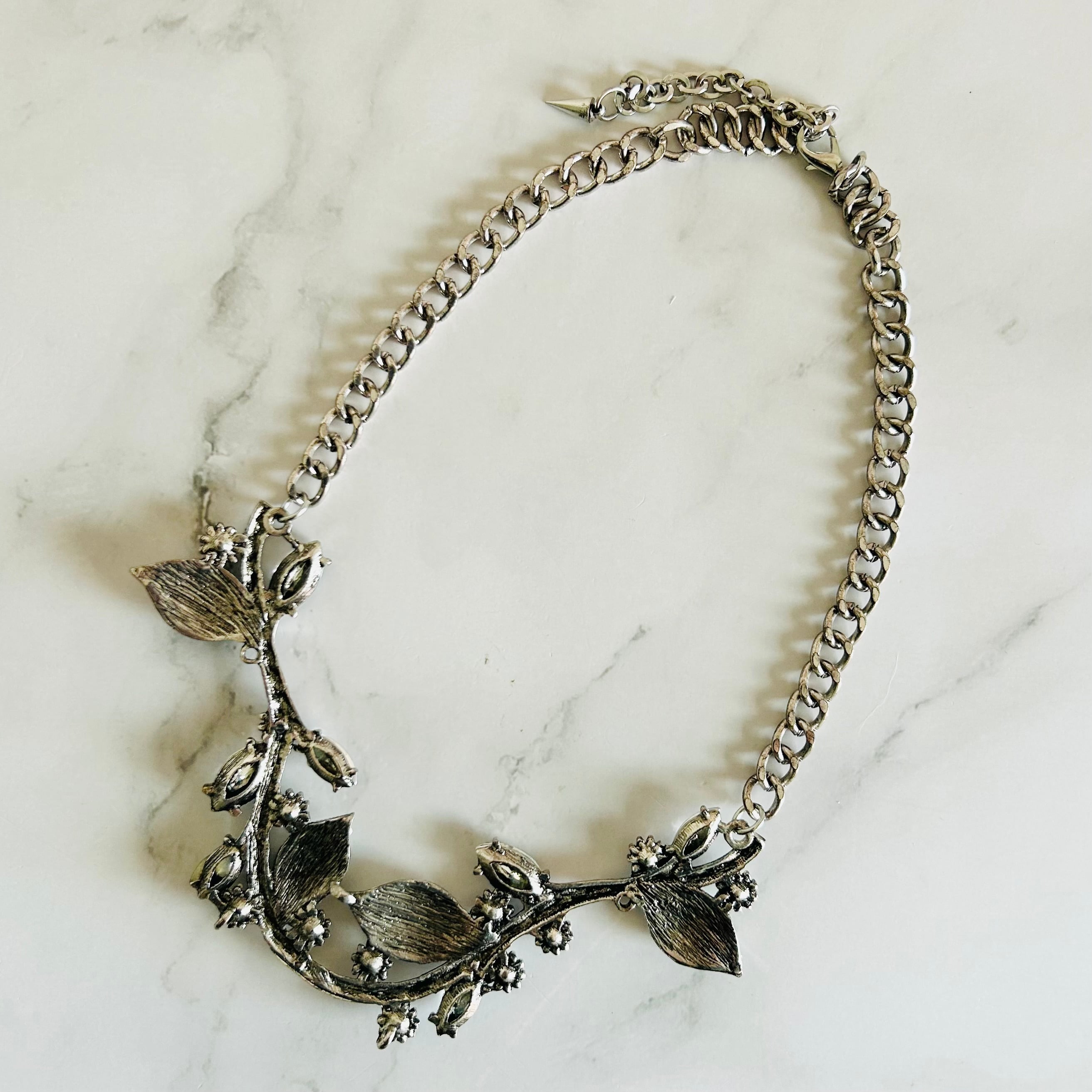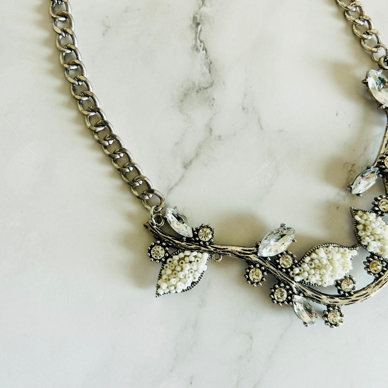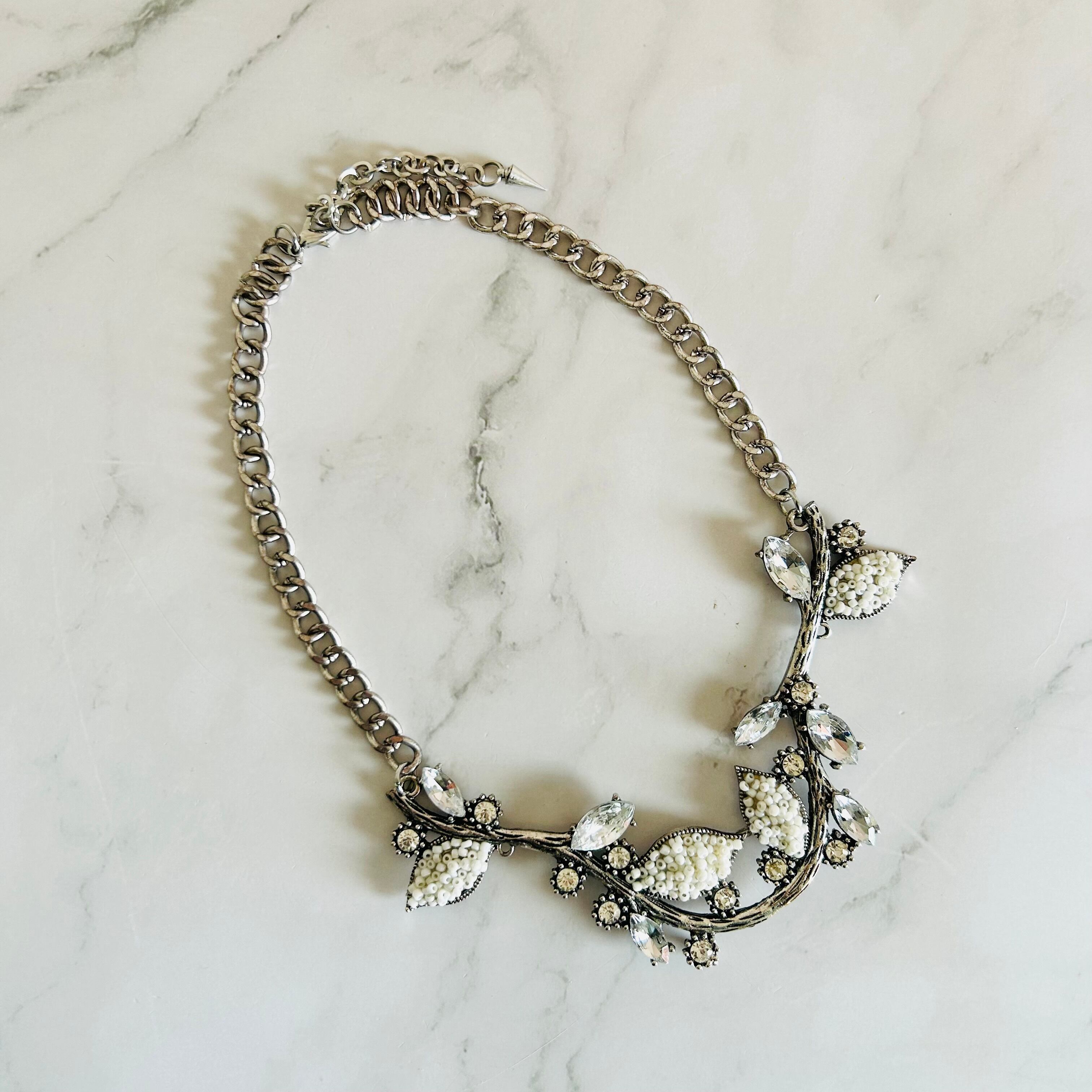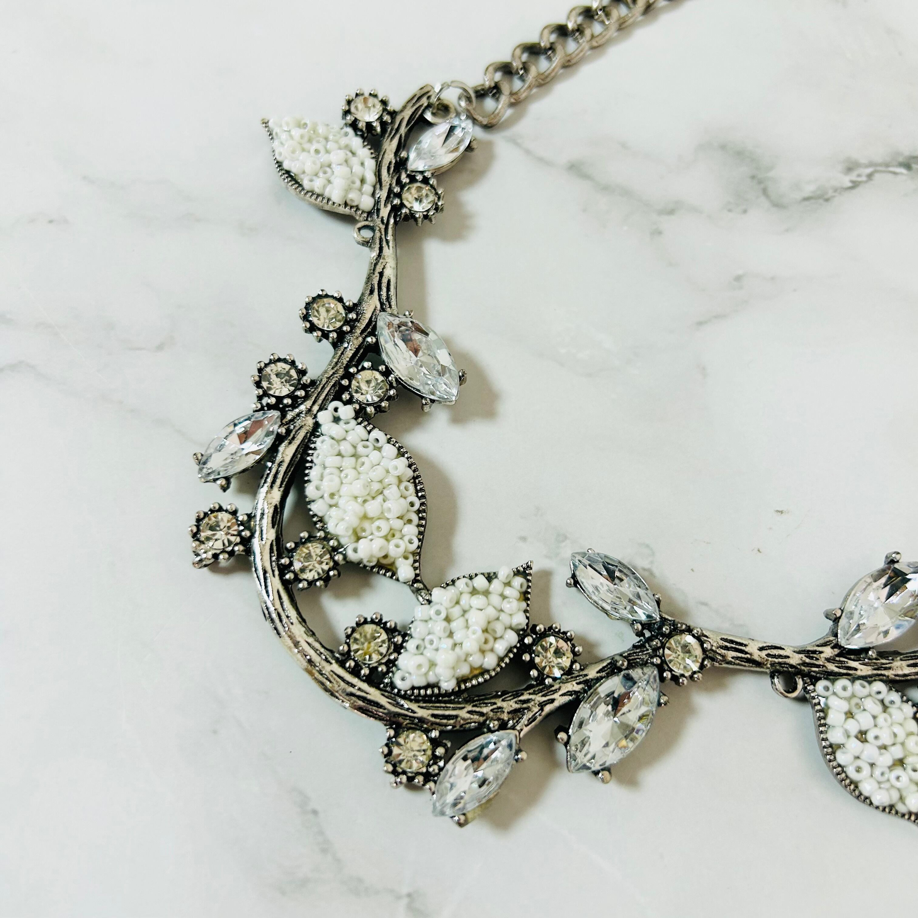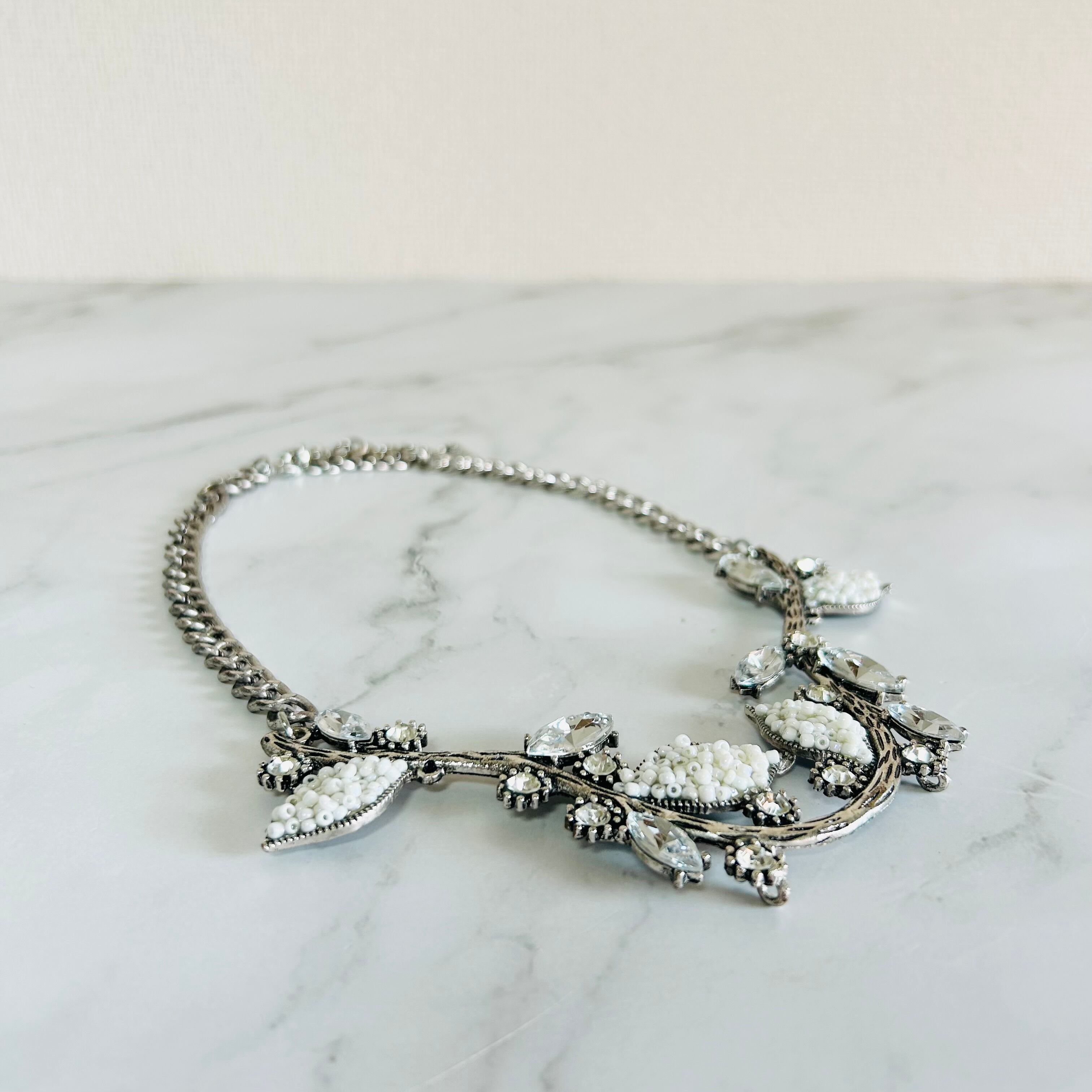 繊細なリーフモチーフとビジューのきらめきが美しく調和し、まるで自然の中の一瞬を閉じ込めたような、ロマンティックで上品な佇まいを感じさせるネックレスです。