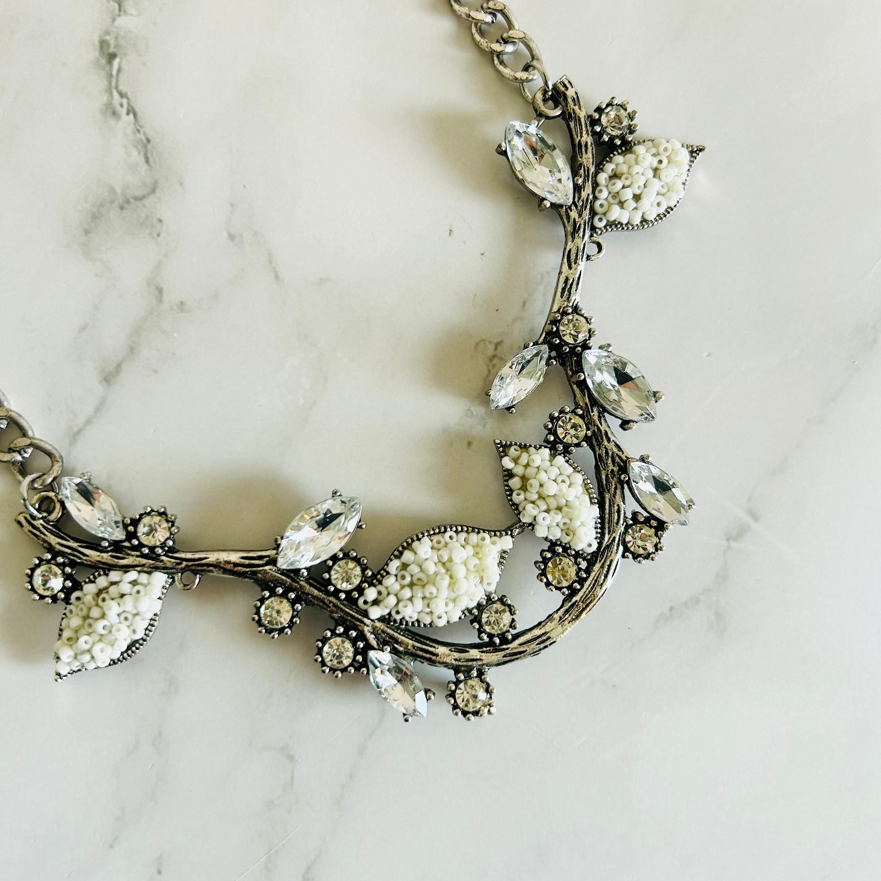 静かな輝きをたたえた小枝のデザインに、きらりと光を集めるビジューと繊細なホワイトビーズの装飾。