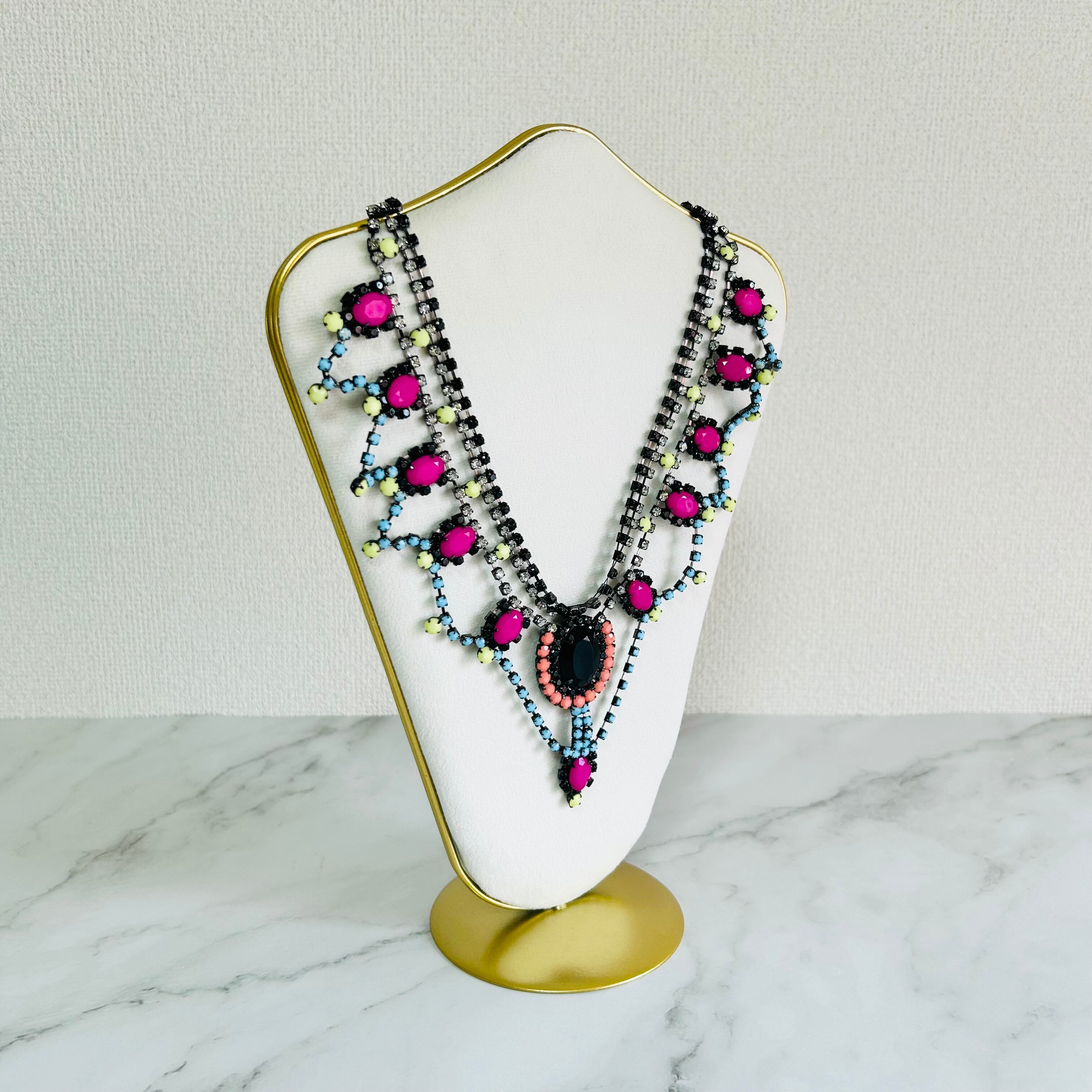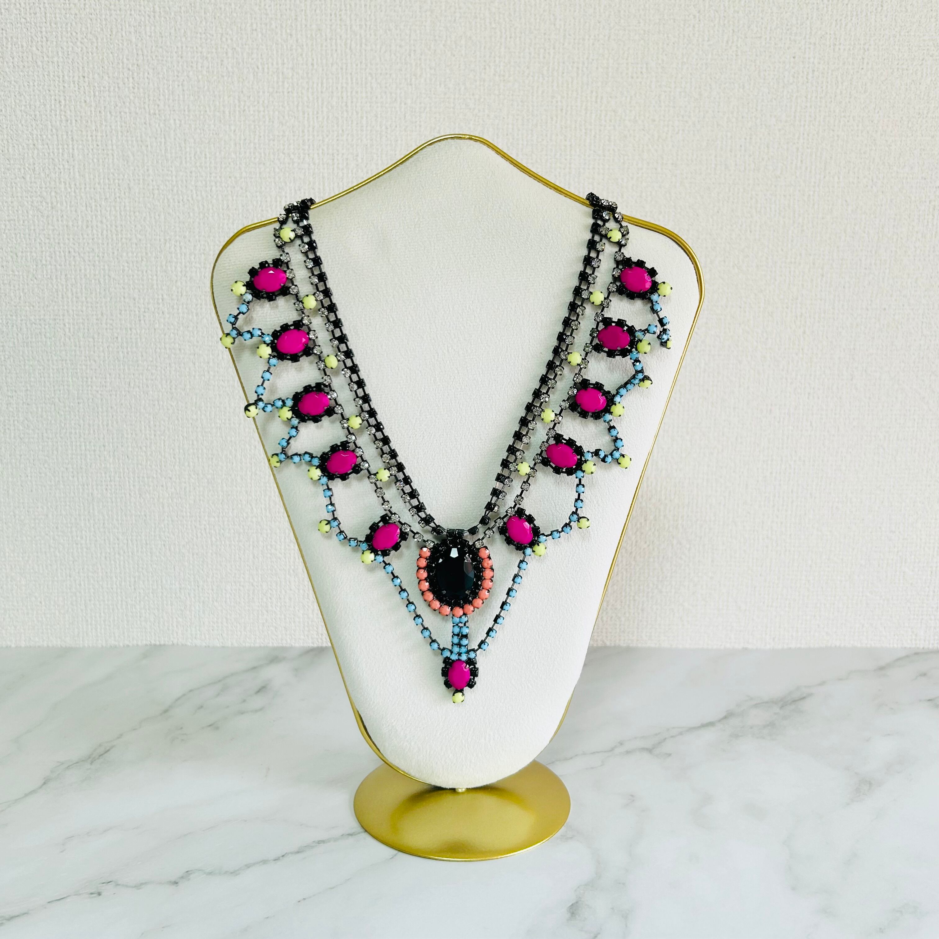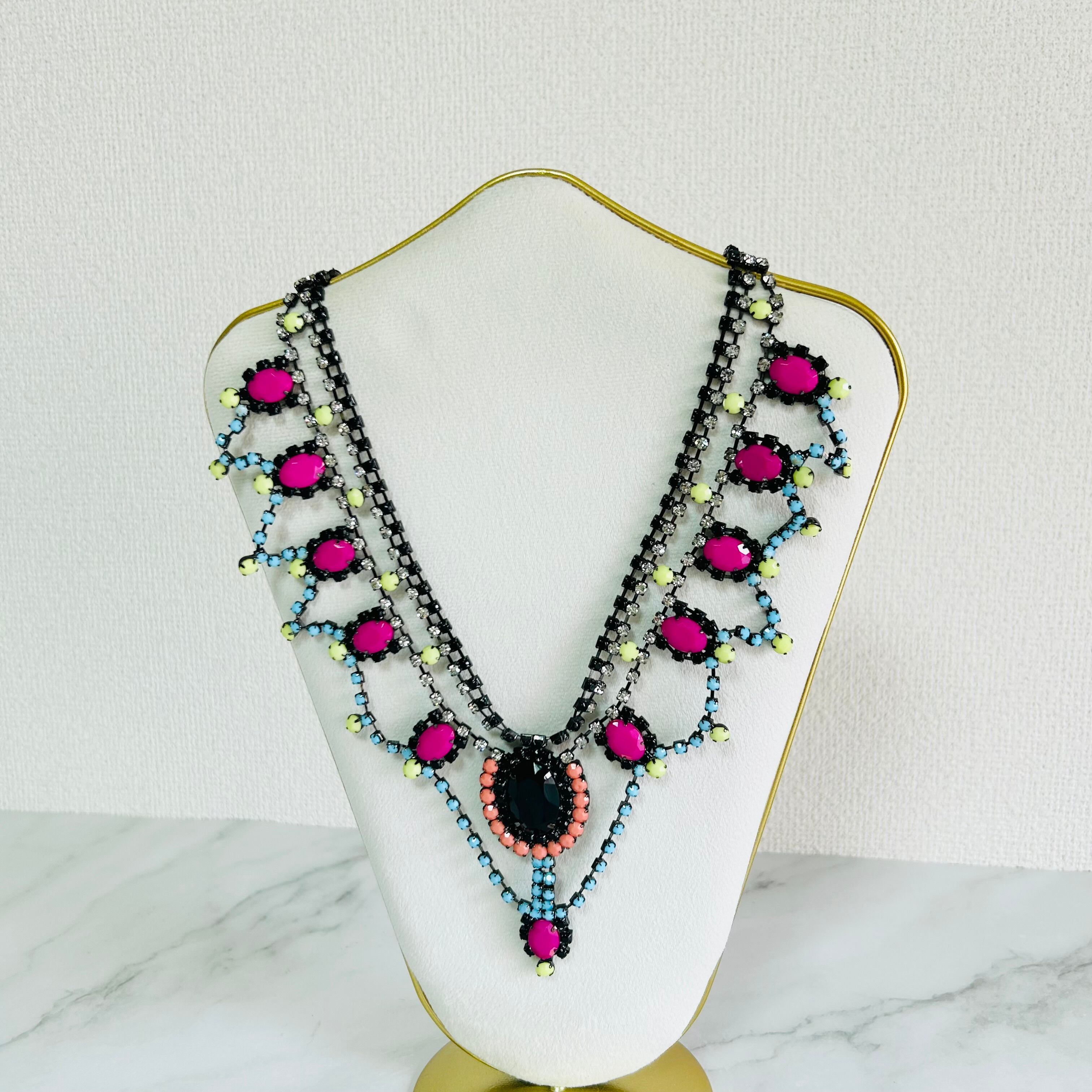ビビッドなピンクやイエロー、ブルーのアクリルビジューが繊細に連なり、まるでアートピースのようなインパクトと美しさを兼ね備えたデザインです。
