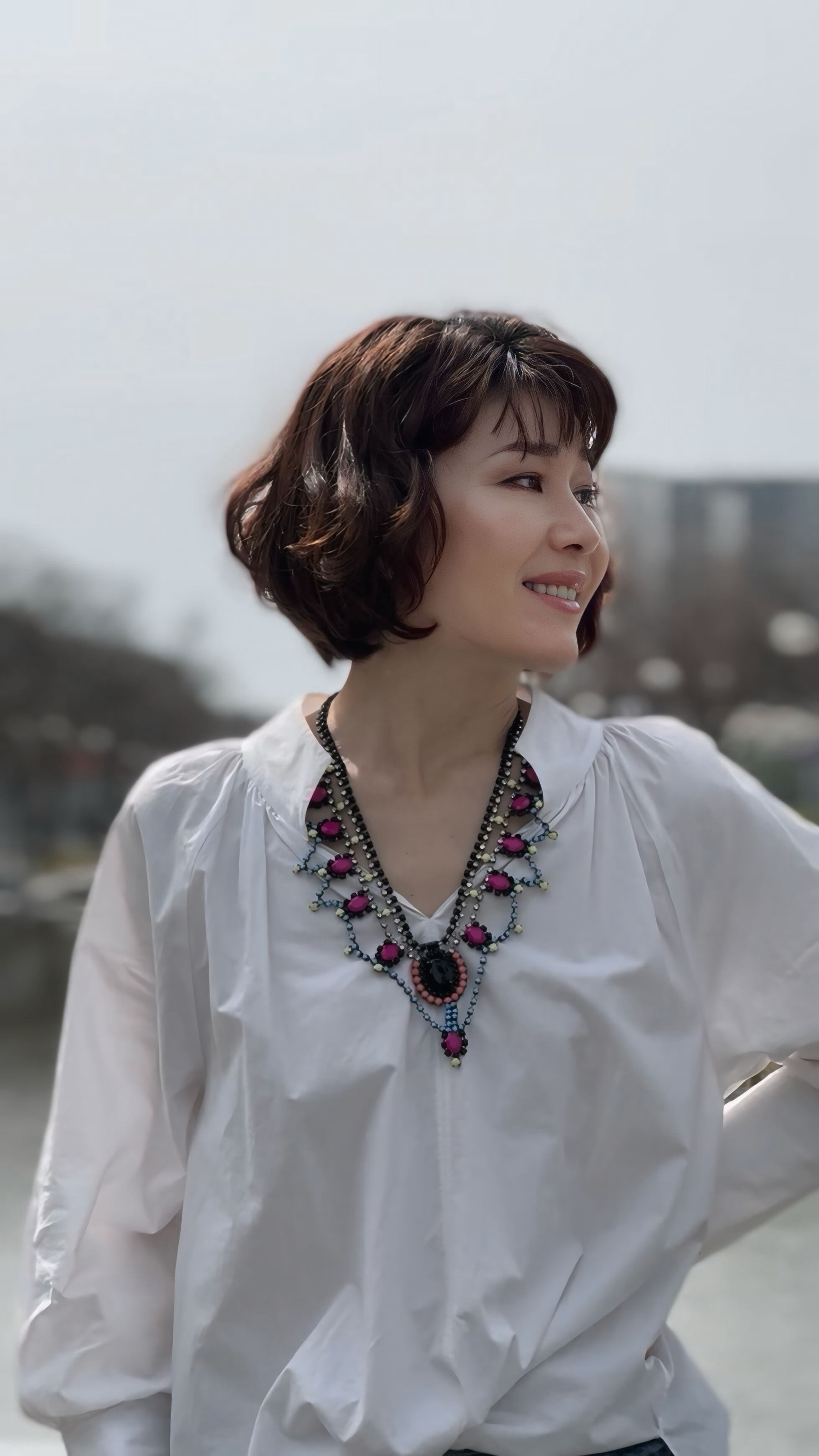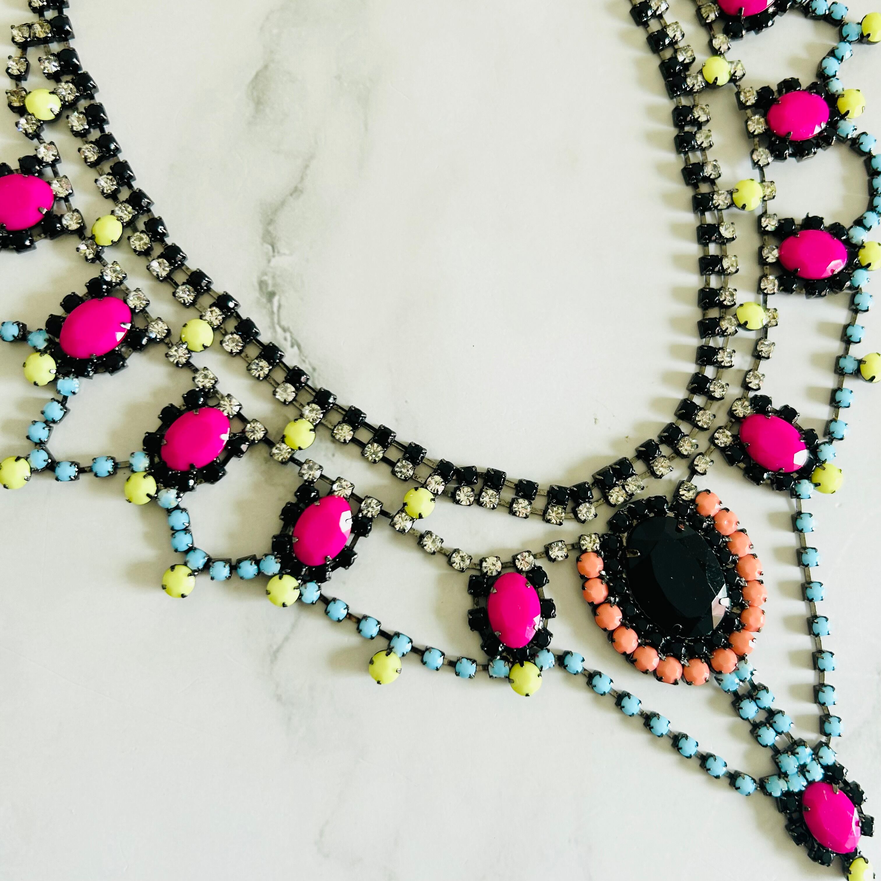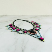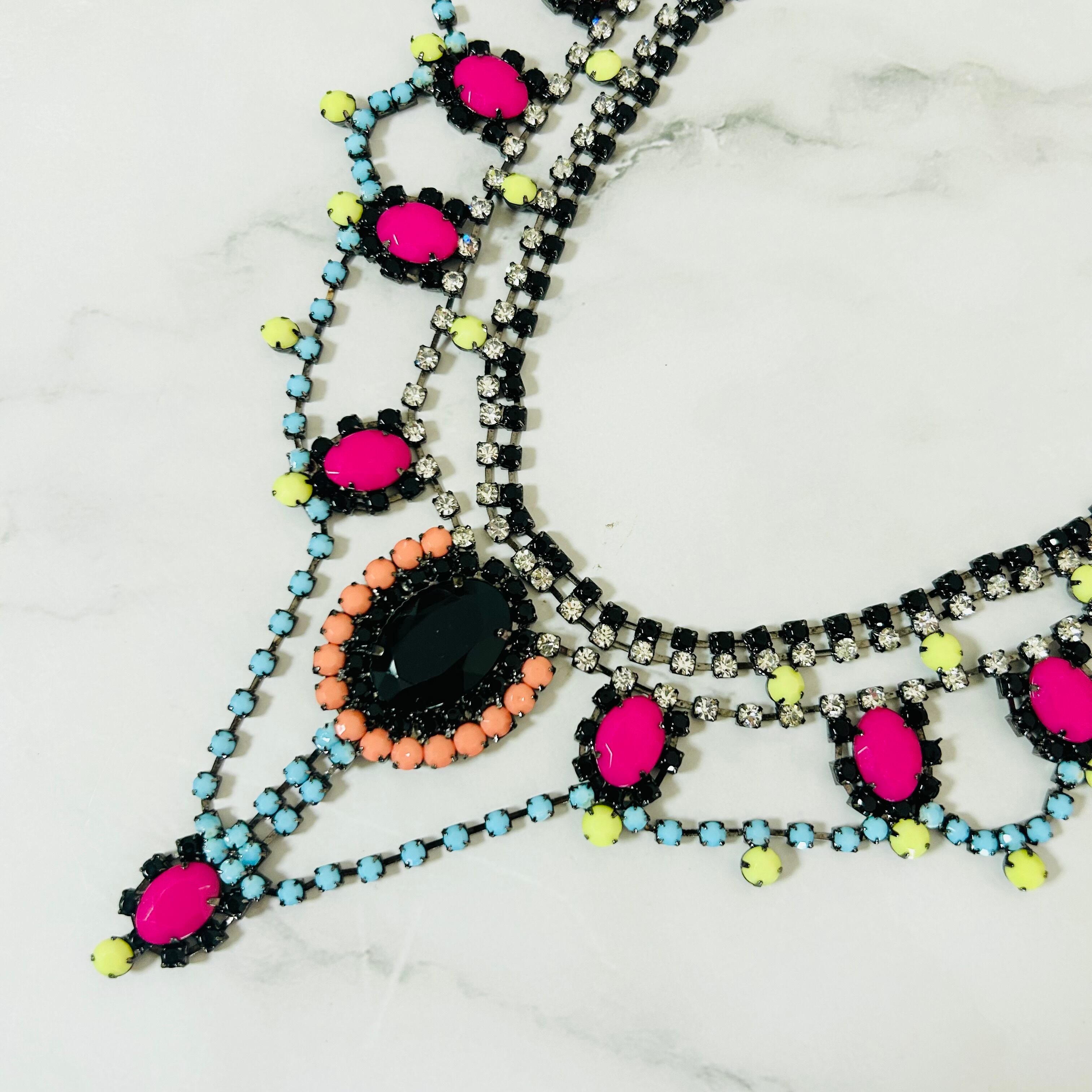 ビビッドなピンクやイエロー、ブルーのアクリルビジューが繊細に連なり、まるでアートピースのようなインパクトと美しさを兼ね備えたデザインです。