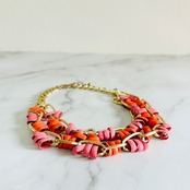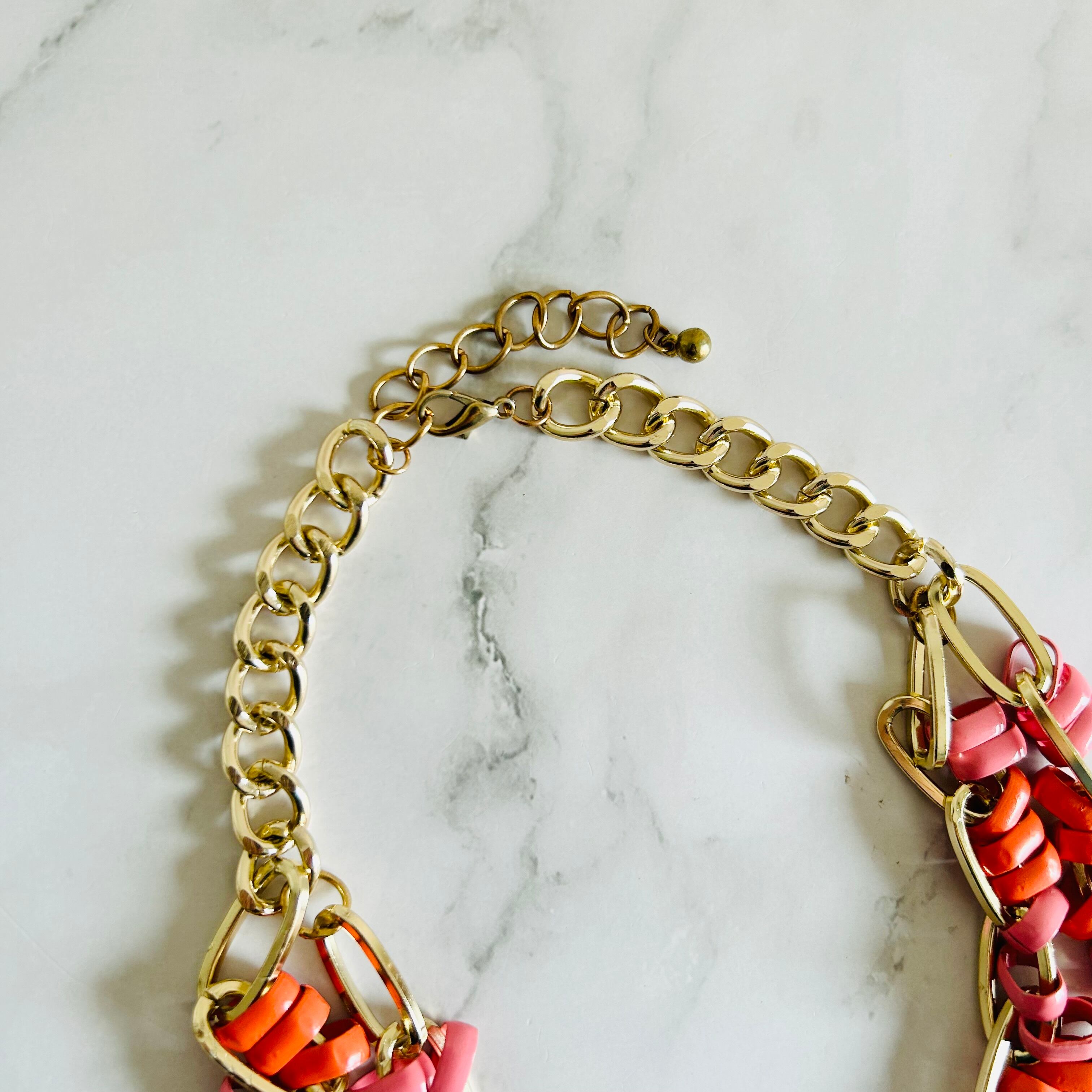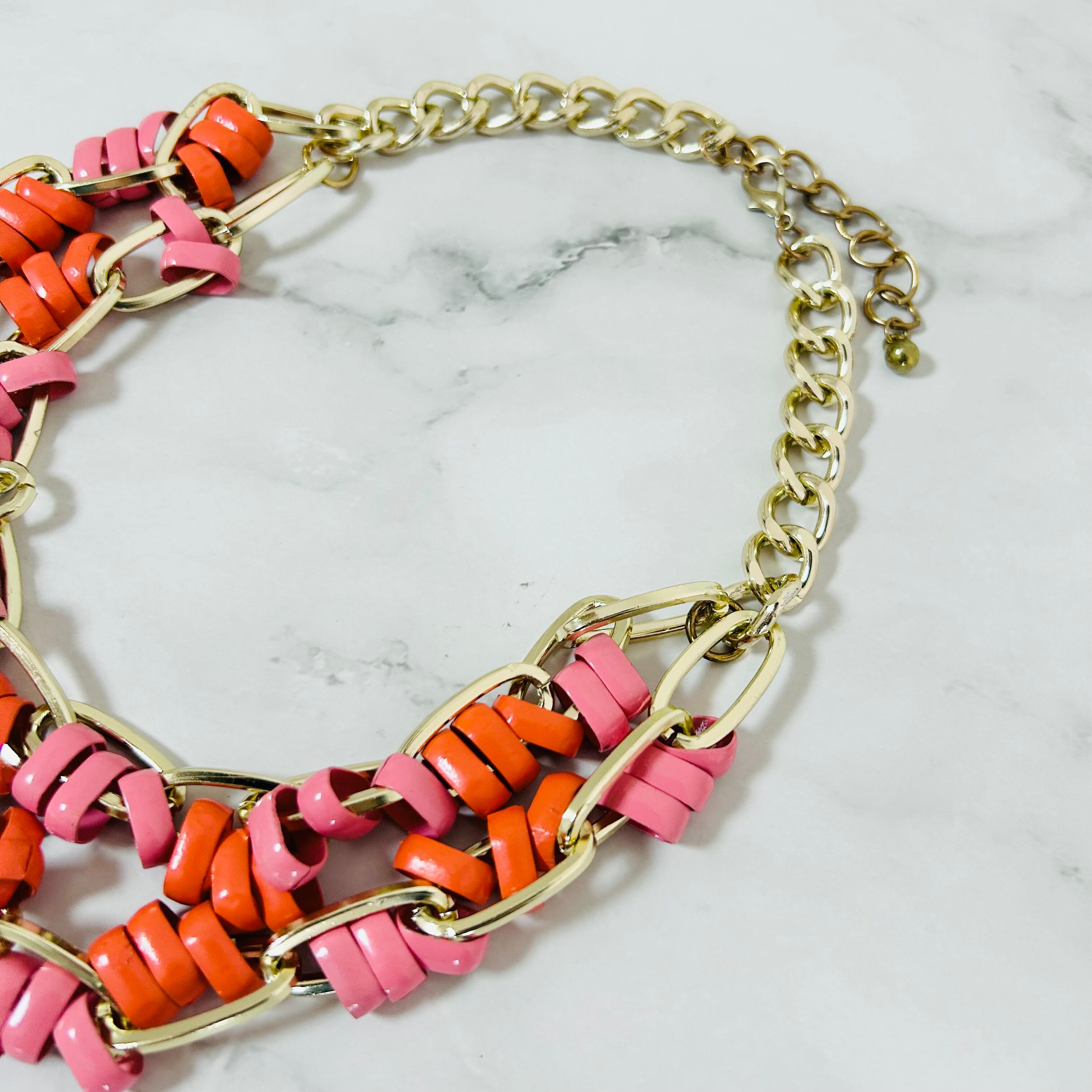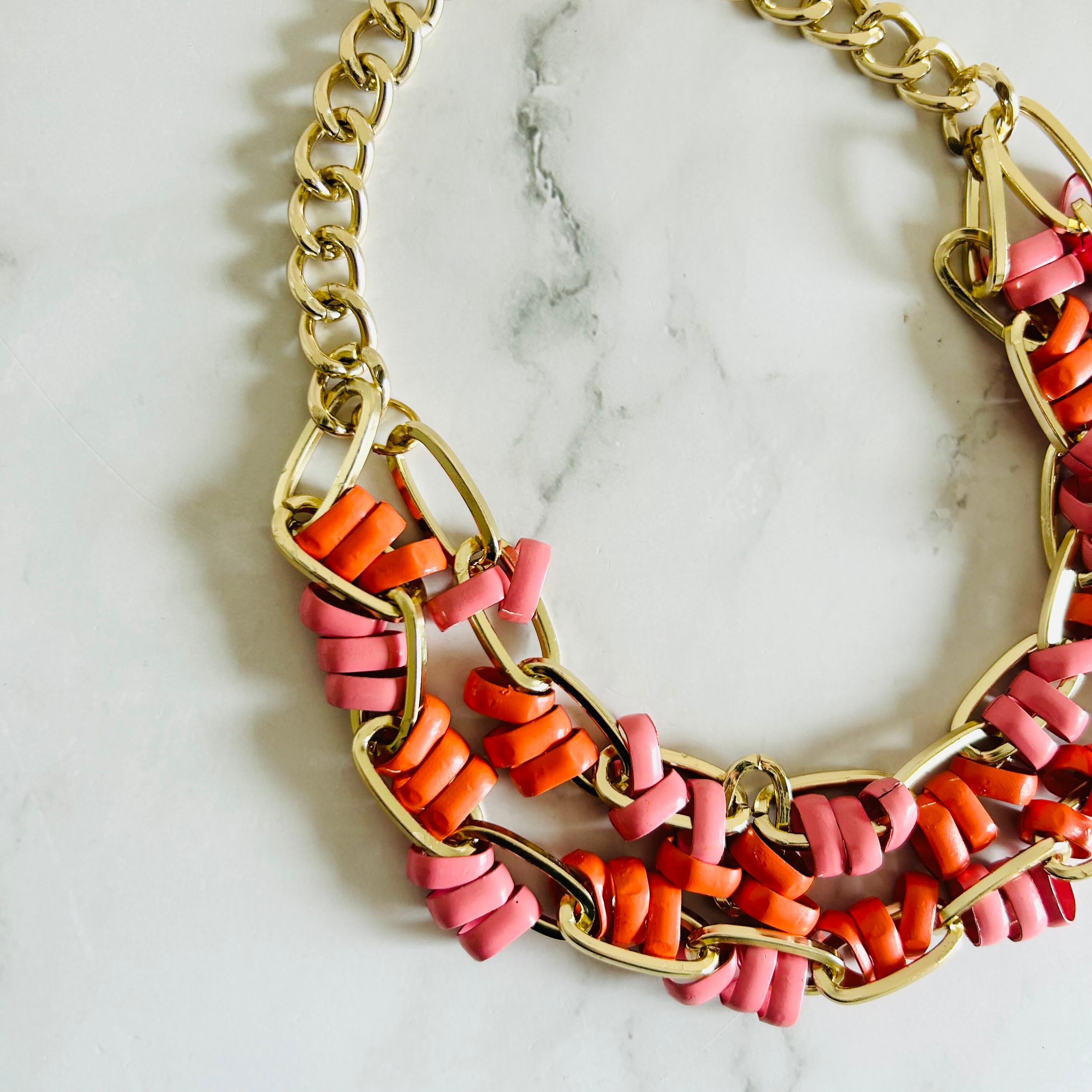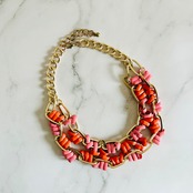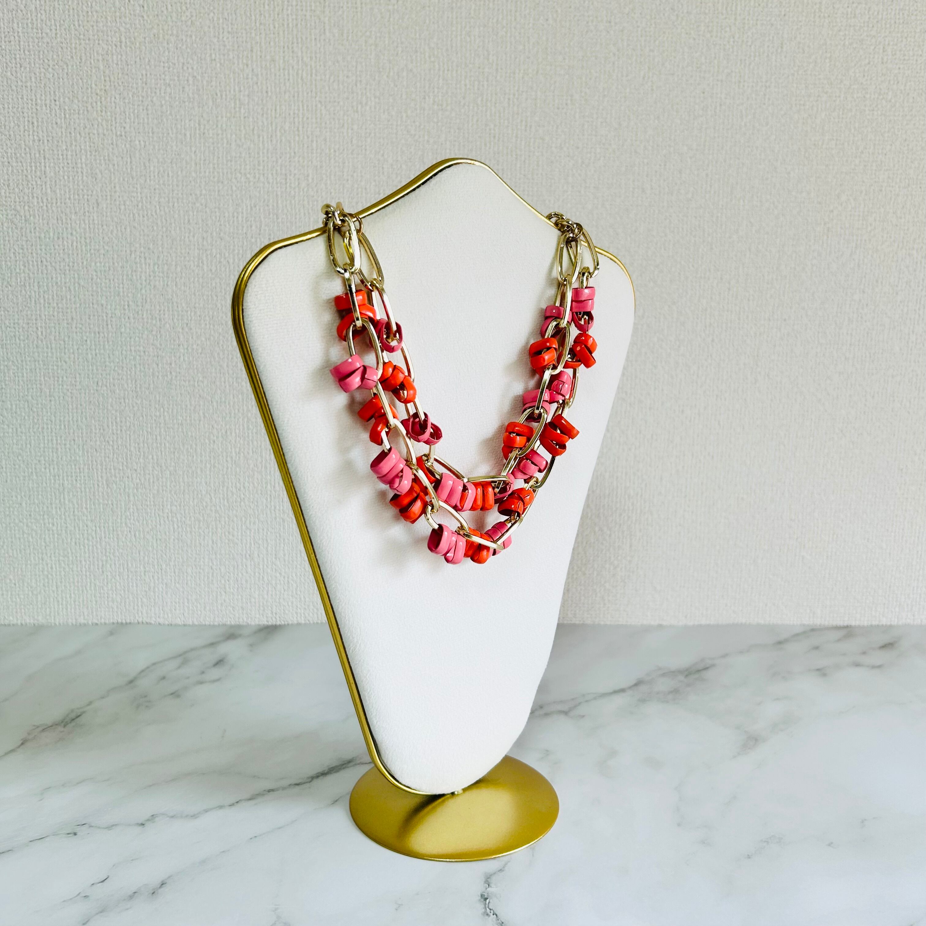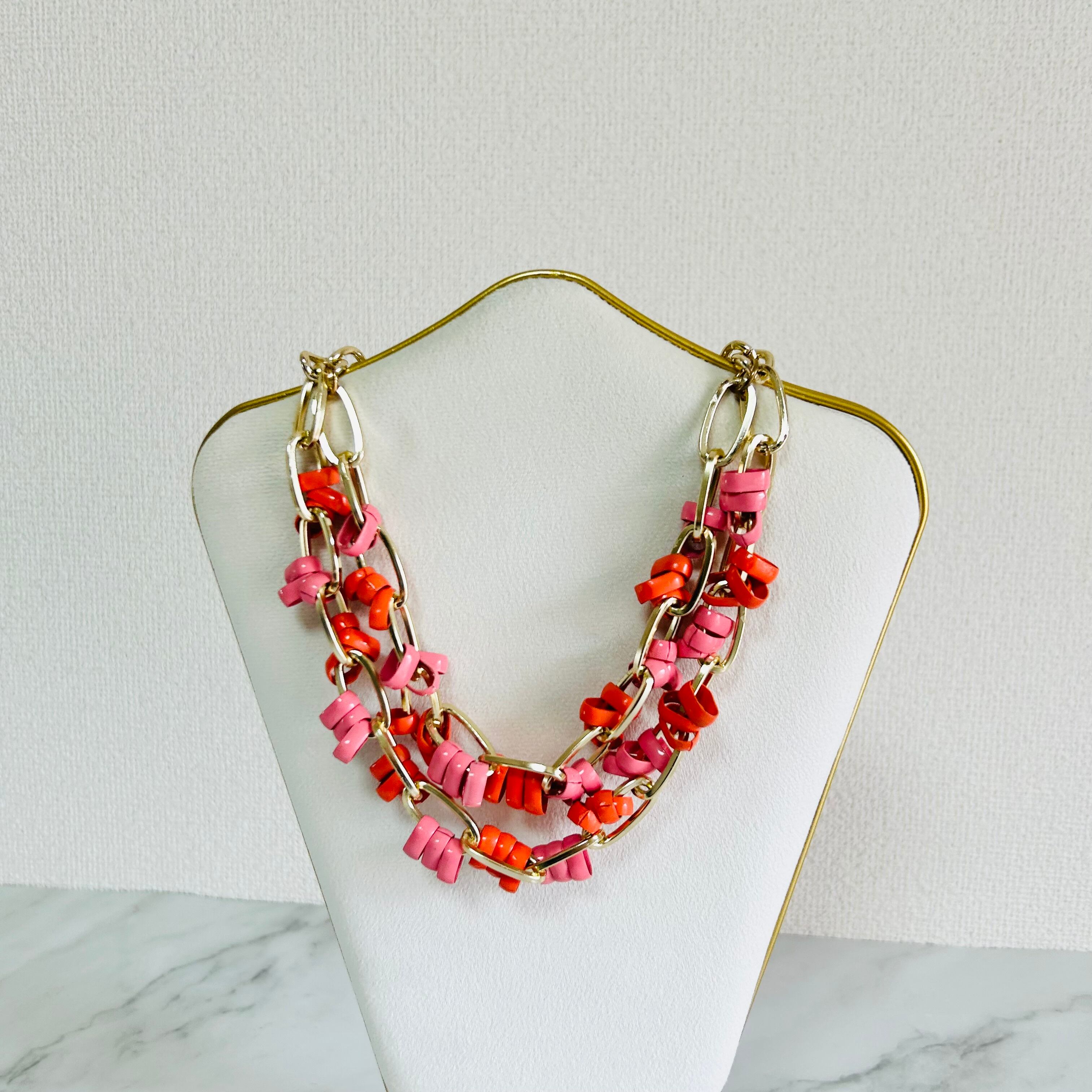 鮮やかなコーラルレッドとピンクのカラーが目を惹く、遊び心のあるデザインが魅力のネックレスです。チャンキーチェーンとのコンビネーションもユニークで、カジュアルスタイリングにぴったりなでざさです。