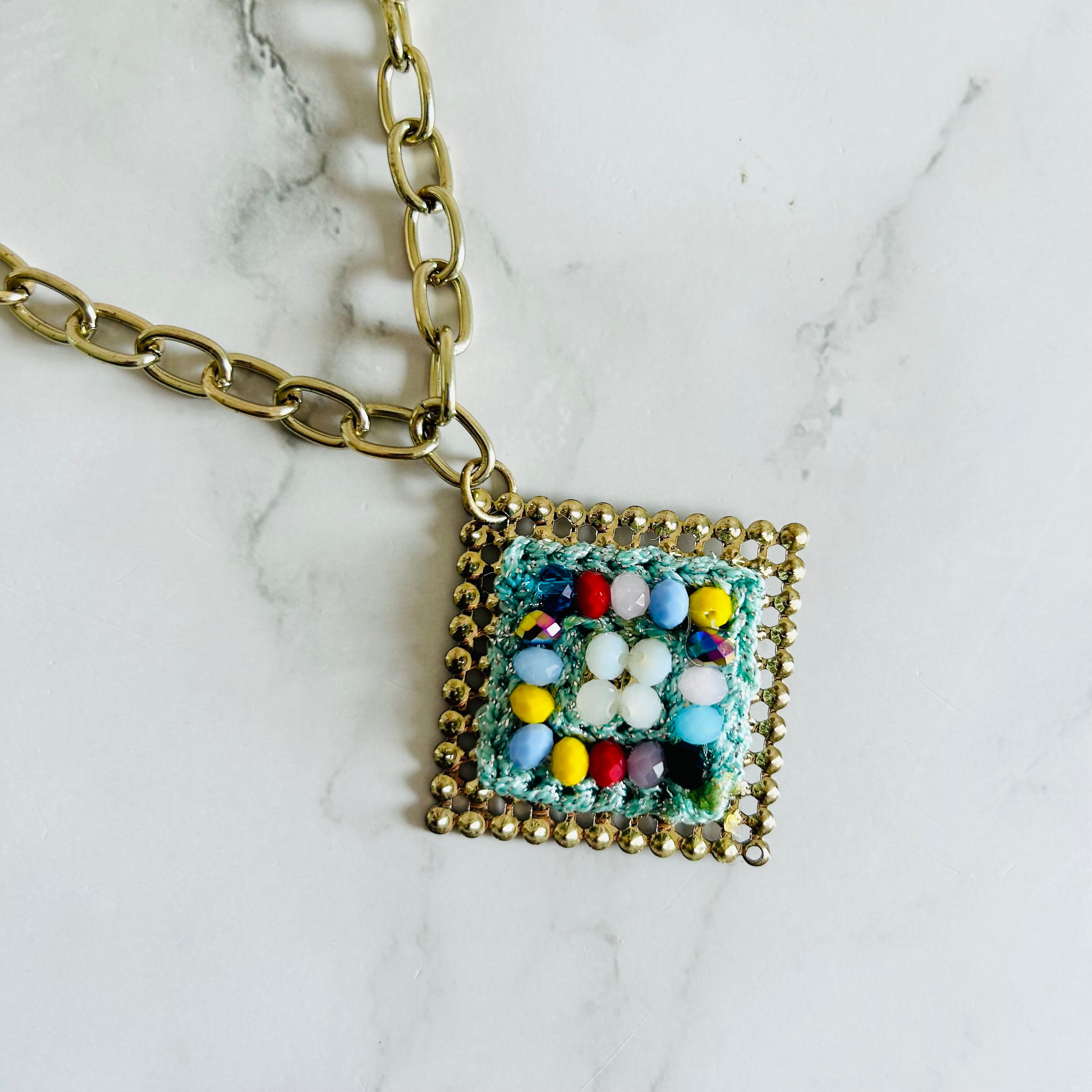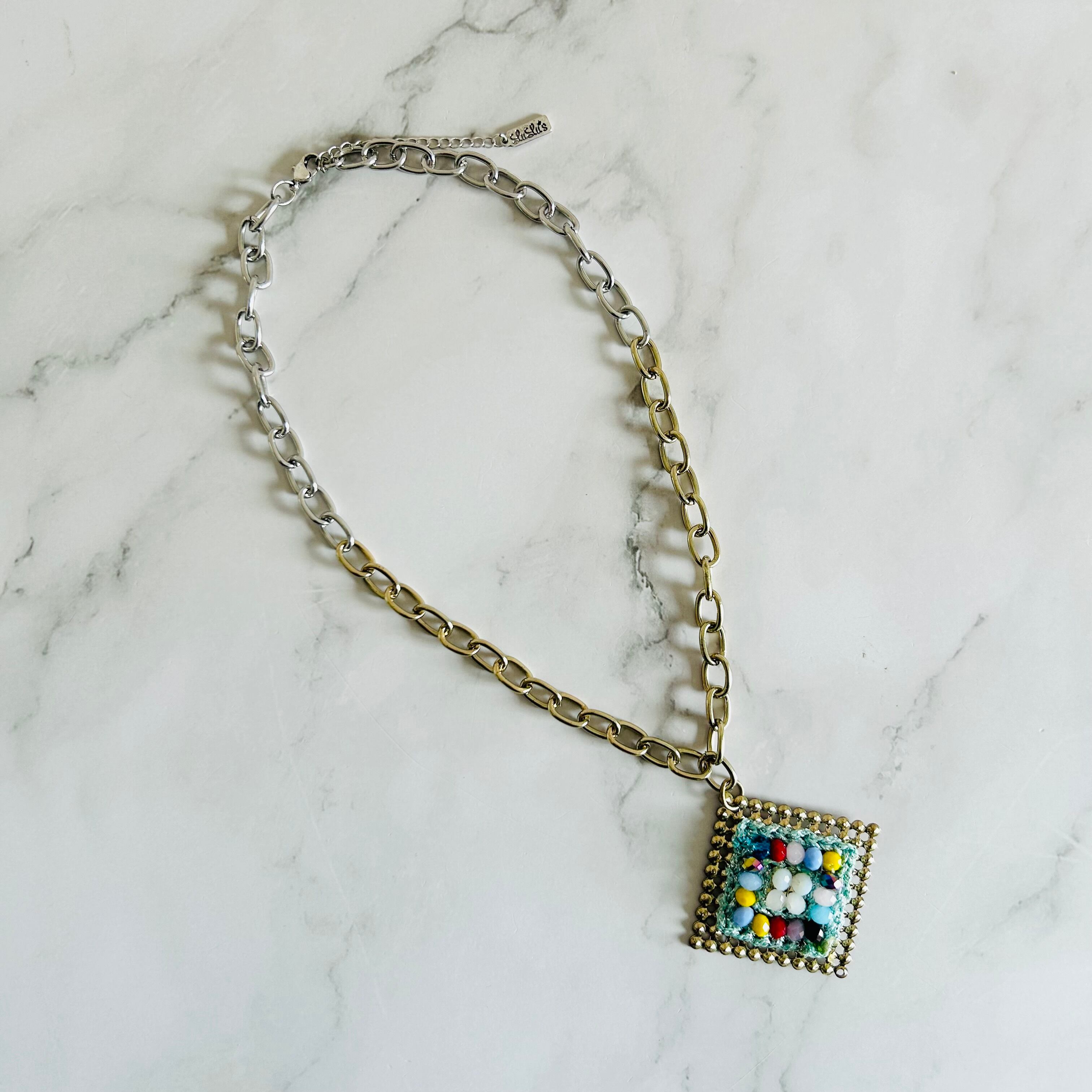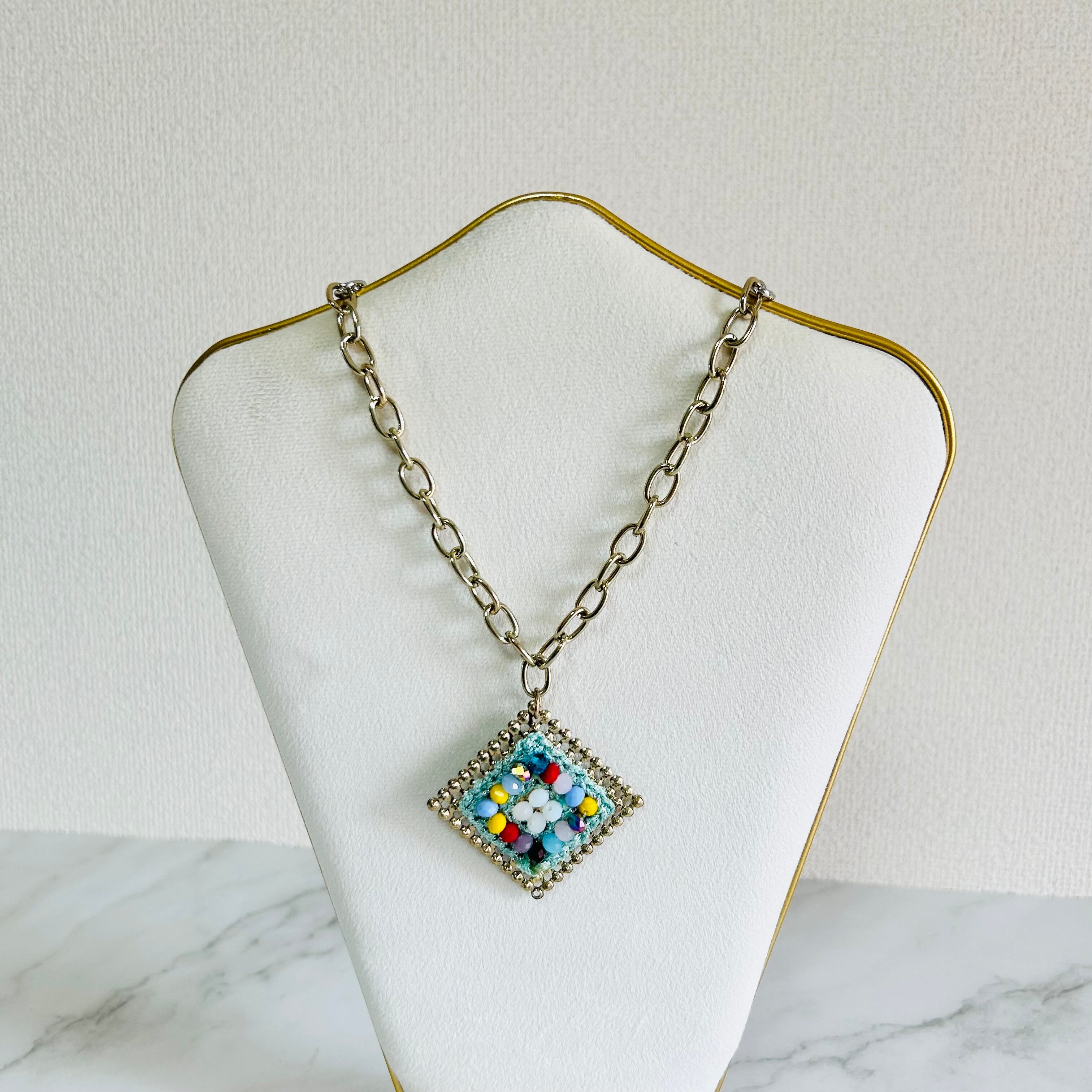 スクエアモチーフに詰まった小さな世界が、胸元にさりげない個性と彩りを添えてくれる一点ものです。
