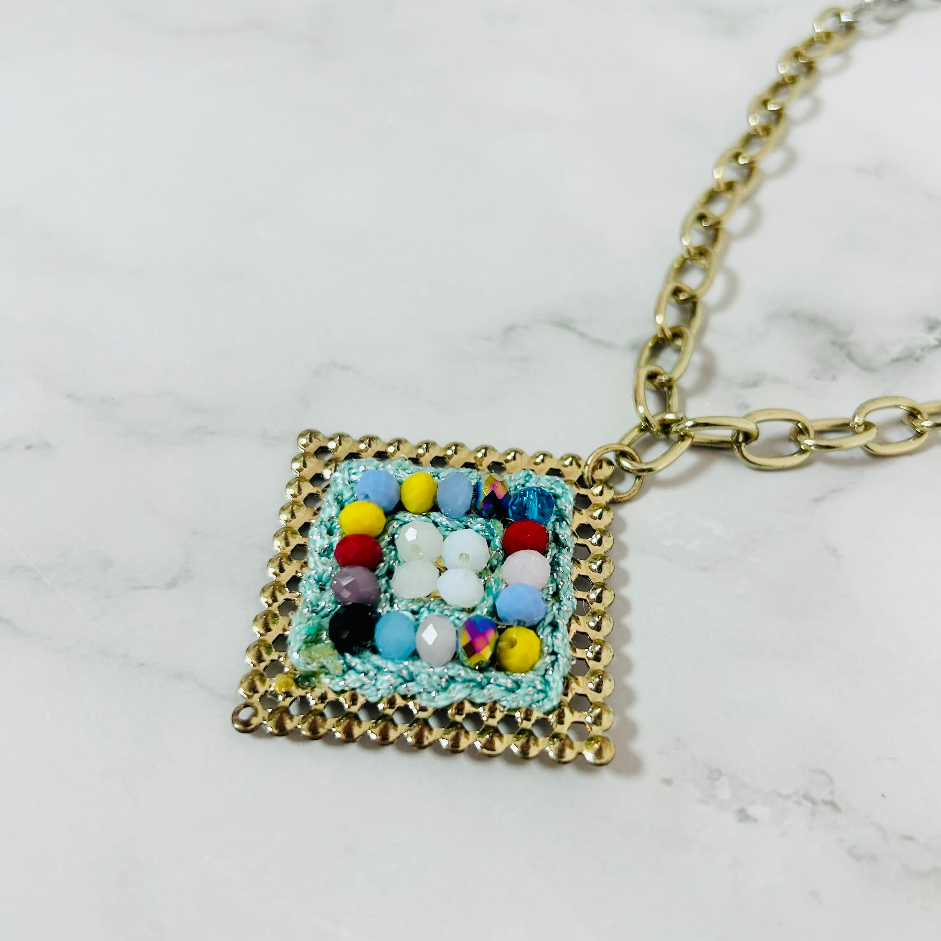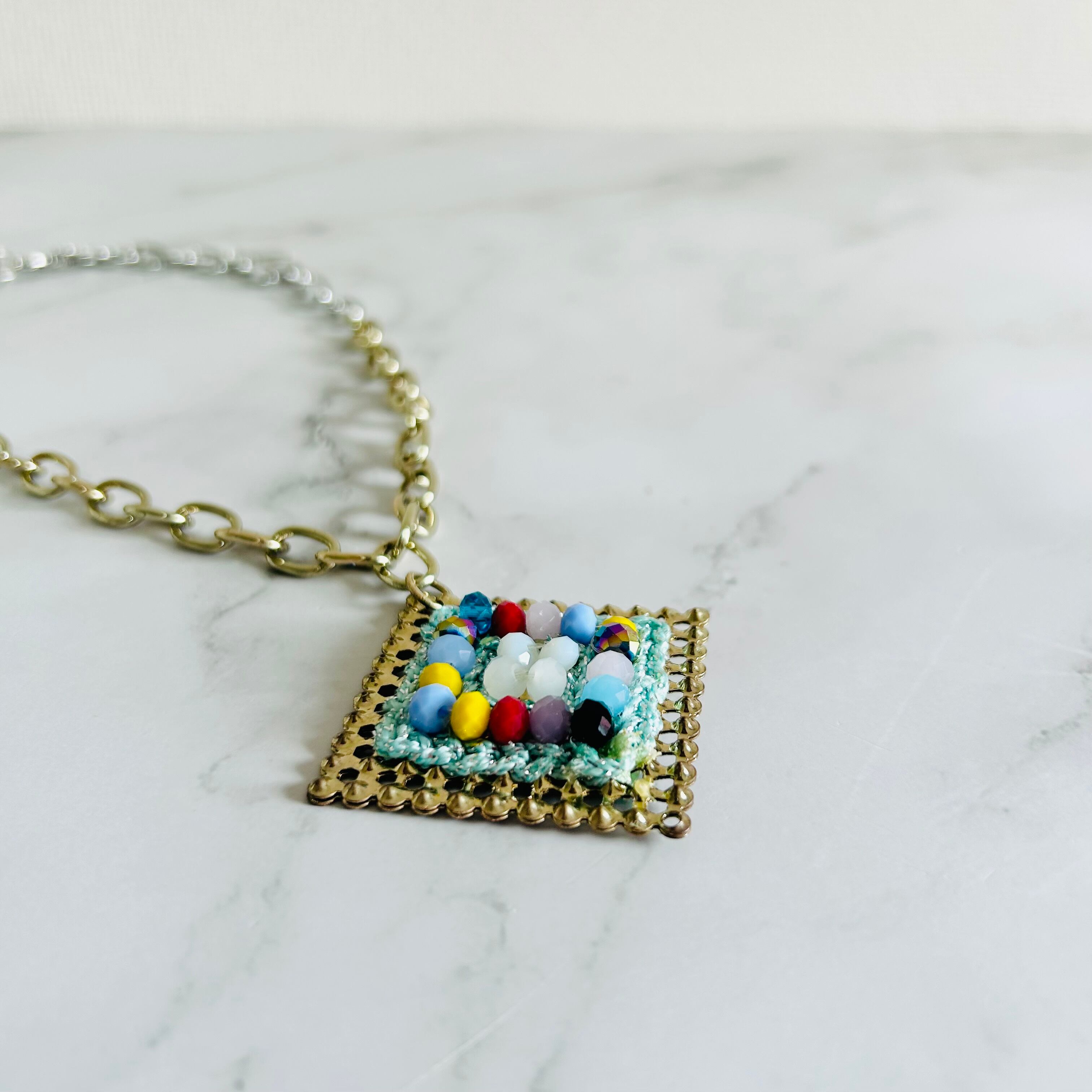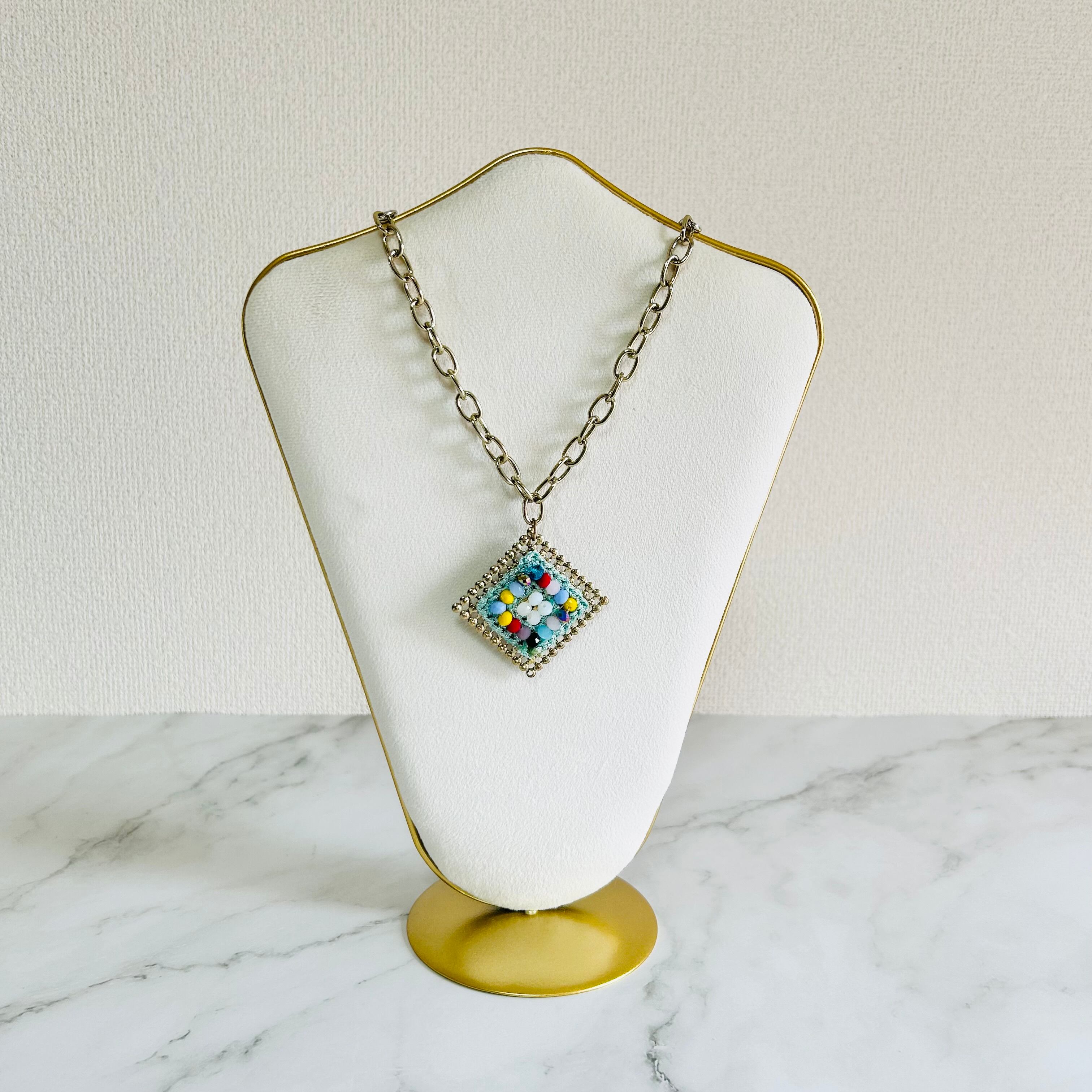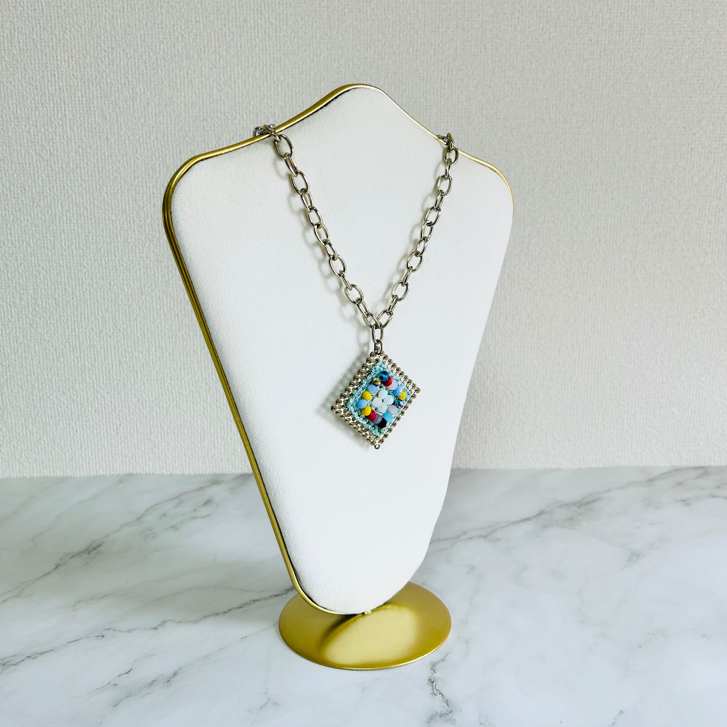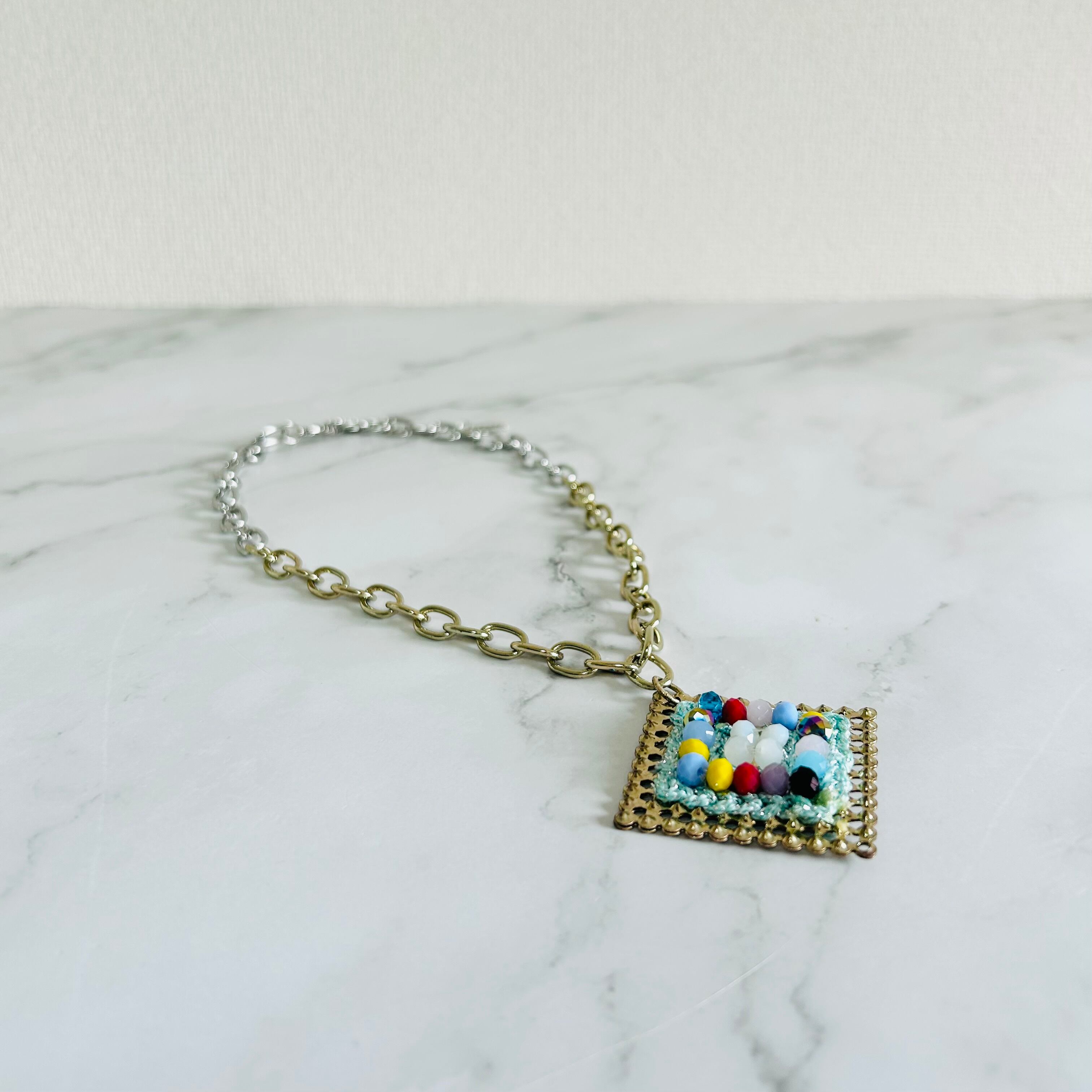 シルバーとゴールドのバイカラーチェーンに、ビーズがぎゅっと詰まったスクエアモチーフがとっても印象的なネックレスです。