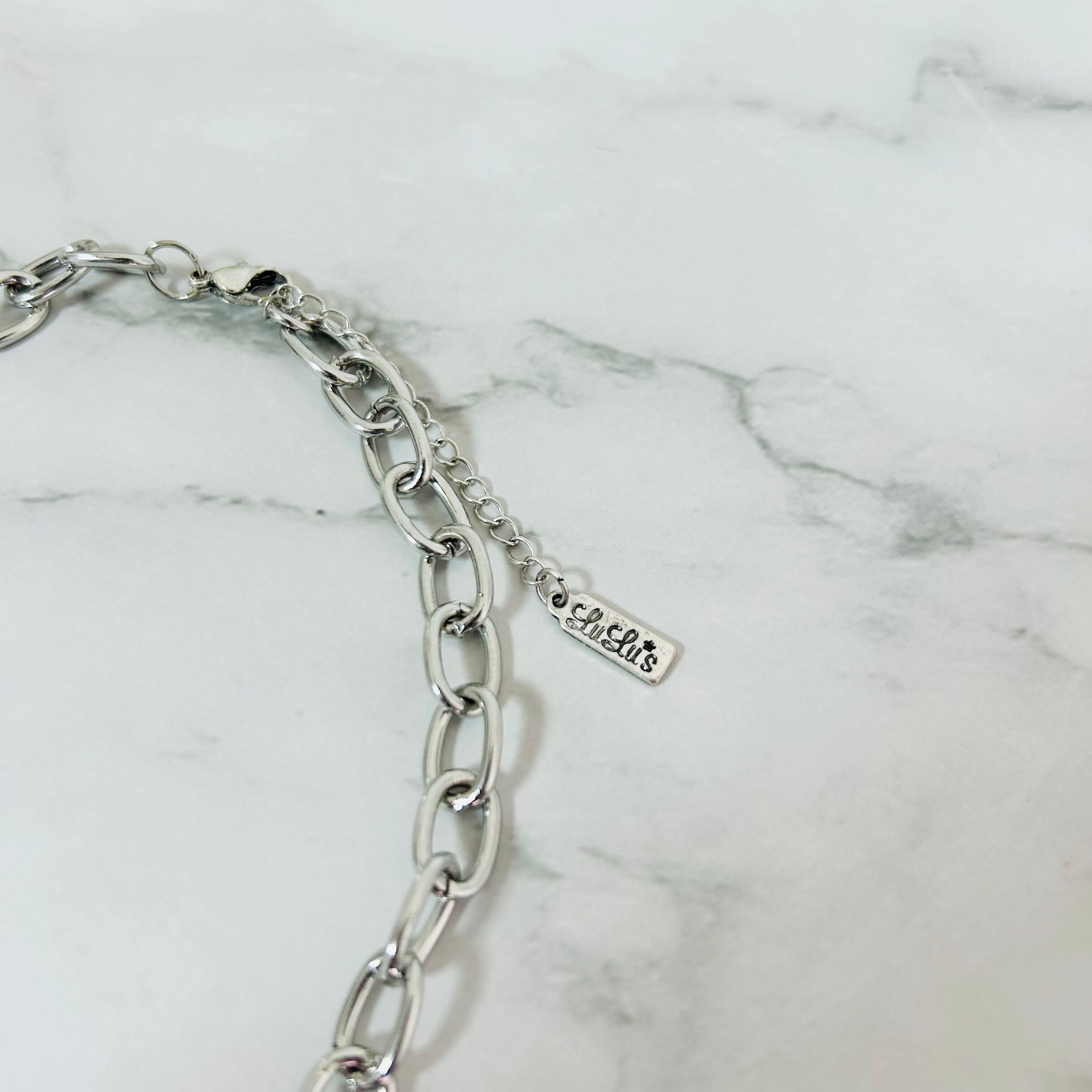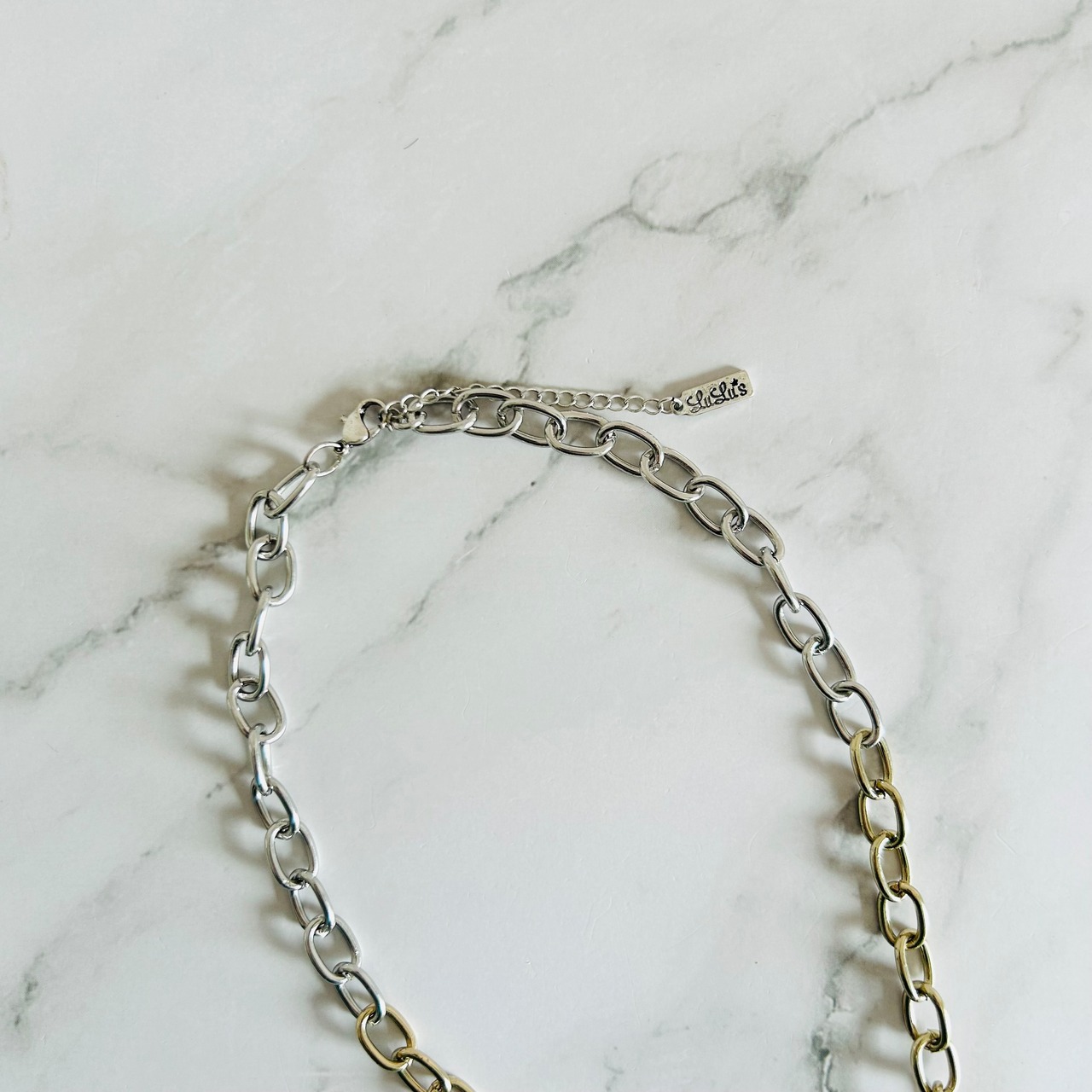 シルバーとゴールドのミックスチェーンが、クールさとあたたかみのバランスを絶妙に演出します☆