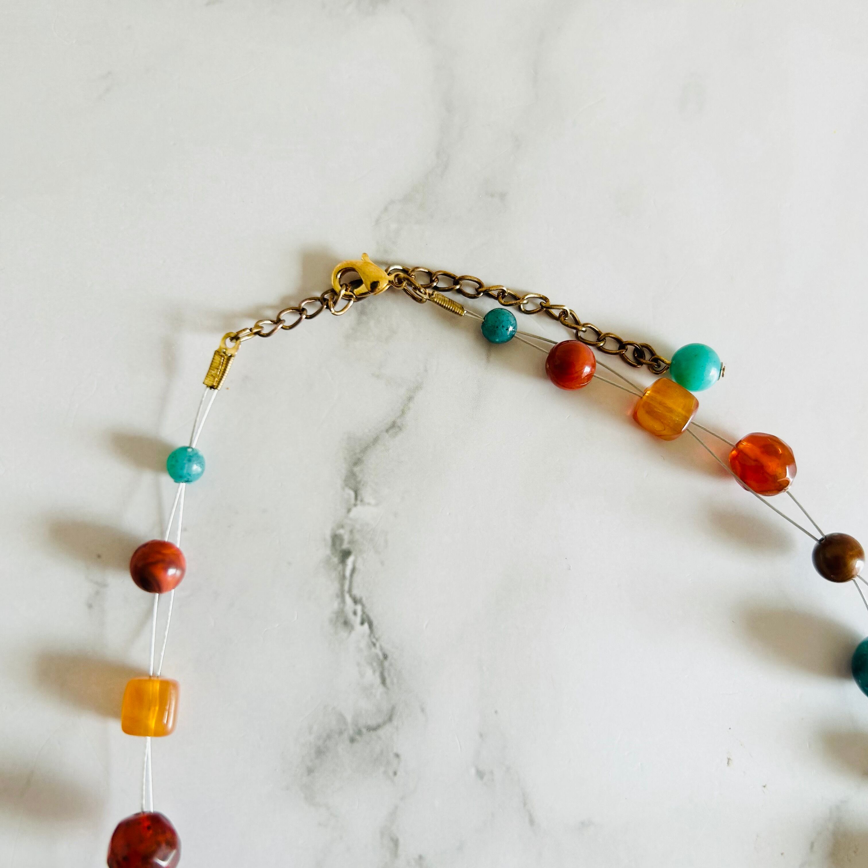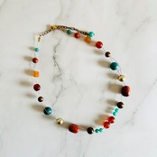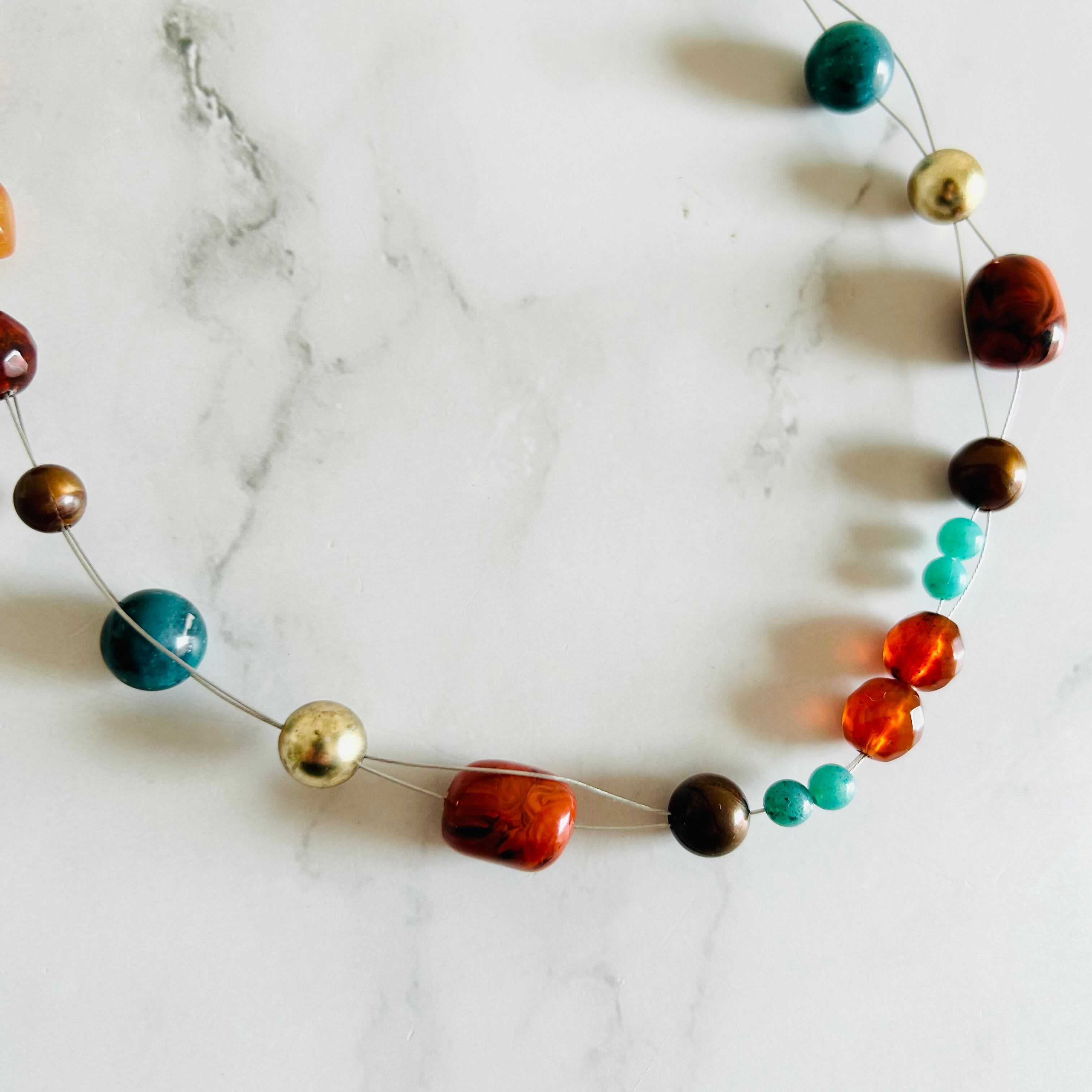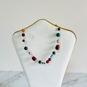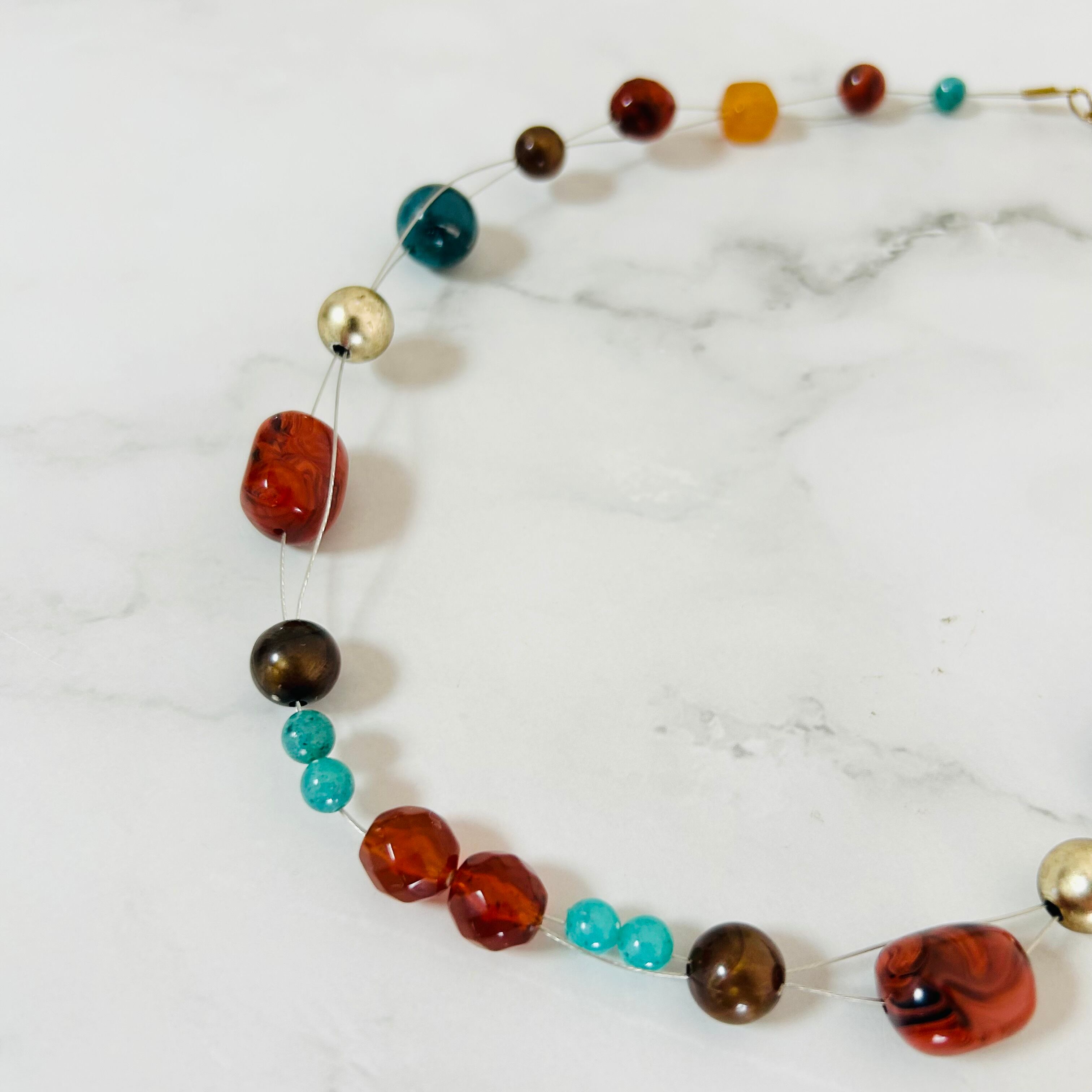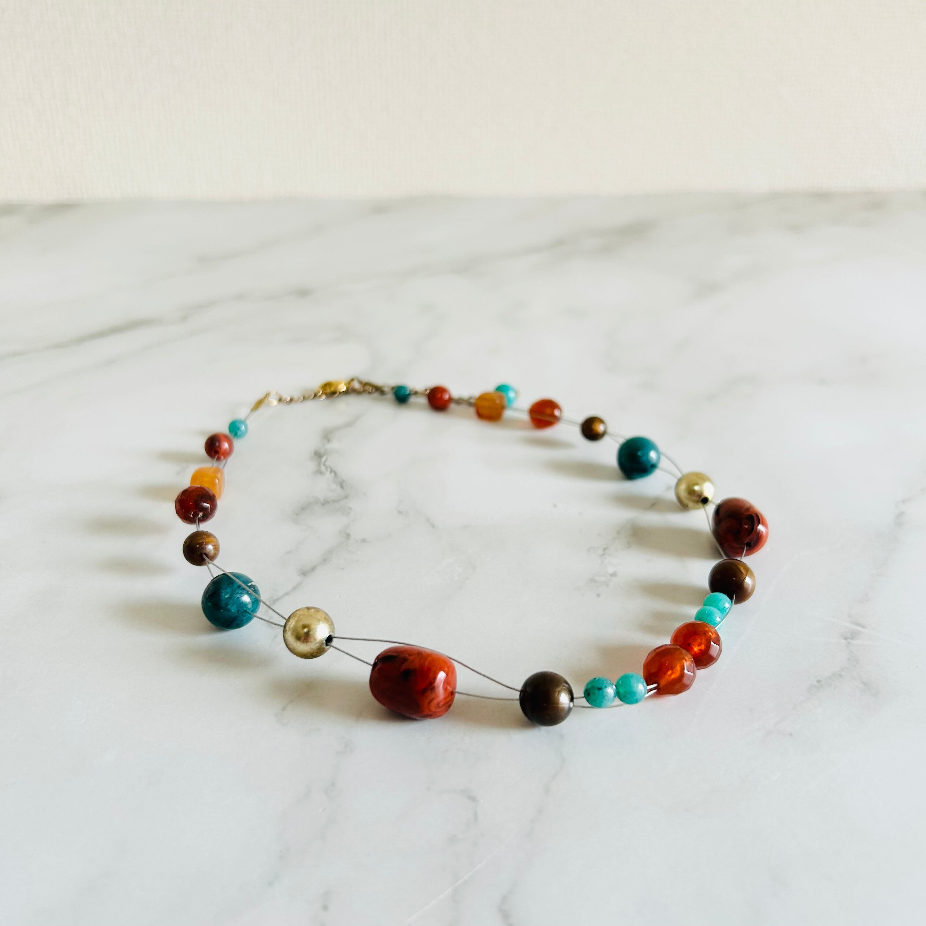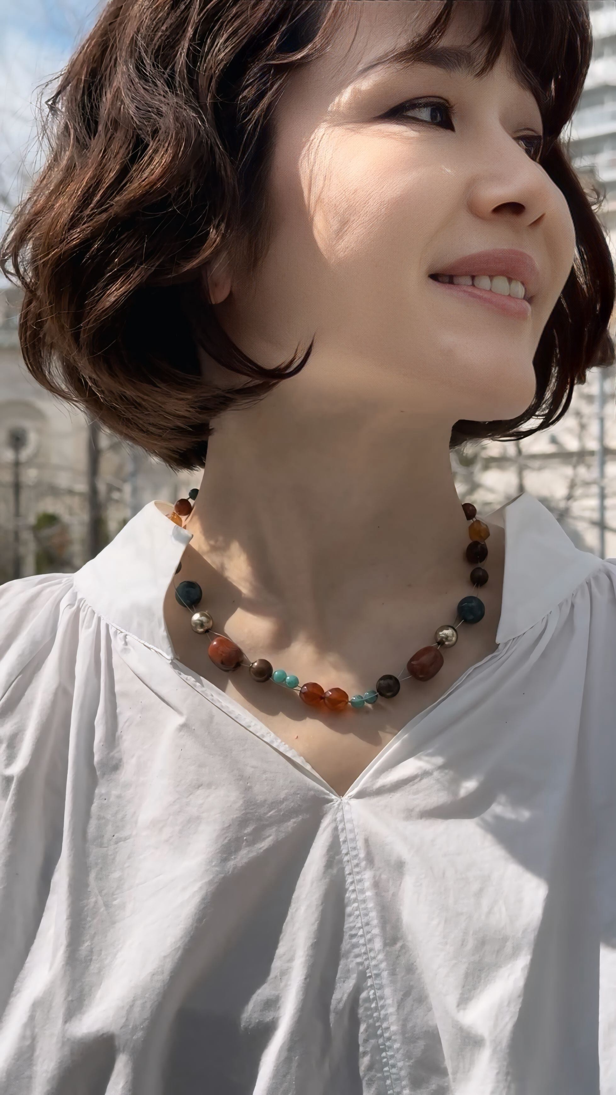ウッド調やターコイズ風、アンバーのような表情豊かなビーズたちが、軽やかに連なるデザインです。