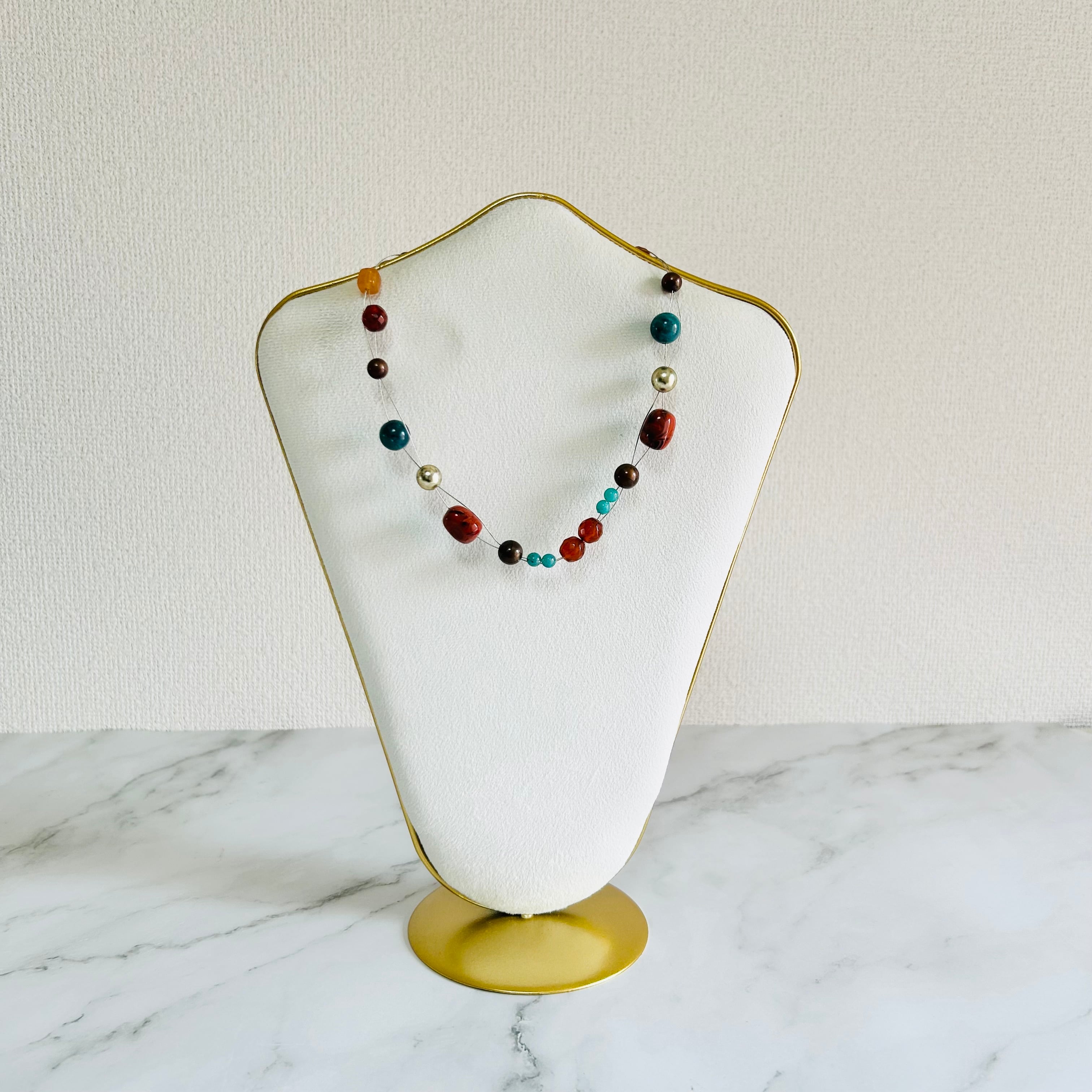 ナチュラルな色合いのビーズがリズミカルに並び、シンプルながらもセンスを感じるネックレスです