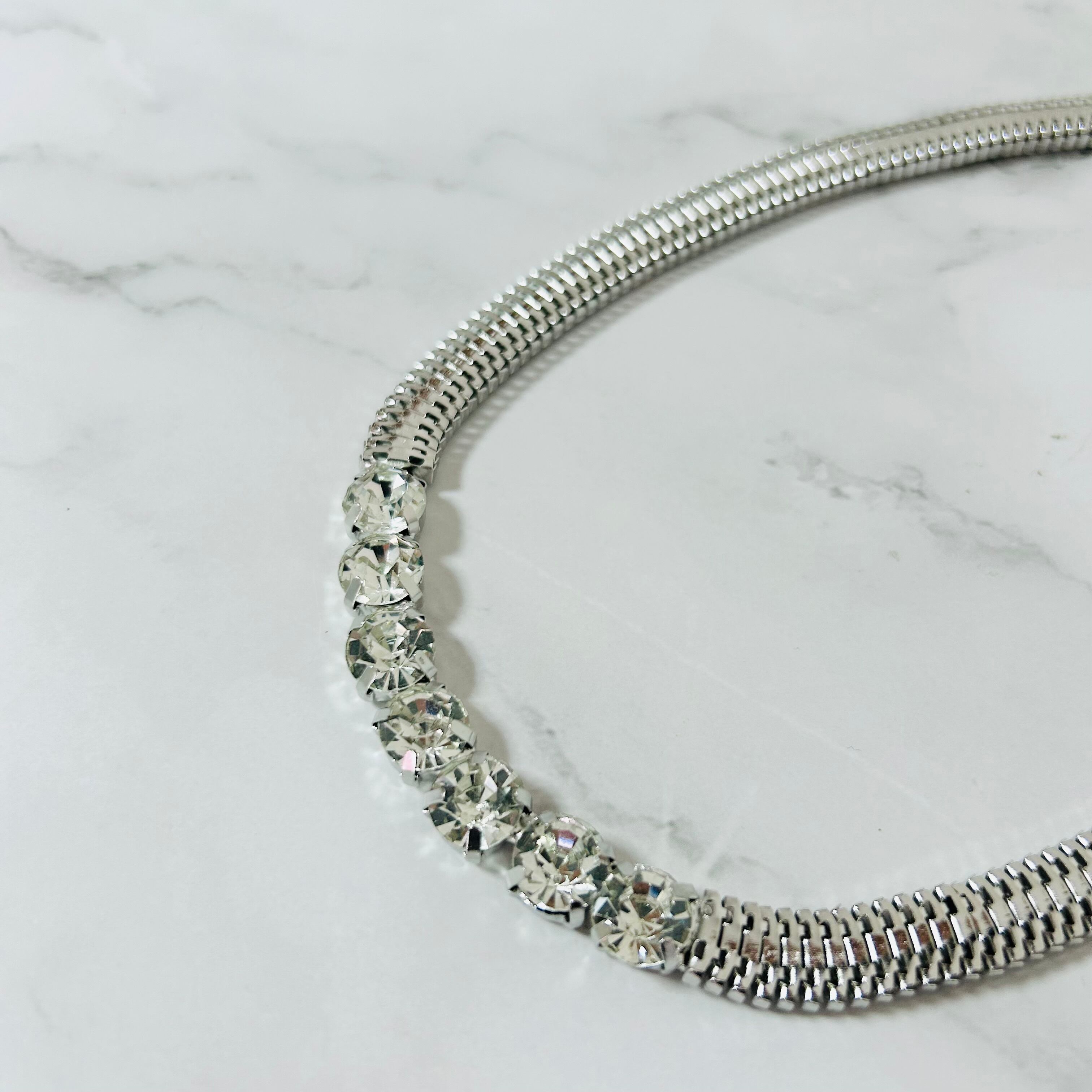 シャープなシルバーのメタルラインに、クリアなクリスタルがそっと輝きを添える洗練されたデザインです。